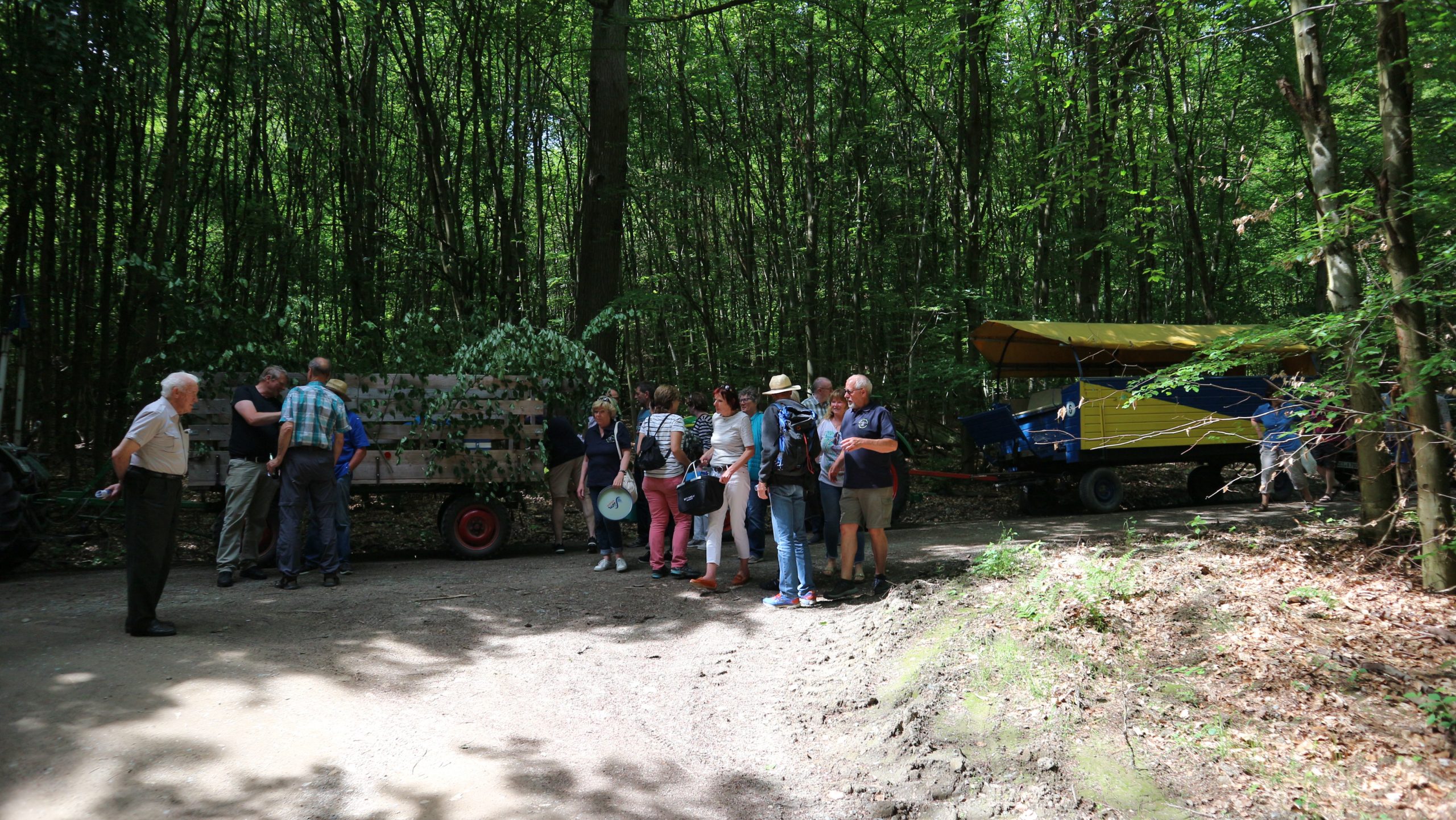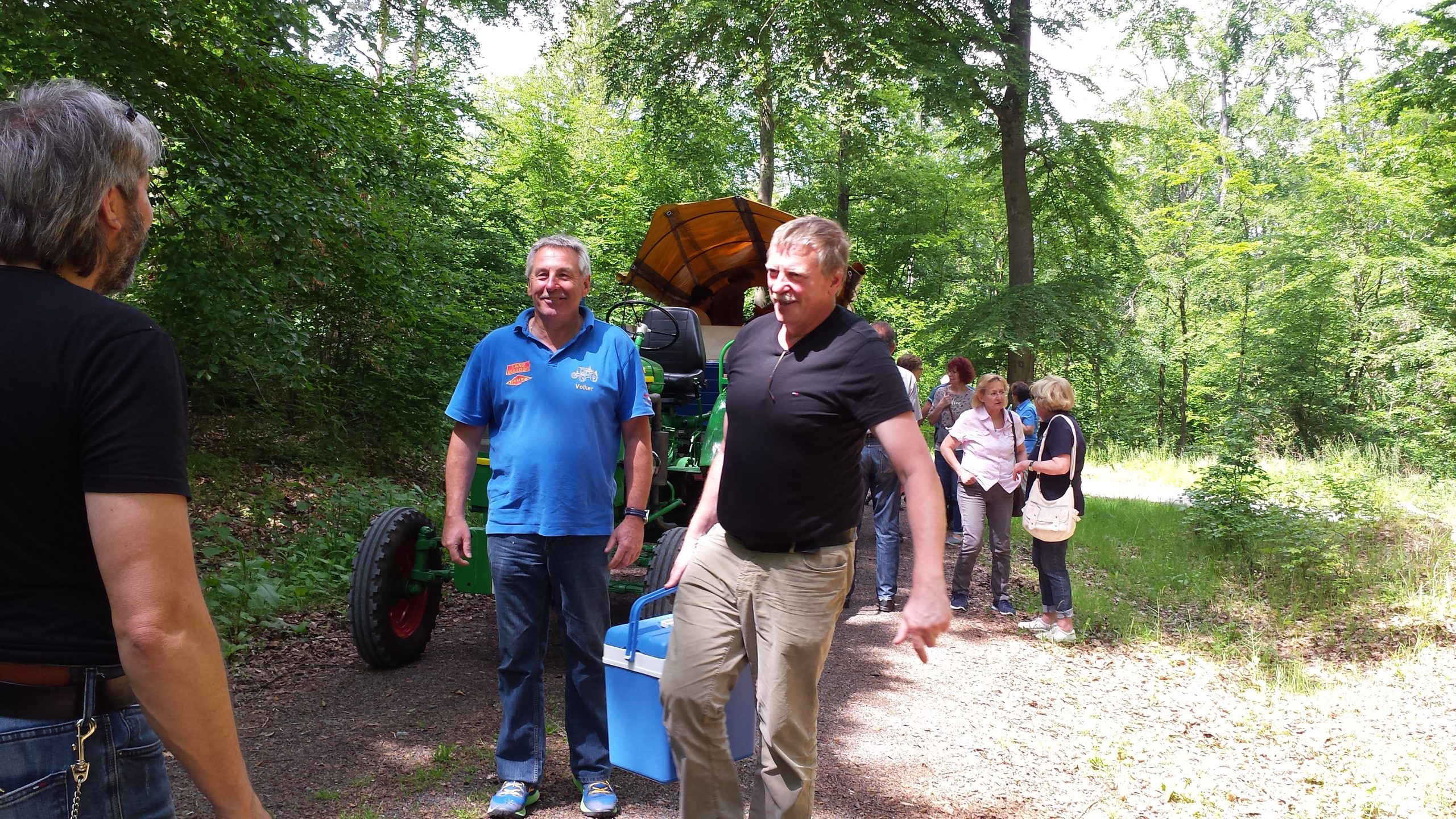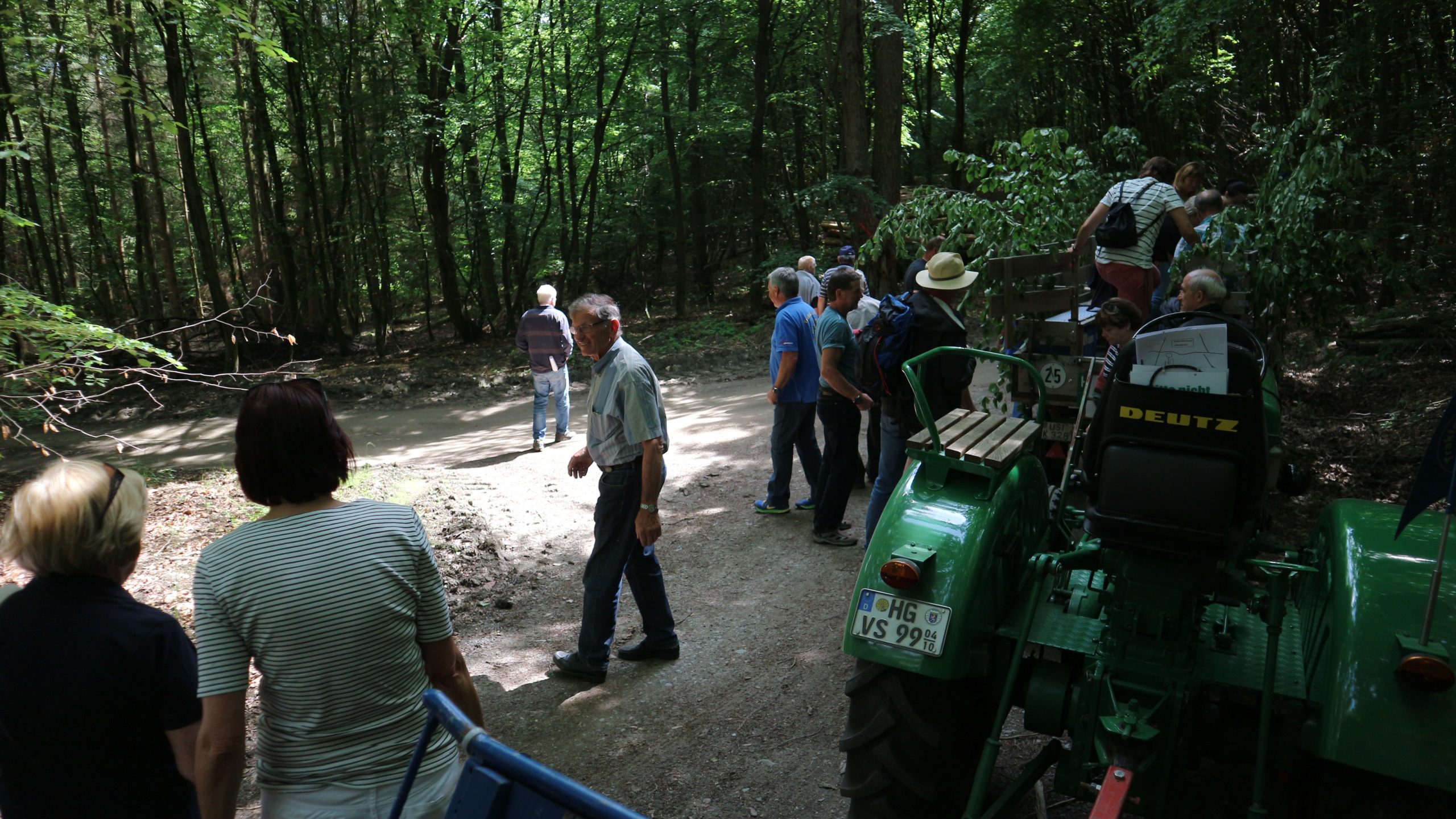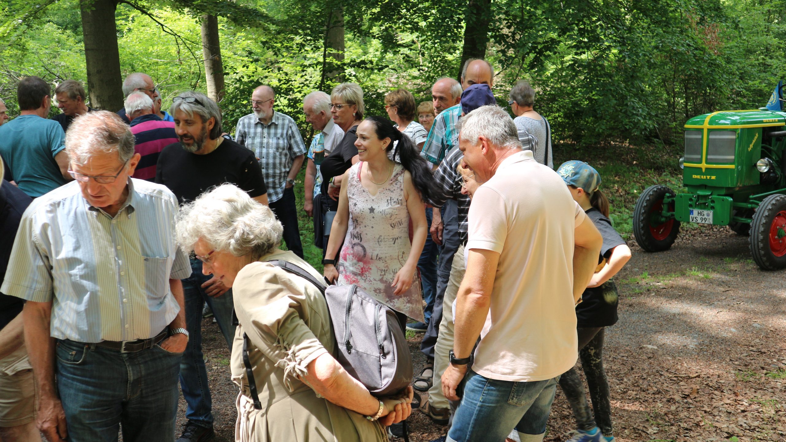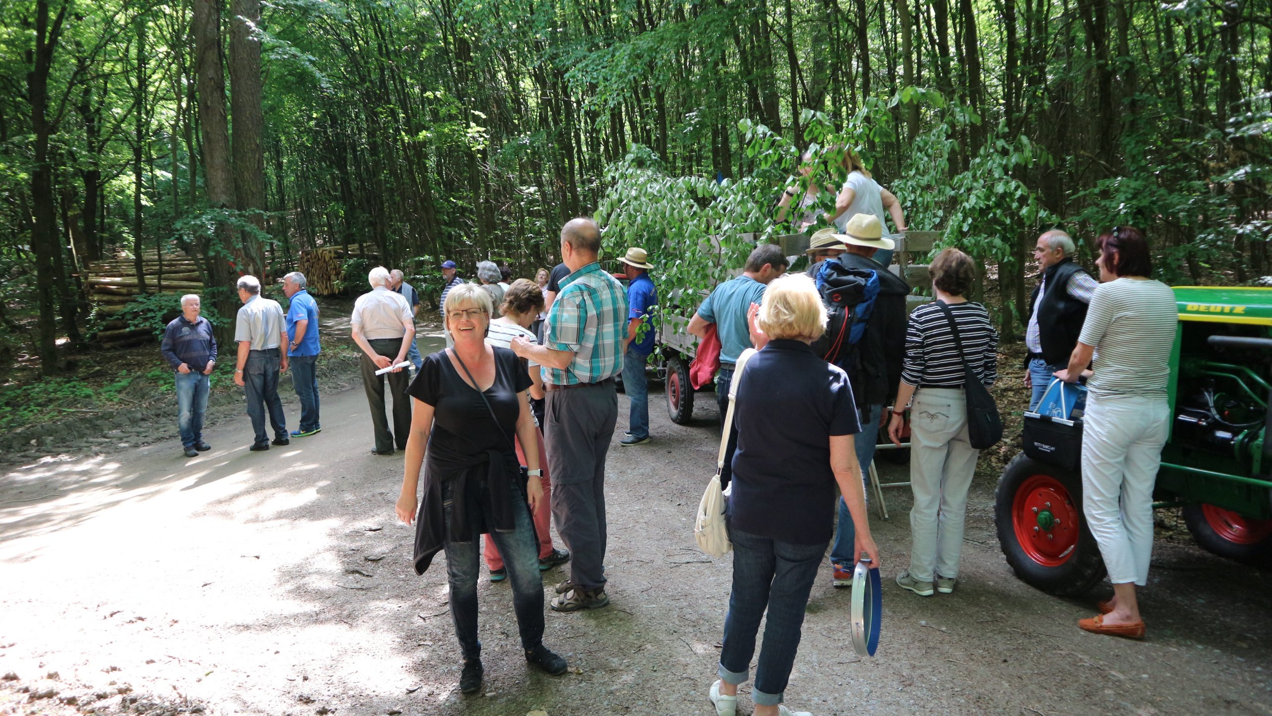 Harald Bender und Volker Schmidt von den Traktorfreunde Eschbach standen mit zwei historische Traktoren, einem Planwagen und einem mit Laub geschmückten Anhänger bereit, für die Fahrt zu den Eschbacher Silberlöchern. Bei herrlichstem Sommerwetter führte die Fahrt durch den Wald, zunächst Richtung Grävenwiesbach, dann über die Hohe Schneid, die „Schmidtsheck“, sowie den höchsten Punkt der Gemarkung (500 m), zur Wellerstraße, einem wichtigen mittelalterlichen Handelsweg. Er führte von der Wetterau über Braunfels nach Leun und weiter in den Westerwald. Endpunkt war die Gemarkung „Griebelsheck“,