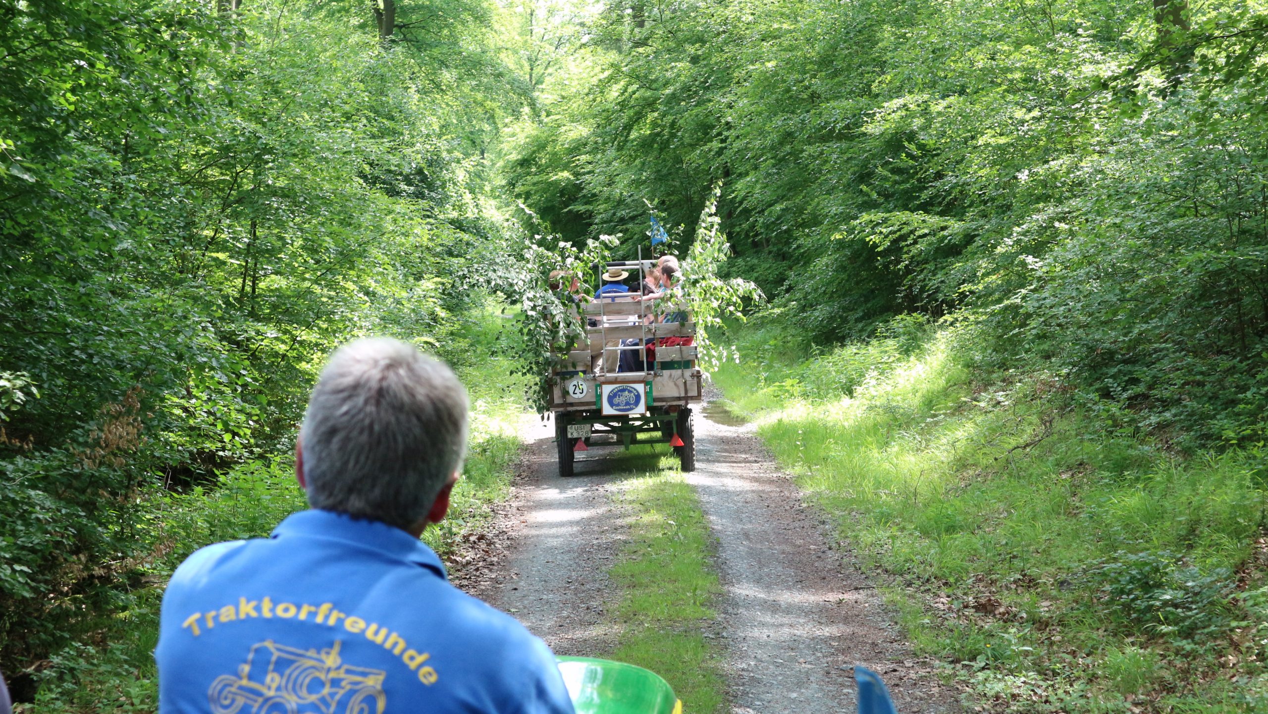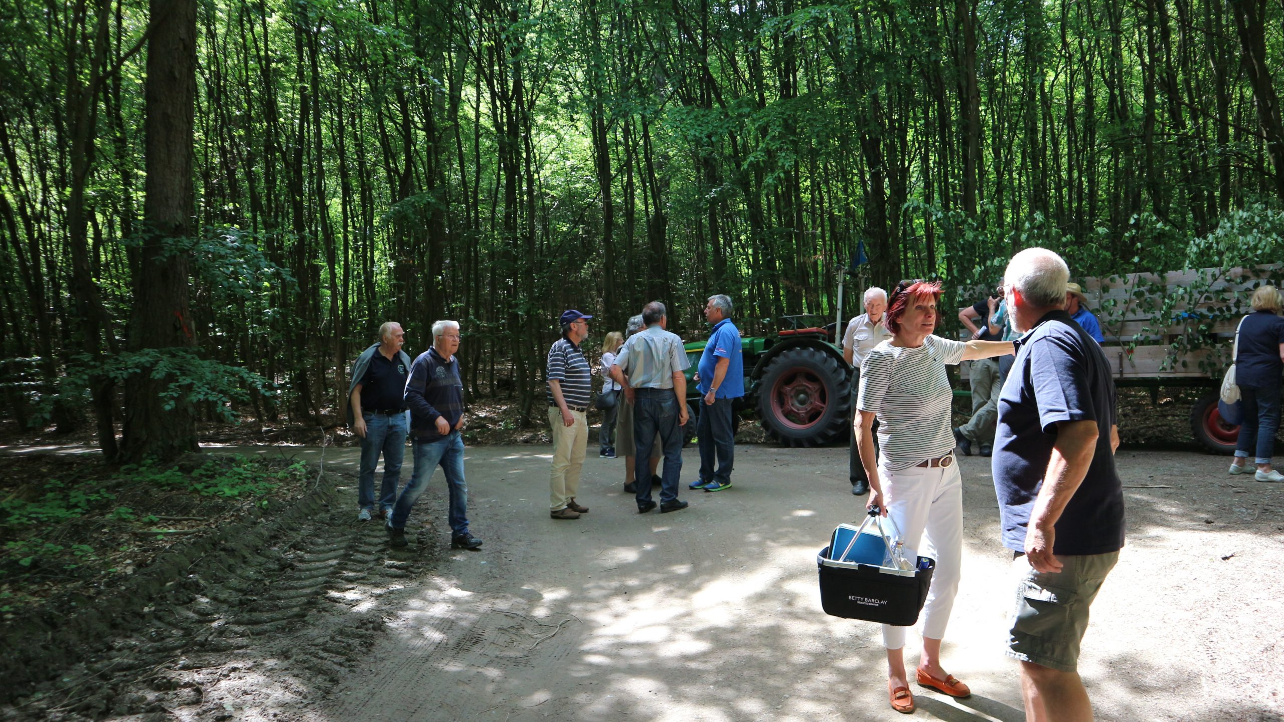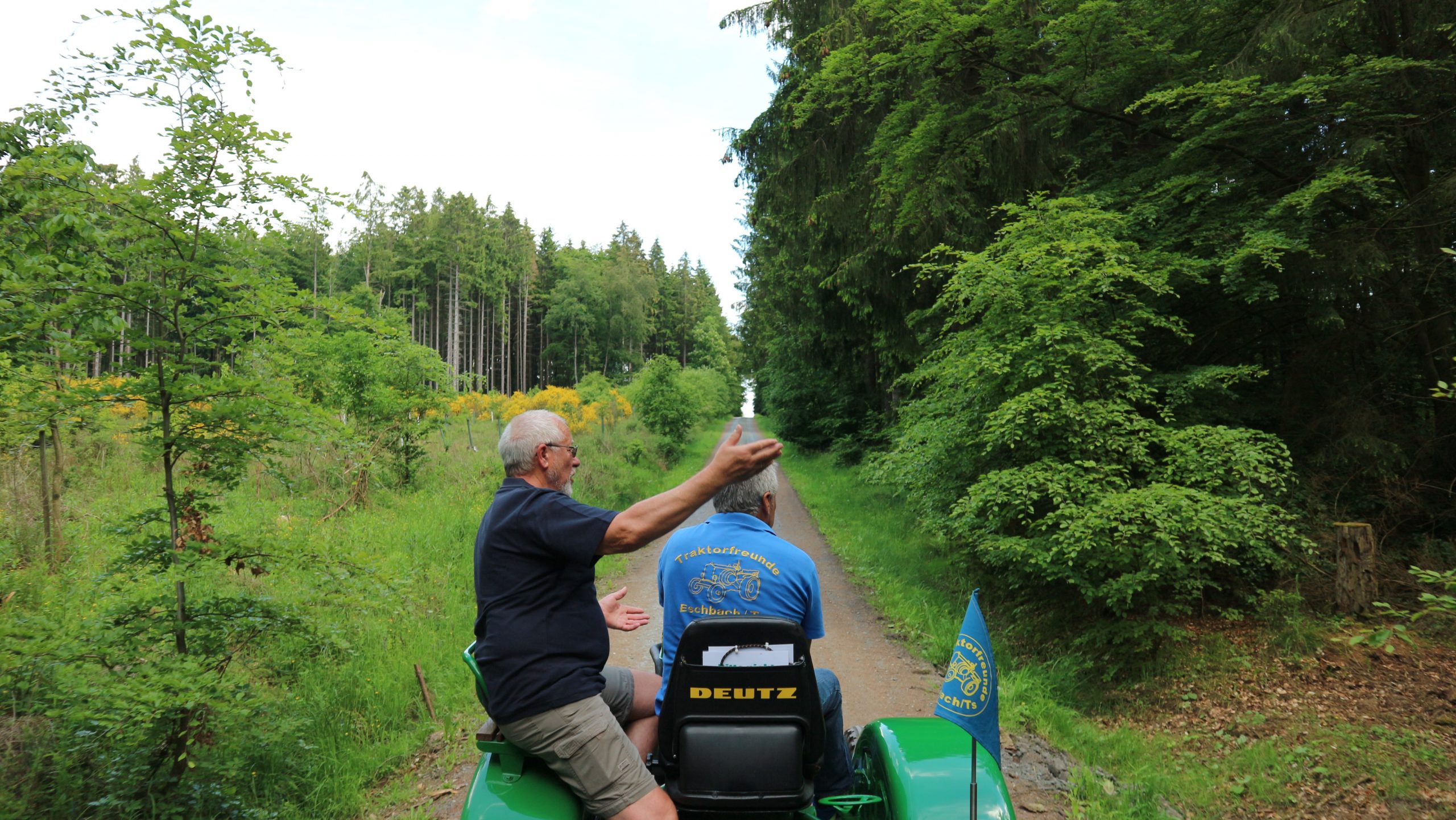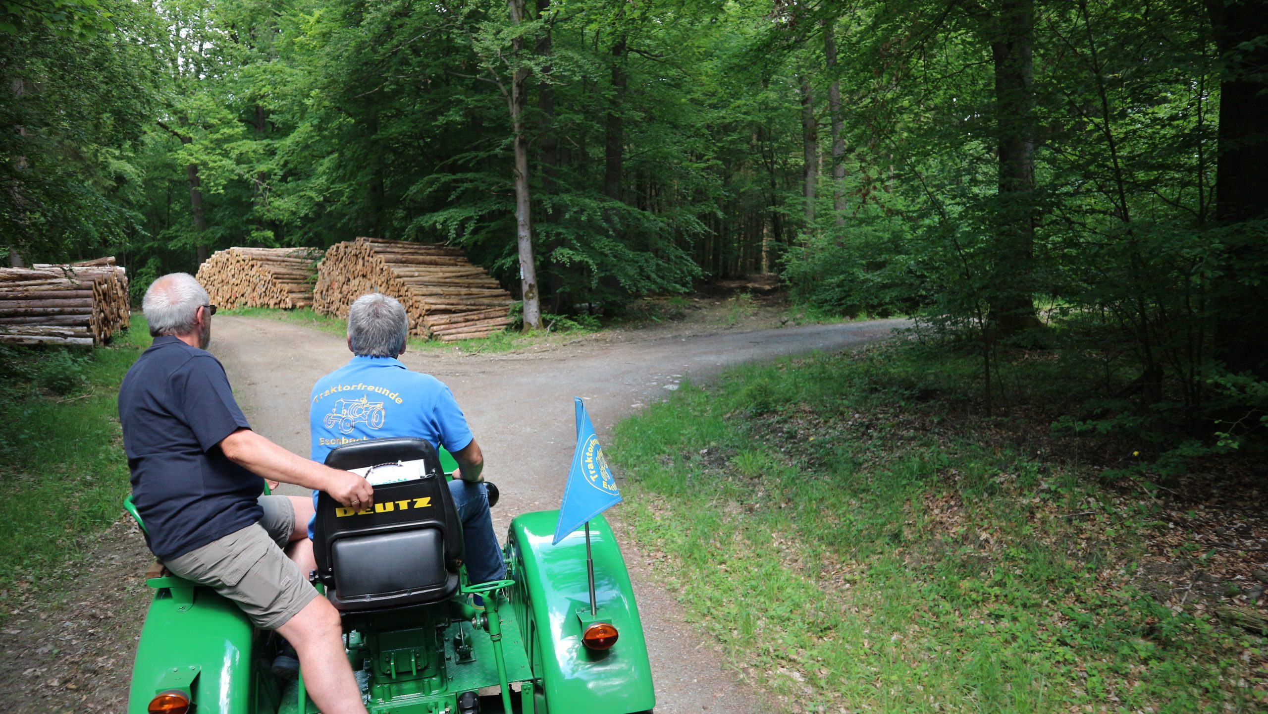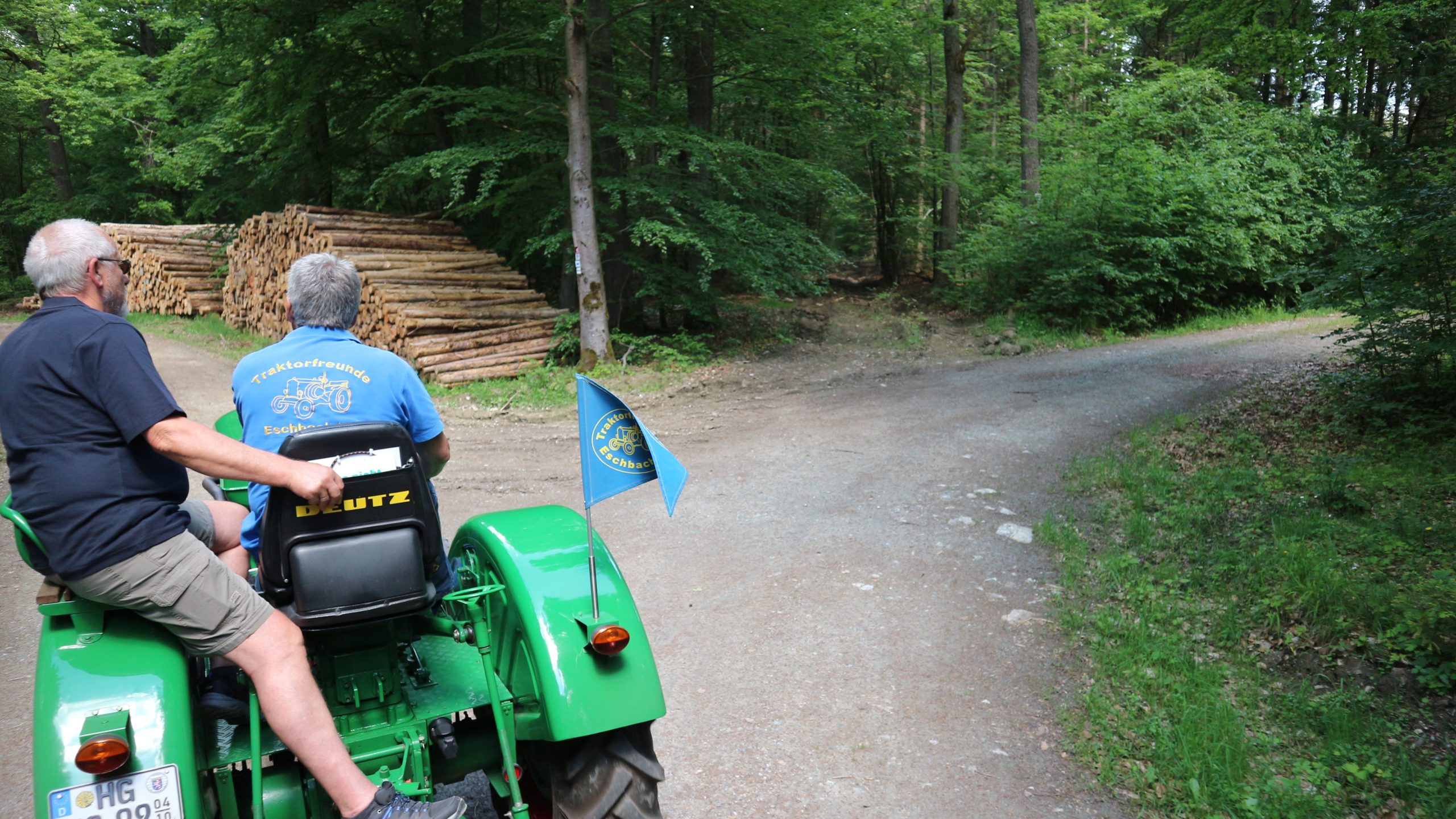 Harald Bender und Volker Schmidt von den Traktorfreunde Eschbach standen mit zwei historische Traktoren, einem Planwagen und einem mit Laub geschmückten Anhänger bereit, für die Fahrt zu den Eschbacher Silberlöchern. Bei herrlichstem Sommerwetter führte die Fahrt durch den Wald, zunächst Richtung Grävenwiesbach, dann über die Hohe Schneid, die „Schmidtsheck“, sowie den höchsten Punkt der Gemarkung (500 m), zur Wellerstraße, einem wichtigen mittelalterlichen Handelsweg. Er führte von der Wetterau über Braunfels nach Leun und weiter in den Westerwald. Endpunkt war die Gemarkung „Griebelsheck“,