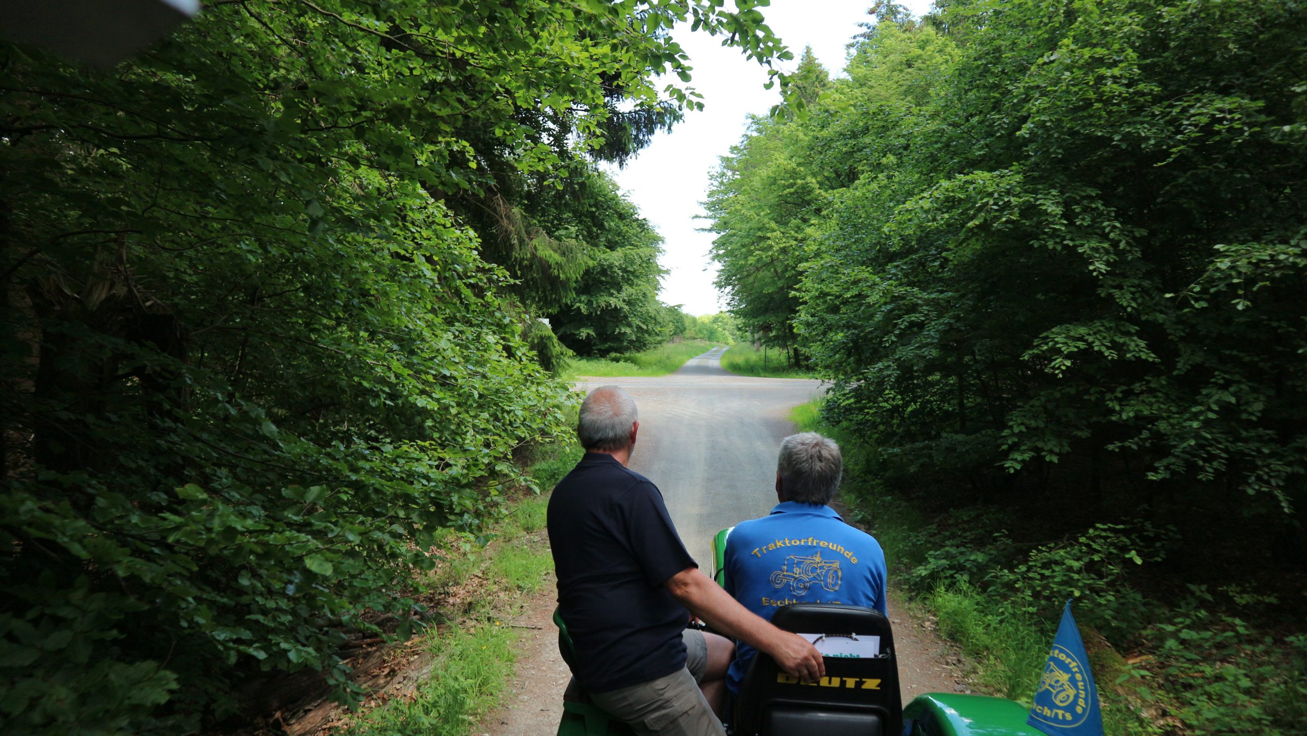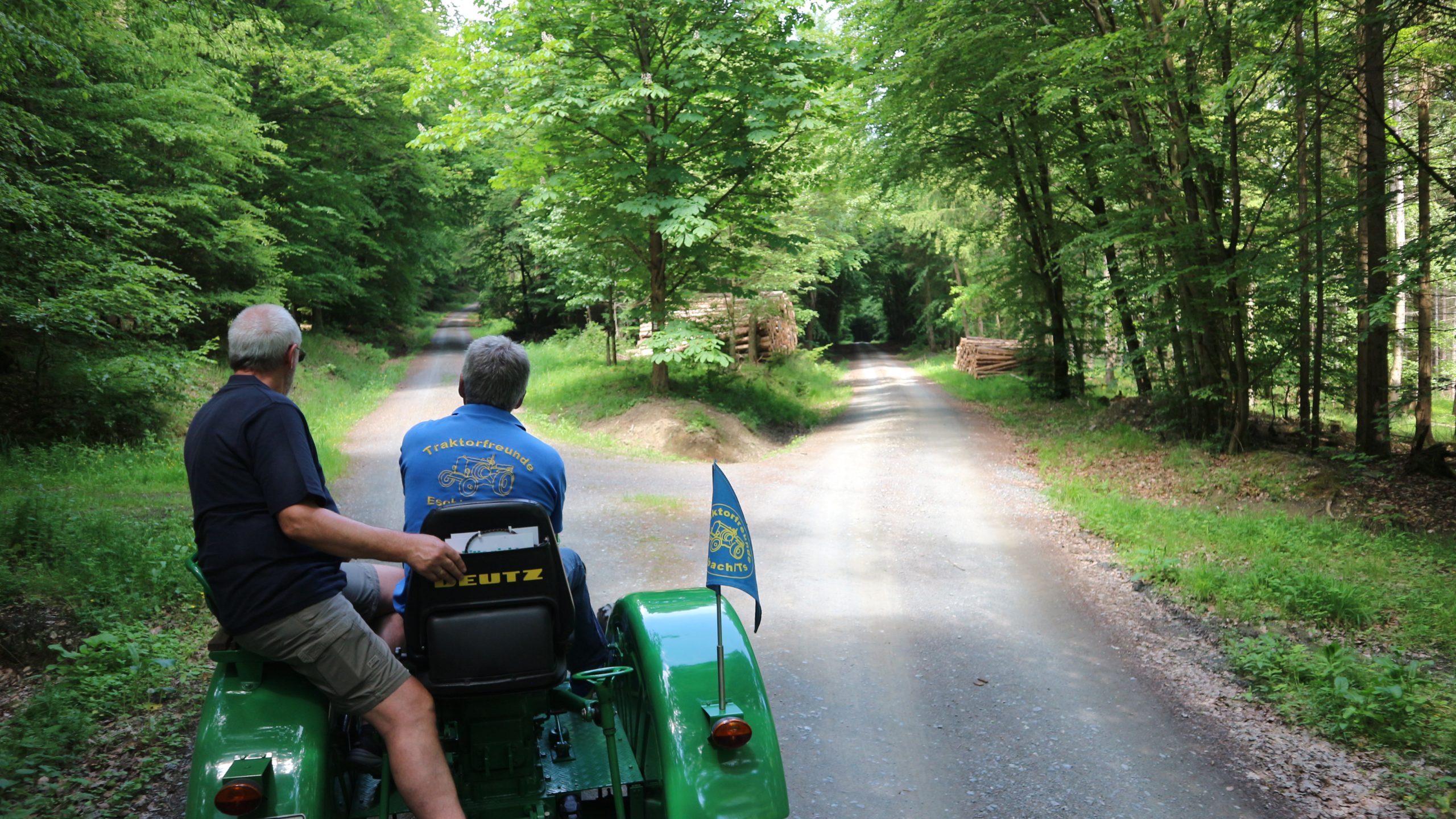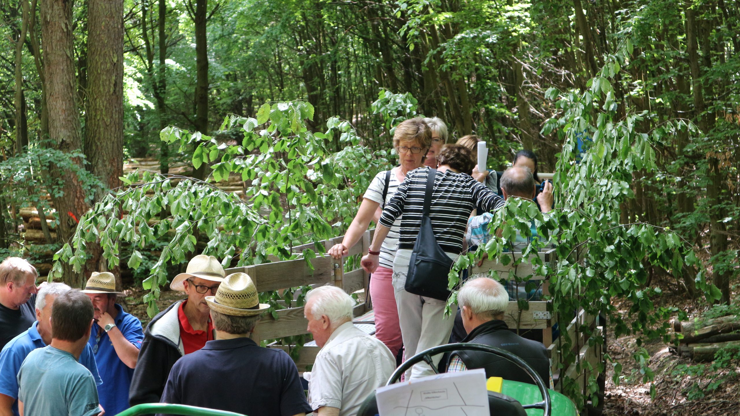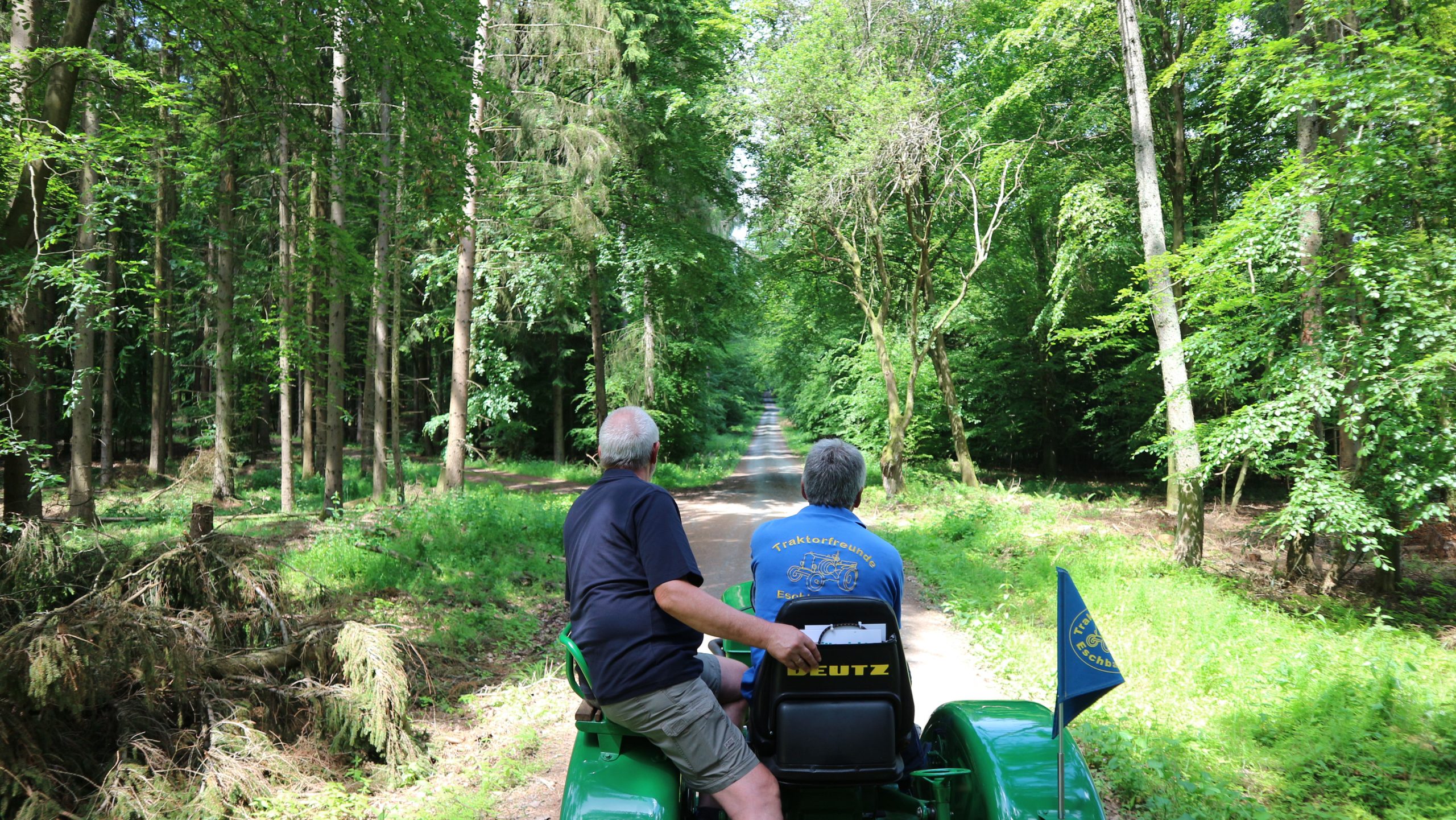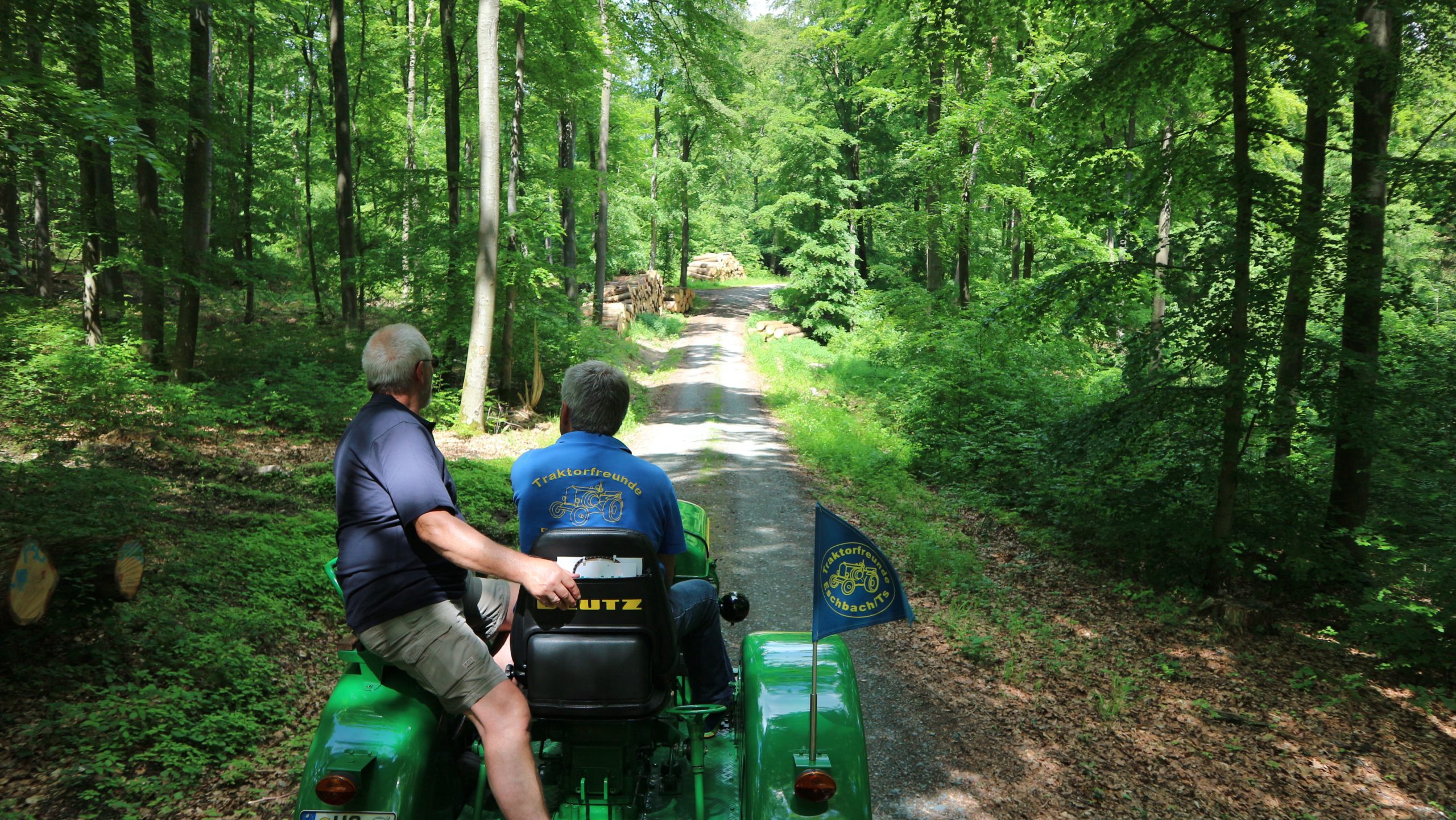 Harald Bender und Volker Schmidt von den Traktorfreunde Eschbach standen mit zwei historische Traktoren, einem Planwagen und einem mit Laub geschmückten Anhänger bereit, für die Fahrt zu den Eschbacher Silberlöchern. Bei herrlichstem Sommerwetter führte die Fahrt durch den Wald, zunächst Richtung Grävenwiesbach, dann über die Hohe Schneid, die „Schmidtsheck“, sowie den höchsten Punkt der Gemarkung (500 m), zur Wellerstraße, einem wichtigen mittelalterlichen Handelsweg. Er führte von der Wetterau über Braunfels nach Leun und weiter in den Westerwald. Endpunkt war die Gemarkung „Griebelsheck“,