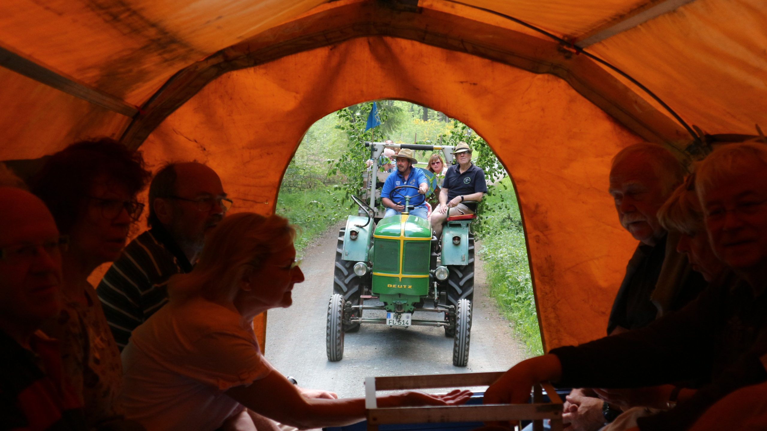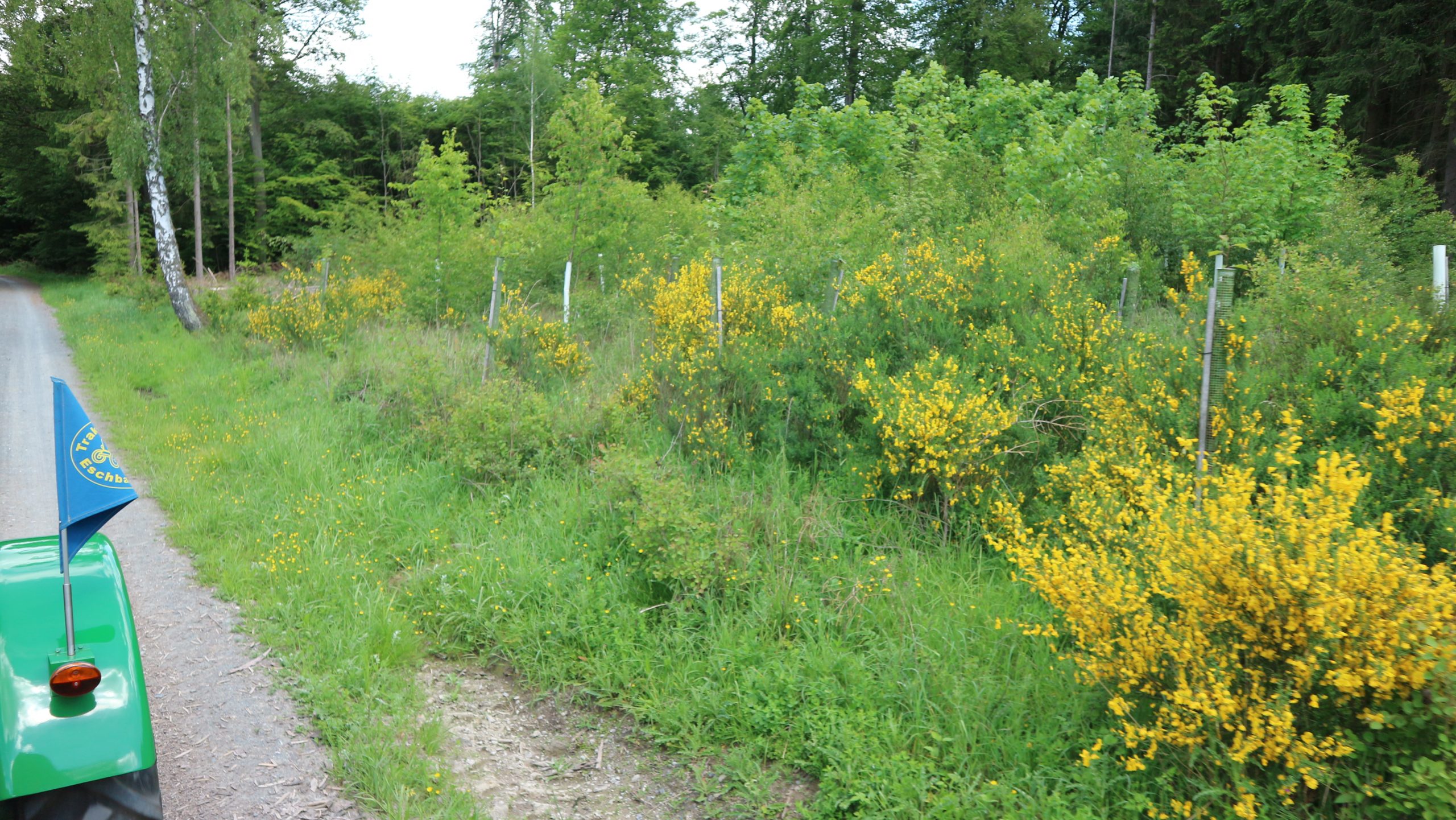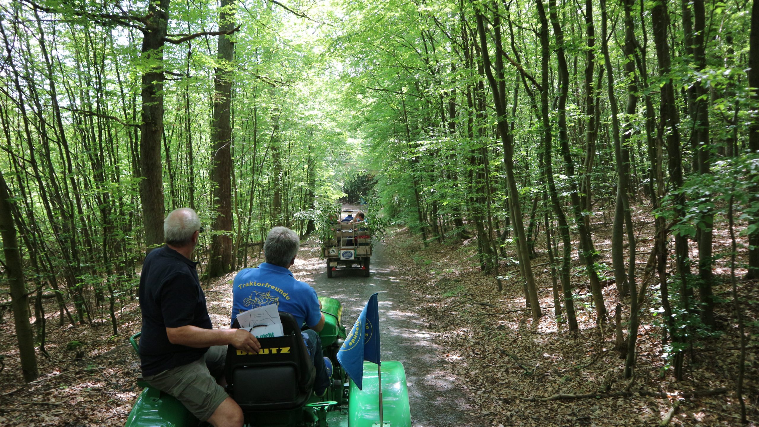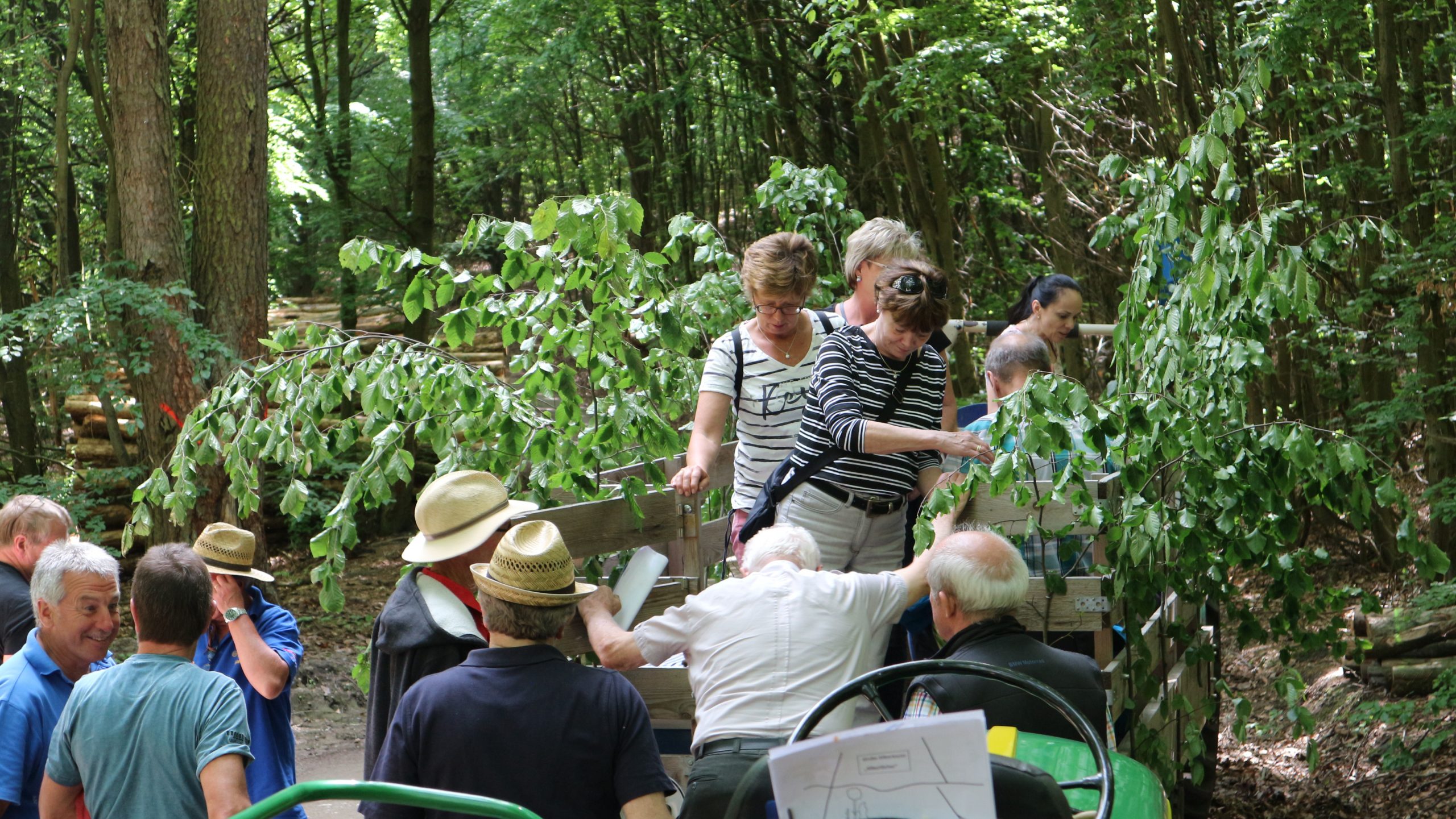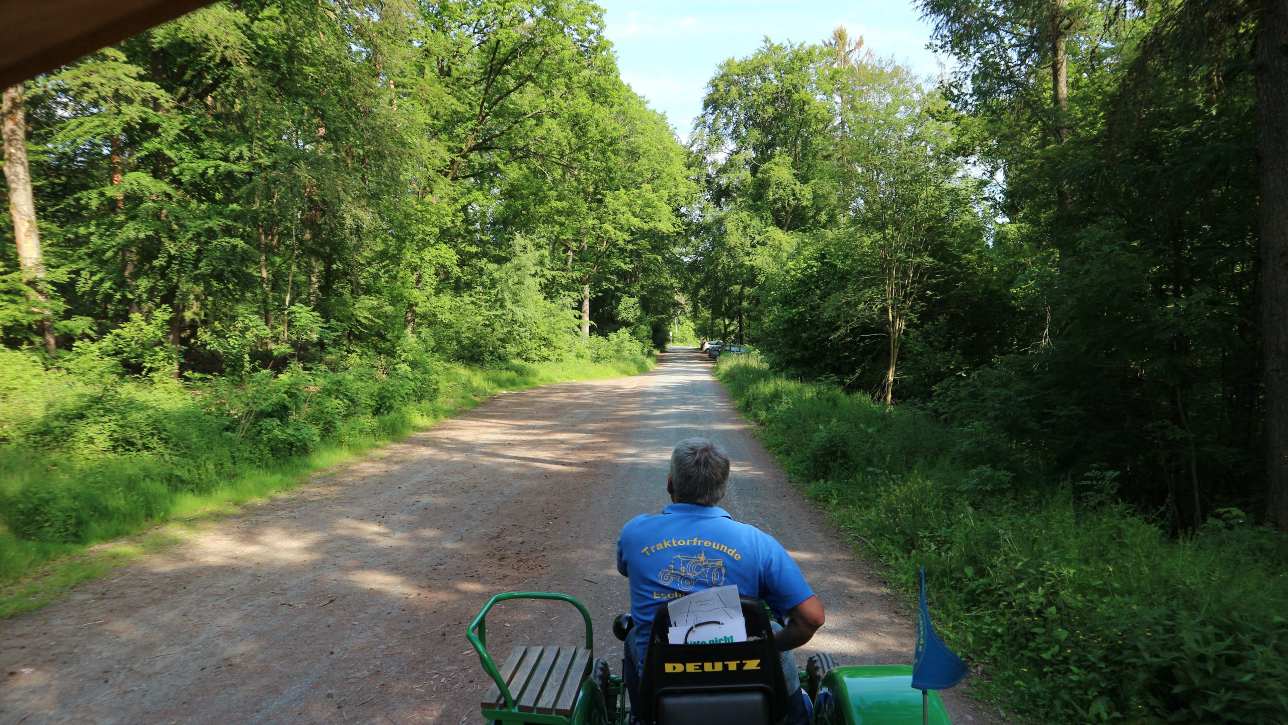 Harald Bender und Volker Schmidt von den Traktorfreunde Eschbach standen mit zwei historische Traktoren, einem Planwagen und einem mit Laub geschmückten Anhänger bereit, für die Fahrt zu den Eschbacher Silberlöchern. Bei herrlichstem Sommerwetter führte die Fahrt durch den Wald, zunächst Richtung Grävenwiesbach, dann über die Hohe Schneid, die „Schmidtsheck“, sowie den höchsten Punkt der Gemarkung (500 m), zur Wellerstraße, einem wichtigen mittelalterlichen Handelsweg. Er führte von der Wetterau über Braunfels nach Leun und weiter in den Westerwald. Endpunkt war die Gemarkung „Griebelsheck“,