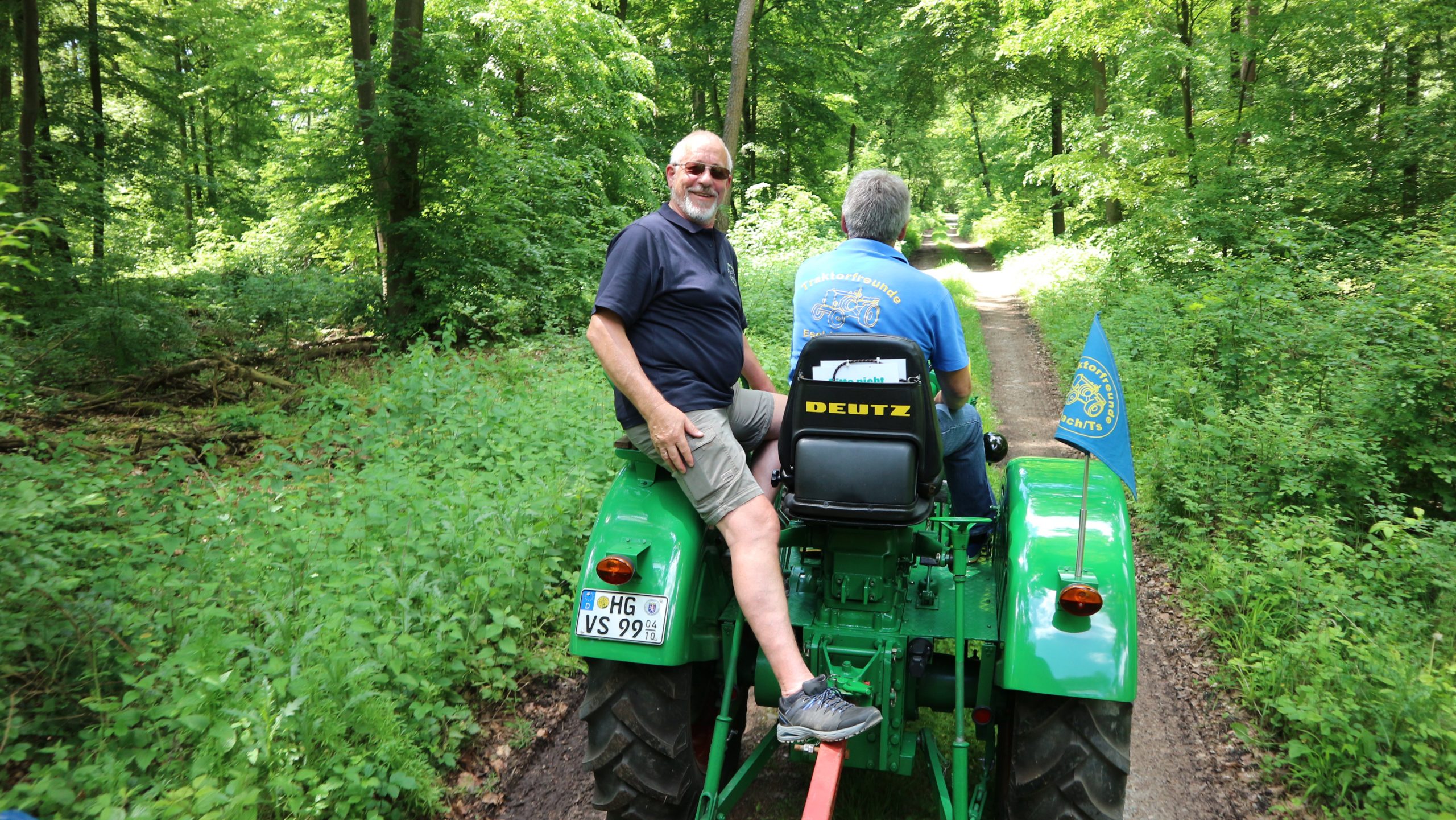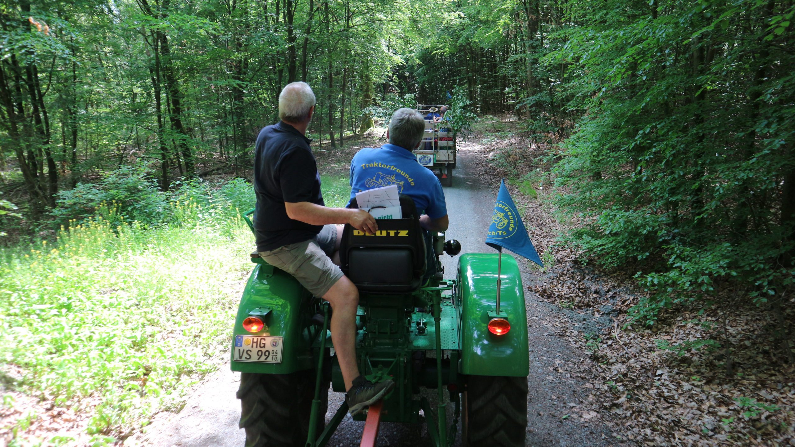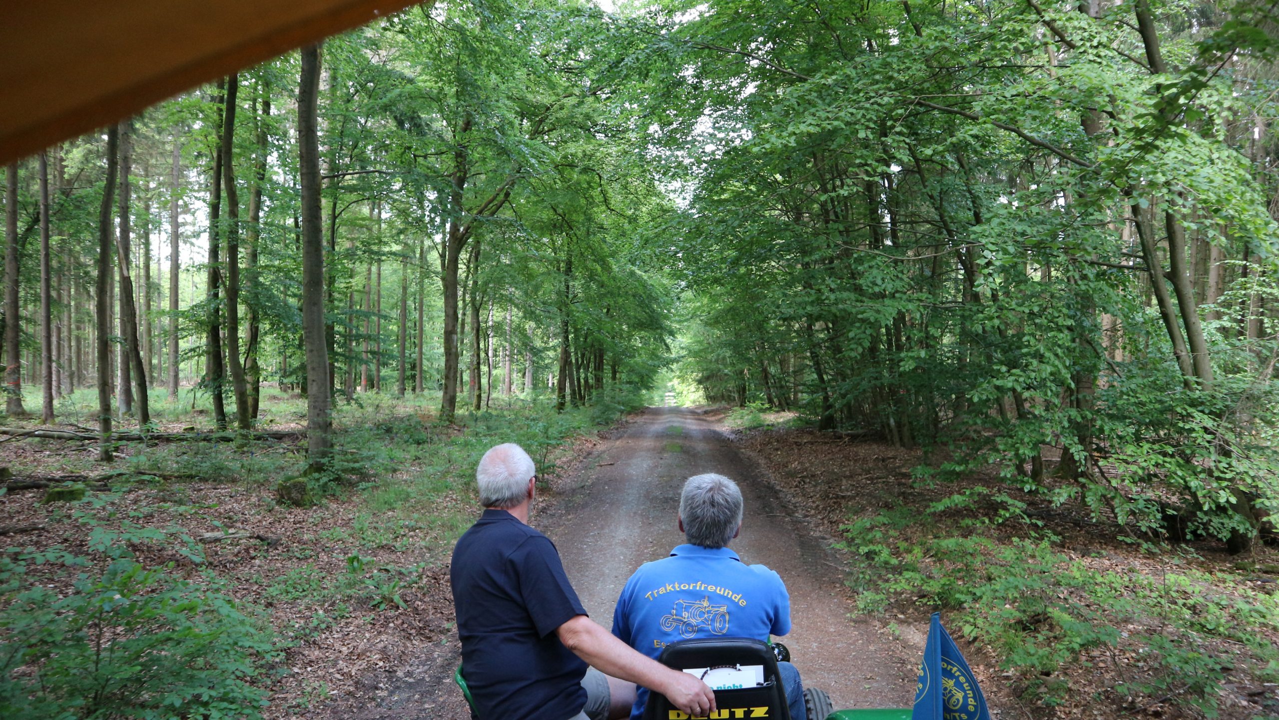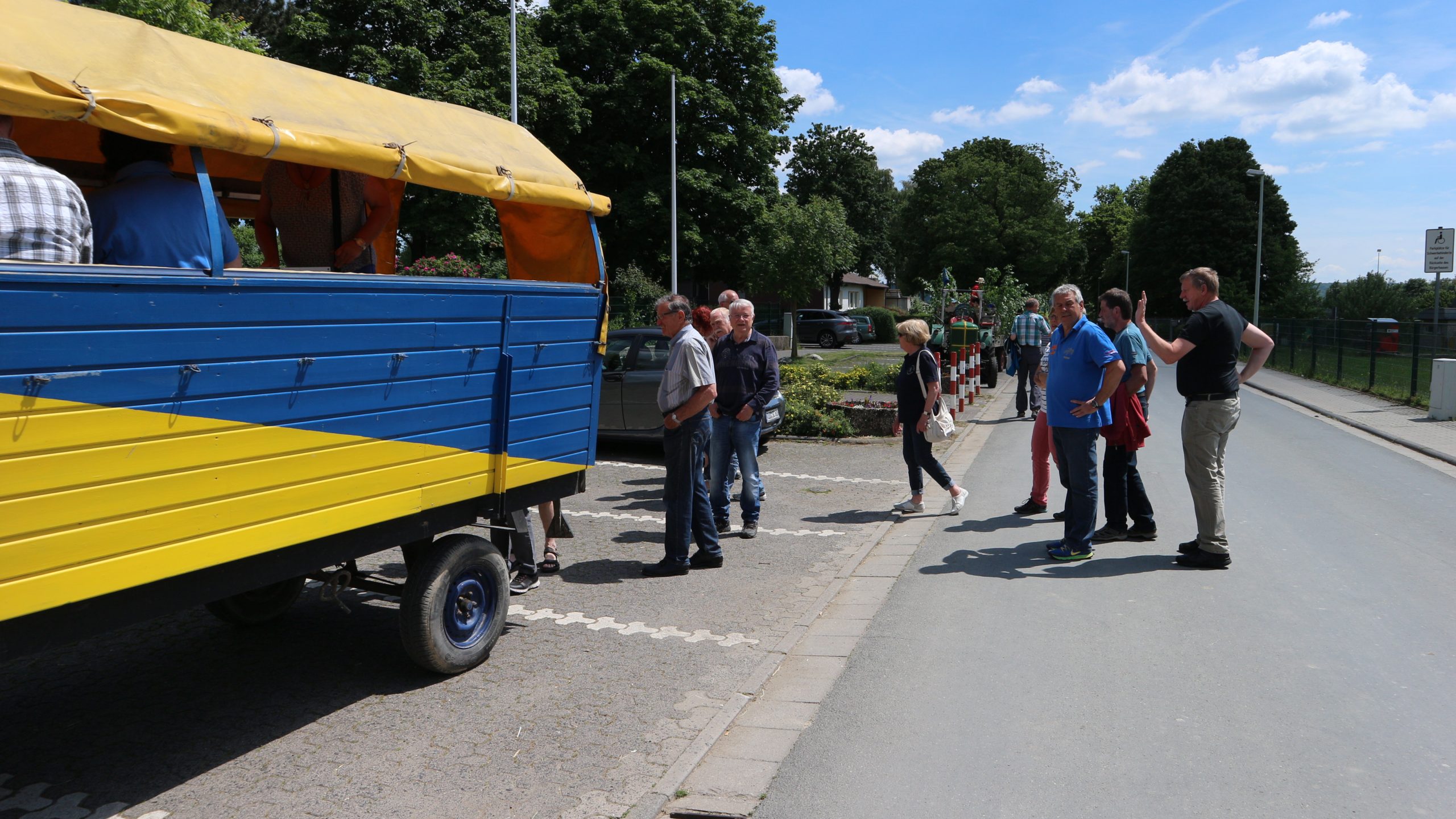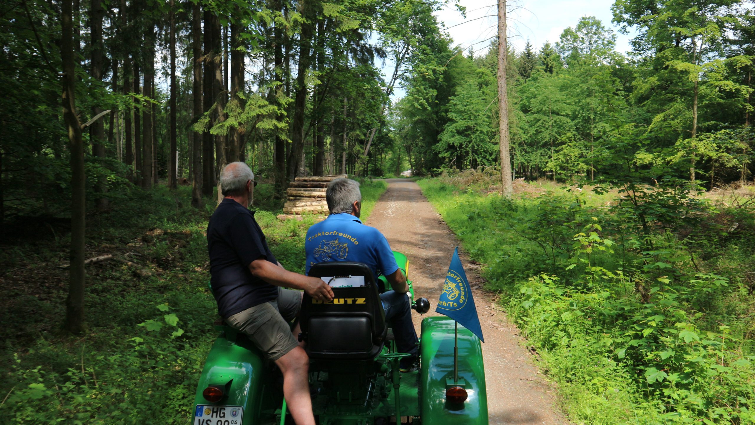 Harald Bender und Volker Schmidt von den Traktorfreunde Eschbach standen mit zwei historische Traktoren, einem Planwagen und einem mit Laub geschmückten Anhänger bereit, für die Fahrt zu den Eschbacher Silberlöchern. Bei herrlichstem Sommerwetter führte die Fahrt durch den Wald, zunächst Richtung Grävenwiesbach, dann über die Hohe Schneid, die „Schmidtsheck“, sowie den höchsten Punkt der Gemarkung (500 m), zur Wellerstraße, einem wichtigen mittelalterlichen Handelsweg. Er führte von der Wetterau über Braunfels nach Leun und weiter in den Westerwald. Endpunkt war die Gemarkung „Griebelsheck“,