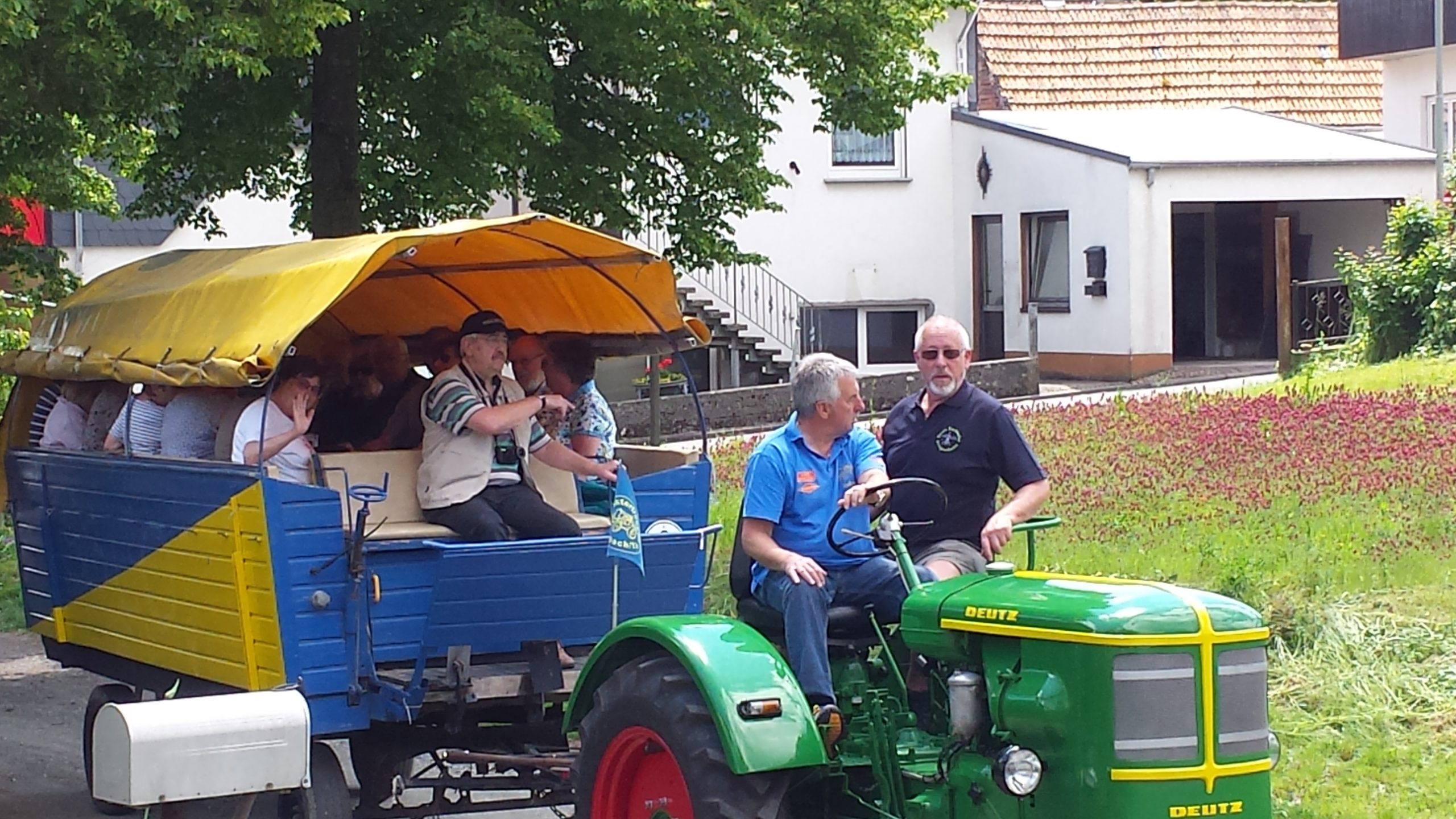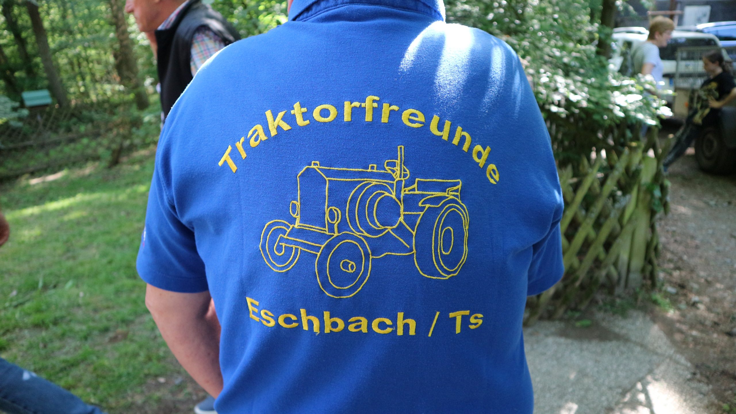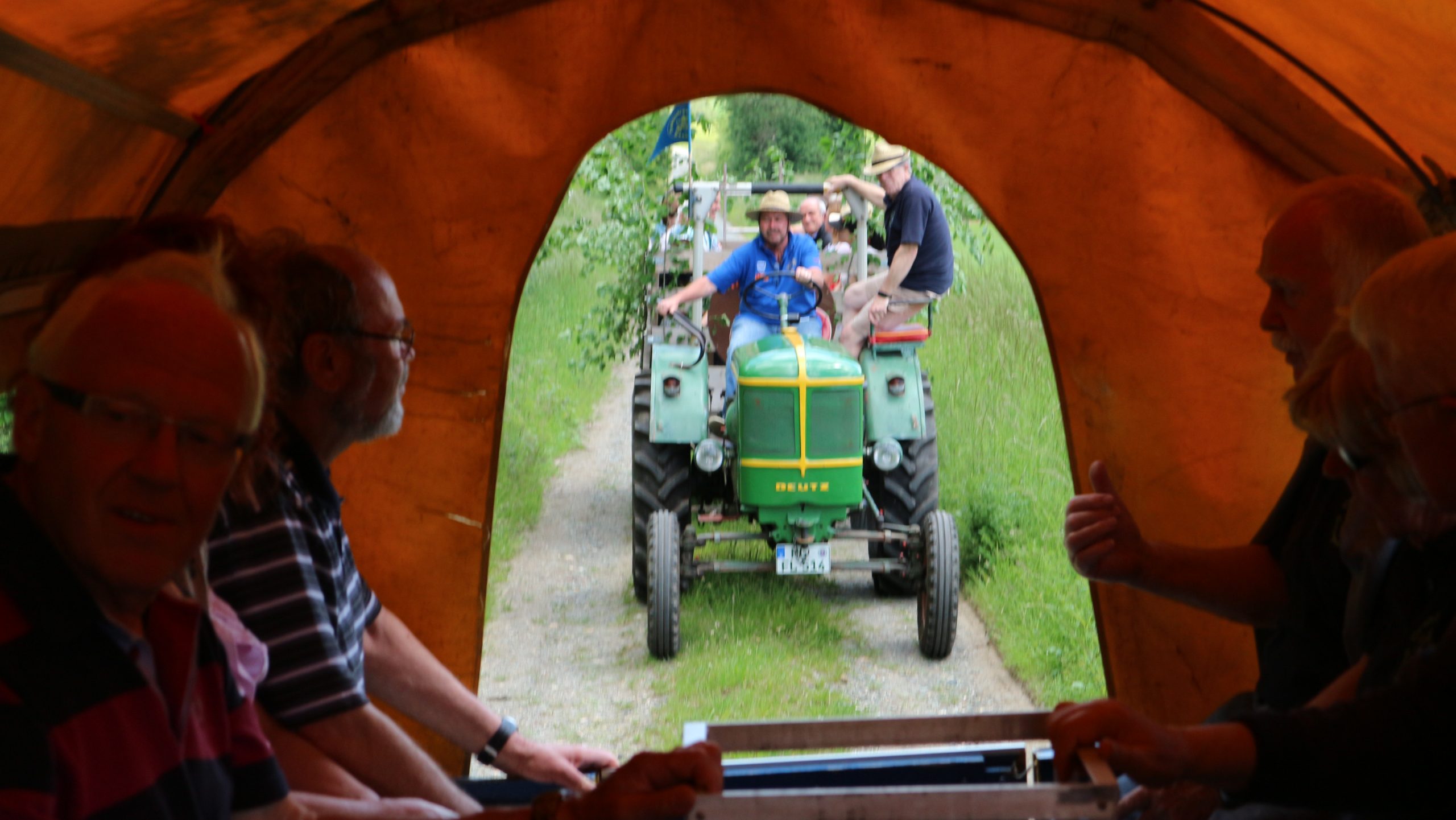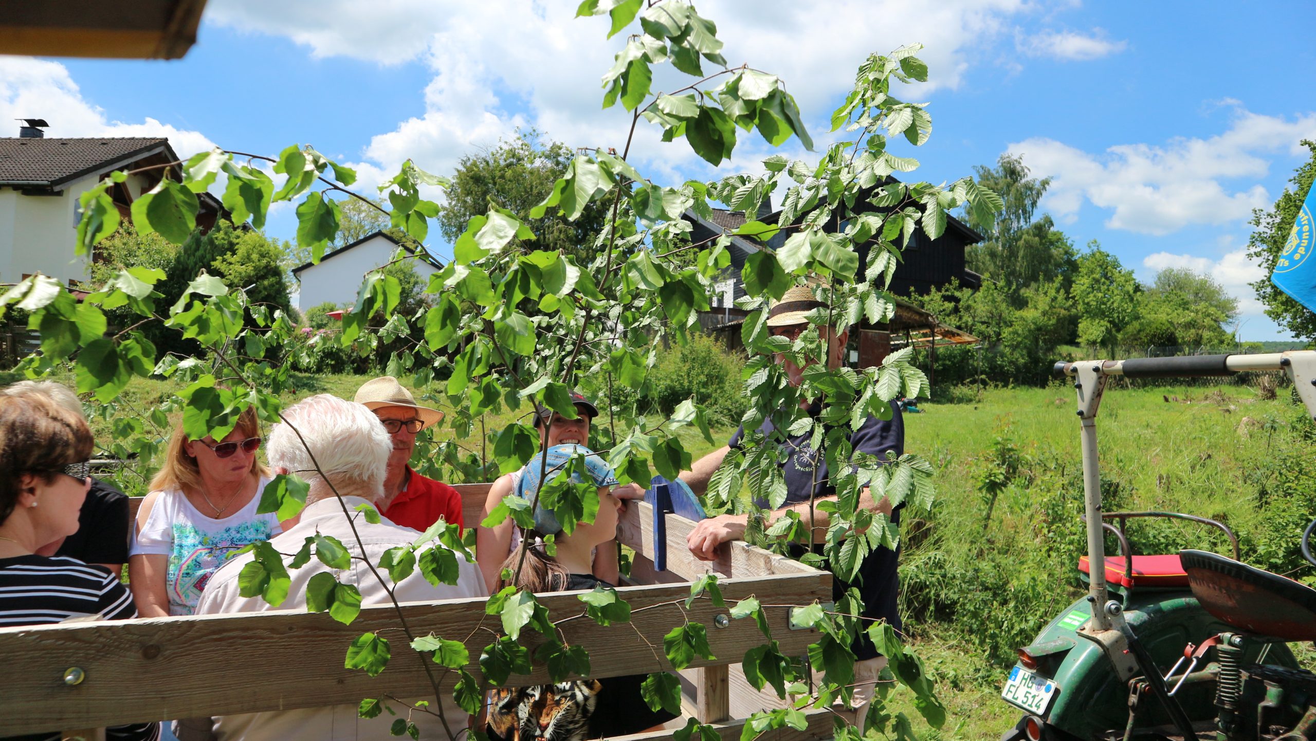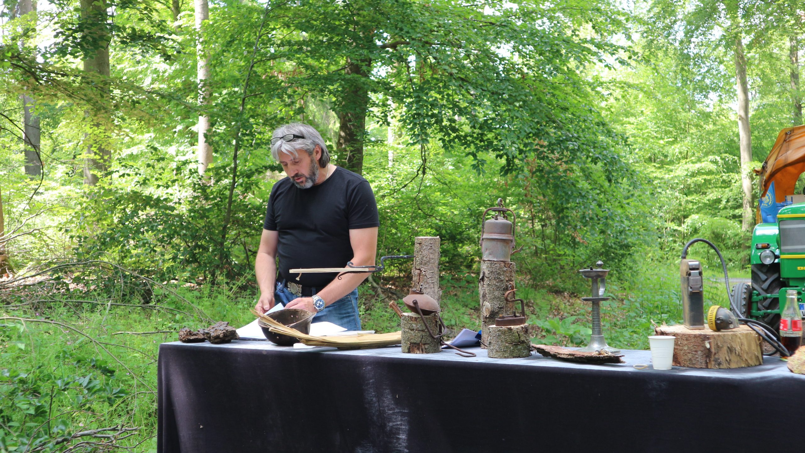 Harald Bender und Volker Schmidt von den Traktorfreunde Eschbach standen mit zwei historische Traktoren, einem Planwagen und einem mit Laub geschmückten Anhänger bereit, für die Fahrt zu den Eschbacher Silberlöchern. Bei herrlichstem Sommerwetter führte die Fahrt durch den Wald, zunächst Richtung Grävenwiesbach, dann über die Hohe Schneid, die „Schmidtsheck“, sowie den höchsten Punkt der Gemarkung (500 m), zur Wellerstraße, einem wichtigen mittelalterlichen Handelsweg. Er führte von der Wetterau über Braunfels nach Leun und weiter in den Westerwald. Endpunkt war die Gemarkung „Griebelsheck“,