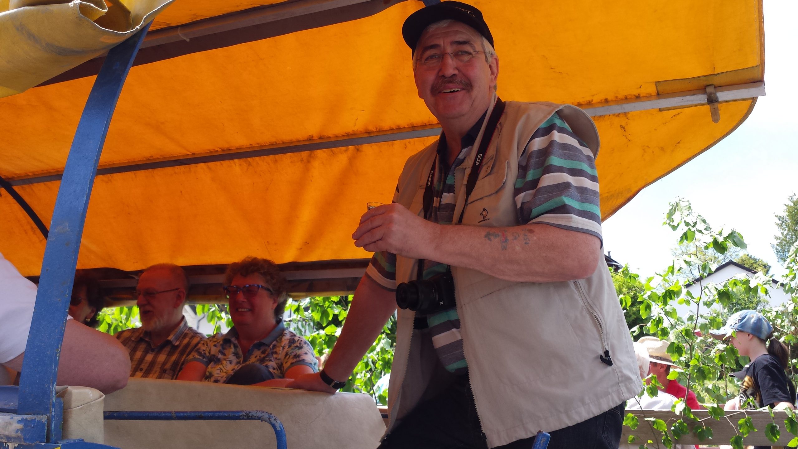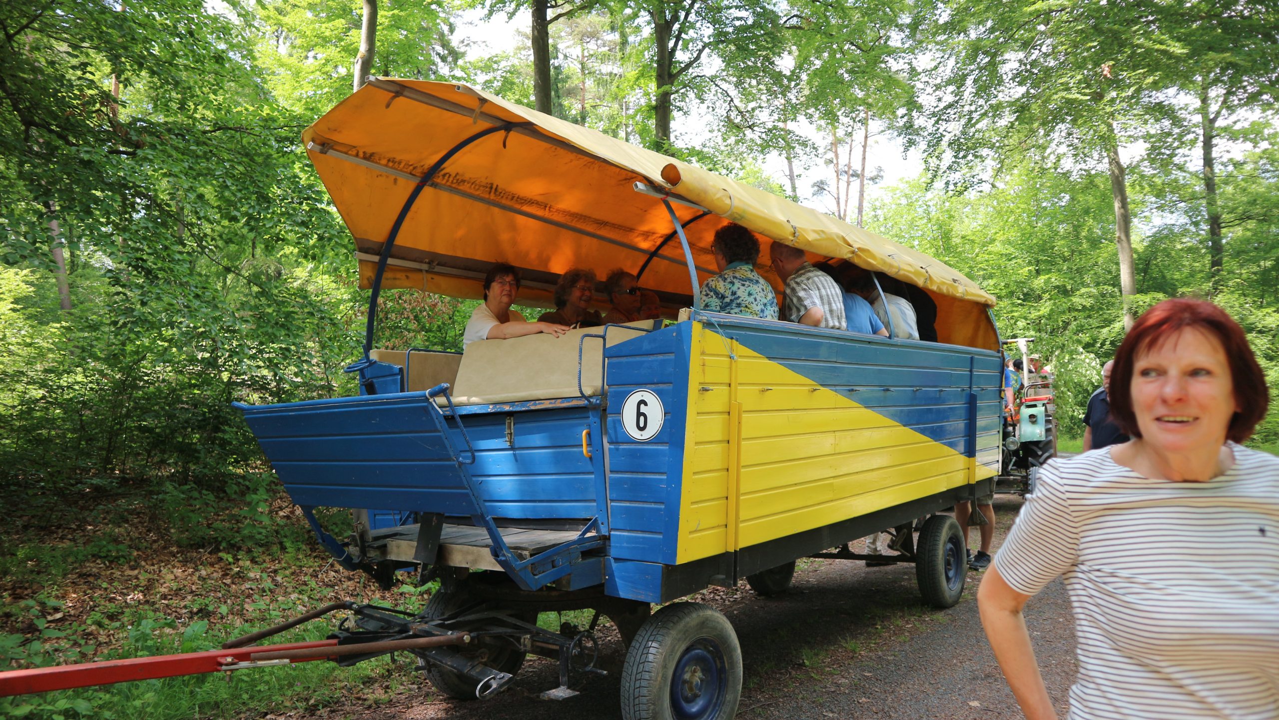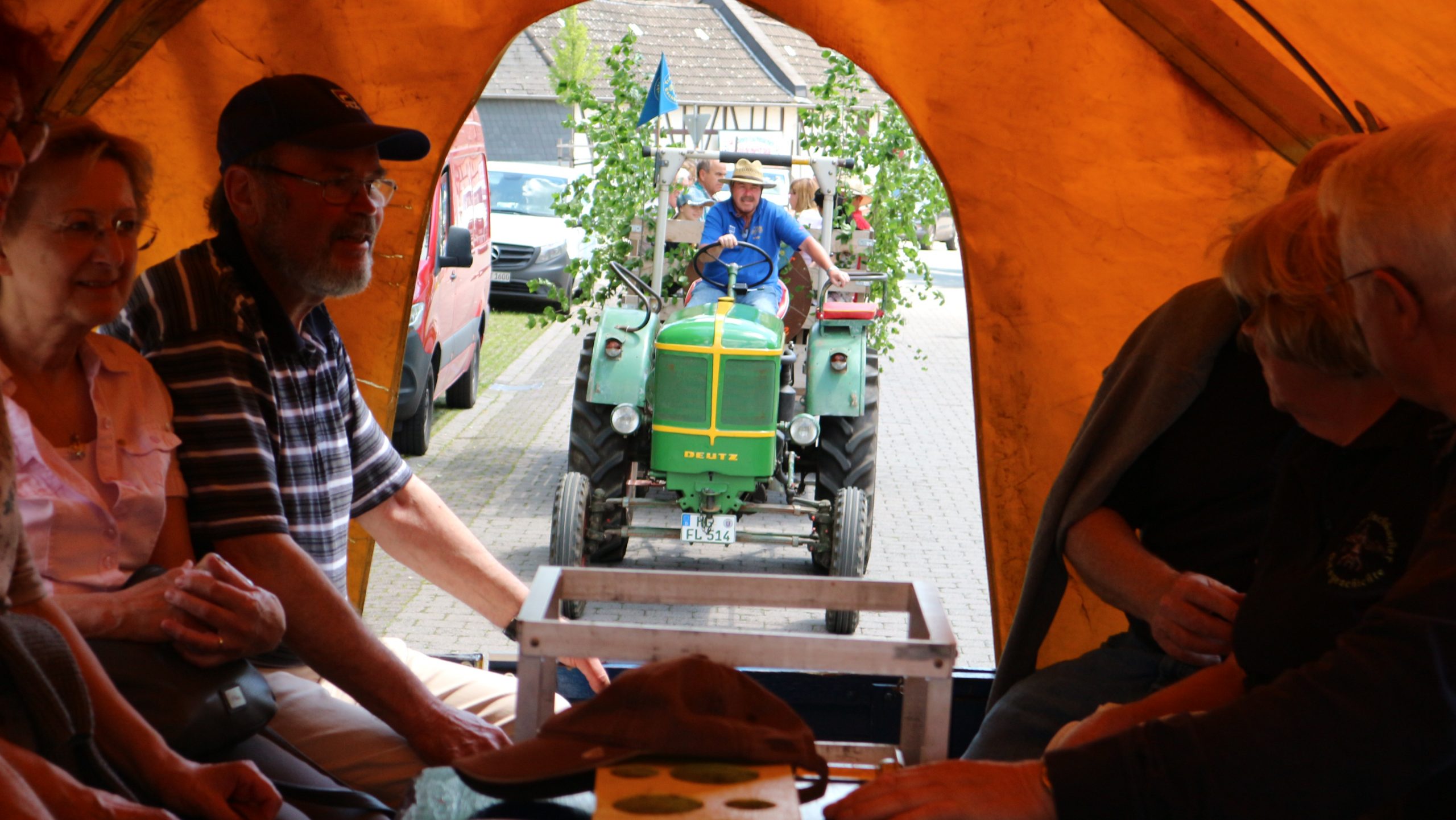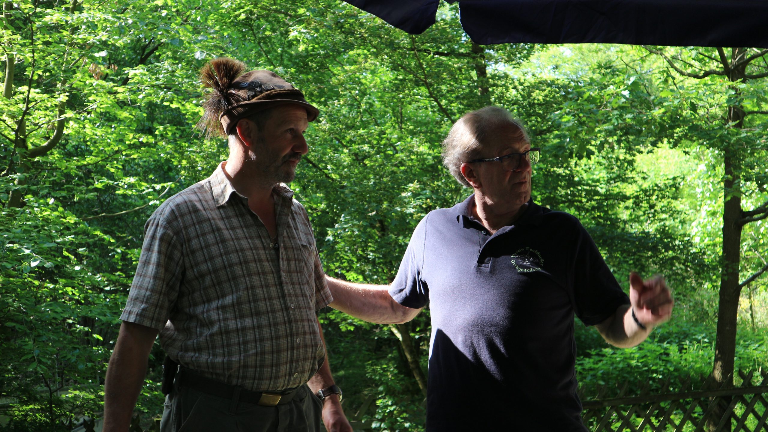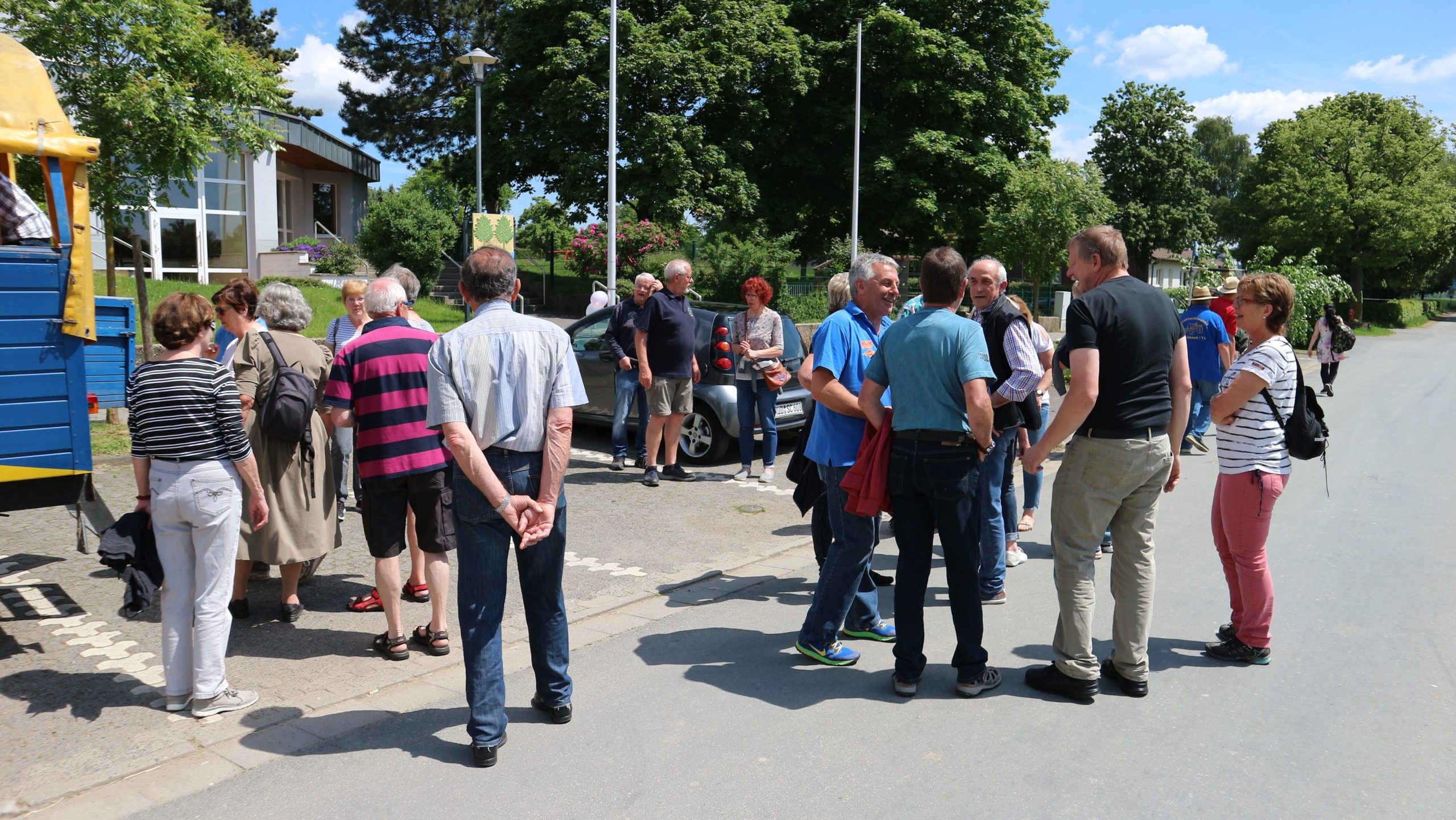 Harald Bender und Volker Schmidt von den Traktorfreunde Eschbach standen mit zwei historische Traktoren, einem Planwagen und einem mit Laub geschmückten Anhänger bereit, für die Fahrt zu den Eschbacher Silberlöchern. Bei herrlichstem Sommerwetter führte die Fahrt durch den Wald, zunächst Richtung Grävenwiesbach, dann über die Hohe Schneid, die „Schmidtsheck“, sowie den höchsten Punkt der Gemarkung (500 m), zur Wellerstraße, einem wichtigen mittelalterlichen Handelsweg. Er führte von der Wetterau über Braunfels nach Leun und weiter in den Westerwald. Endpunkt war die Gemarkung „Griebelsheck“,