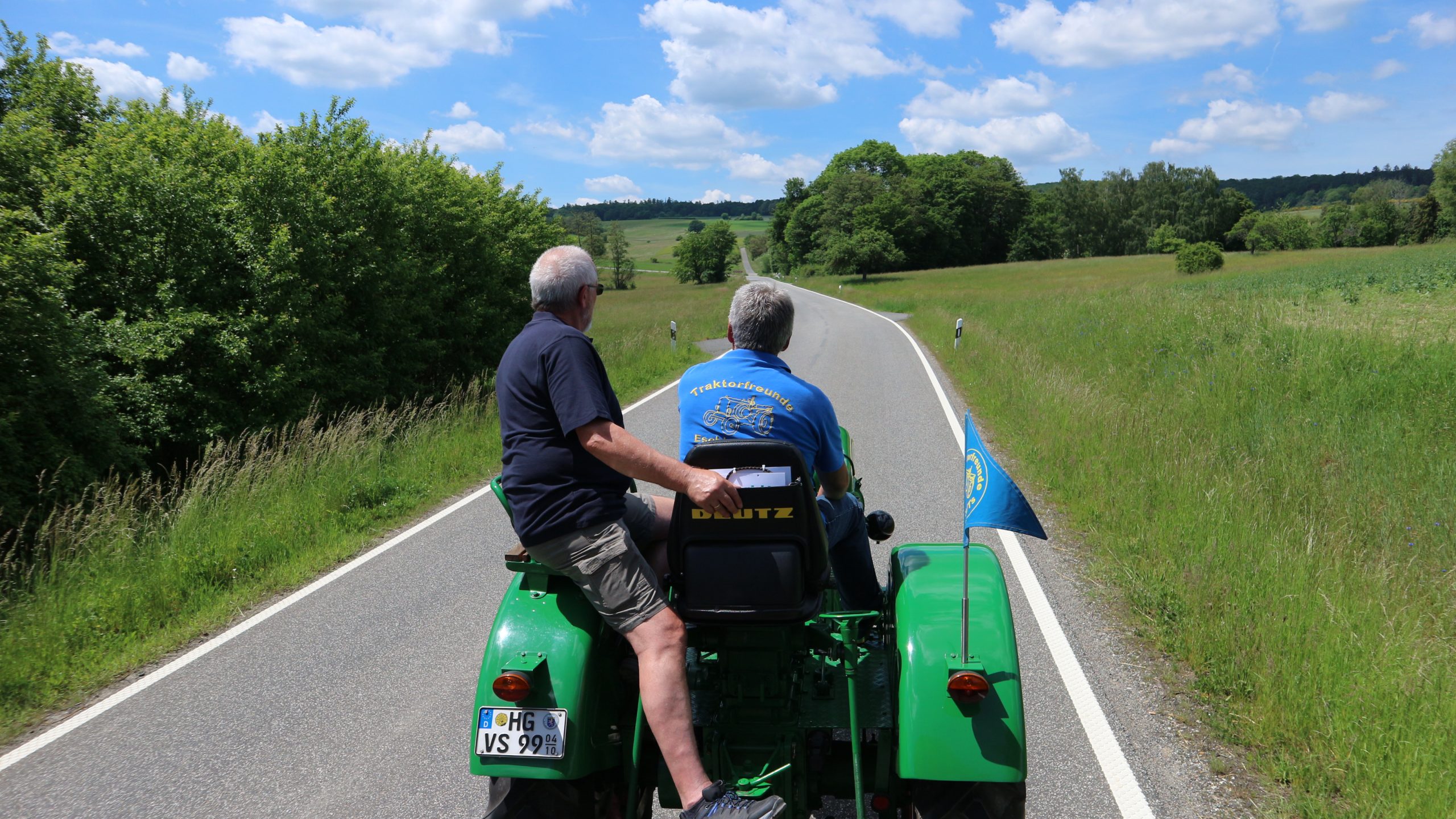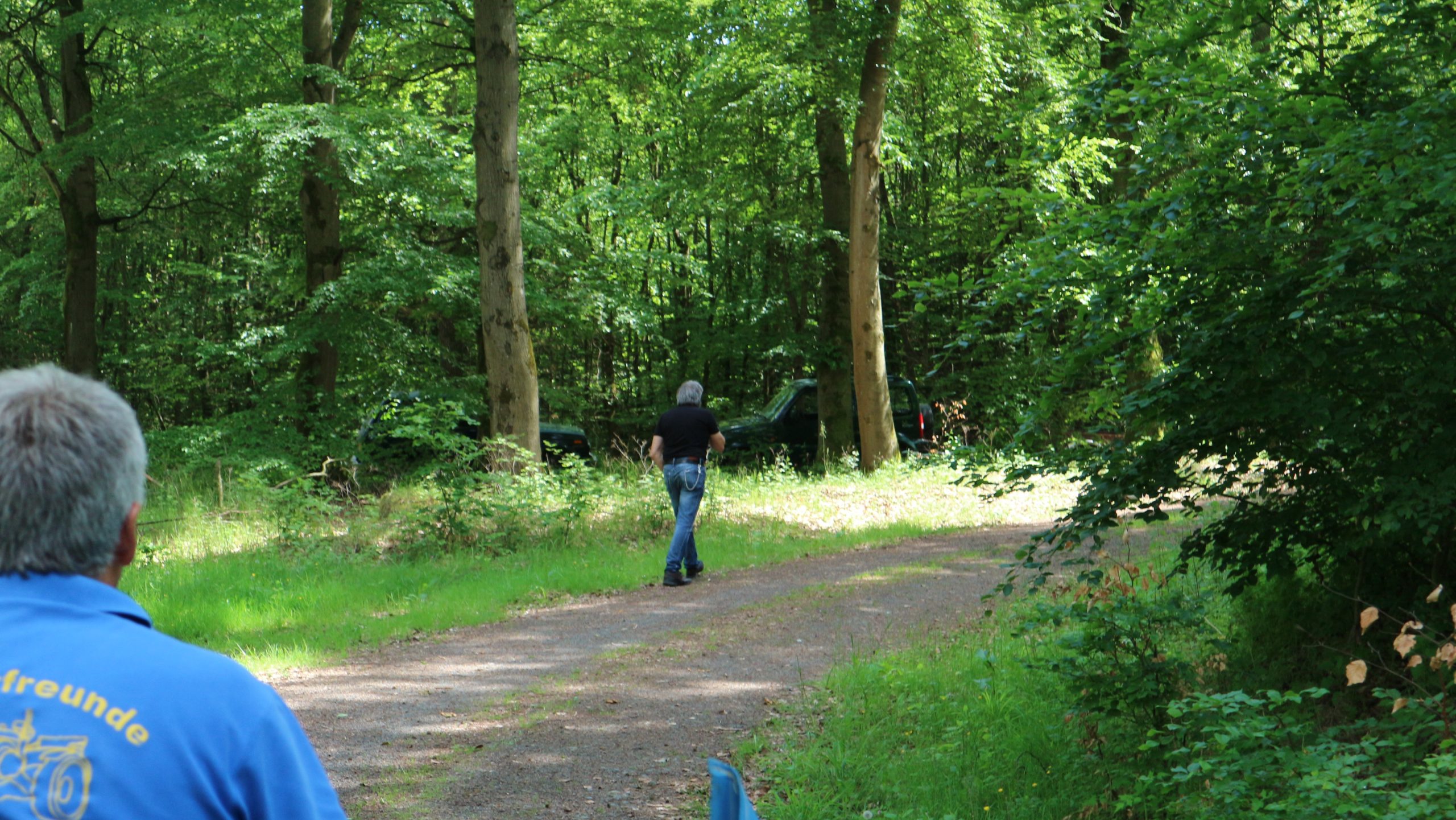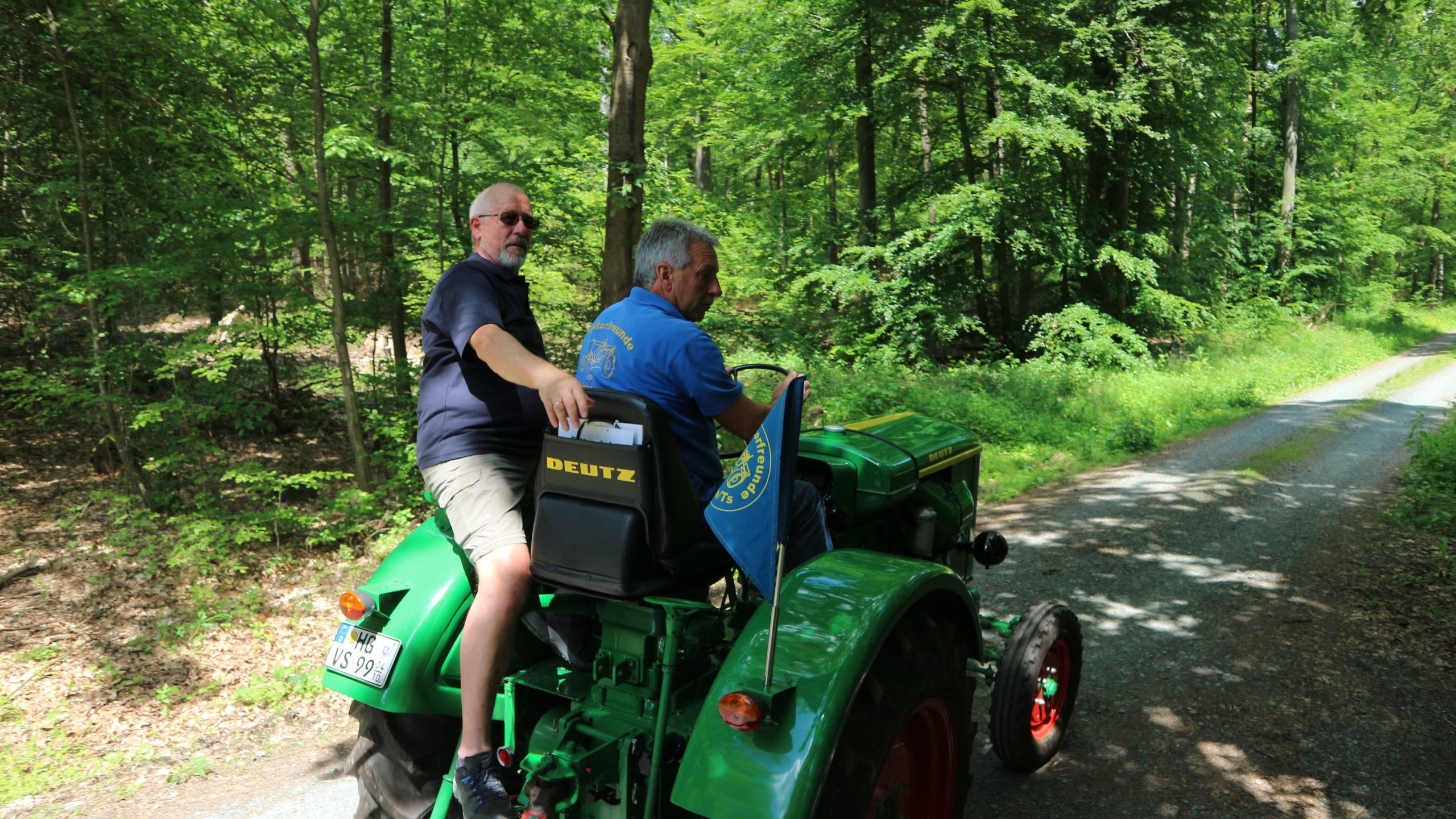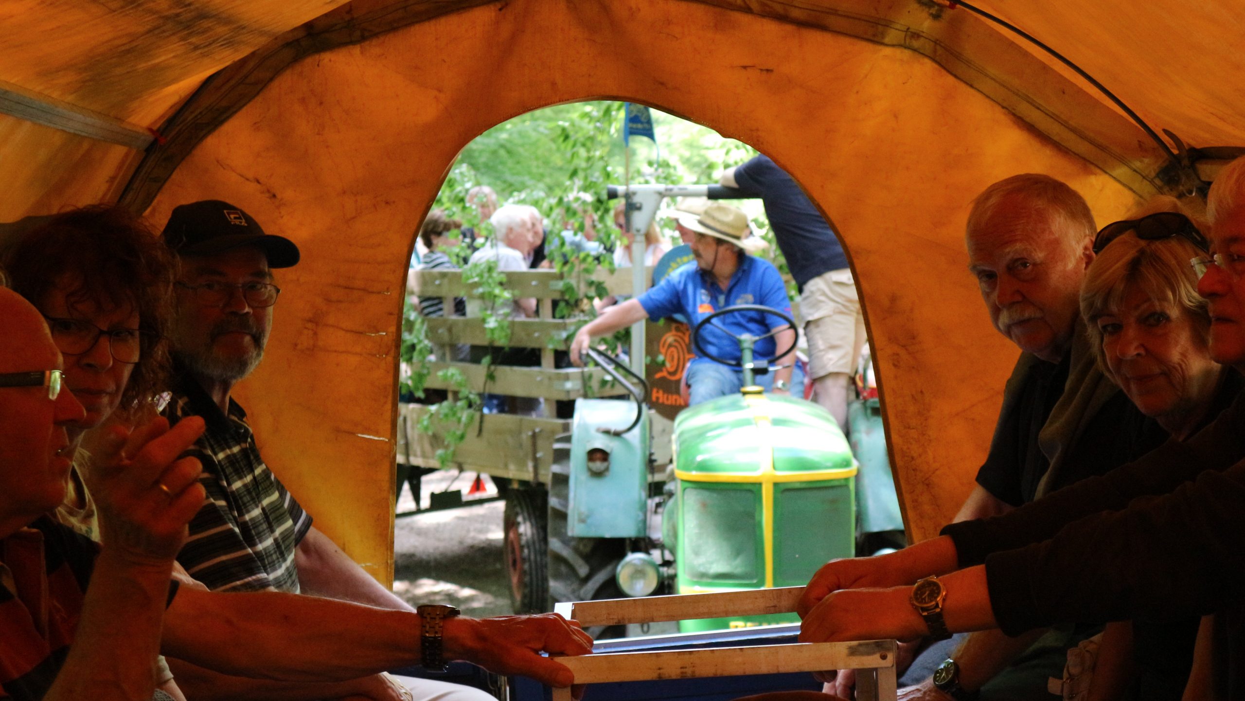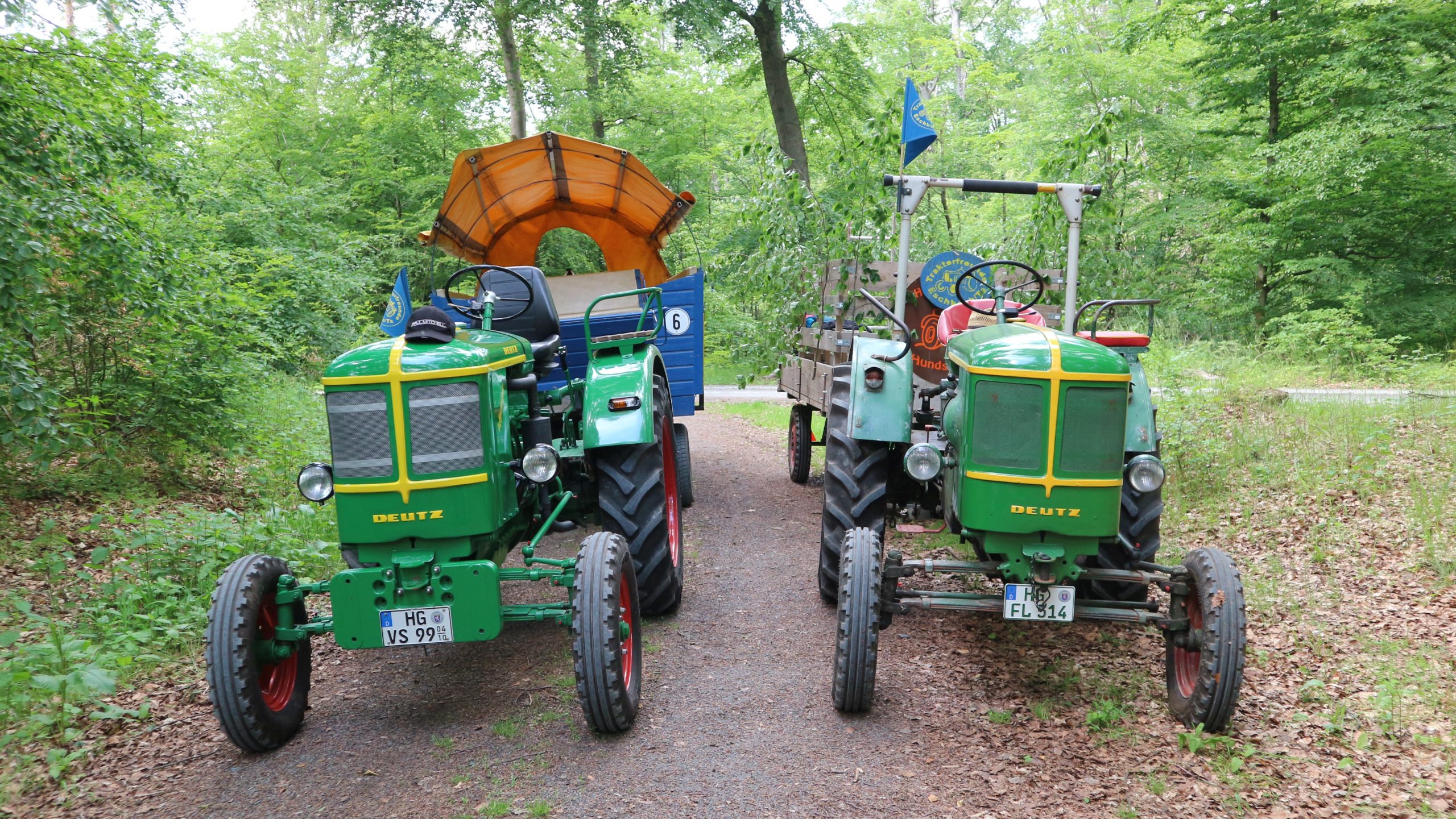 Harald Bender und Volker Schmidt von den Traktorfreunde Eschbach standen mit zwei historische Traktoren, einem Planwagen und einem mit Laub geschmückten Anhänger bereit, für die Fahrt zu den Eschbacher Silberlöchern. Bei herrlichstem Sommerwetter führte die Fahrt durch den Wald, zunächst Richtung Grävenwiesbach, dann über die Hohe Schneid, die „Schmidtsheck“, sowie den höchsten Punkt der Gemarkung (500 m), zur Wellerstraße, einem wichtigen mittelalterlichen Handelsweg. Er führte von der Wetterau über Braunfels nach Leun und weiter in den Westerwald. Endpunkt war die Gemarkung „Griebelsheck“,