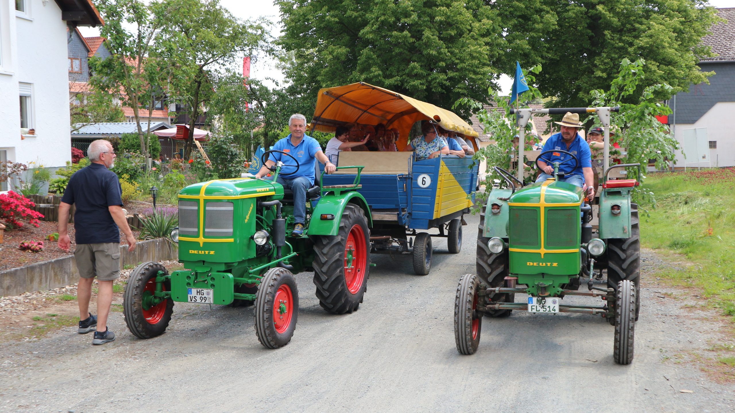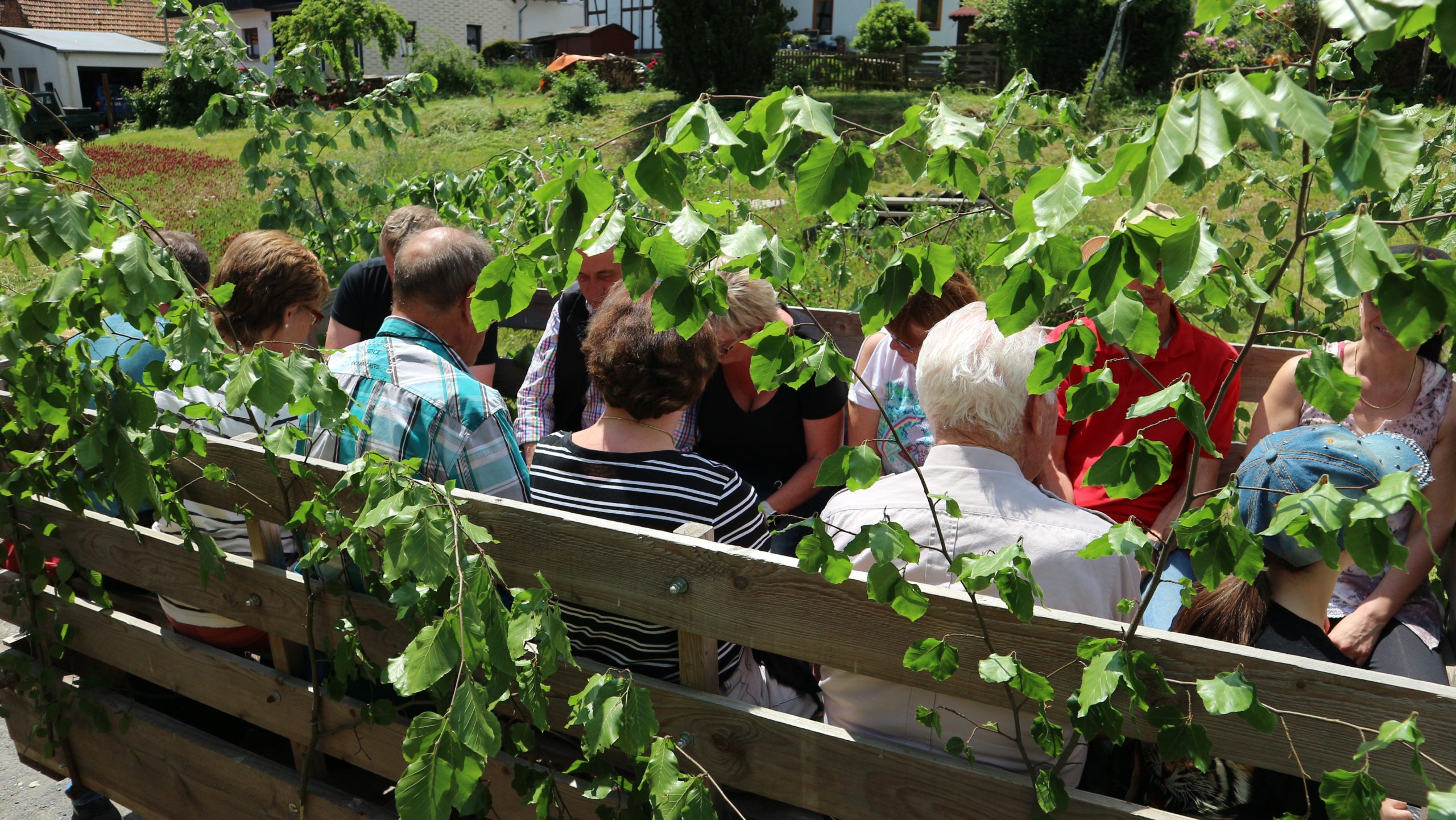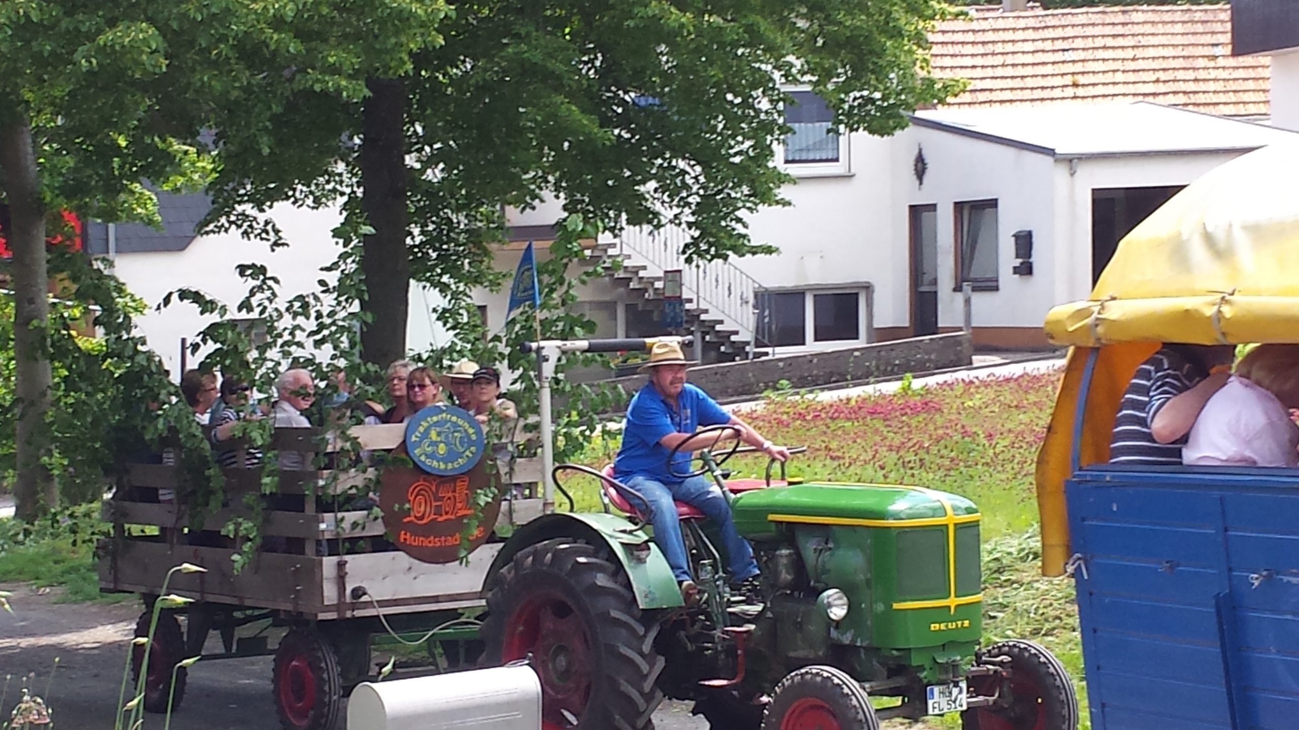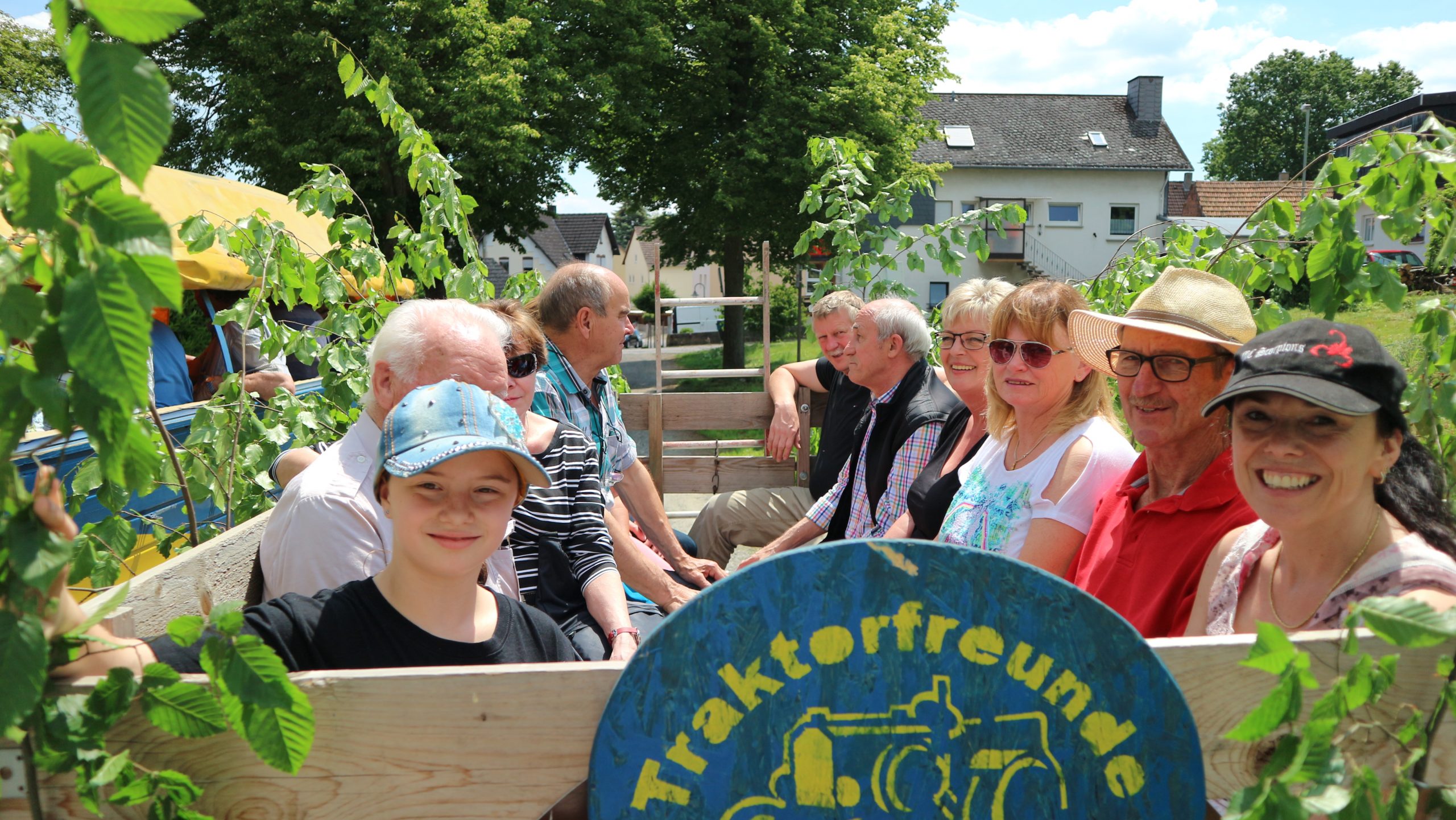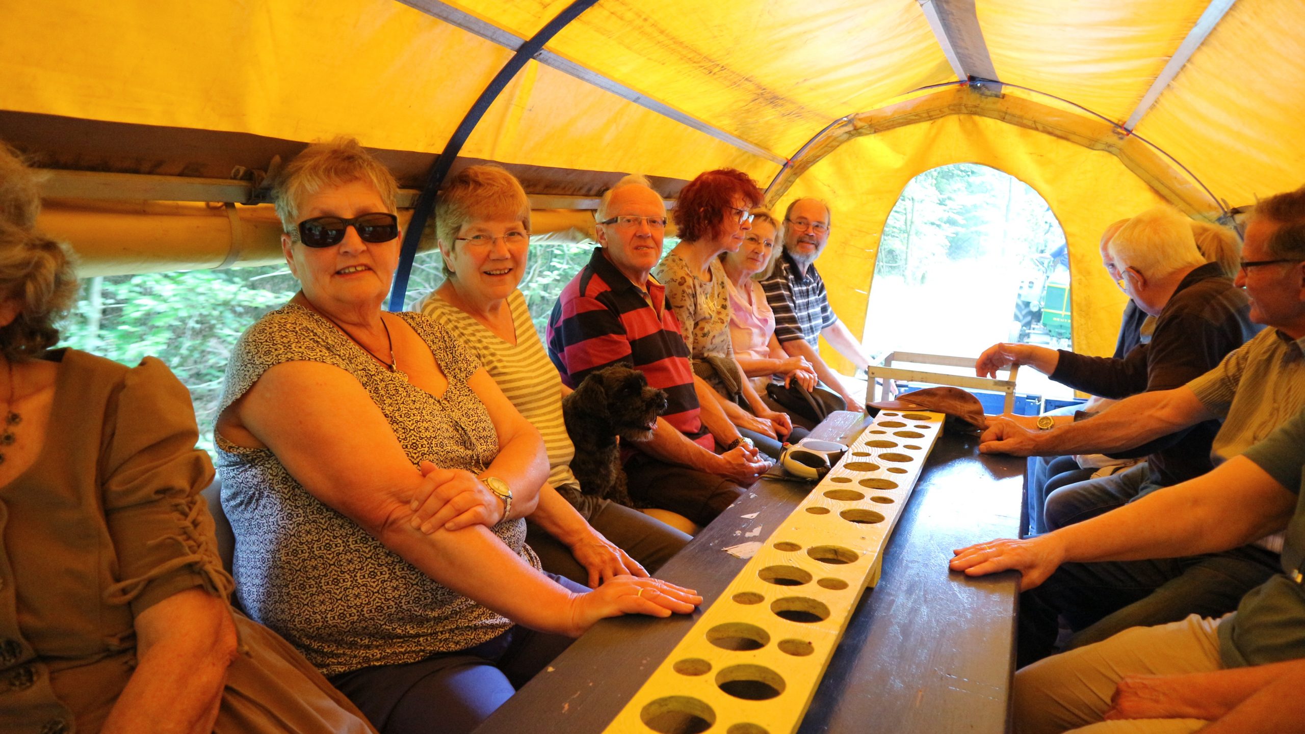 Harald Bender und Volker Schmidt von den Traktorfreunde Eschbach standen mit zwei historische Traktoren, einem Planwagen und einem mit Laub geschmückten Anhänger bereit, für die Fahrt zu den Eschbacher Silberlöchern. Bei herrlichstem Sommerwetter führte die Fahrt durch den Wald, zunächst Richtung Grävenwiesbach, dann über die Hohe Schneid, die „Schmidtsheck“, sowie den höchsten Punkt der Gemarkung (500 m), zur Wellerstraße, einem wichtigen mittelalterlichen Handelsweg. Er führte von der Wetterau über Braunfels nach Leun und weiter in den Westerwald. Endpunkt war die Gemarkung „Griebelsheck“,
