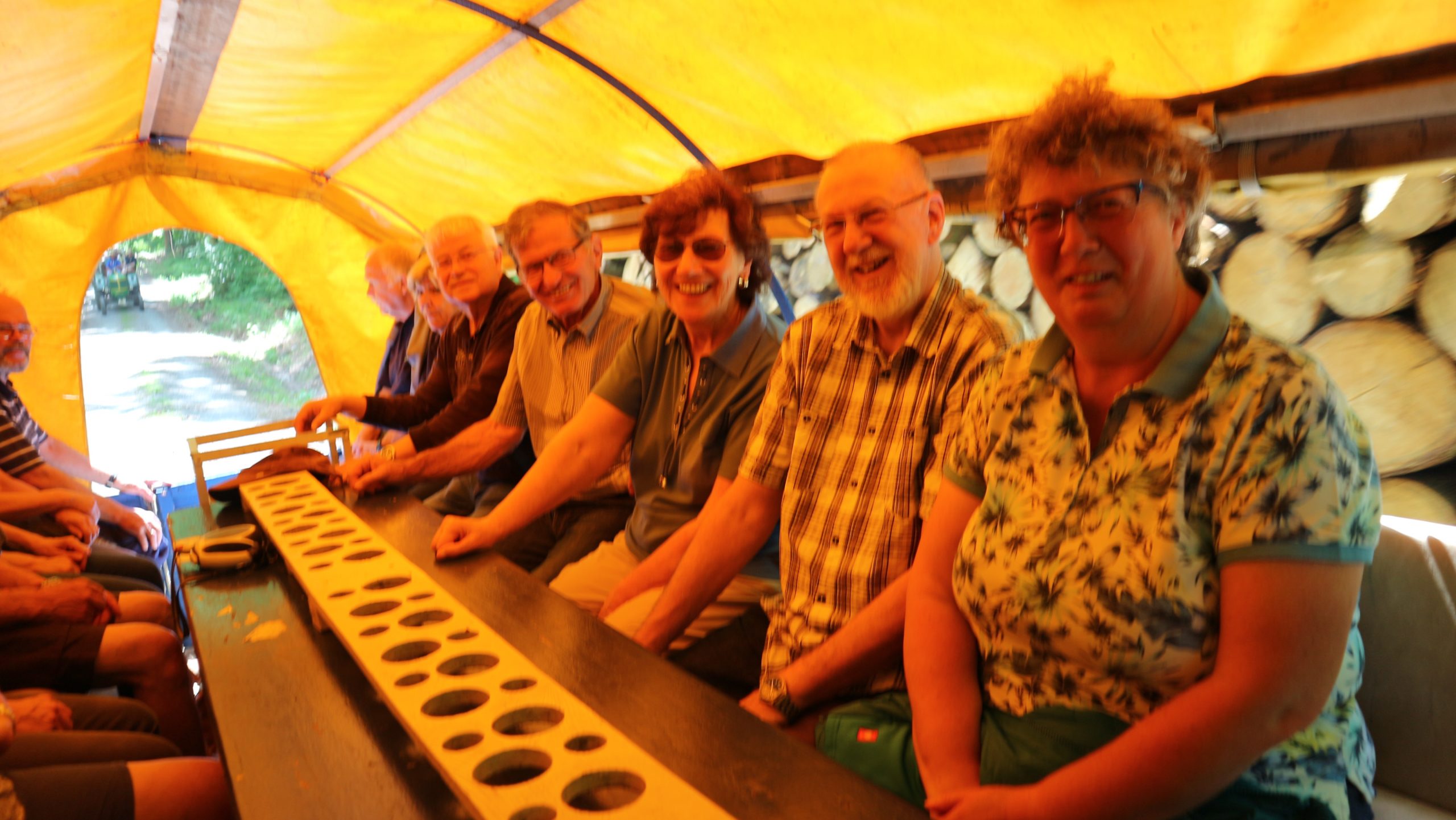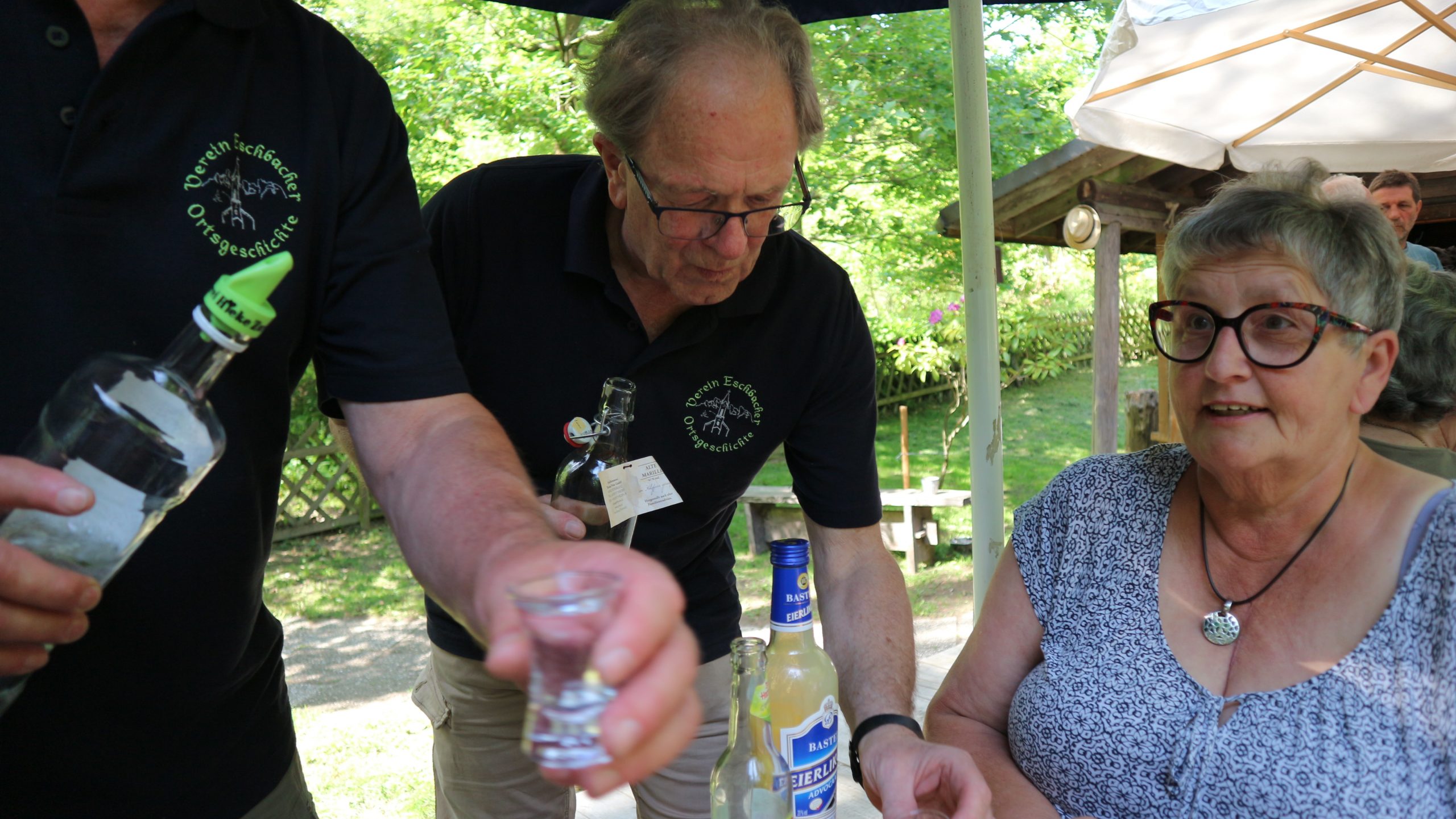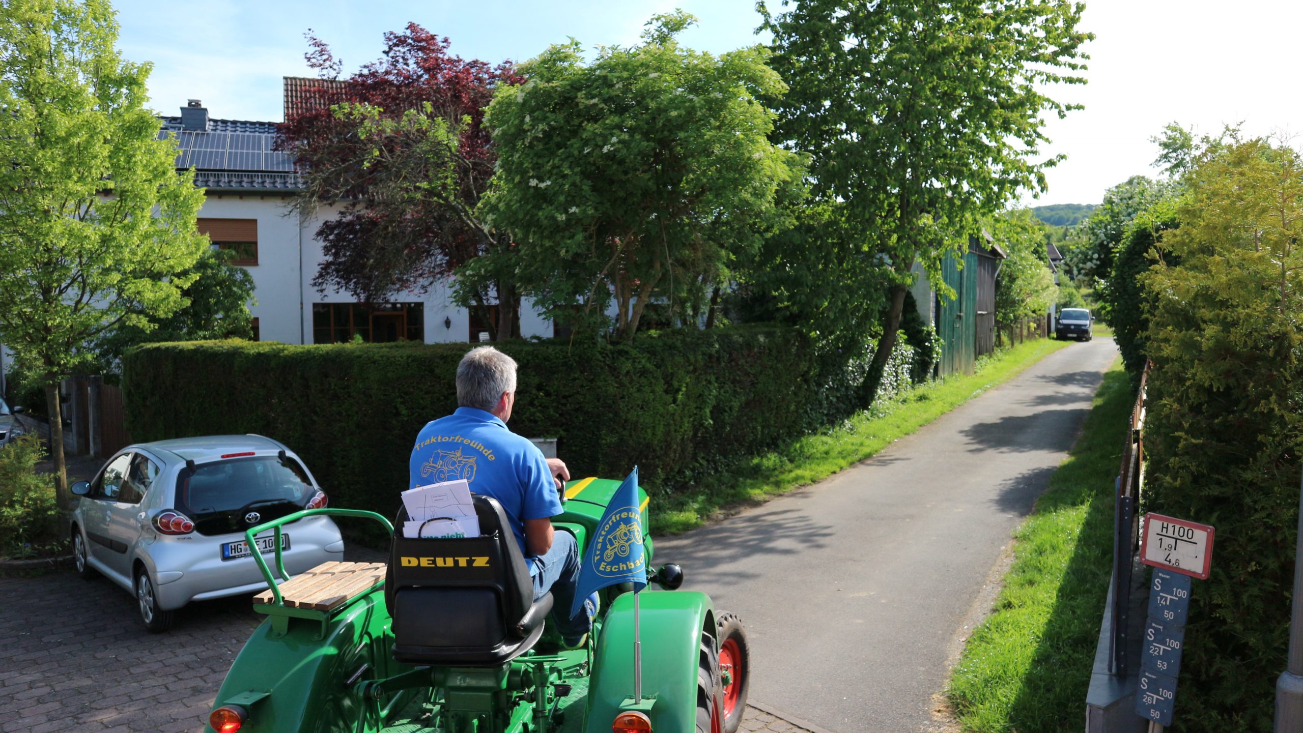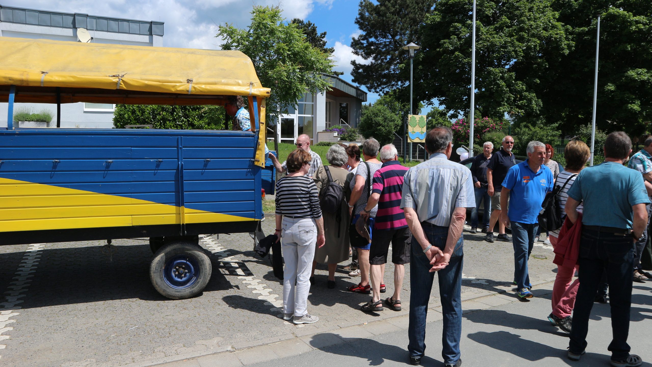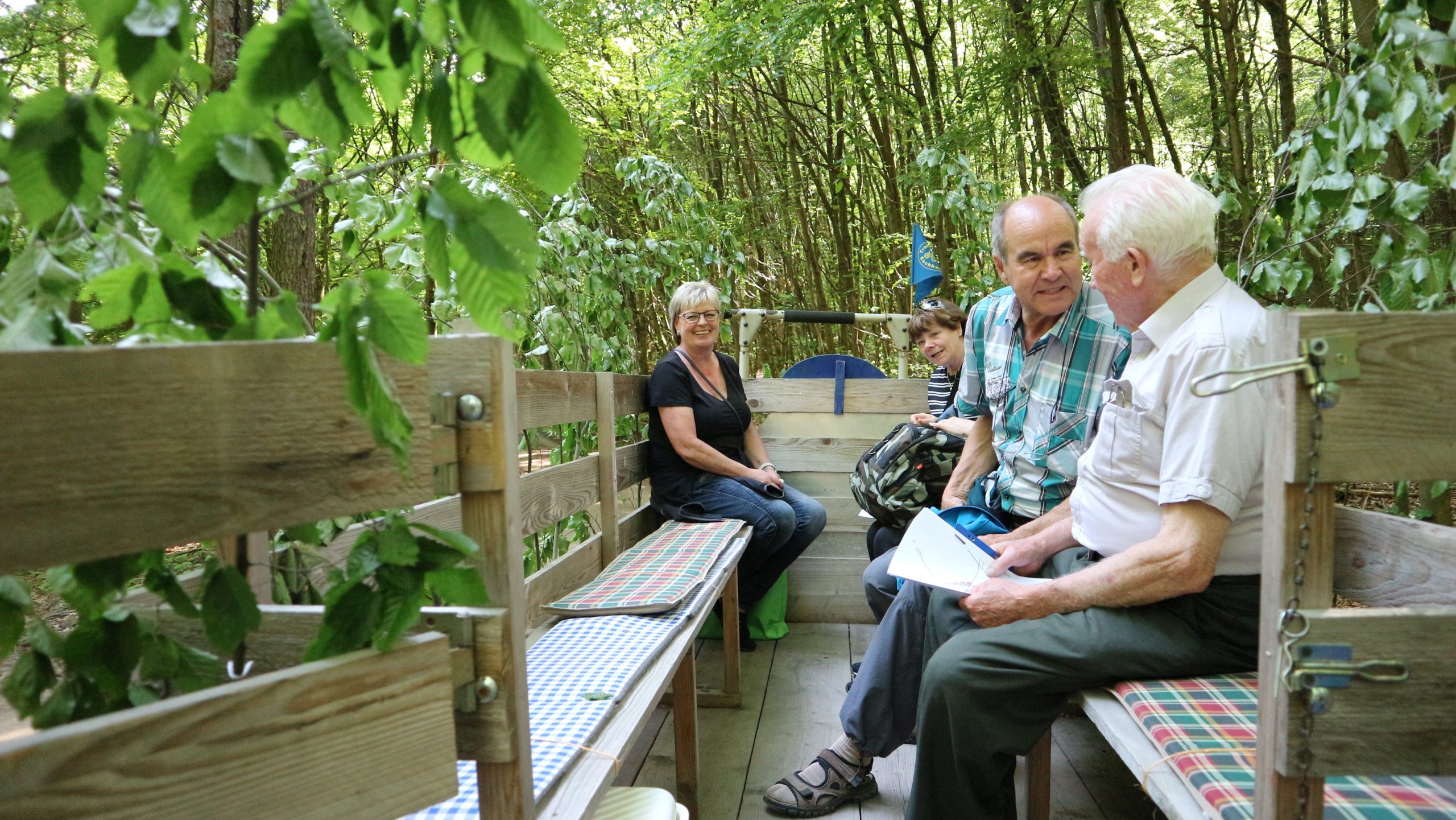 Harald Bender und Volker Schmidt von den Traktorfreunde Eschbach standen mit zwei historische Traktoren, einem Planwagen und einem mit Laub geschmückten Anhänger bereit, für die Fahrt zu den Eschbacher Silberlöchern. Bei herrlichstem Sommerwetter führte die Fahrt durch den Wald, zunächst Richtung Grävenwiesbach, dann über die Hohe Schneid, die „Schmidtsheck“, sowie den höchsten Punkt der Gemarkung (500 m), zur Wellerstraße, einem wichtigen mittelalterlichen Handelsweg. Er führte von der Wetterau über Braunfels nach Leun und weiter in den Westerwald. Endpunkt war die Gemarkung „Griebelsheck“,