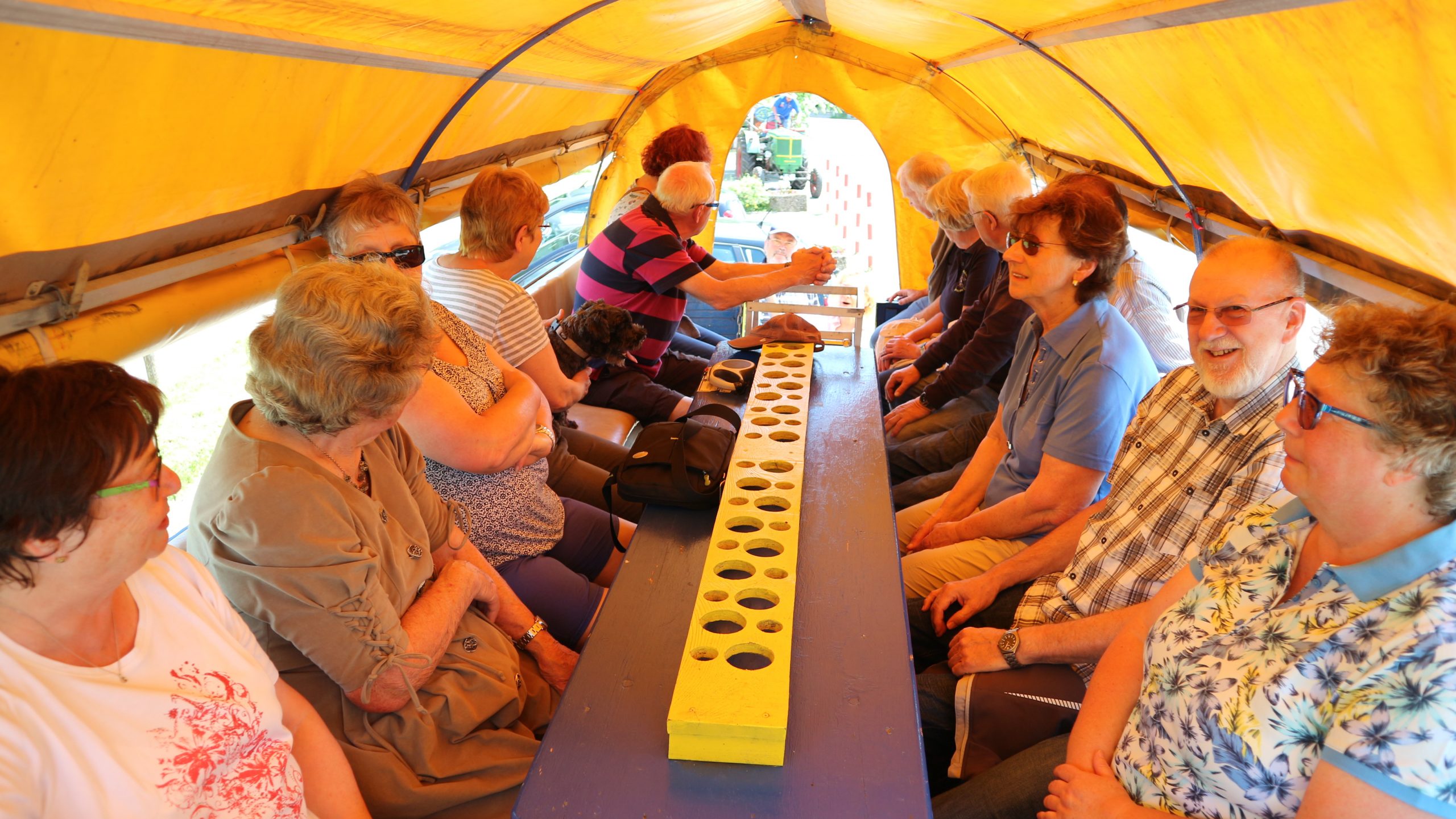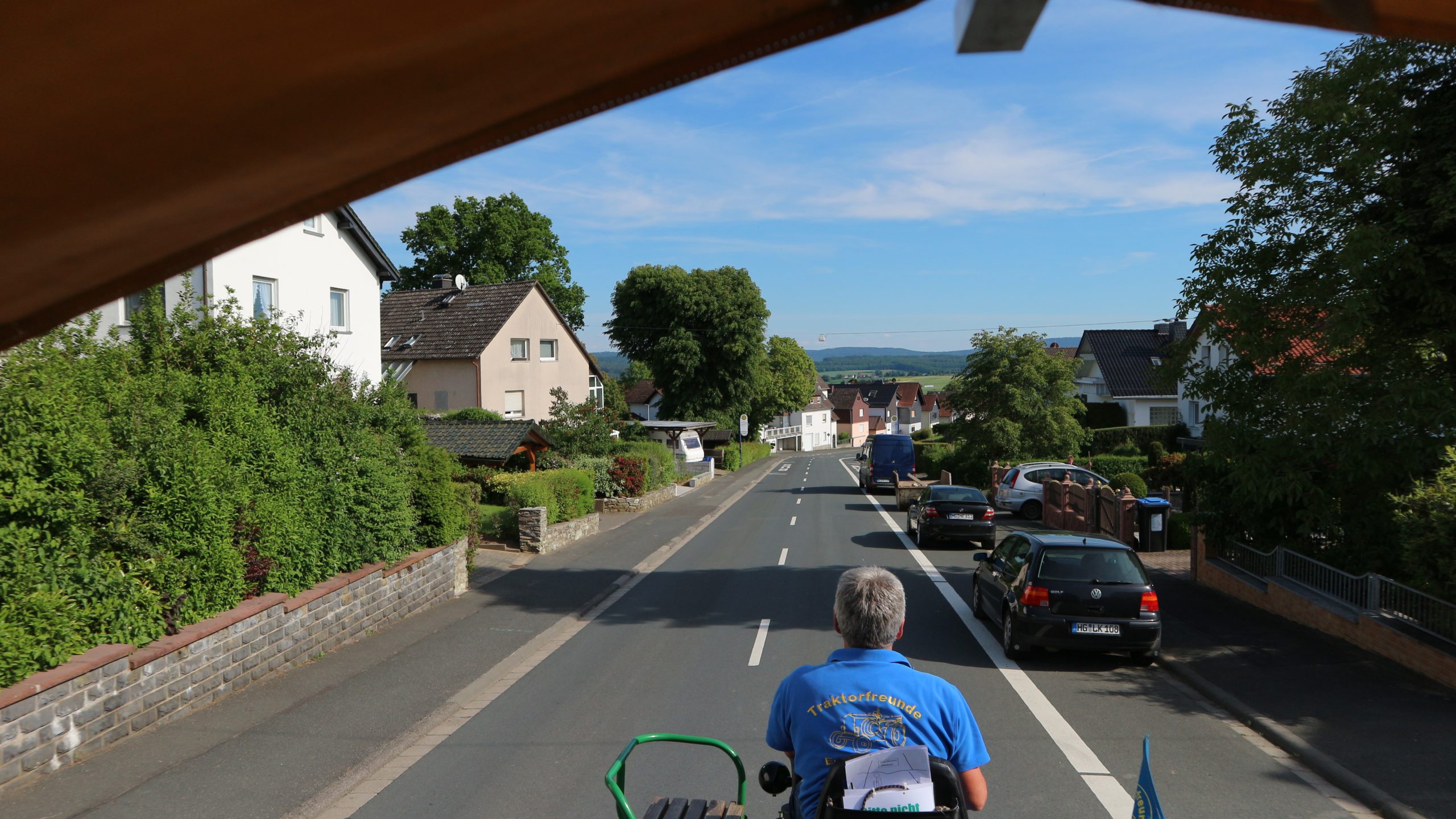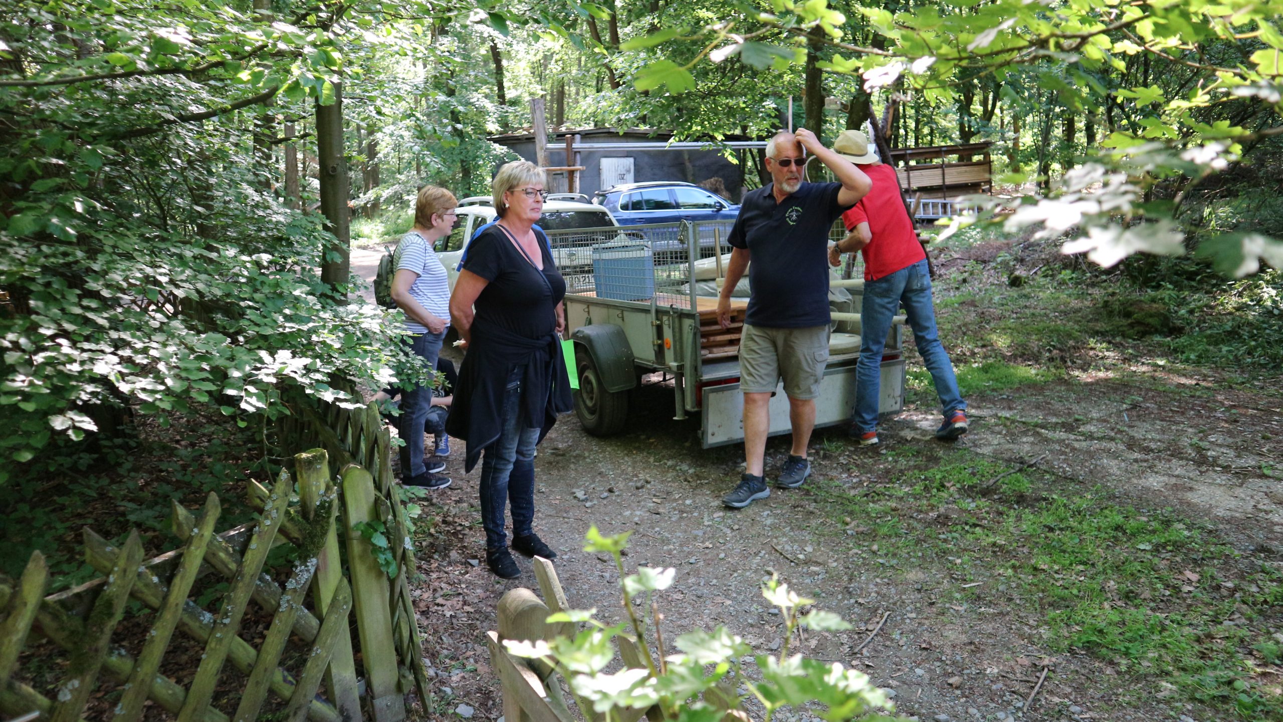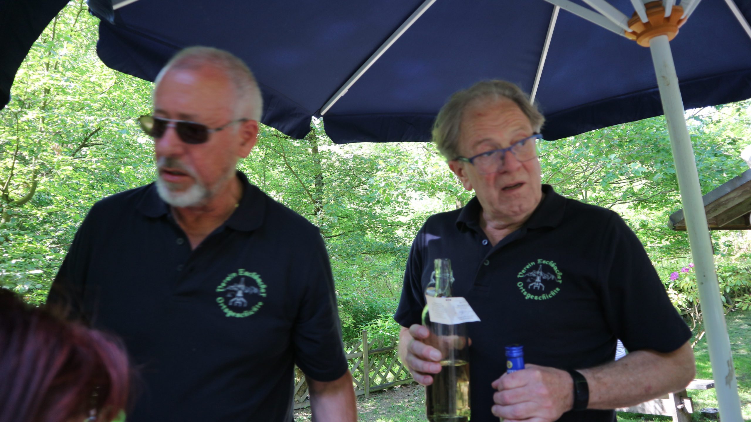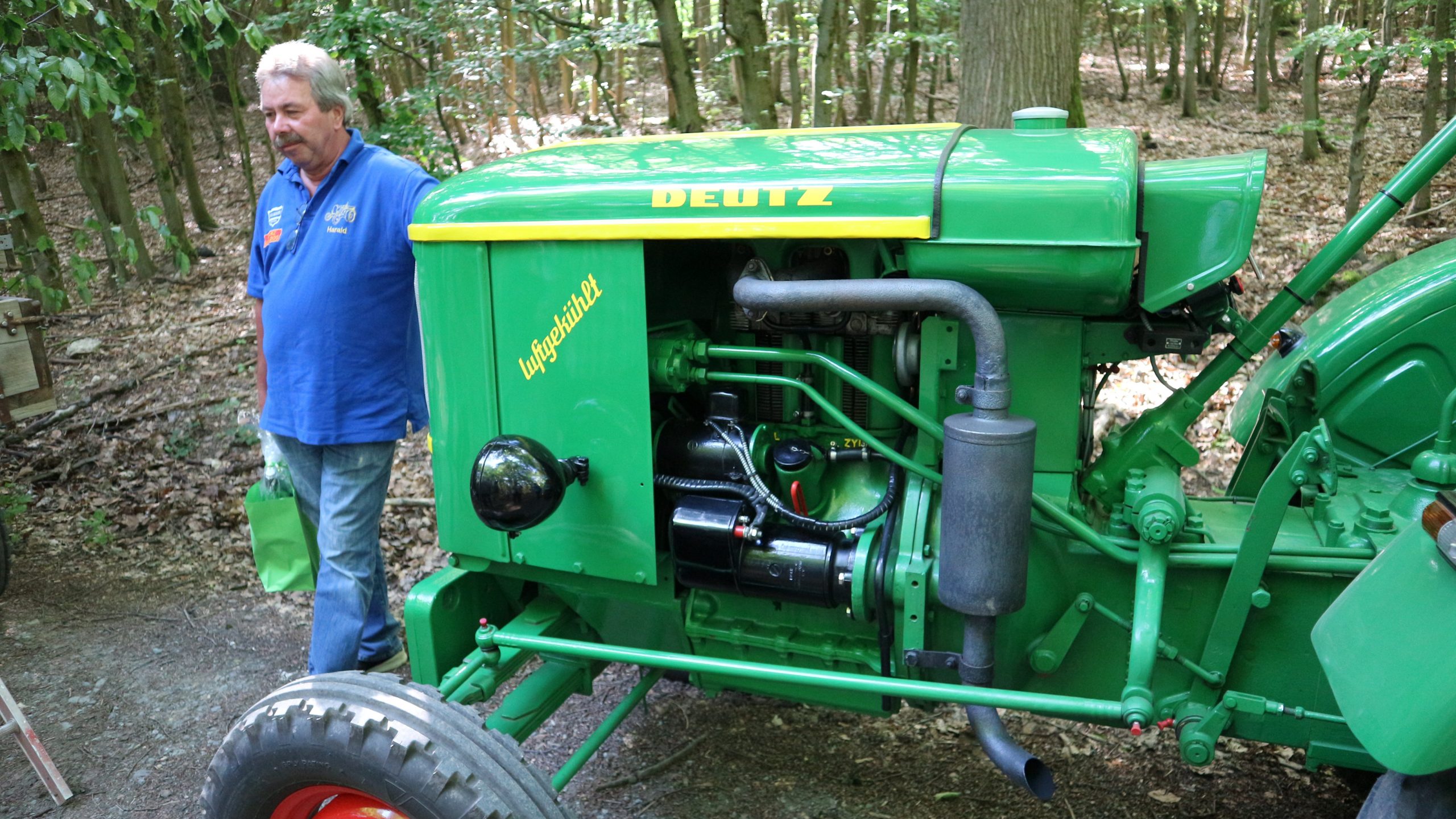 Harald Bender und Volker Schmidt von den Traktorfreunde Eschbach standen mit zwei historische Traktoren, einem Planwagen und einem mit Laub geschmückten Anhänger bereit, für die Fahrt zu den Eschbacher Silberlöchern. Bei herrlichstem Sommerwetter führte die Fahrt durch den Wald, zunächst Richtung Grävenwiesbach, dann über die Hohe Schneid, die „Schmidtsheck“, sowie den höchsten Punkt der Gemarkung (500 m), zur Wellerstraße, einem wichtigen mittelalterlichen Handelsweg. Er führte von der Wetterau über Braunfels nach Leun und weiter in den Westerwald. Endpunkt war die Gemarkung „Griebelsheck“,