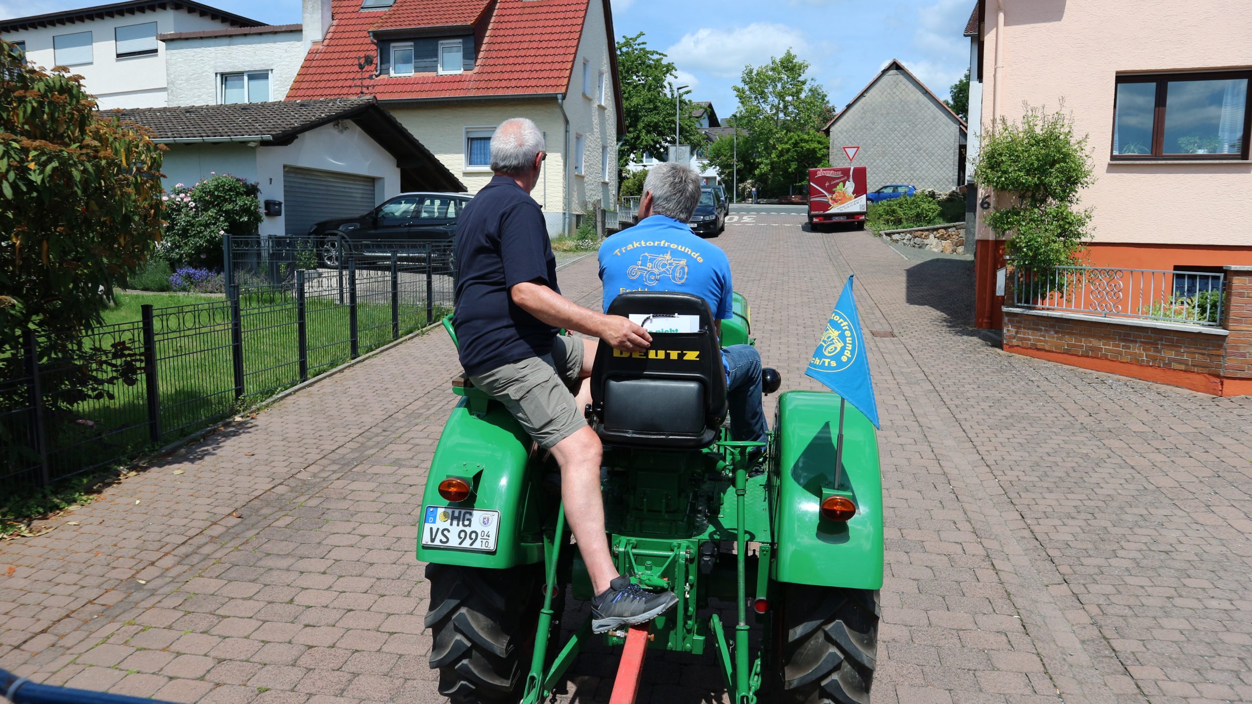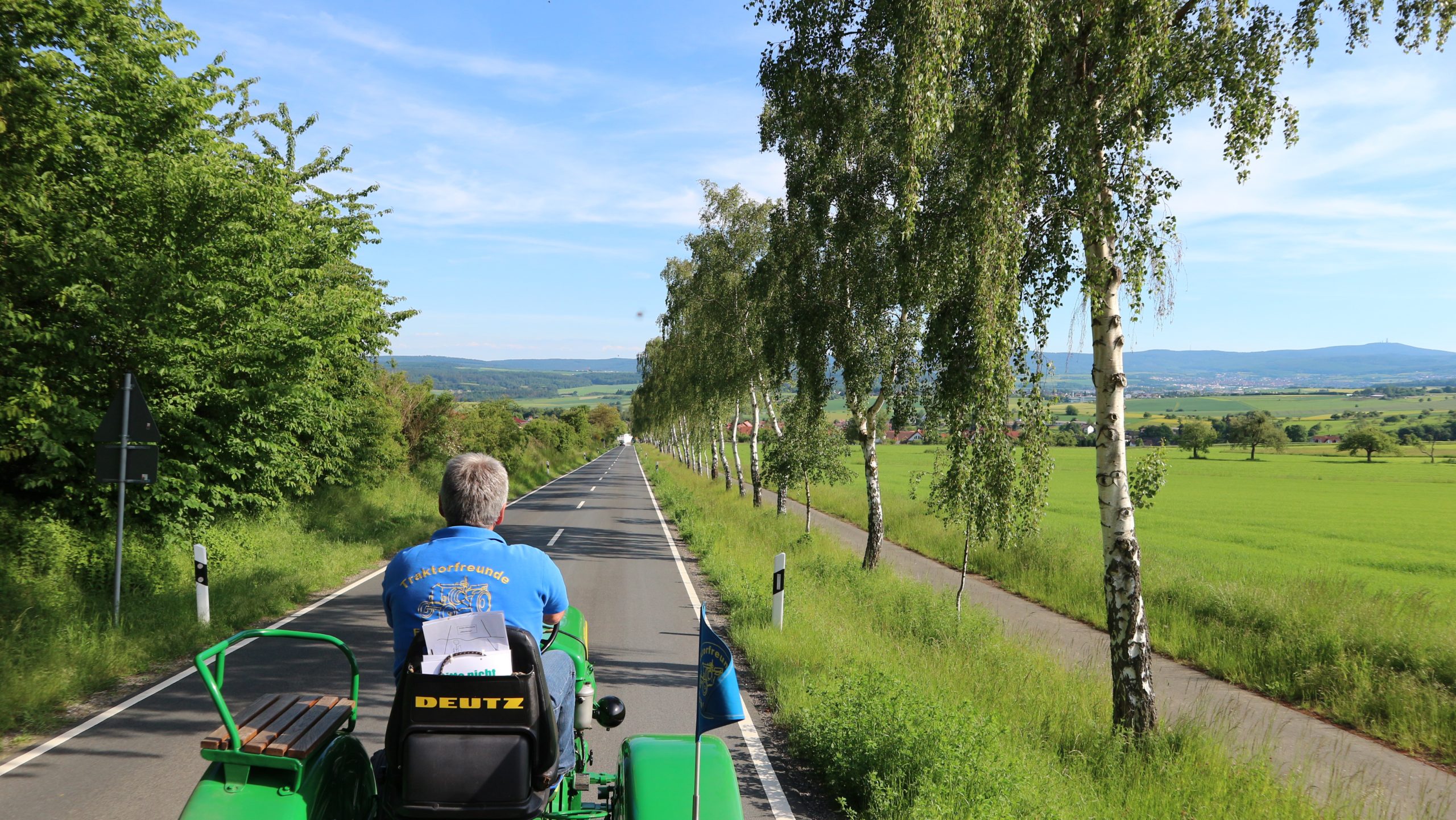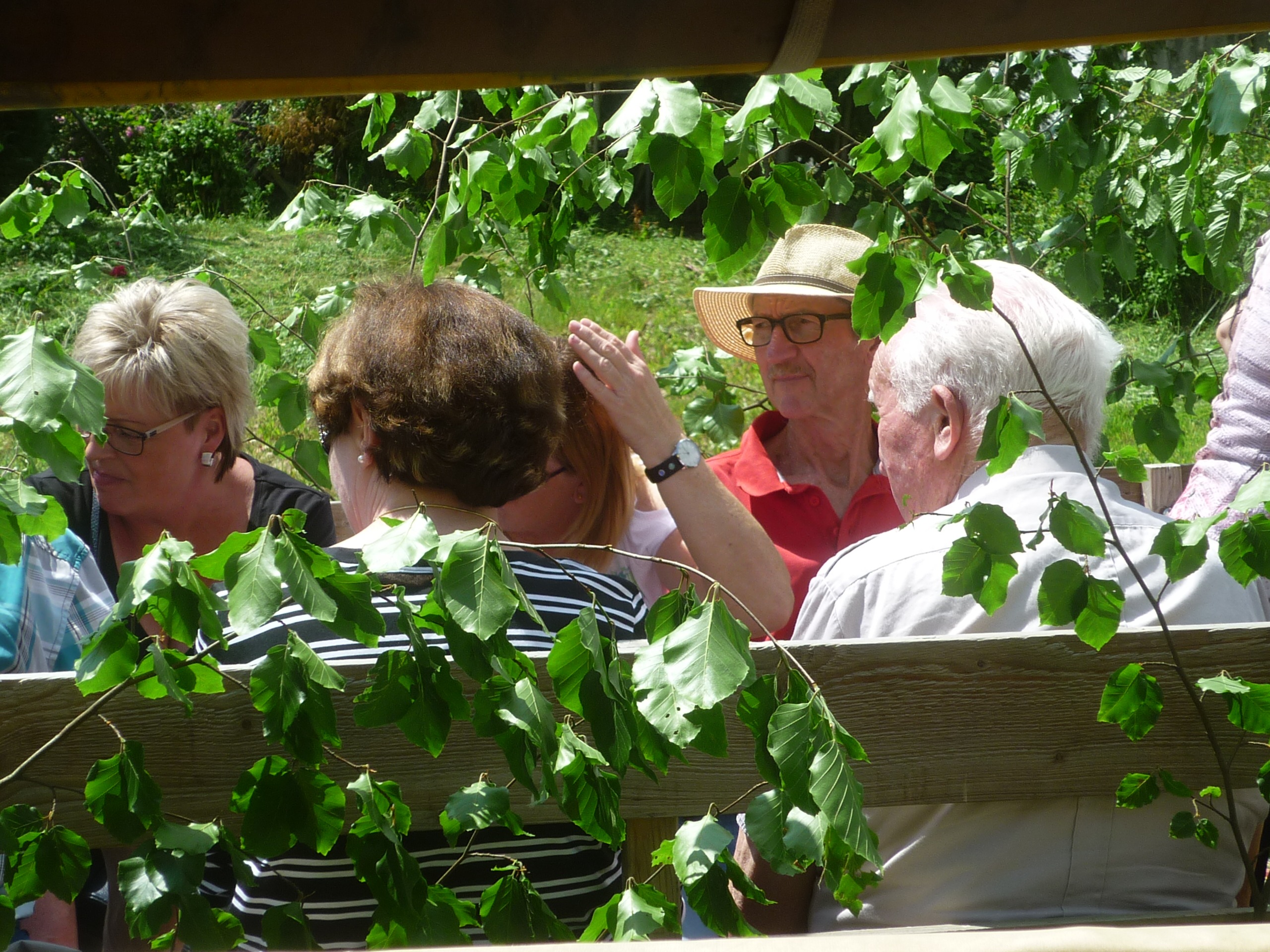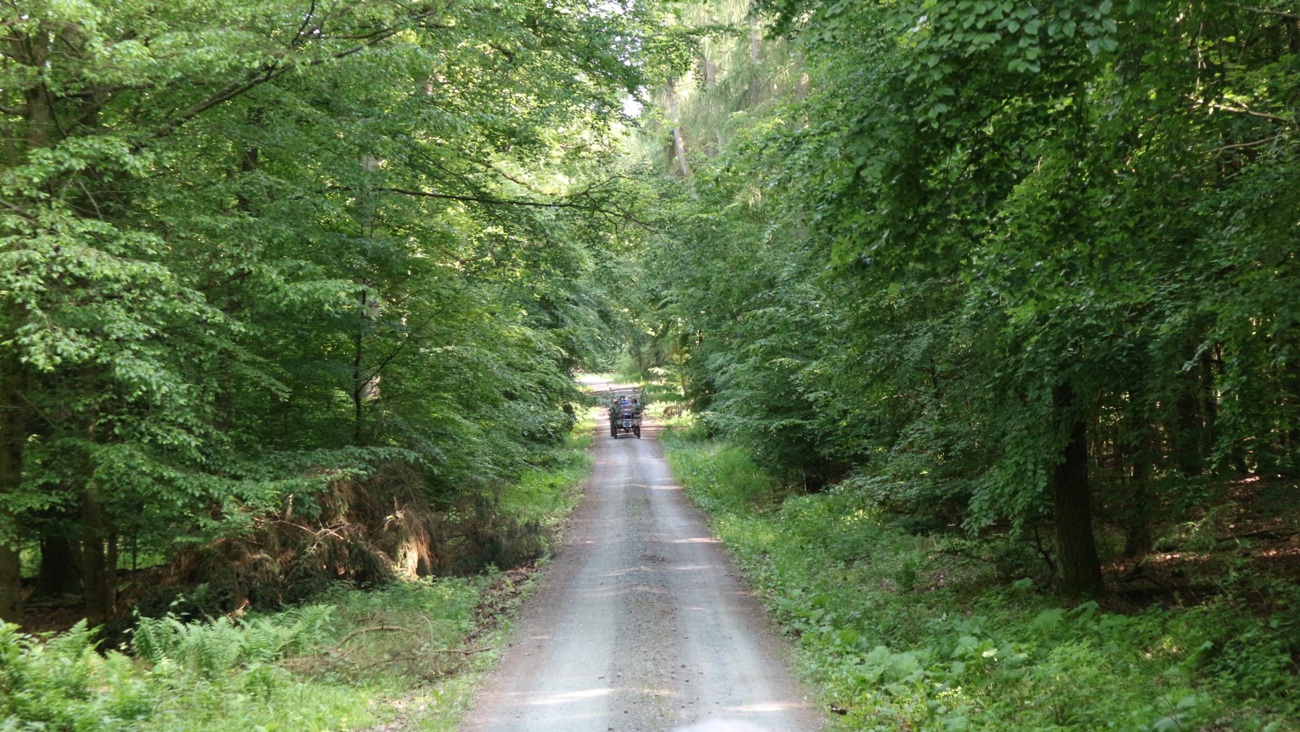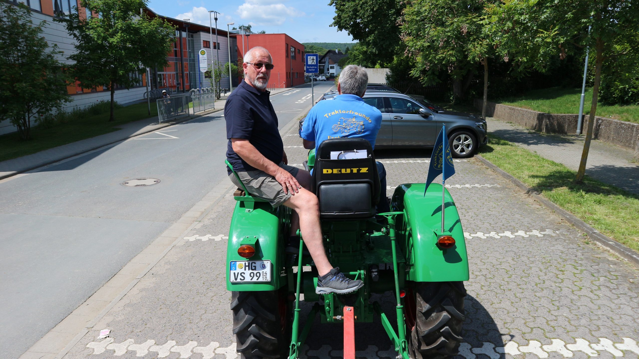 Harald Bender und Volker Schmidt von den Traktorfreunde Eschbach standen mit zwei historische Traktoren, einem Planwagen und einem mit Laub geschmückten Anhänger bereit, für die Fahrt zu den Eschbacher Silberlöchern. Bei herrlichstem Sommerwetter führte die Fahrt durch den Wald, zunächst Richtung Grävenwiesbach, dann über die Hohe Schneid, die „Schmidtsheck“, sowie den höchsten Punkt der Gemarkung (500 m), zur Wellerstraße, einem wichtigen mittelalterlichen Handelsweg. Er führte von der Wetterau über Braunfels nach Leun und weiter in den Westerwald. Endpunkt war die Gemarkung „Griebelsheck“,