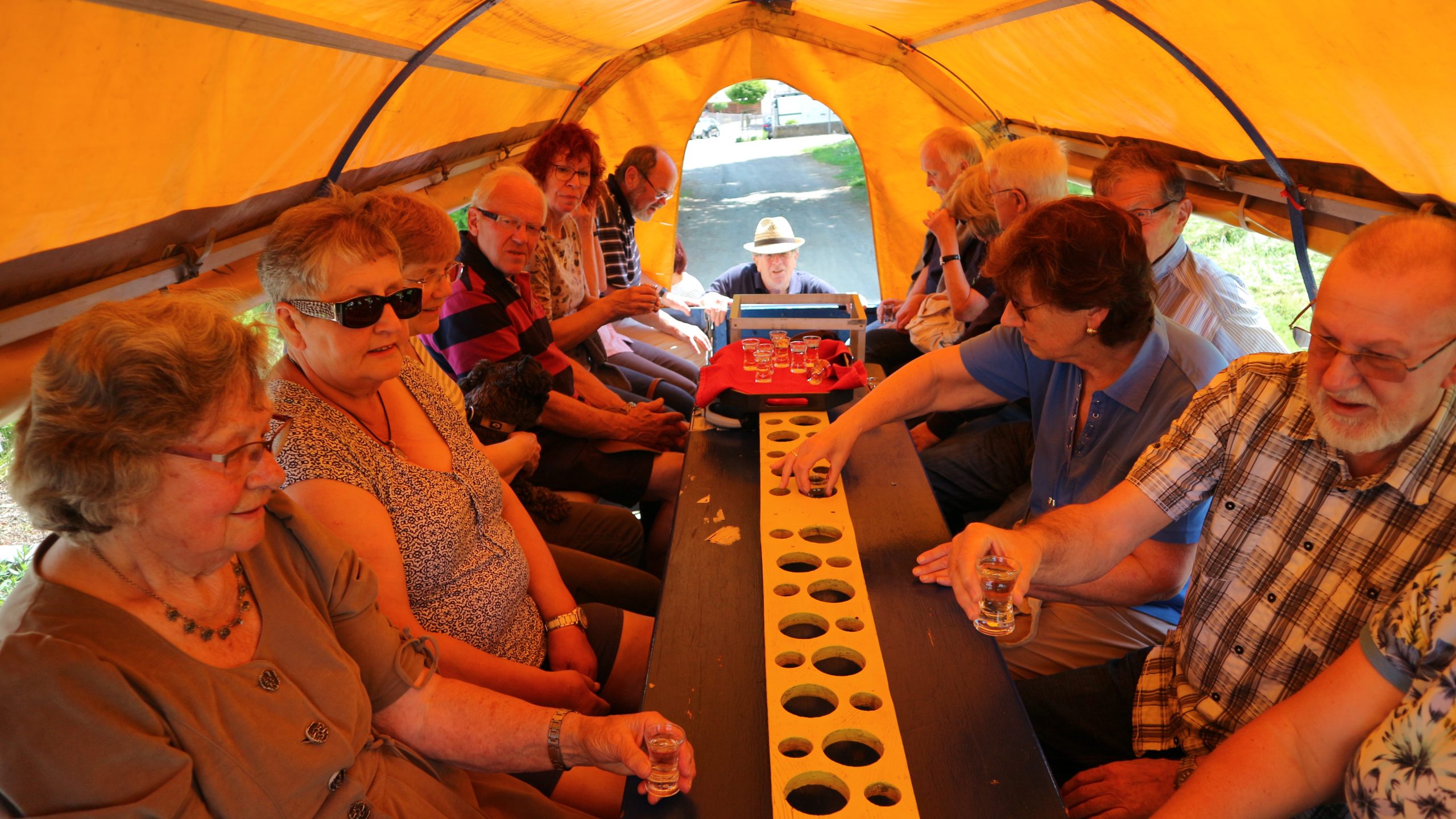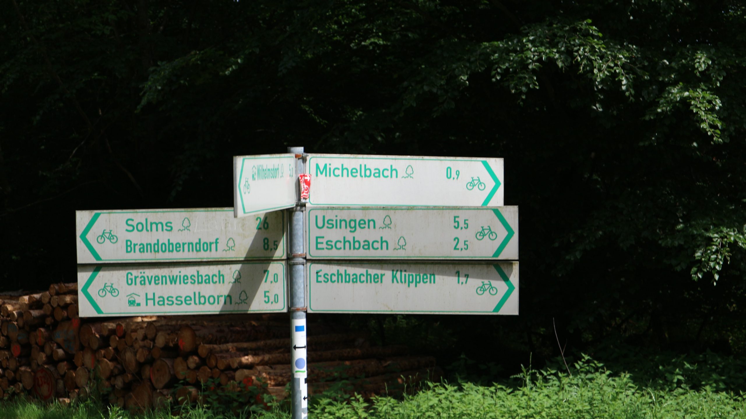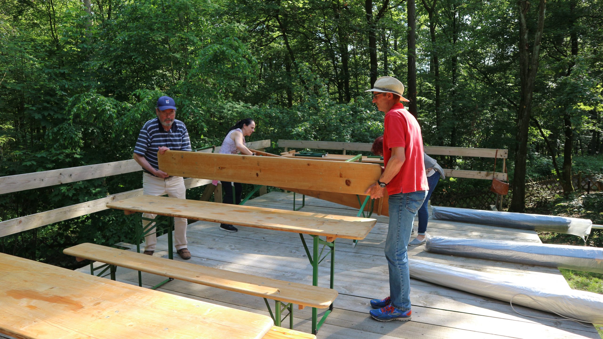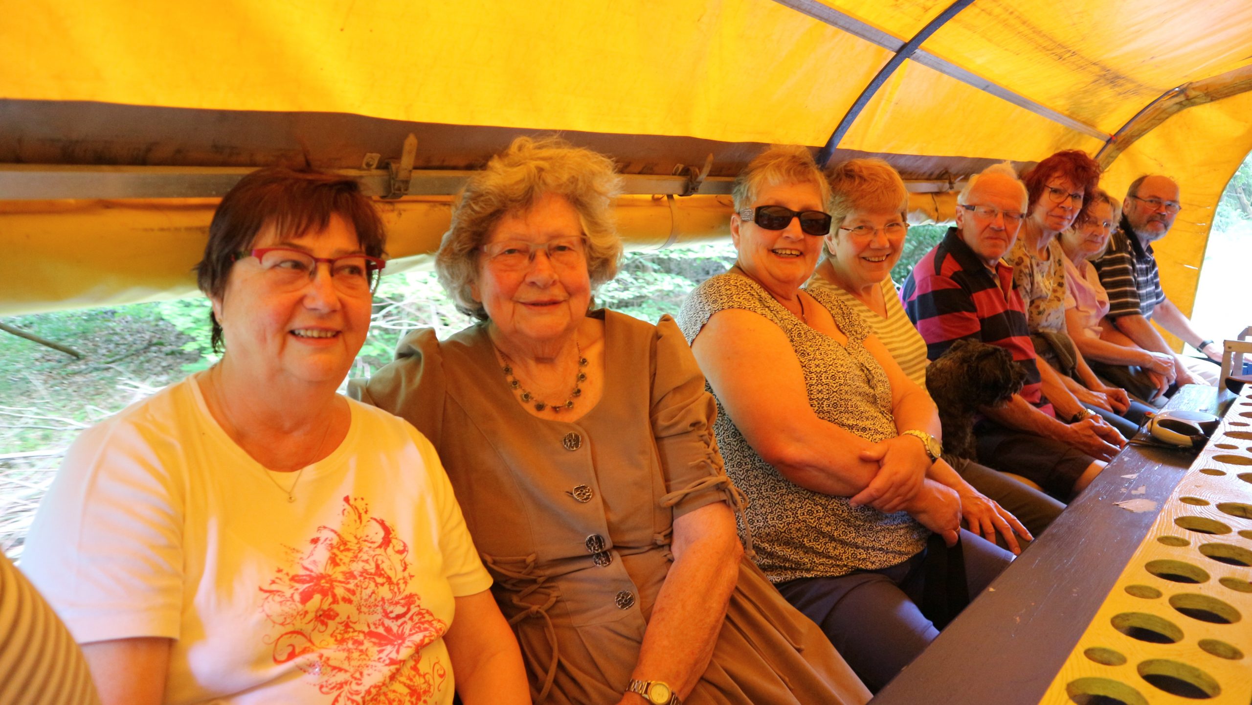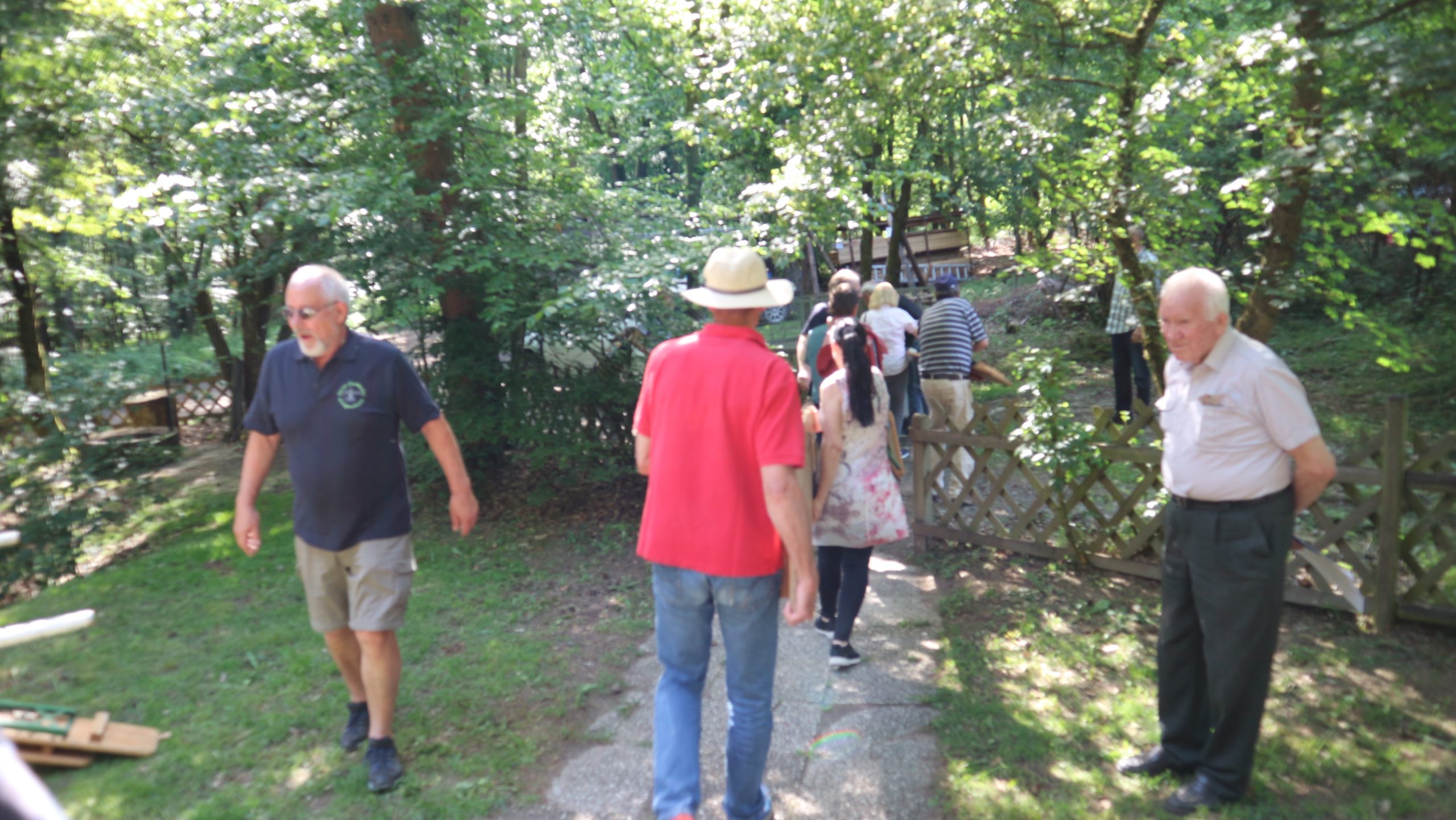 Harald Bender und Volker Schmidt von den Traktorfreunde Eschbach standen mit zwei historische Traktoren, einem Planwagen und einem mit Laub geschmückten Anhänger bereit, für die Fahrt zu den Eschbacher Silberlöchern. Bei herrlichstem Sommerwetter führte die Fahrt durch den Wald, zunächst Richtung Grävenwiesbach, dann über die Hohe Schneid, die „Schmidtsheck“, sowie den höchsten Punkt der Gemarkung (500 m), zur Wellerstraße, einem wichtigen mittelalterlichen Handelsweg. Er führte von der Wetterau über Braunfels nach Leun und weiter in den Westerwald. Endpunkt war die Gemarkung „Griebelsheck“,
