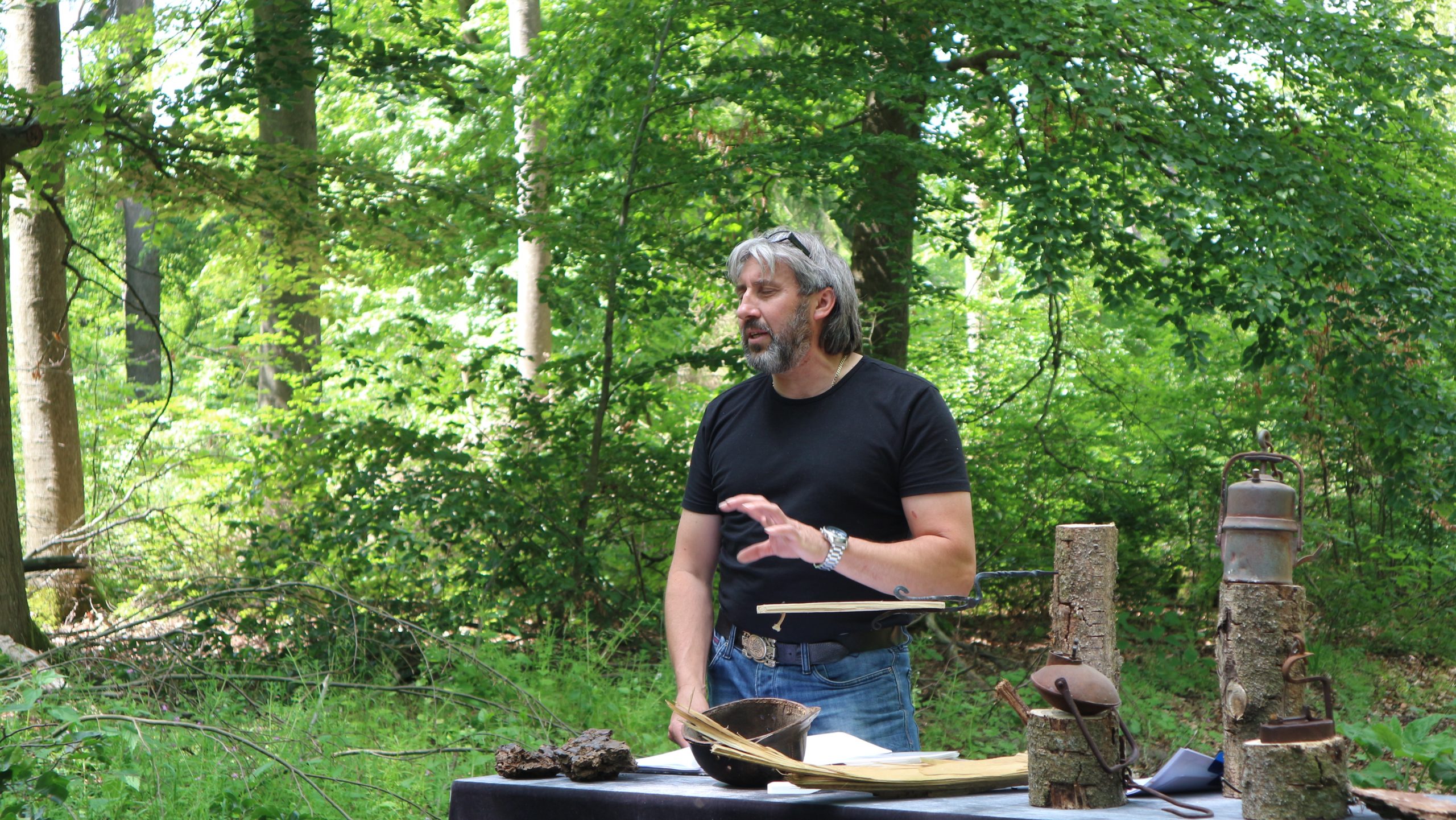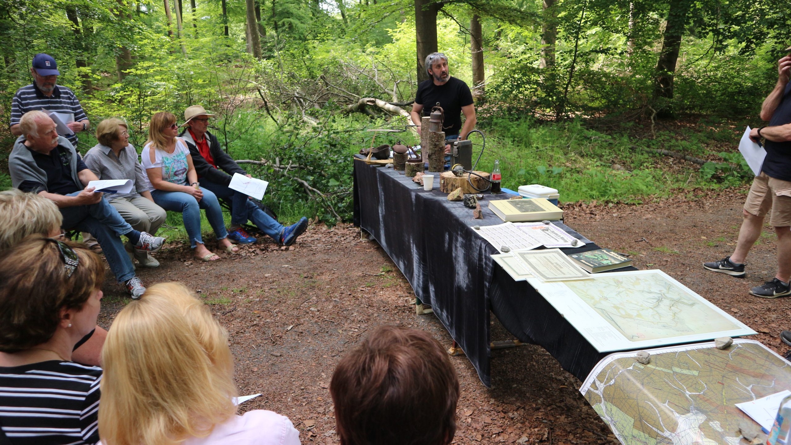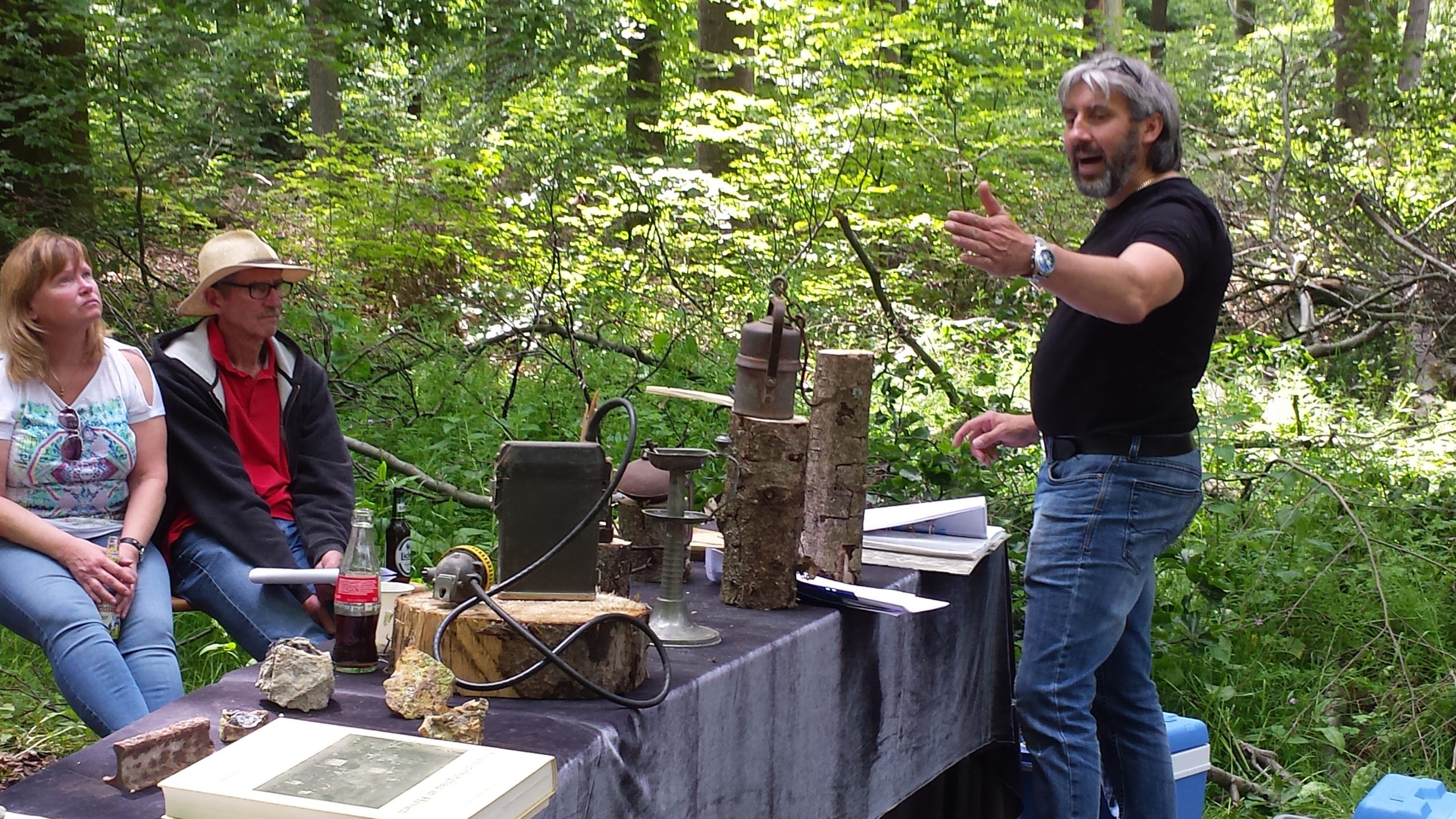An einer kleinen Waldecke stiegen wir ab. Wir waren in der Nähe der Silberlöcher angekommen. Heute ist nicht mehr viel von den sogenannten Silberlöchern in unwegsamem Gelände zu sehen, was das Betreten gefährlich macht. Guido Raith hatte Tische aufgebaut, hier hatte er alte Grubenlampe, alte Karten, Fachbücher, Gesteine und sogar ein eisernes Stück Schienen von einer Lorenbahn ausgebreitet. Er berichtete, dass die erste Verpachtung der „Silberkaute“ am 3. Juli 1713 stattfand. In diesem Gelände wurden die „Bingen“ (Gruben) geschlagen. Es gab Haspelschächte mit Quergängen; Fichtenholz sicherte die Grubenwände.