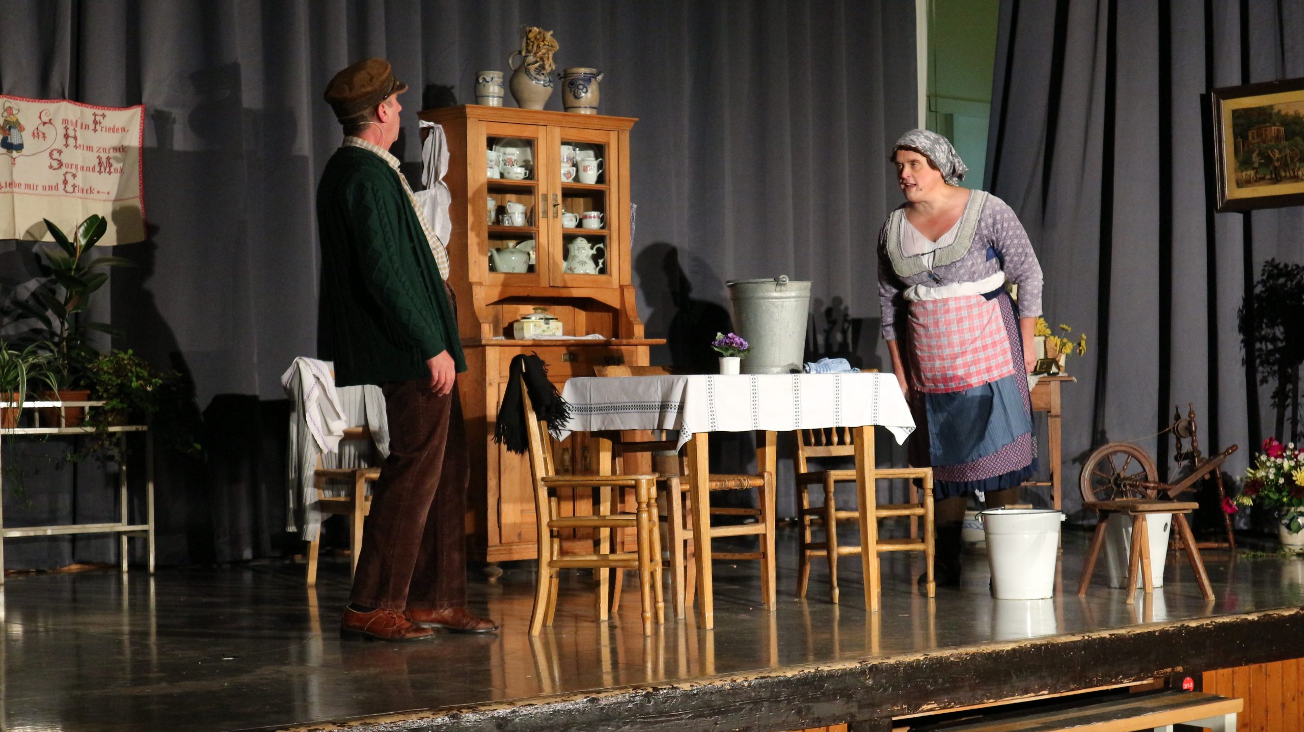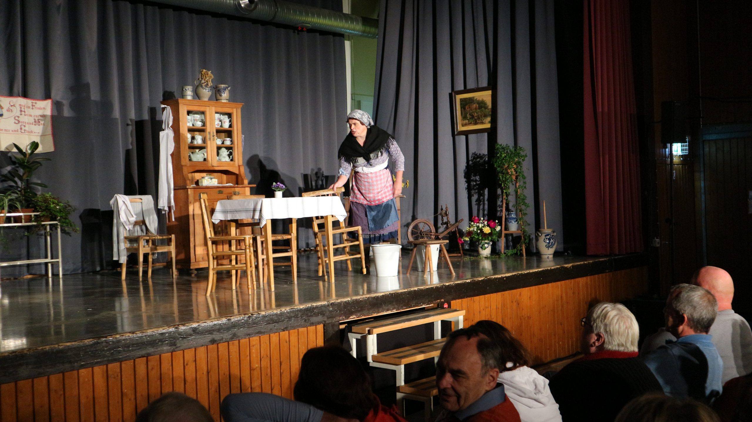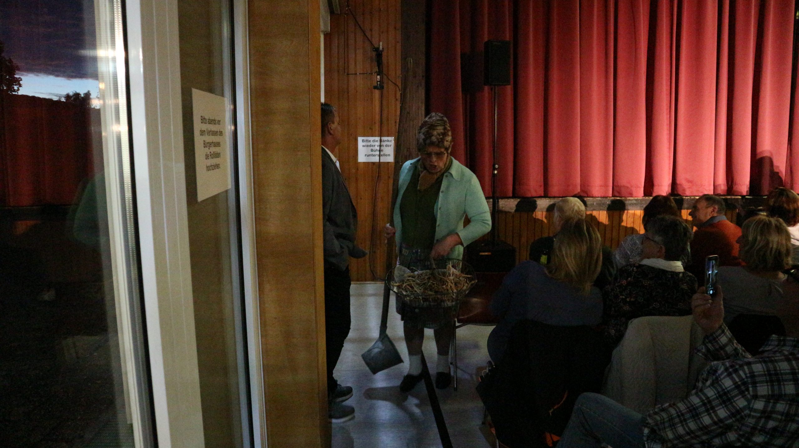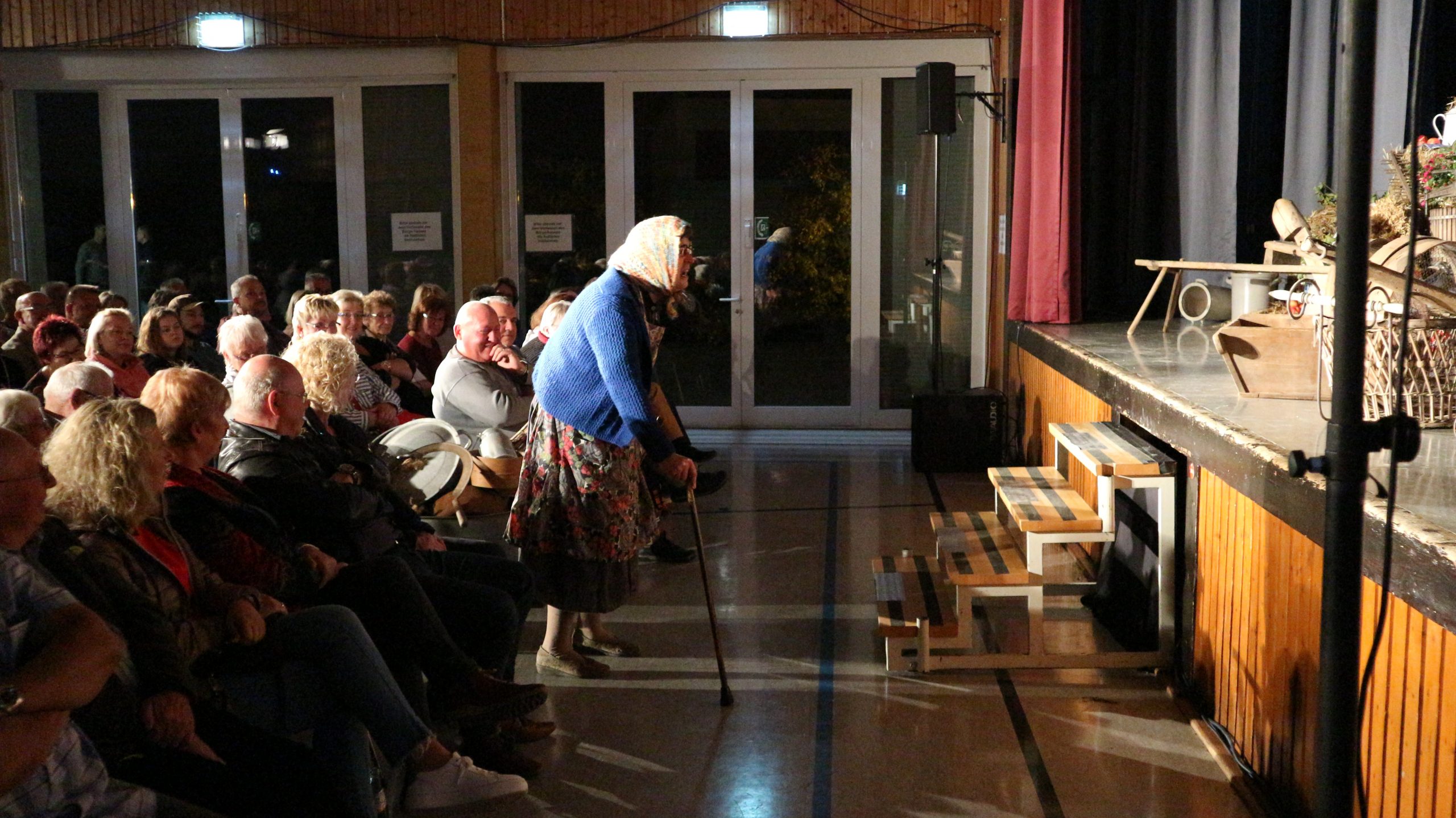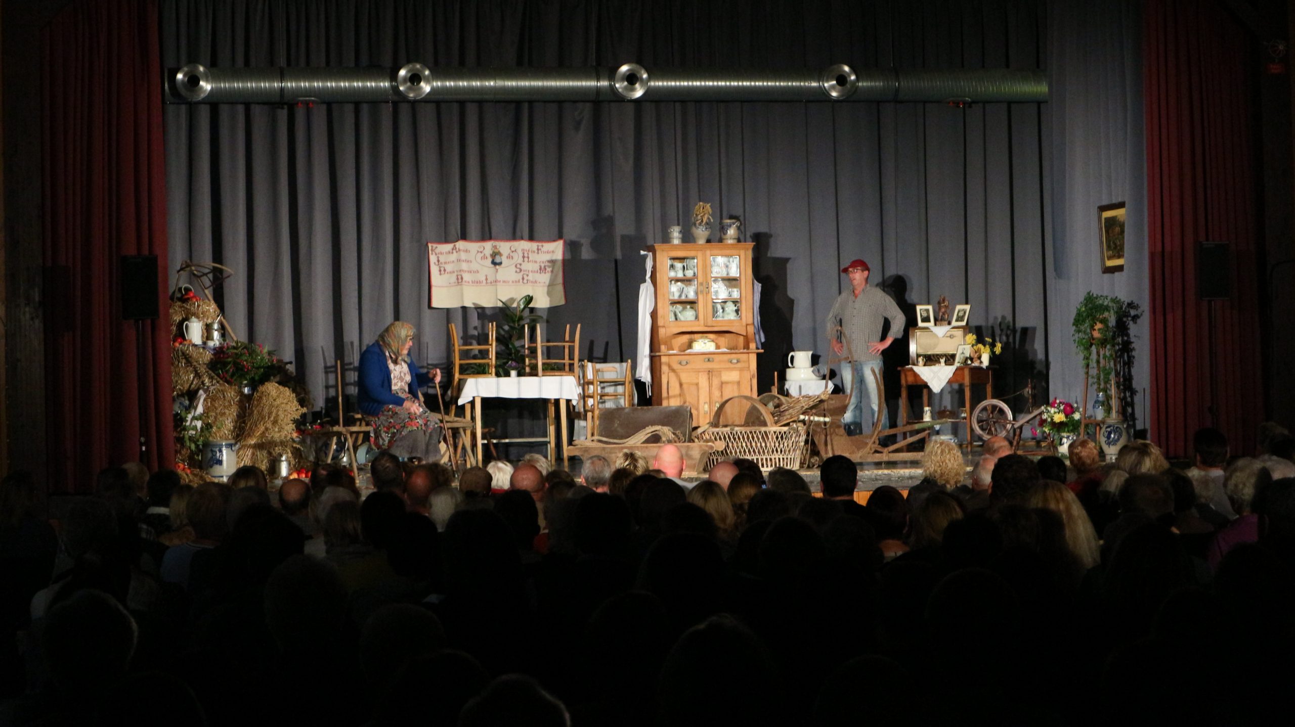 Dann ging es auf die Bühne, die liebevoll in eine Bauernstube verwandelt worden war. Viele Accessoires wie ein Röhrenradio, ein Tisch mit Stühlen und gestickte Tücher mit Sinnsprüchen darauf, passten sehr gut zum Gespräch auf der Bühne. Hier zeigte sich, dass eine Magd durchaus das Potential hat, ihren Brötchengeber aufzumischen. Dass der nur aus Wernborn eingeheiratet habe, war natürlich ein Detail ganz nach dem Geschmack der Eschbacher. Warum es keinen Hahn (Gickel) mehr gibt, was es mit den häufigen Besuchen des Tierarztes auf dem Gehöft auf sich hat und warum der Bauer anscheinend einen eingeschränkten Horizont hat, wurde sehr zum Amüsement der Gäste aufgedröselt.
