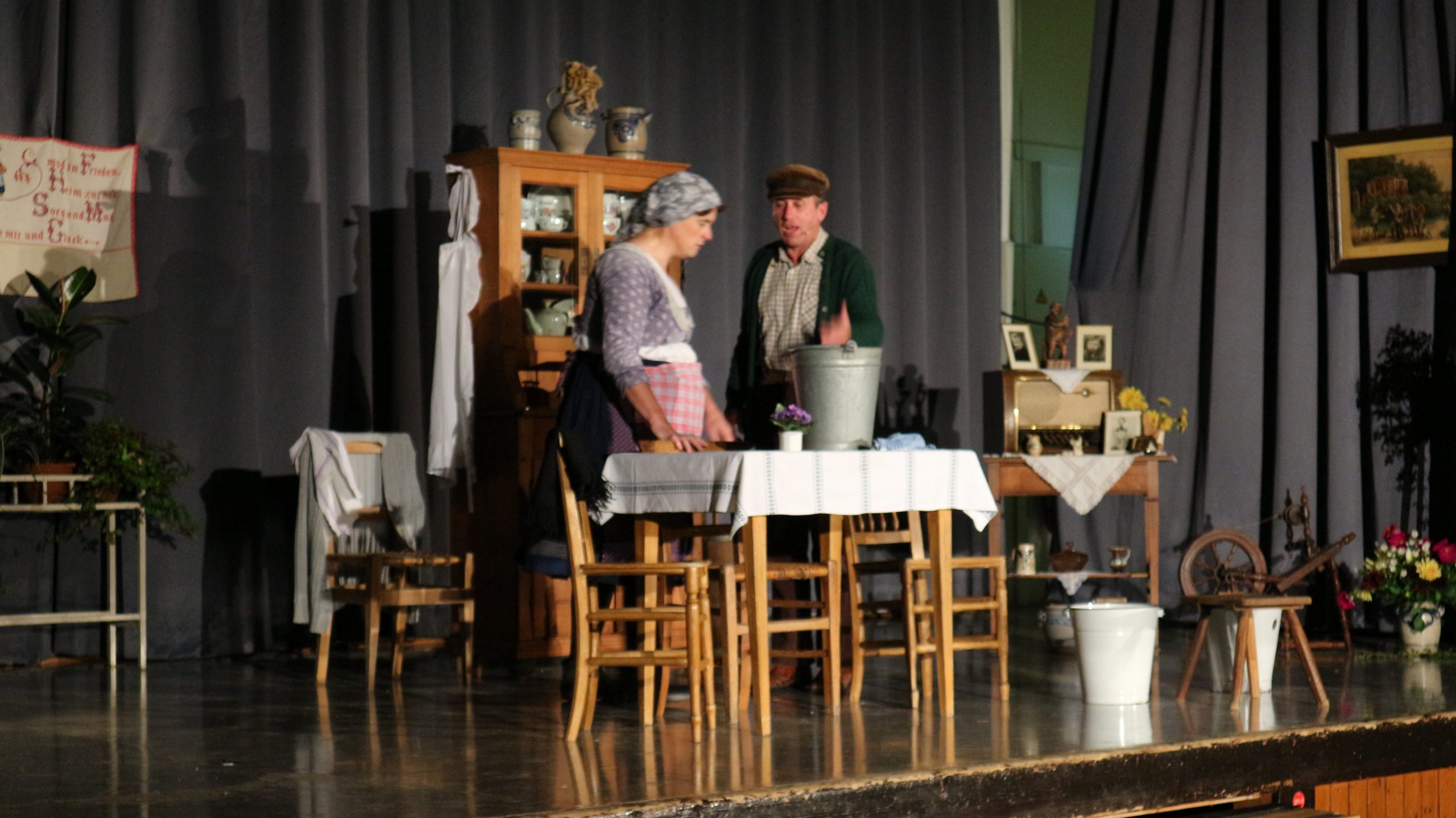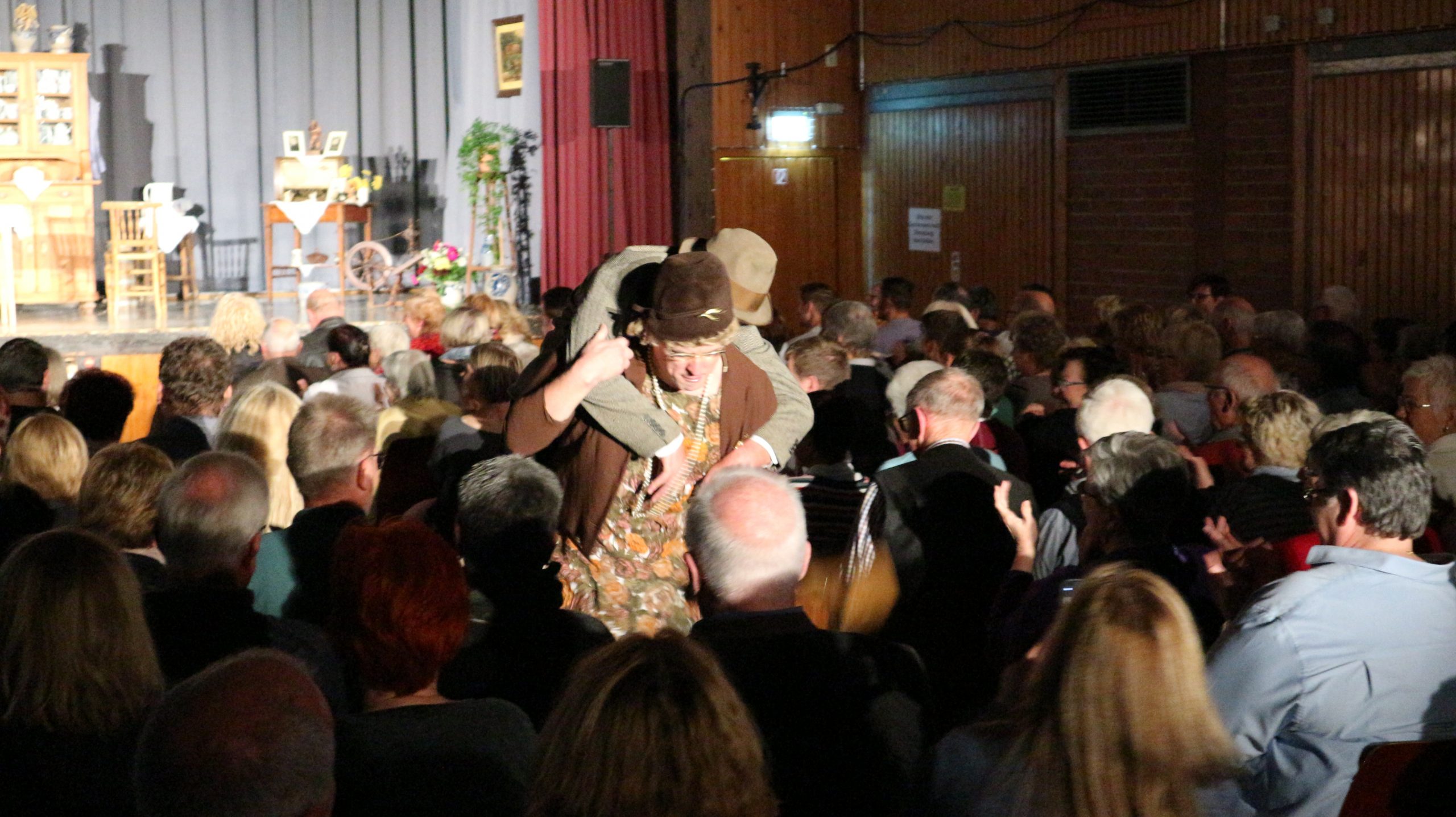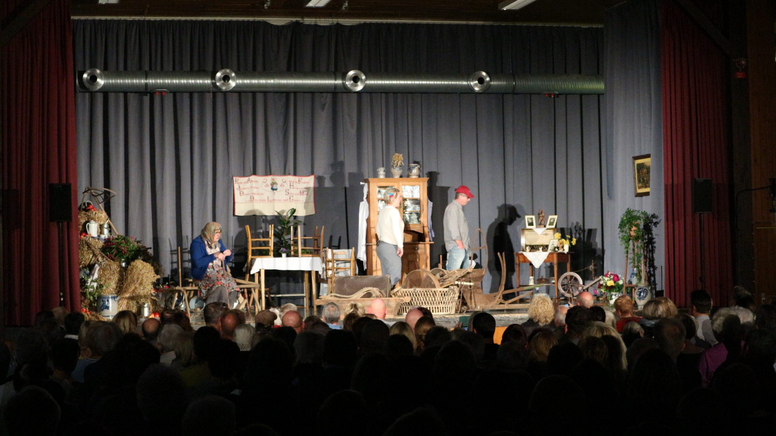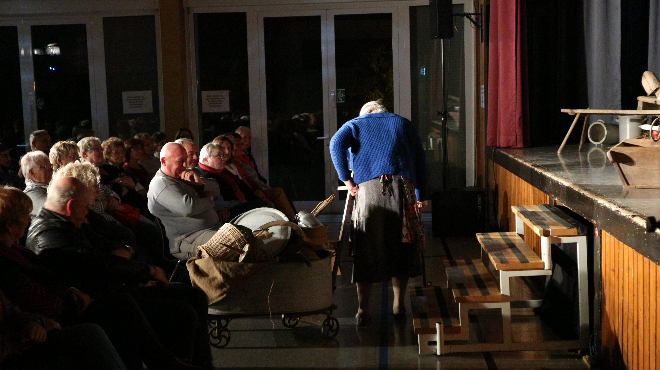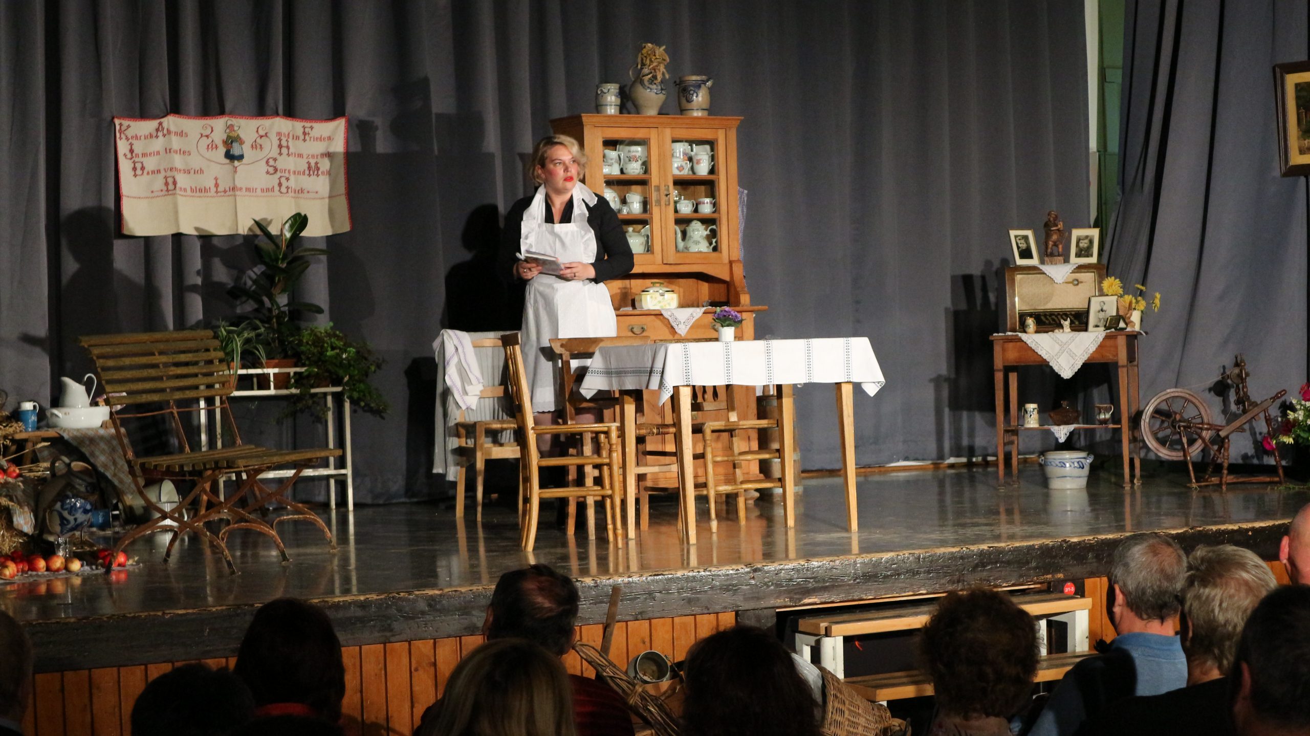 Dann ging es auf die Bühne, die liebevoll in eine Bauernstube verwandelt worden war. Viele Accessoires wie ein Röhrenradio, ein Tisch mit Stühlen und gestickte Tücher mit Sinnsprüchen darauf, passten sehr gut zum Gespräch auf der Bühne. Hier zeigte sich, dass eine Magd durchaus das Potential hat, ihren Brötchengeber aufzumischen. Dass der nur aus Wernborn eingeheiratet habe, war natürlich ein Detail ganz nach dem Geschmack der Eschbacher. Warum es keinen Hahn (Gickel) mehr gibt, was es mit den häufigen Besuchen des Tierarztes auf dem Gehöft auf sich hat und warum der Bauer anscheinend einen eingeschränkten Horizont hat, wurde sehr zum Amüsement der Gäste aufgedröselt.