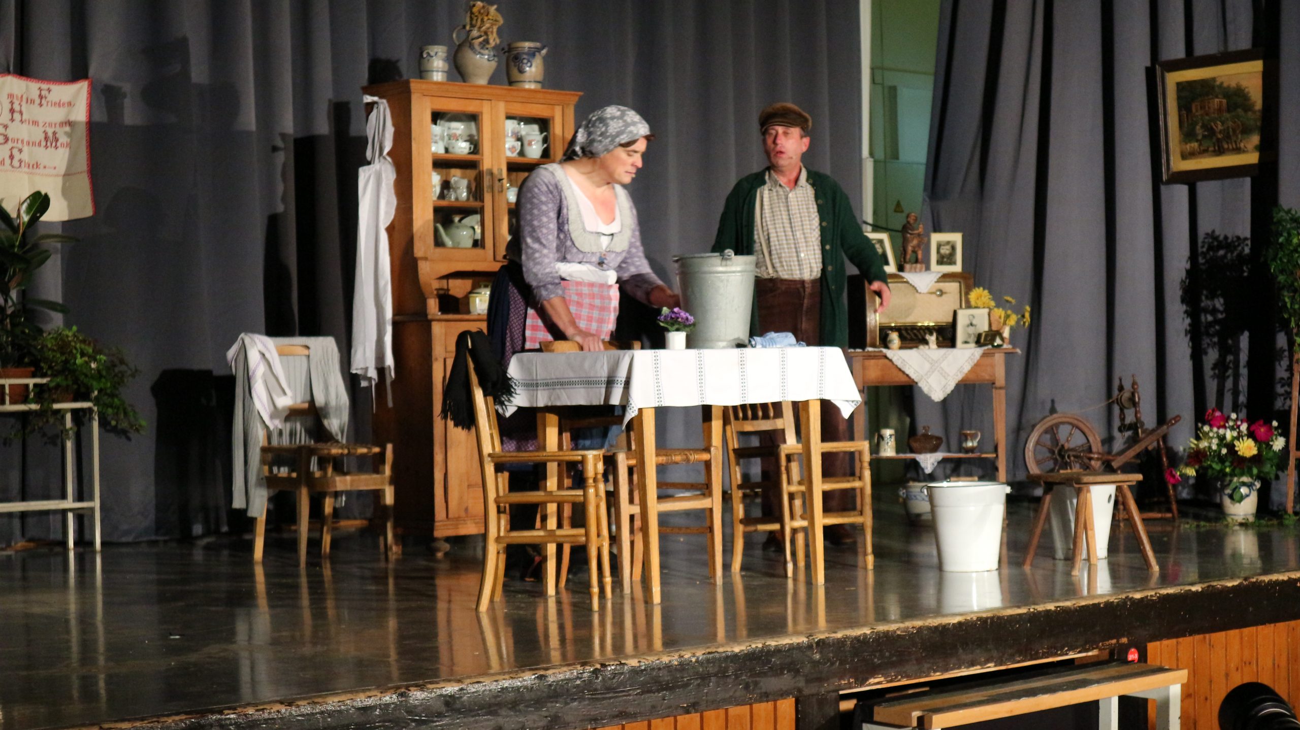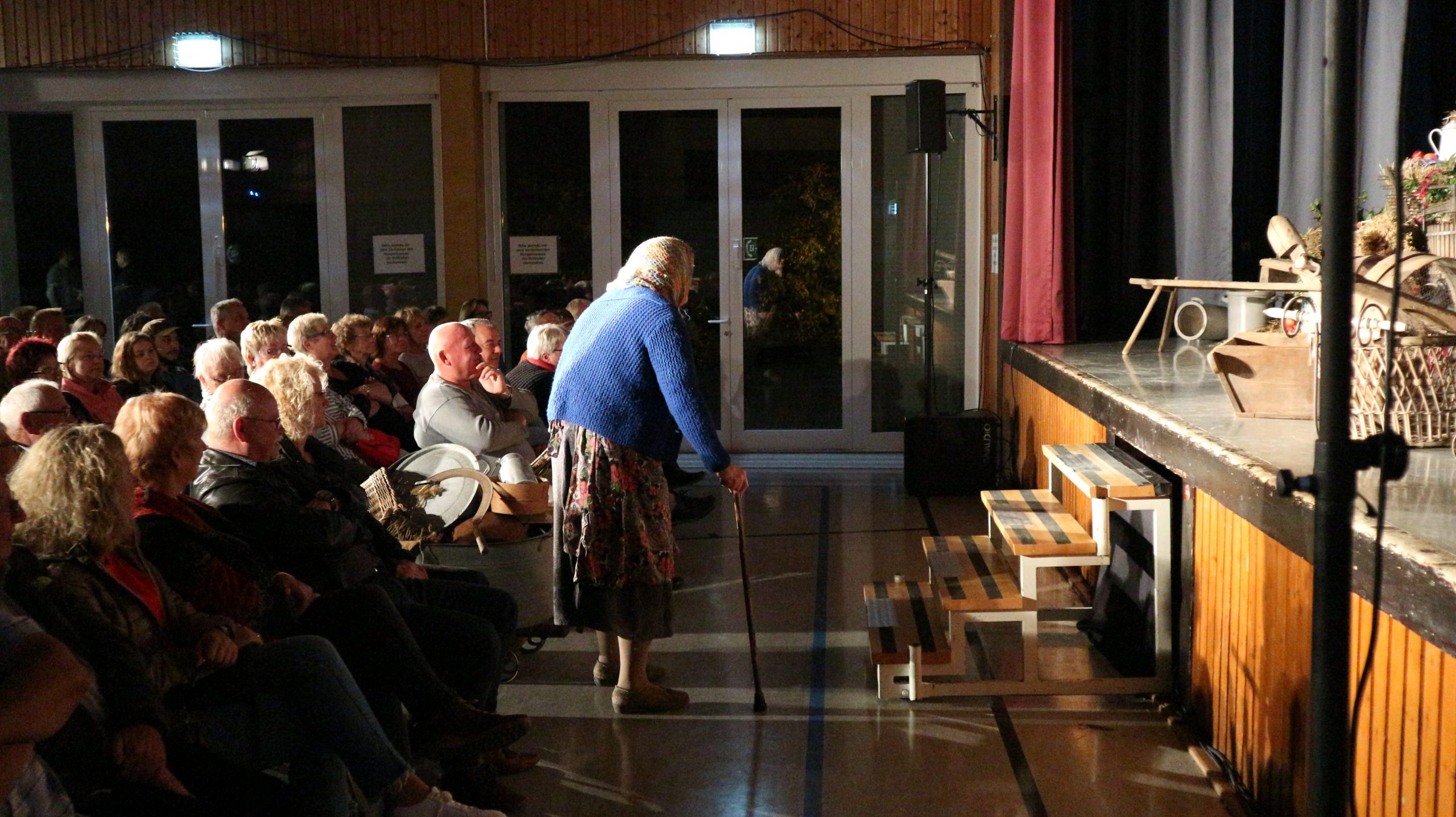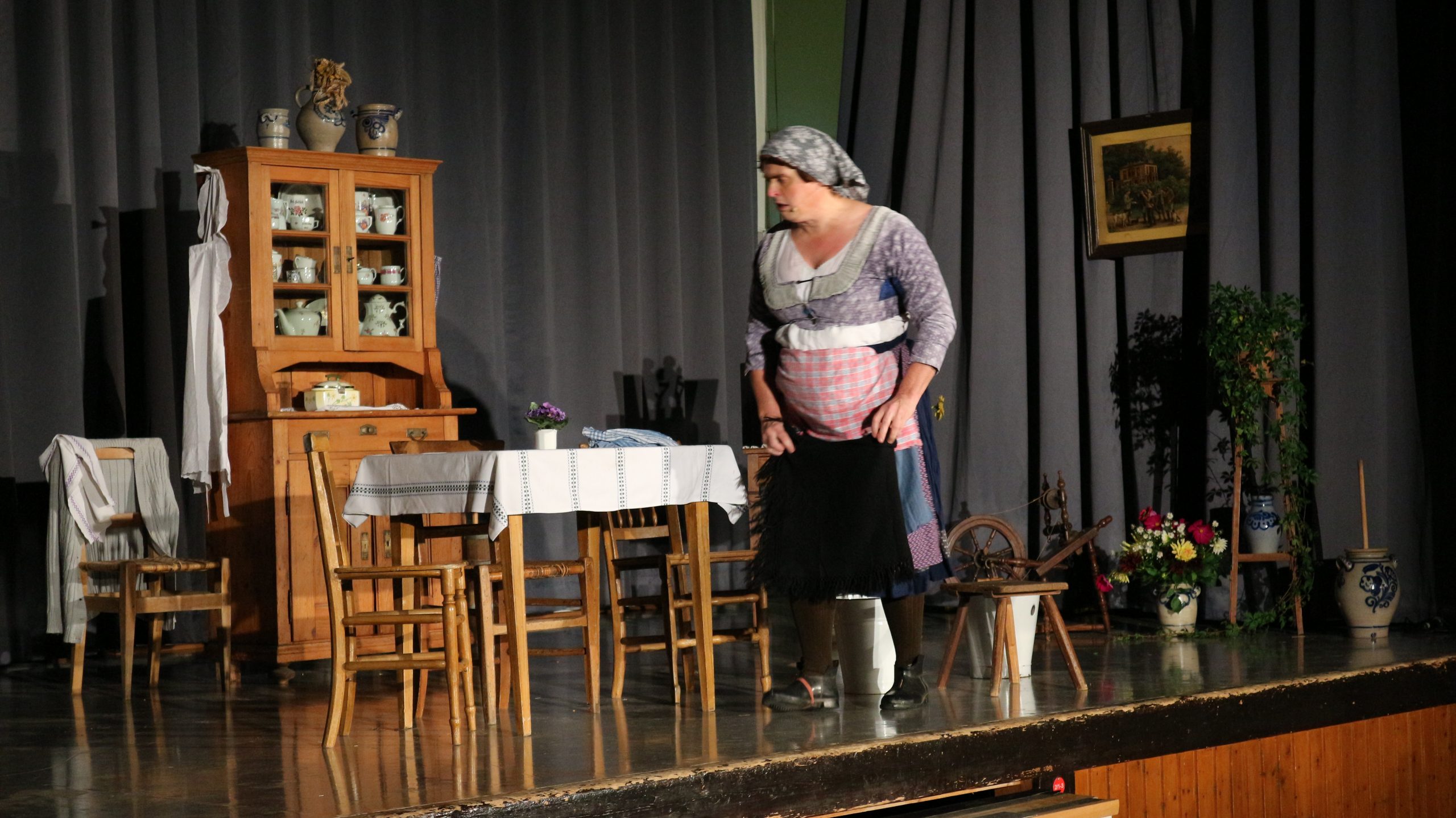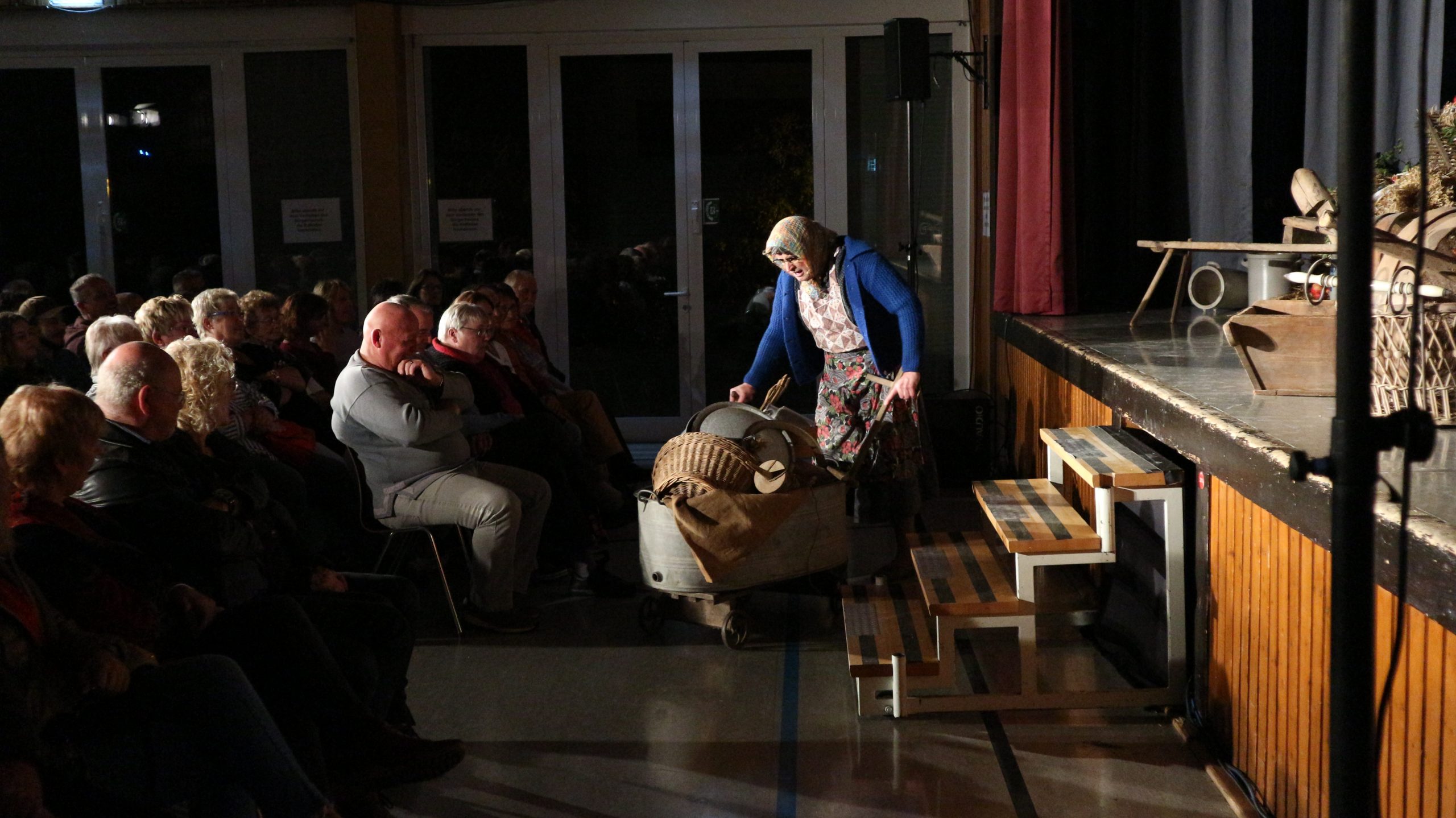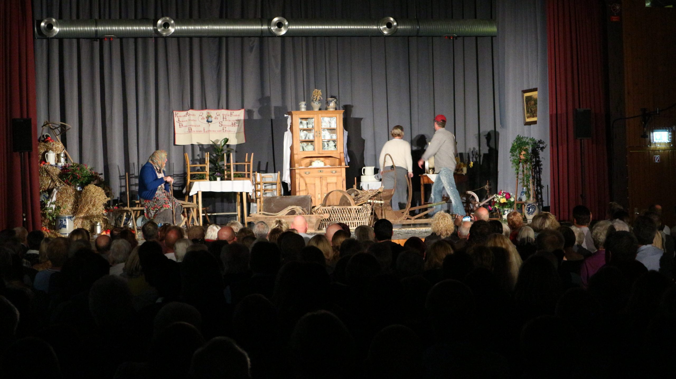 Dann ging es auf die Bühne, die liebevoll in eine Bauernstube verwandelt worden war. Viele Accessoires wie ein Röhrenradio, ein Tisch mit Stühlen und gestickte Tücher mit Sinnsprüchen darauf, passten sehr gut zum Gespräch auf der Bühne. Hier zeigte sich, dass eine Magd durchaus das Potential hat, ihren Brötchengeber aufzumischen. Dass der nur aus Wernborn eingeheiratet habe, war natürlich ein Detail ganz nach dem Geschmack der Eschbacher. Warum es keinen Hahn (Gickel) mehr gibt, was es mit den häufigen Besuchen des Tierarztes auf dem Gehöft auf sich hat und warum der Bauer anscheinend einen eingeschränkten Horizont hat, wurde sehr zum Amüsement der Gäste aufgedröselt.