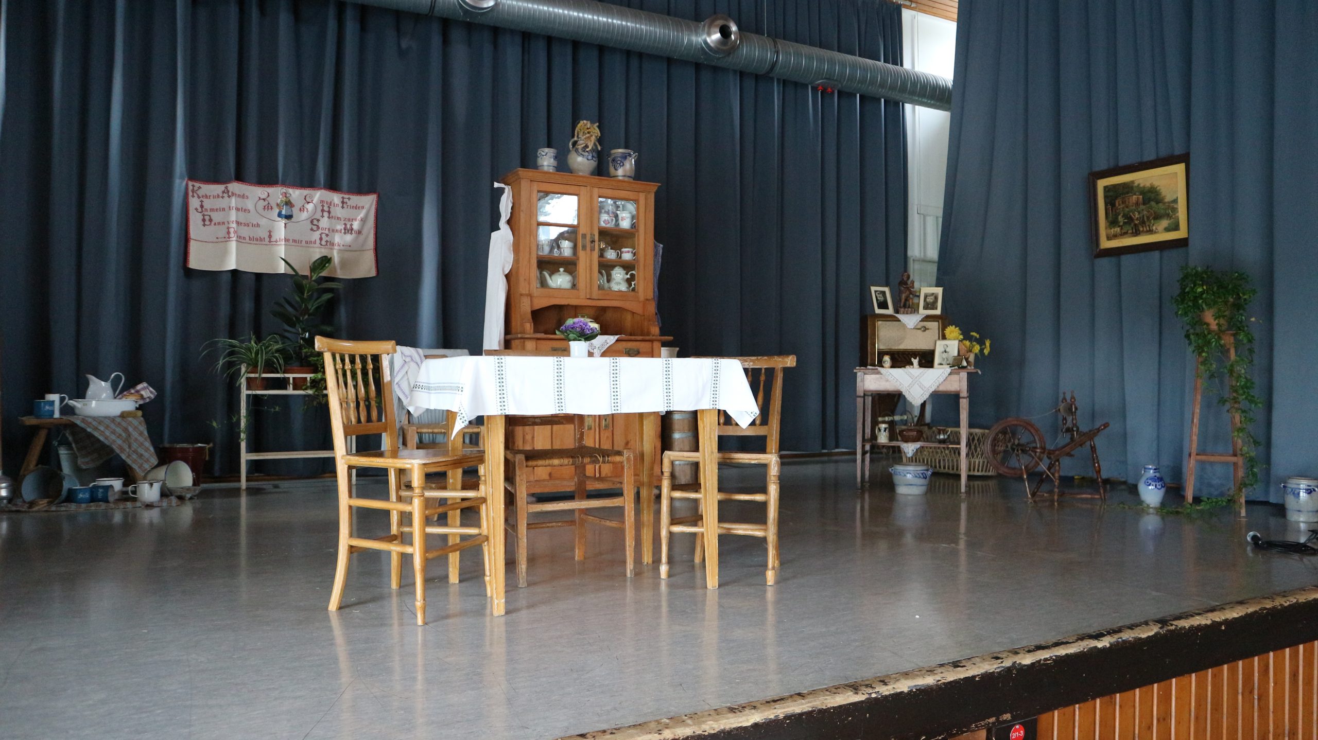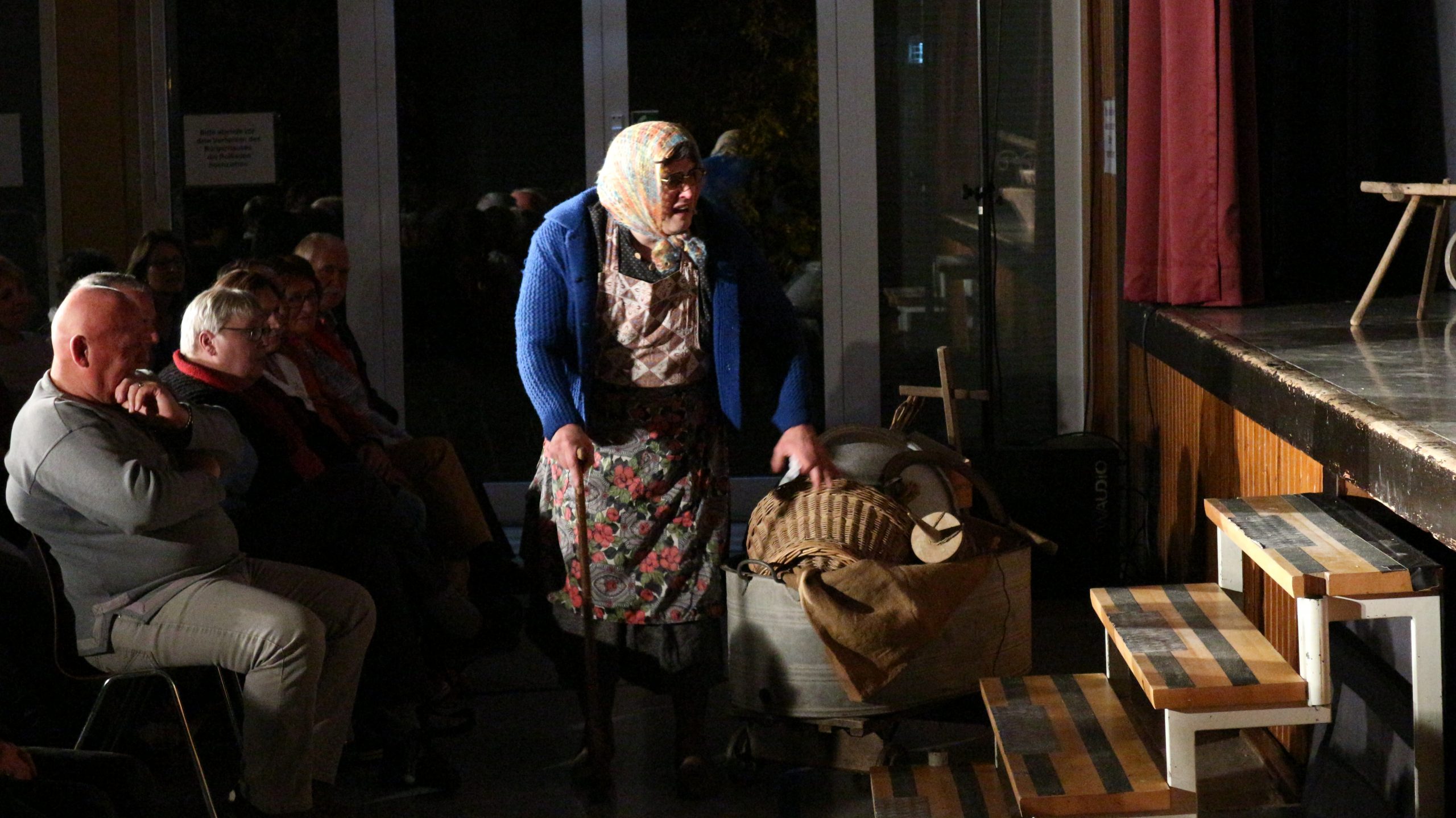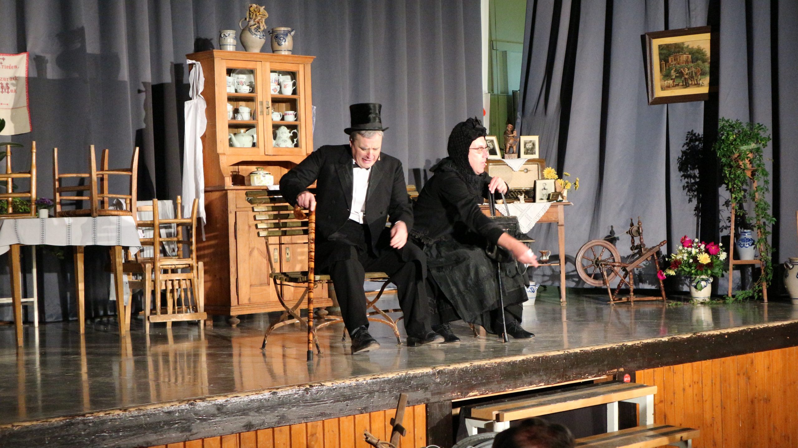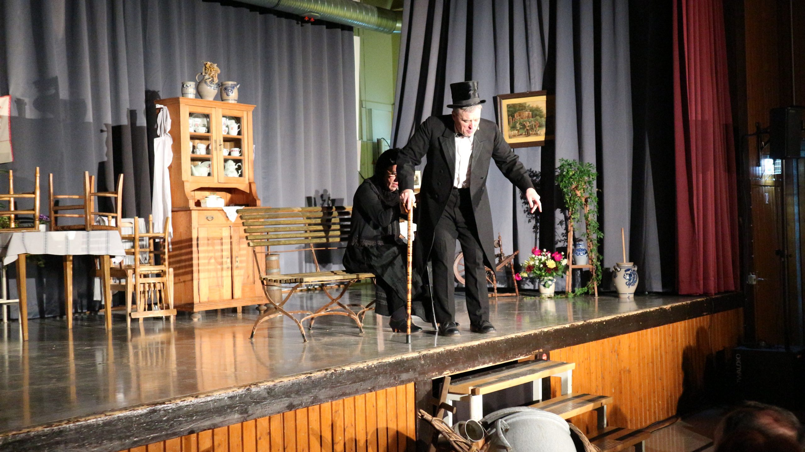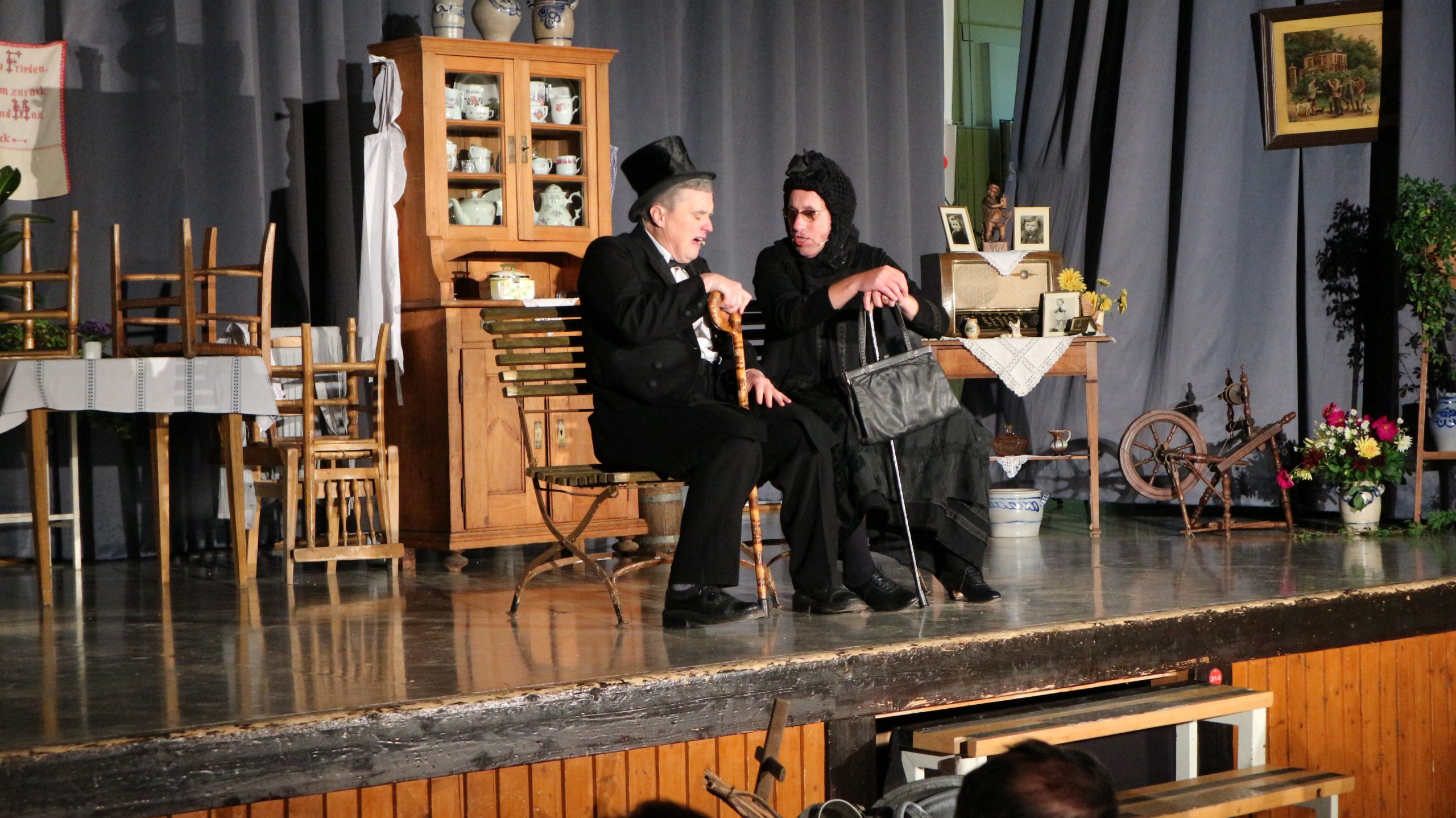 Dann ging es auf die Bühne, die liebevoll in eine Bauernstube verwandelt worden war. Viele Accessoires wie ein Röhrenradio, ein Tisch mit Stühlen und gestickte Tücher mit Sinnsprüchen darauf, passten sehr gut zum Gespräch auf der Bühne. Hier zeigte sich, dass eine Magd durchaus das Potential hat, ihren Brötchengeber aufzumischen. Dass der nur aus Wernborn eingeheiratet habe, war natürlich ein Detail ganz nach dem Geschmack der Eschbacher. Warum es keinen Hahn (Gickel) mehr gibt, was es mit den häufigen Besuchen des Tierarztes auf dem Gehöft auf sich hat und warum der Bauer anscheinend einen eingeschränkten Horizont hat, wurde sehr zum Amüsement der Gäste aufgedröselt.