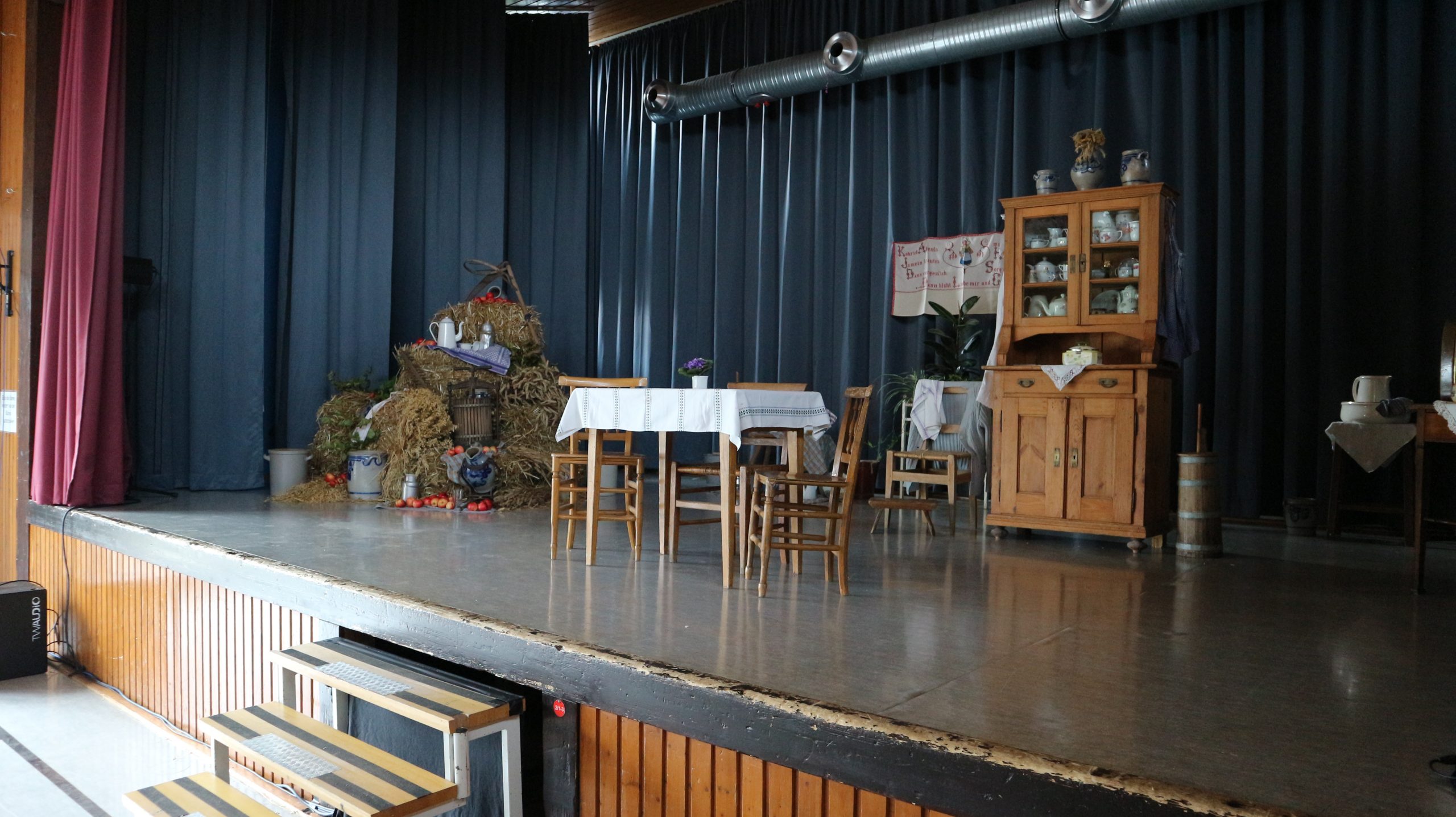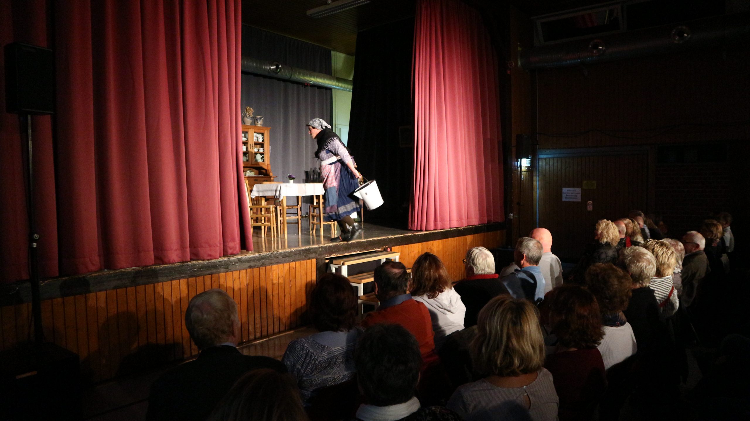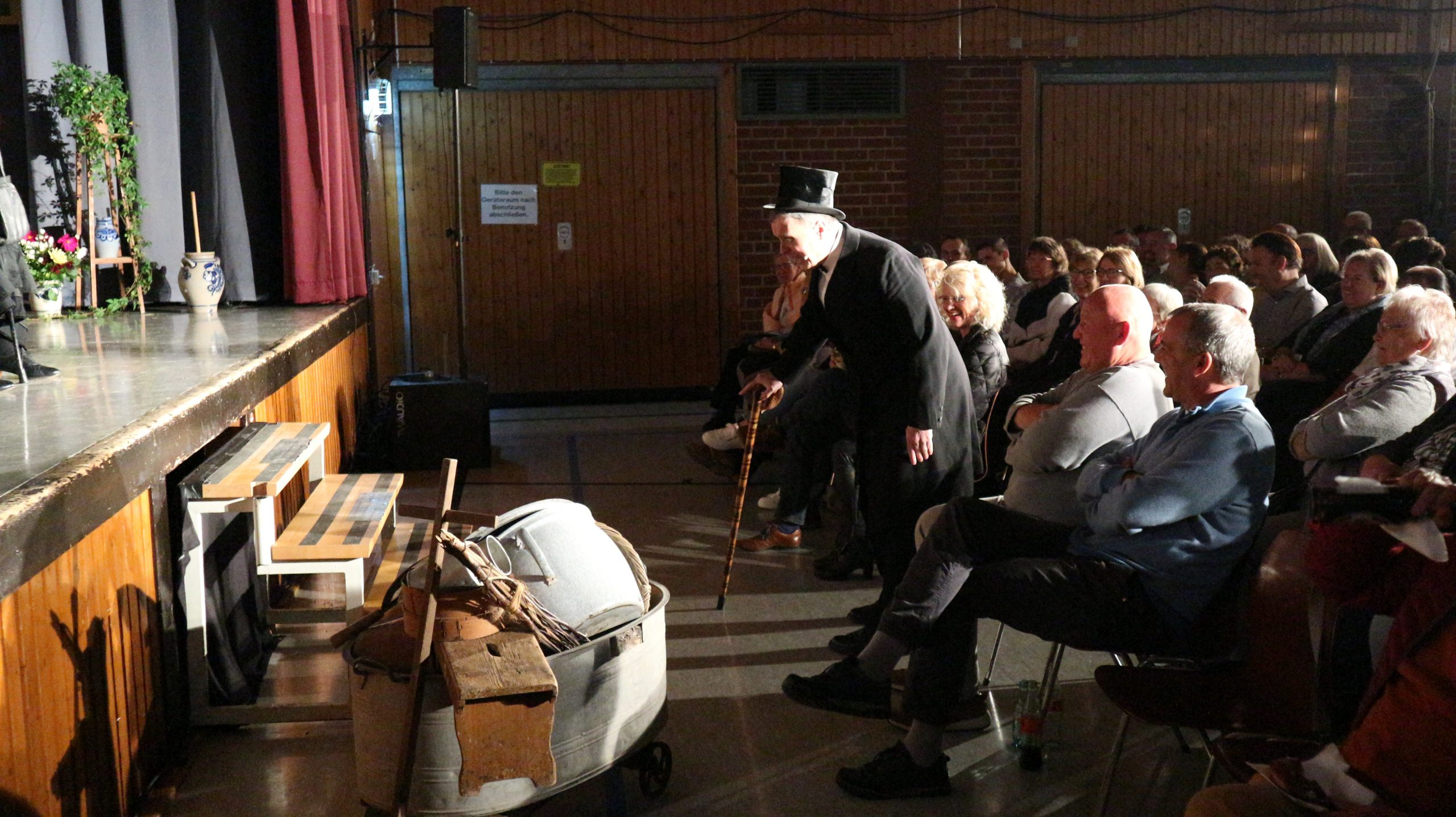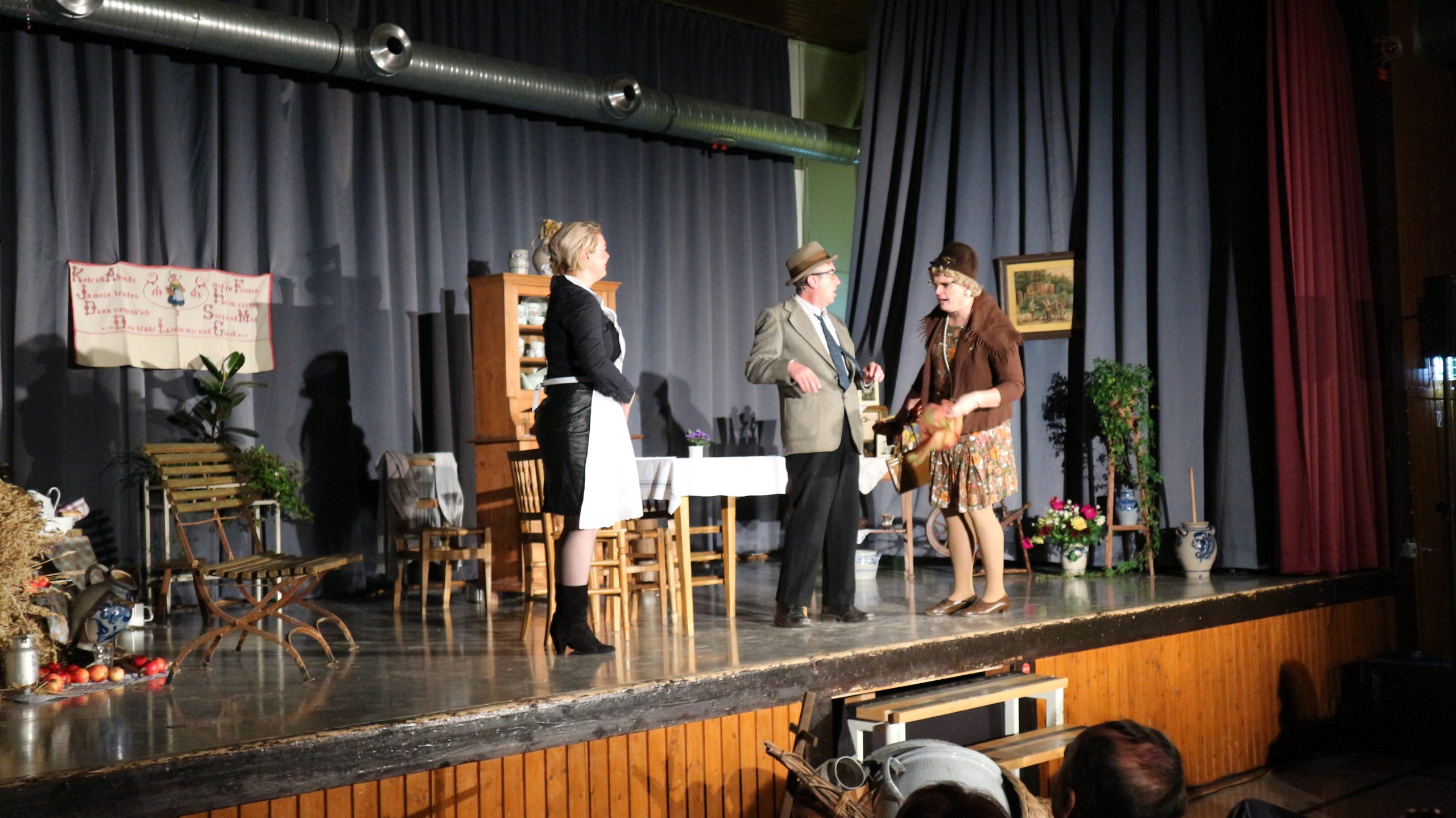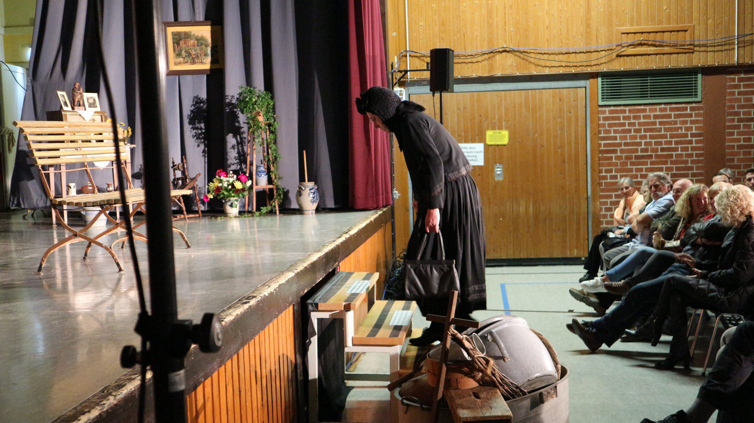 Dann ging es auf die Bühne, die liebevoll in eine Bauernstube verwandelt worden war. Viele Accessoires wie ein Röhrenradio, ein Tisch mit Stühlen und gestickte Tücher mit Sinnsprüchen darauf, passten sehr gut zum Gespräch auf der Bühne. Hier zeigte sich, dass eine Magd durchaus das Potential hat, ihren Brötchengeber aufzumischen. Dass der nur aus Wernborn eingeheiratet habe, war natürlich ein Detail ganz nach dem Geschmack der Eschbacher. Warum es keinen Hahn (Gickel) mehr gibt, was es mit den häufigen Besuchen des Tierarztes auf dem Gehöft auf sich hat und warum der Bauer anscheinend einen eingeschränkten Horizont hat, wurde sehr zum Amüsement der Gäste aufgedröselt.