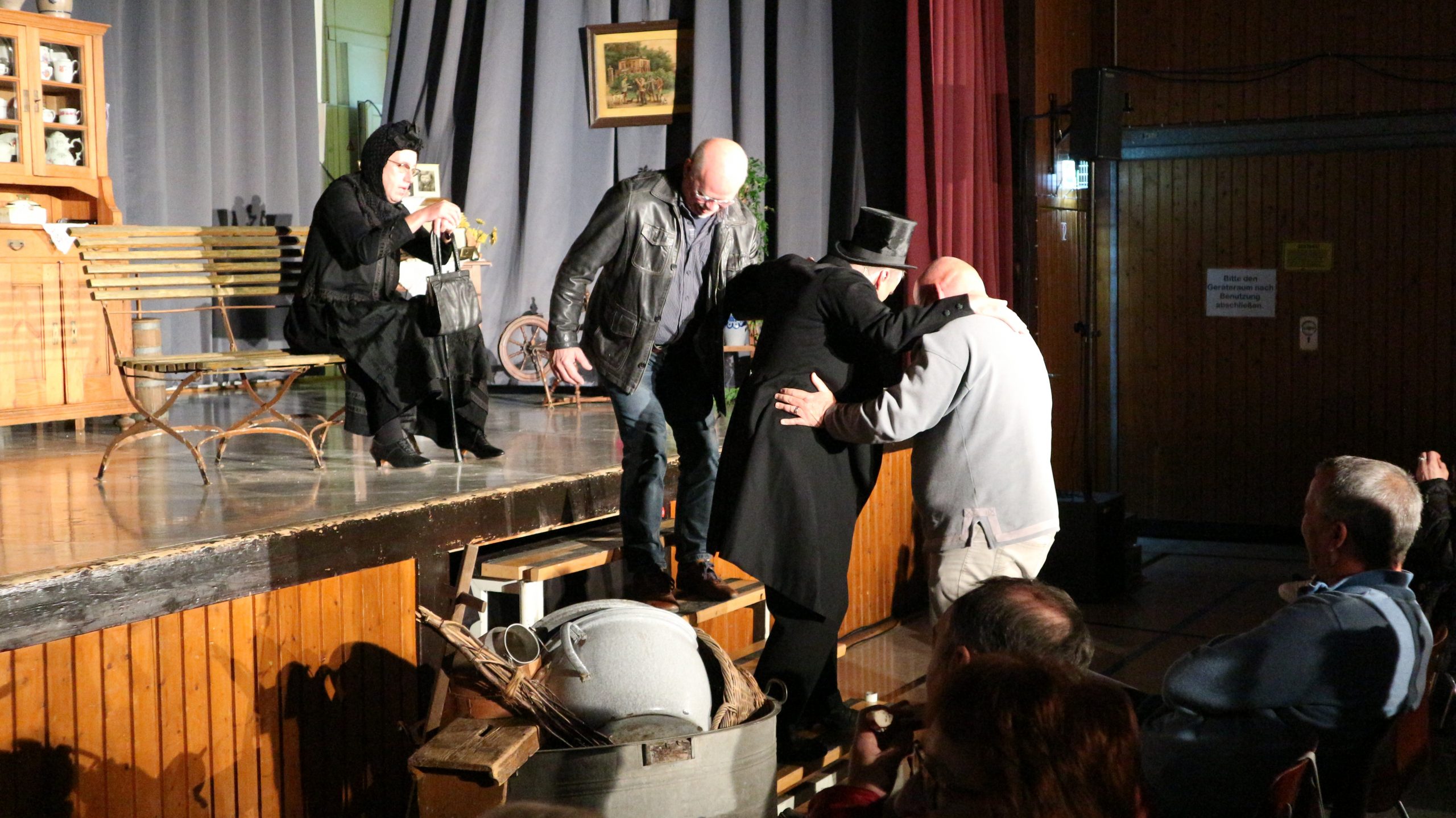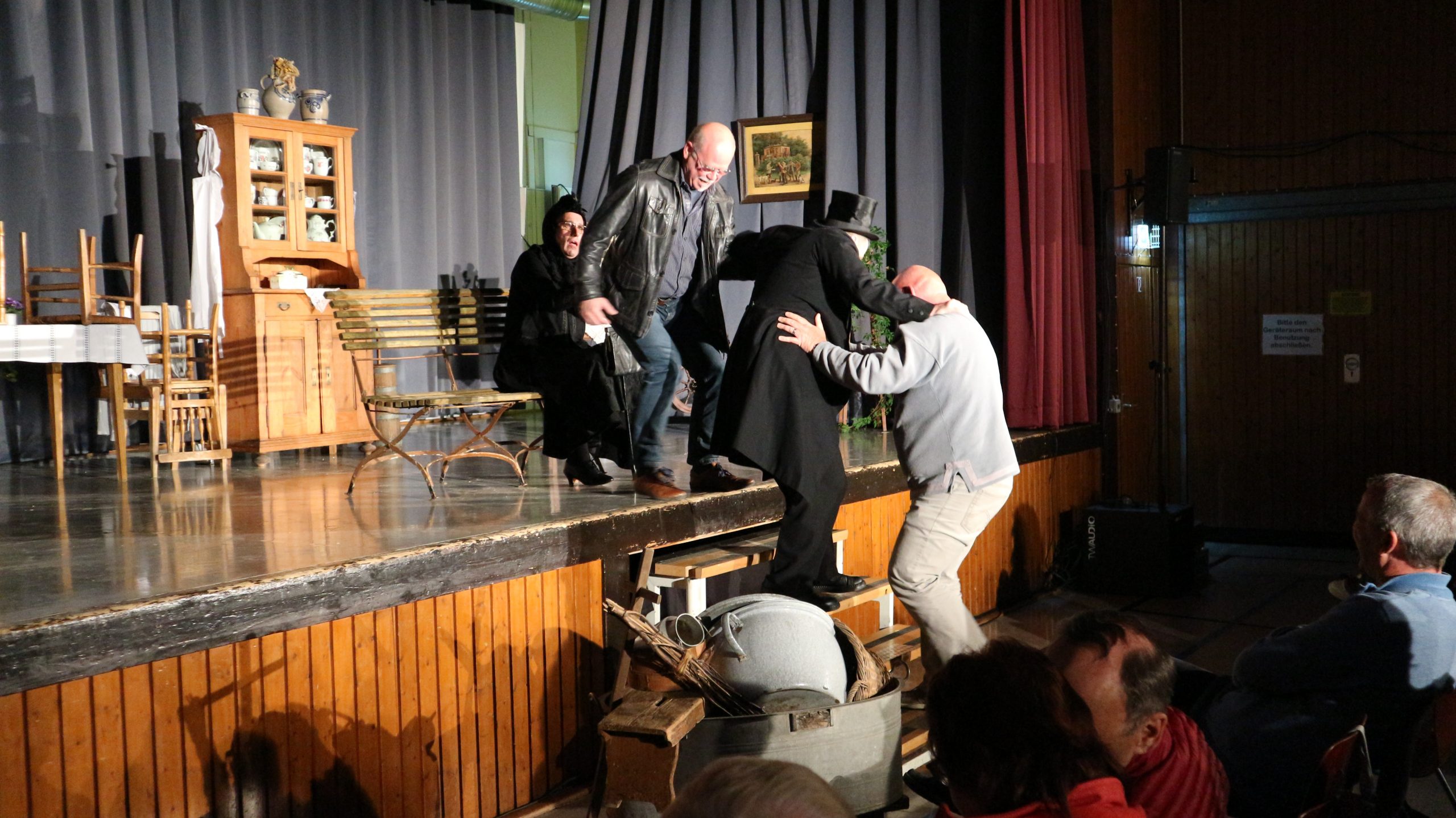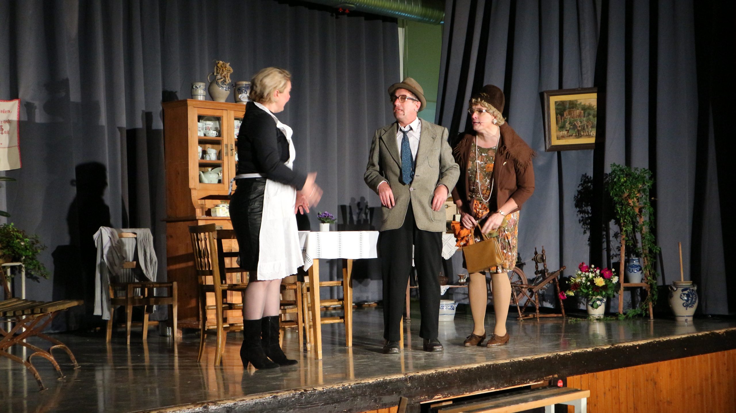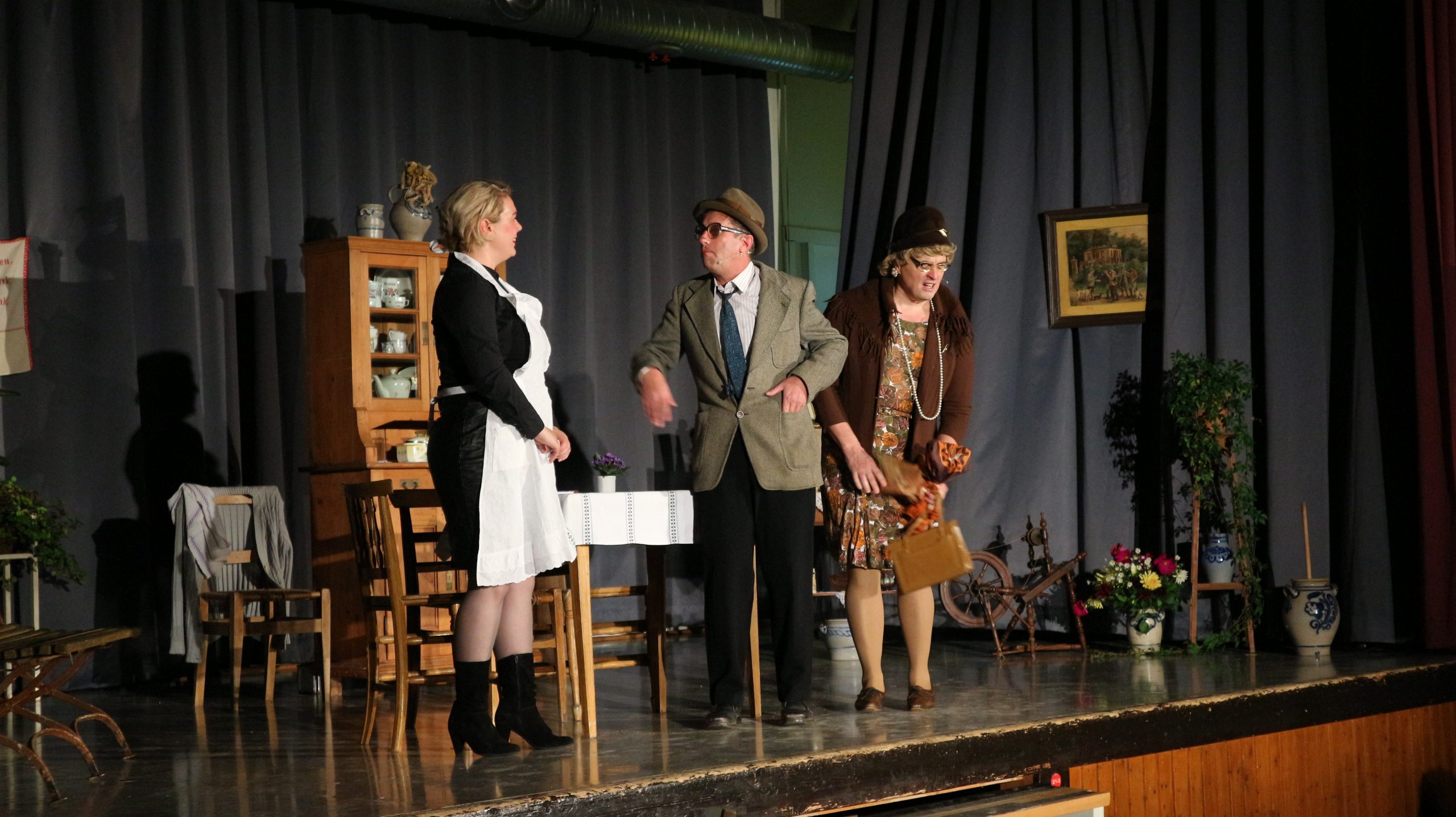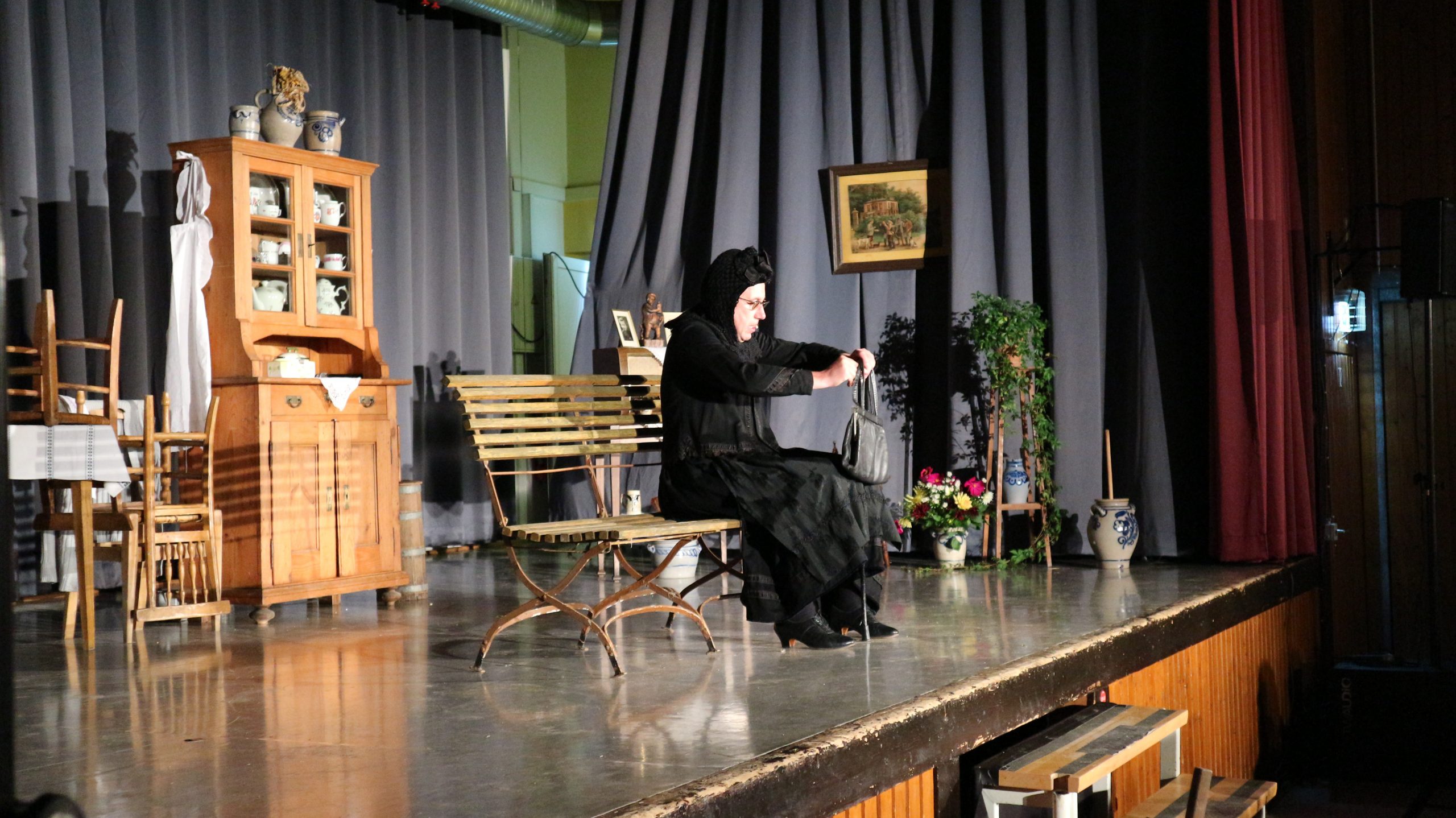Dann ging es auf die Bühne, die liebevoll in eine Bauernstube verwandelt worden war. Viele Accessoires wie ein Röhrenradio, ein Tisch mit Stühlen und gestickte Tücher mit Sinnsprüchen darauf, passten sehr gut zum Gespräch auf der Bühne. Hier zeigte sich, dass eine Magd durchaus das Potential hat, ihren Brötchengeber aufzumischen. Dass der nur aus Wernborn eingeheiratet habe, war natürlich ein Detail ganz nach dem Geschmack der Eschbacher. Warum es keinen Hahn (Gickel) mehr gibt, was es mit den häufigen Besuchen des Tierarztes auf dem Gehöft auf sich hat und warum der Bauer anscheinend einen eingeschränkten Horizont hat, wurde sehr zum Amüsement der Gäste aufgedröselt.