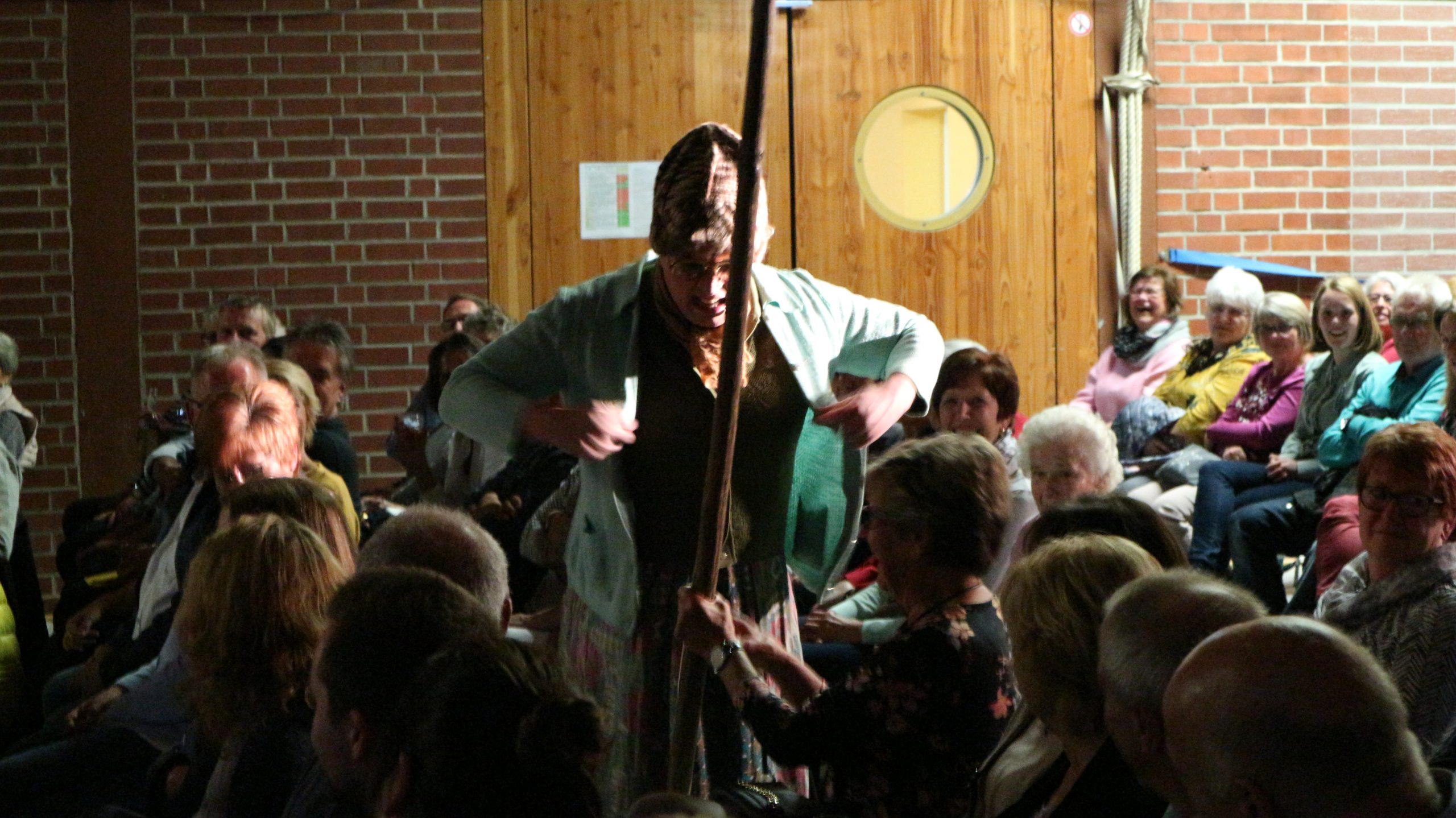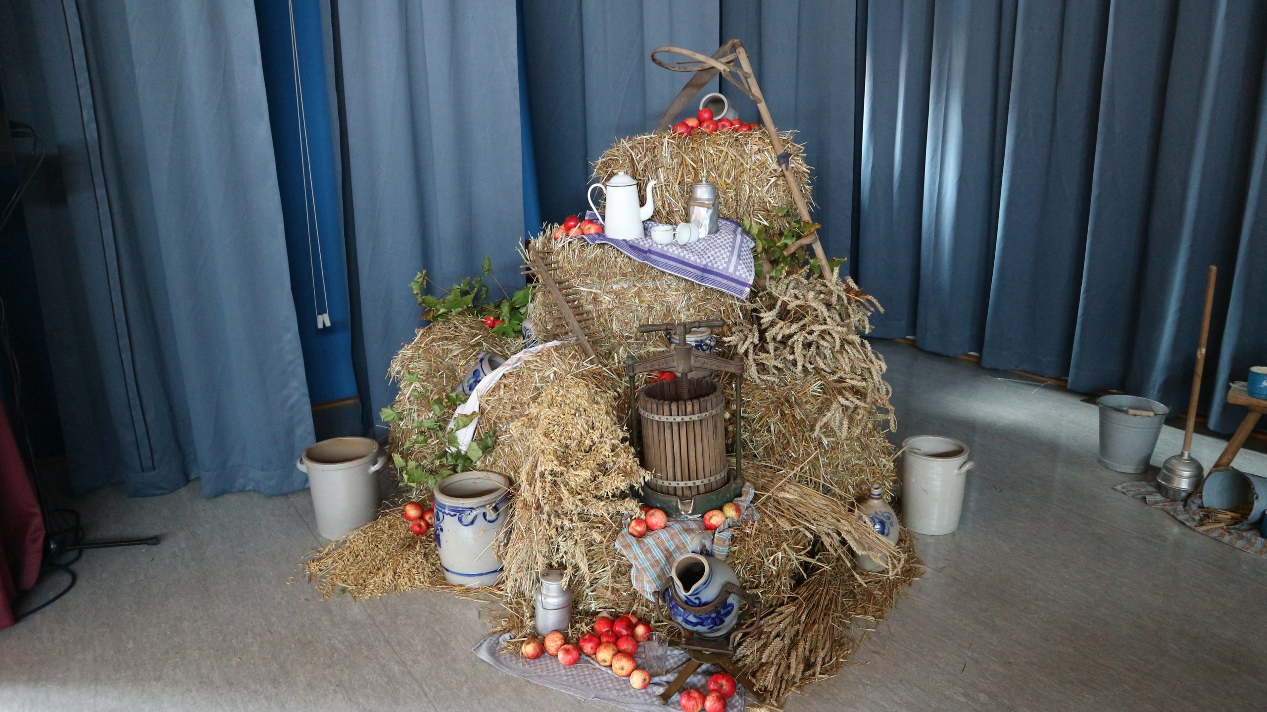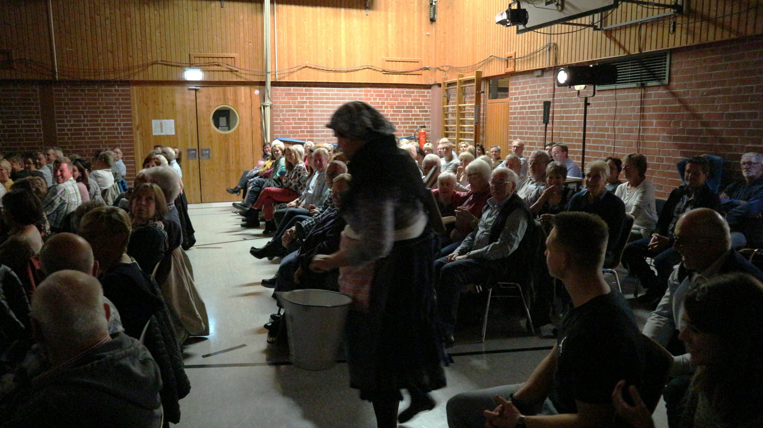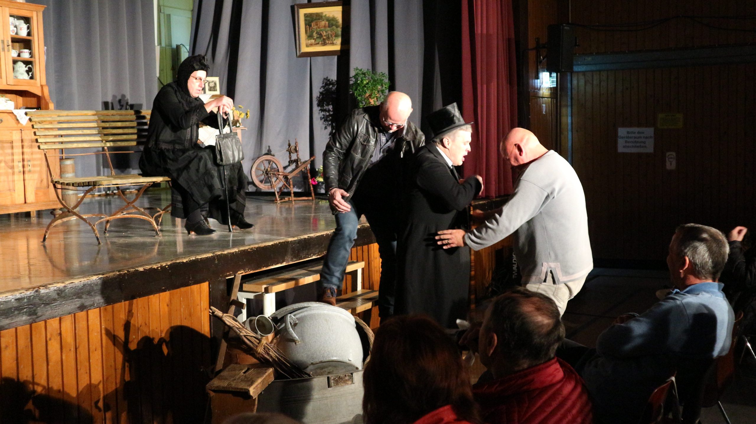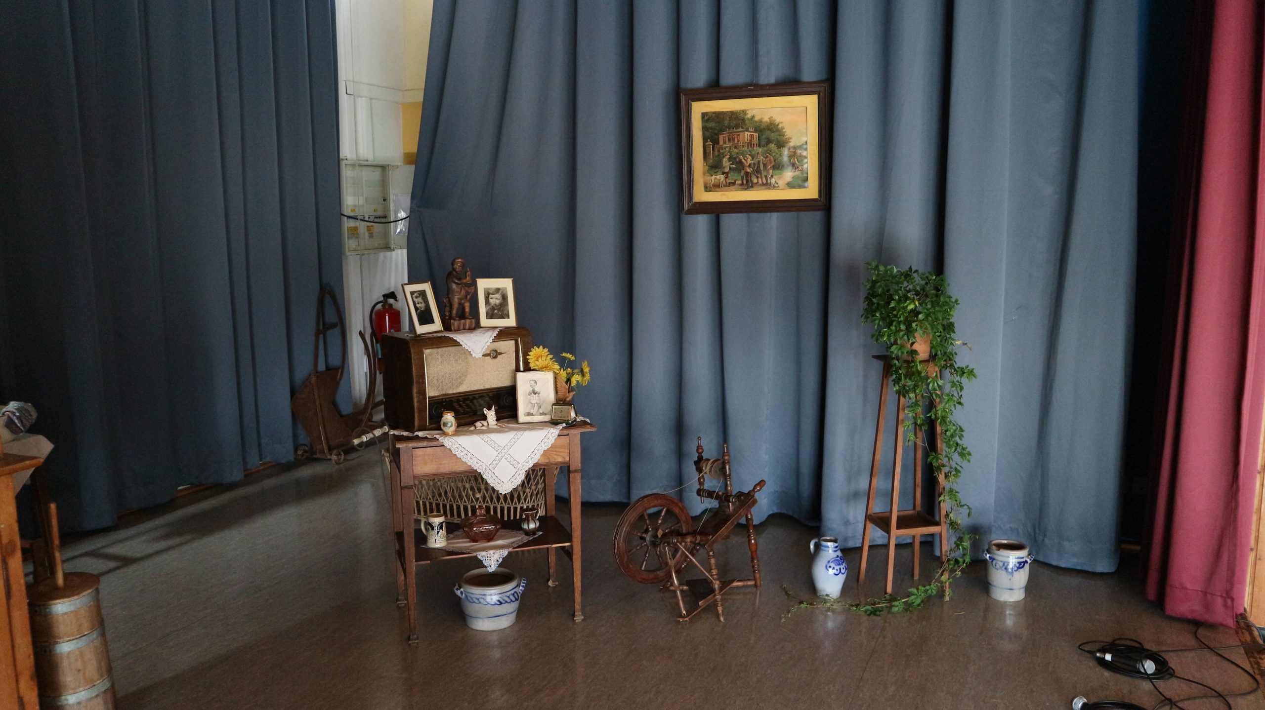 Dann ging es auf die Bühne, die liebevoll in eine Bauernstube verwandelt worden war. Viele Accessoires wie ein Röhrenradio, ein Tisch mit Stühlen und gestickte Tücher mit Sinnsprüchen darauf, passten sehr gut zum Gespräch auf der Bühne. Hier zeigte sich, dass eine Magd durchaus das Potential hat, ihren Brötchengeber aufzumischen. Dass der nur aus Wernborn eingeheiratet habe, war natürlich ein Detail ganz nach dem Geschmack der Eschbacher. Warum es keinen Hahn (Gickel) mehr gibt, was es mit den häufigen Besuchen des Tierarztes auf dem Gehöft auf sich hat und warum der Bauer anscheinend einen eingeschränkten Horizont hat, wurde sehr zum Amüsement der Gäste aufgedröselt.