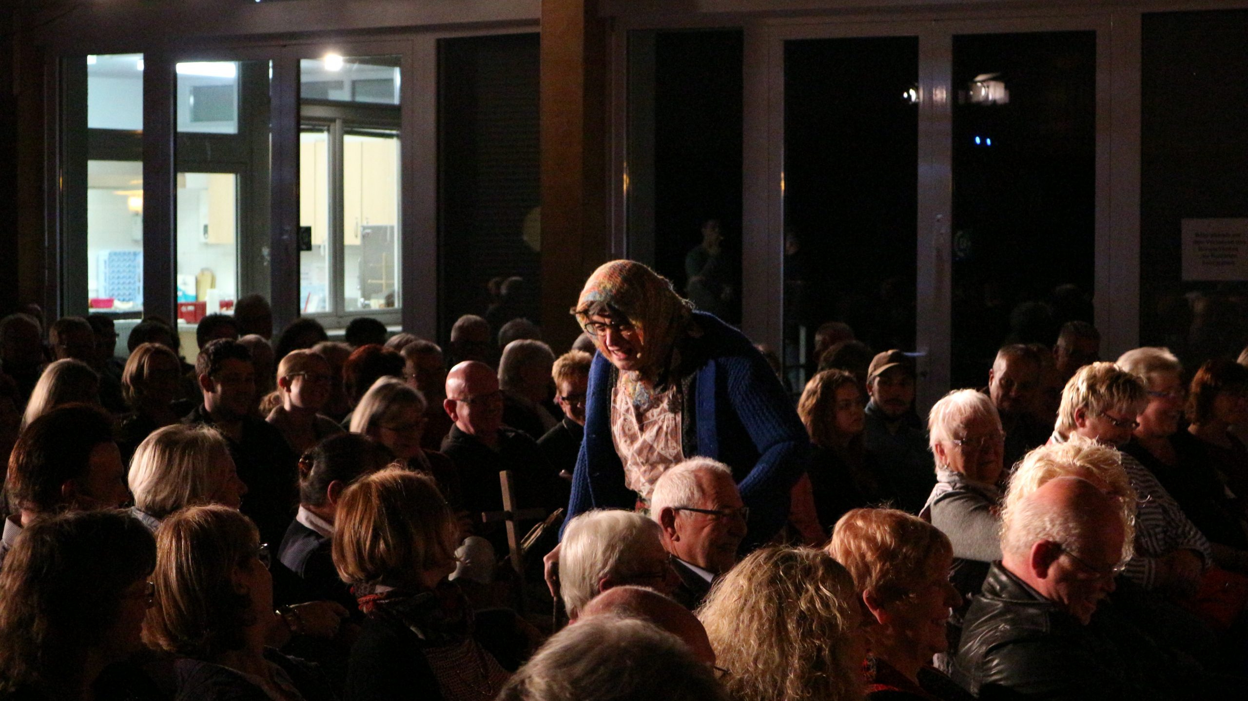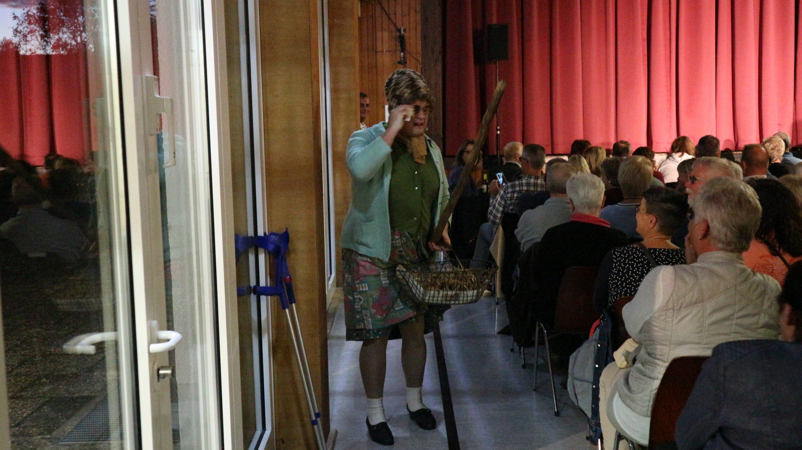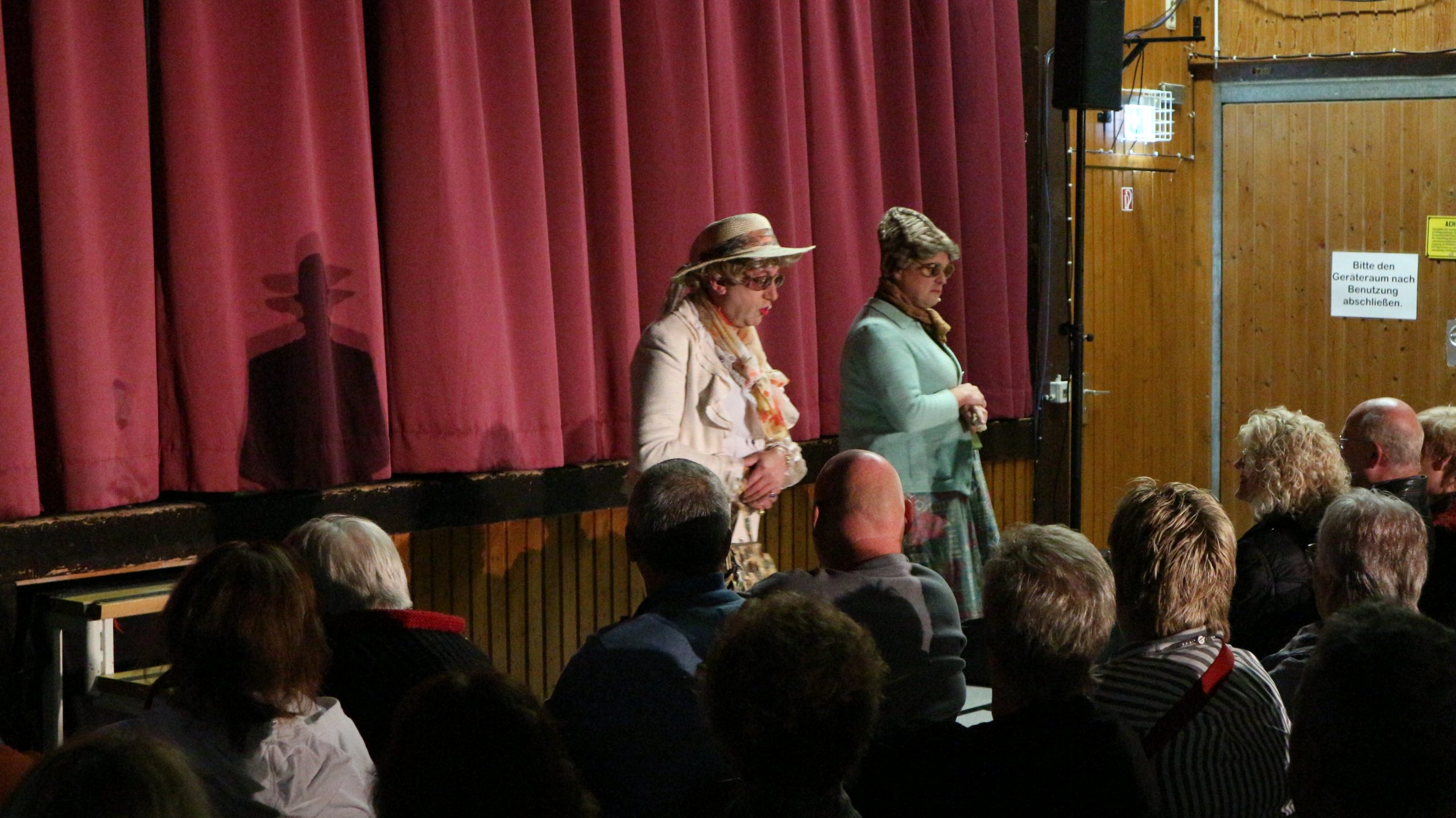 Mit einem schicken Rollator, der sogar ein Navigationsgerät hat, suchte sich die erste Bousseldande ihren Weg Richtung Publikum. In ein Kostümchen gewandet, Hütchen nebst Perücke passten einwandfrei dazu, blieb sie bei einem Gast „hängen“, fragte ihn aus und verabredete sich gleich im Anschluss an die Show mit ihm. So schick und geleckt die eine, so bodenständig und ganz und gar nicht schick die andere. In der Kittelschürze mit derbem Schuhwerk und einer Mütze auf den Haaren kam die zweite auf den Plan. Schon entwickelten sich aberwitzige Dialoge zwischen den beiden, bei denen Navigationsgeräte und Computerkurse, Internetseiten und Likes sowie der Kirchhof eine tragende Rolle spielten. „Ich habe 86 Bekannte und Freunde“, trumpfte die Kostümbousseldande auf und von jedem wisse sie, was er gerade mache. Das sei keine große Kunst, schnappte die andere zurück, das wisse sie auch. „Die liege alle uffem Kirchhof“, so die Pointe. Dass man Männer am besten in der Kurzzeitpflege kennenlernen kann, dass Nussschokolade und Gebiss sich nicht wirklich vertragen und dass der Hit von Schlagersängerin Gitte, „Ich will keine Schokolade“, auch bei einem Mundartabend gut ankommen, bewiesen sie bestens. Für Rainer Holl, den Vorsitzenden des Vereins Eschbacher Ortsgeschichte, der beste Beweis dafür, dass Mundart immer noch immens wichtig ist. Er ermunterte die Gäste dazu, selbst Mundart zu sprechen und so das kulturelle Erbe der Region hochzuhalten.
