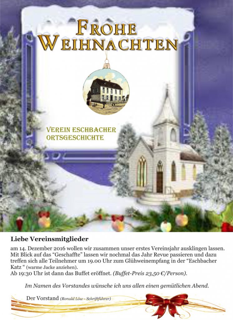 Zum 14. Dezember 2016 lud der Vorstand alle Vereinsmitglieder und deren Partner in die Eschbacher Katz zum Jahresabschluss mit Weihnachtsbuffet ein. Dreiundzwanzig Mitglieder folgten der Einladung. Es war ein sehr gemütlicher Abend.