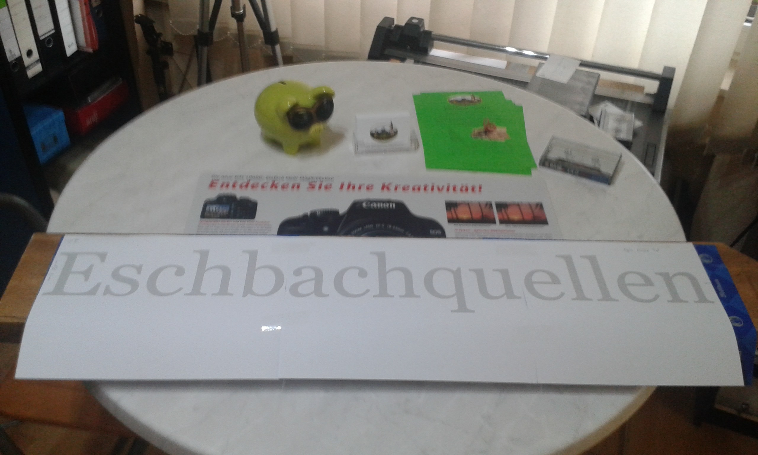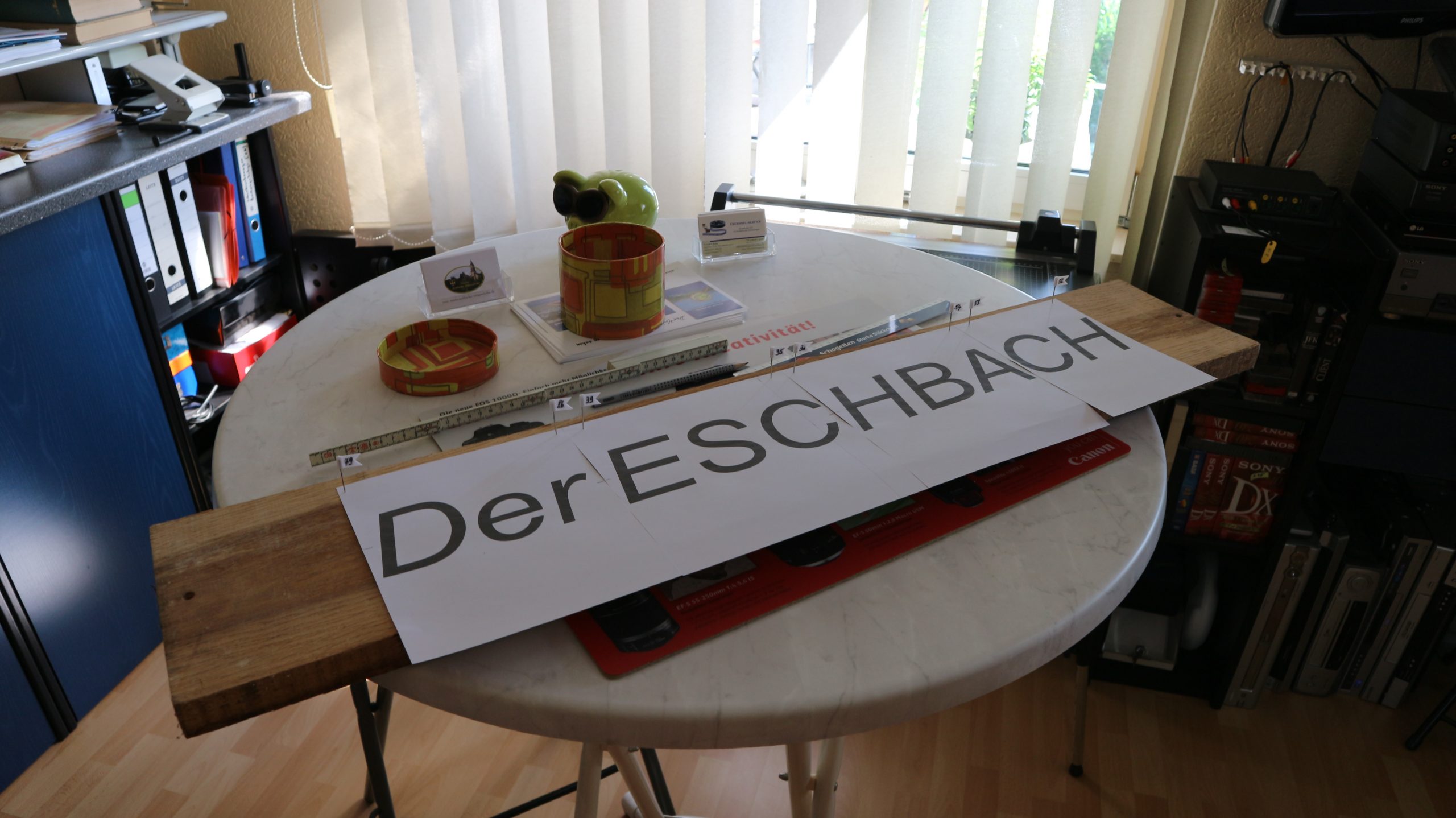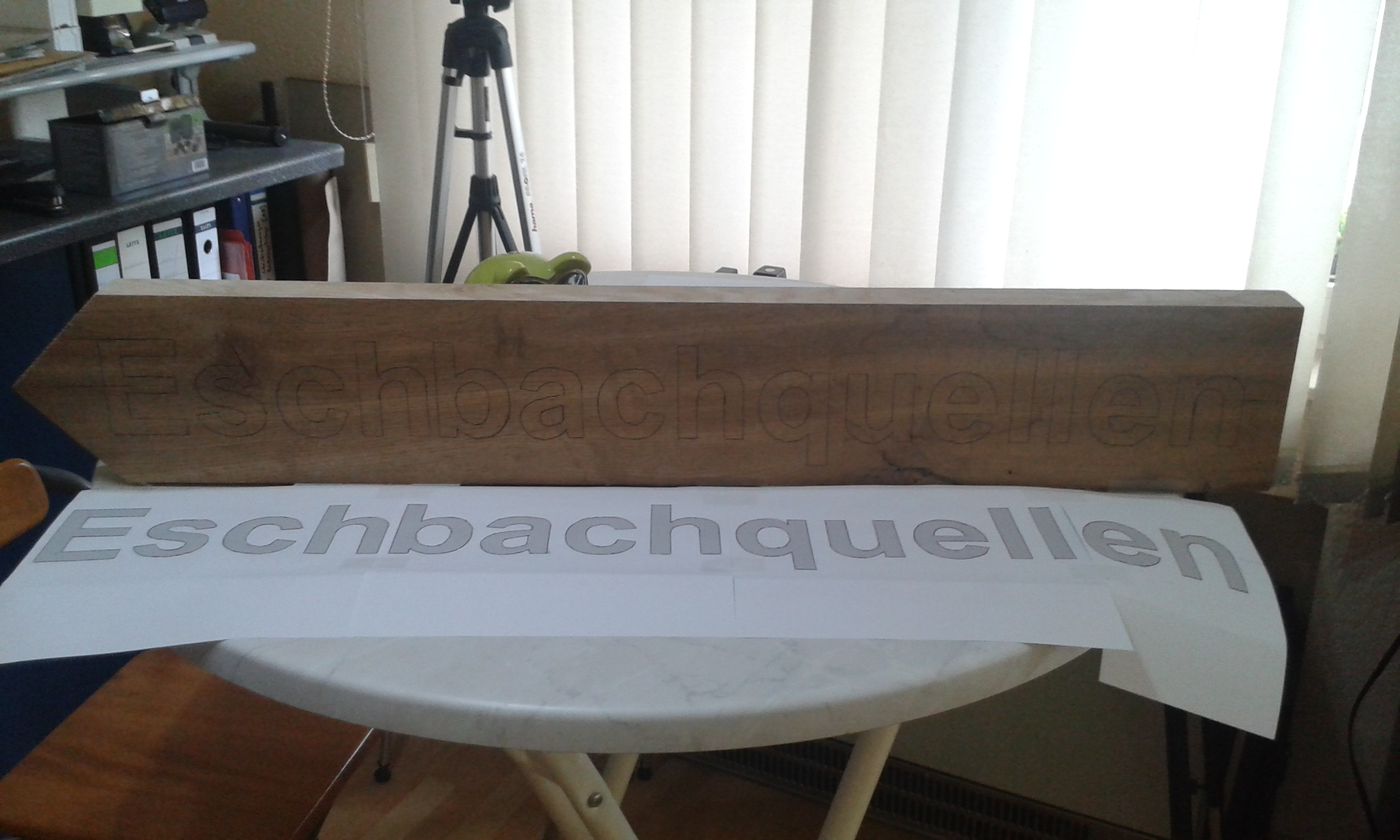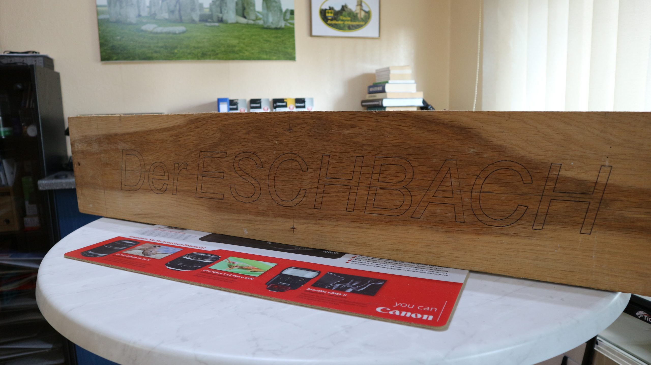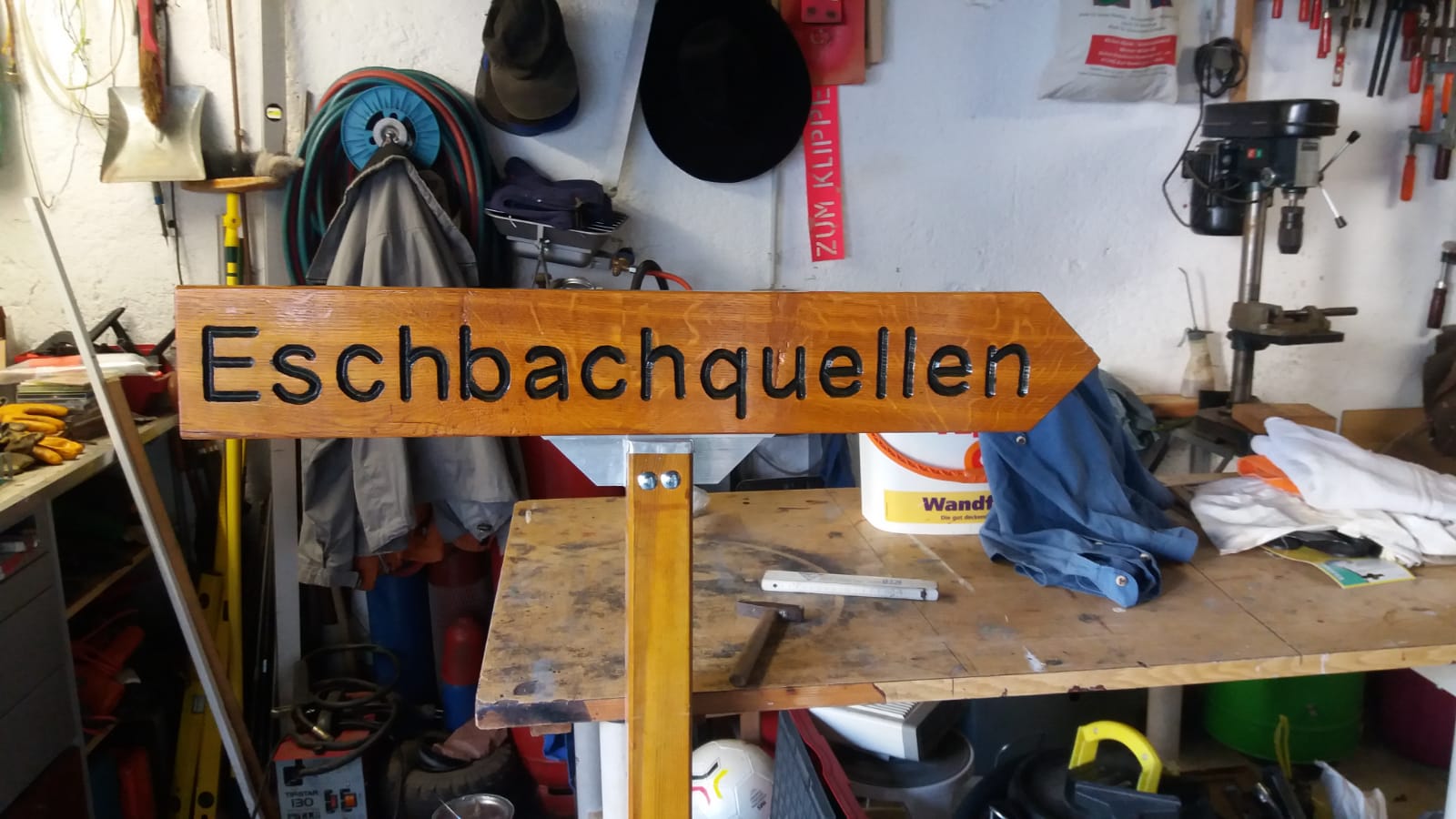 Von Ortwin Ruß erhielt Ronny Löw am 03.07.2017 ein Eichenbrett, worauf der Schriftzug „Eschbach-Quelle“ gebracht wurde, den Gerd Becker dann mit einer Fräse einritzte und mit Holzlasur strich.