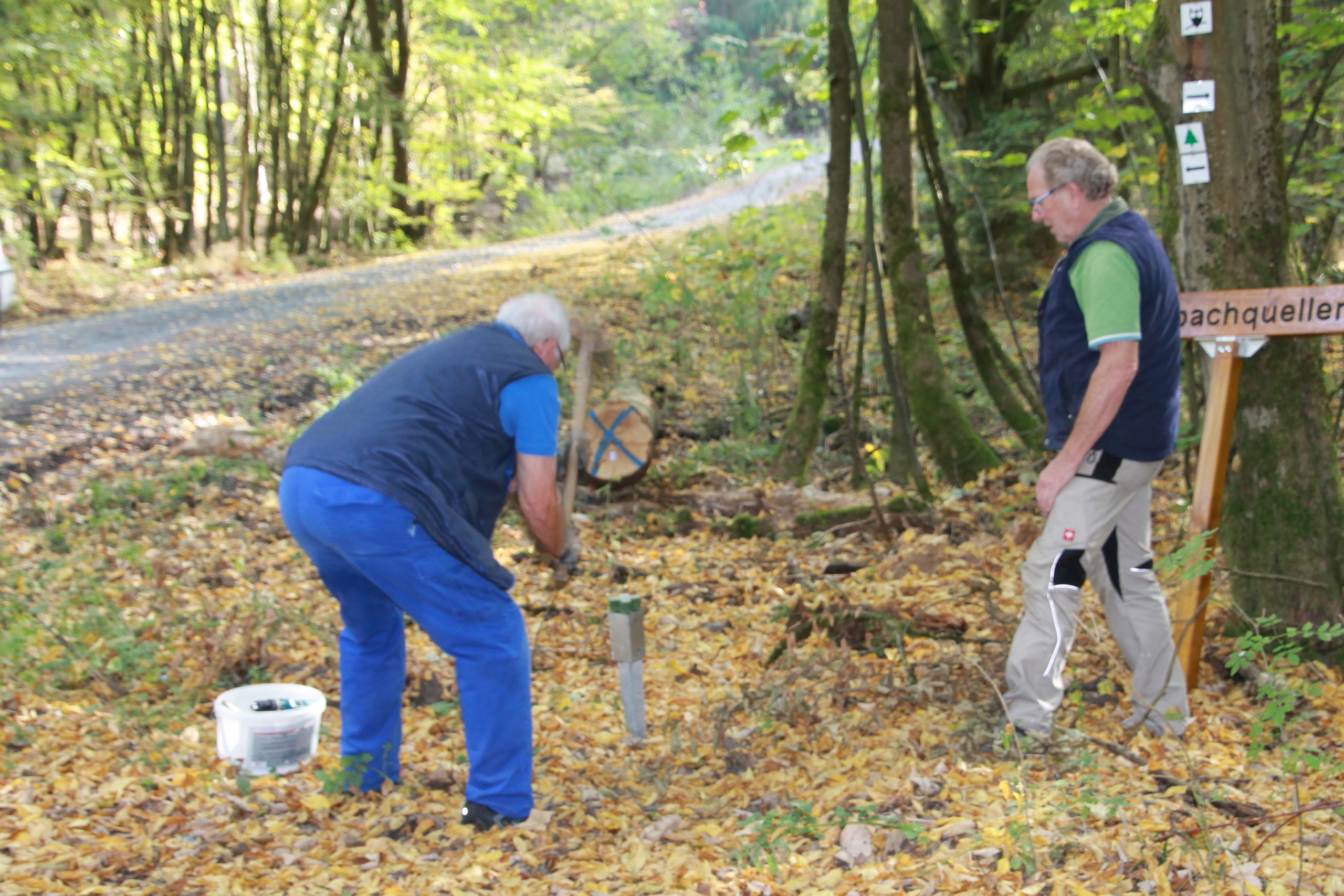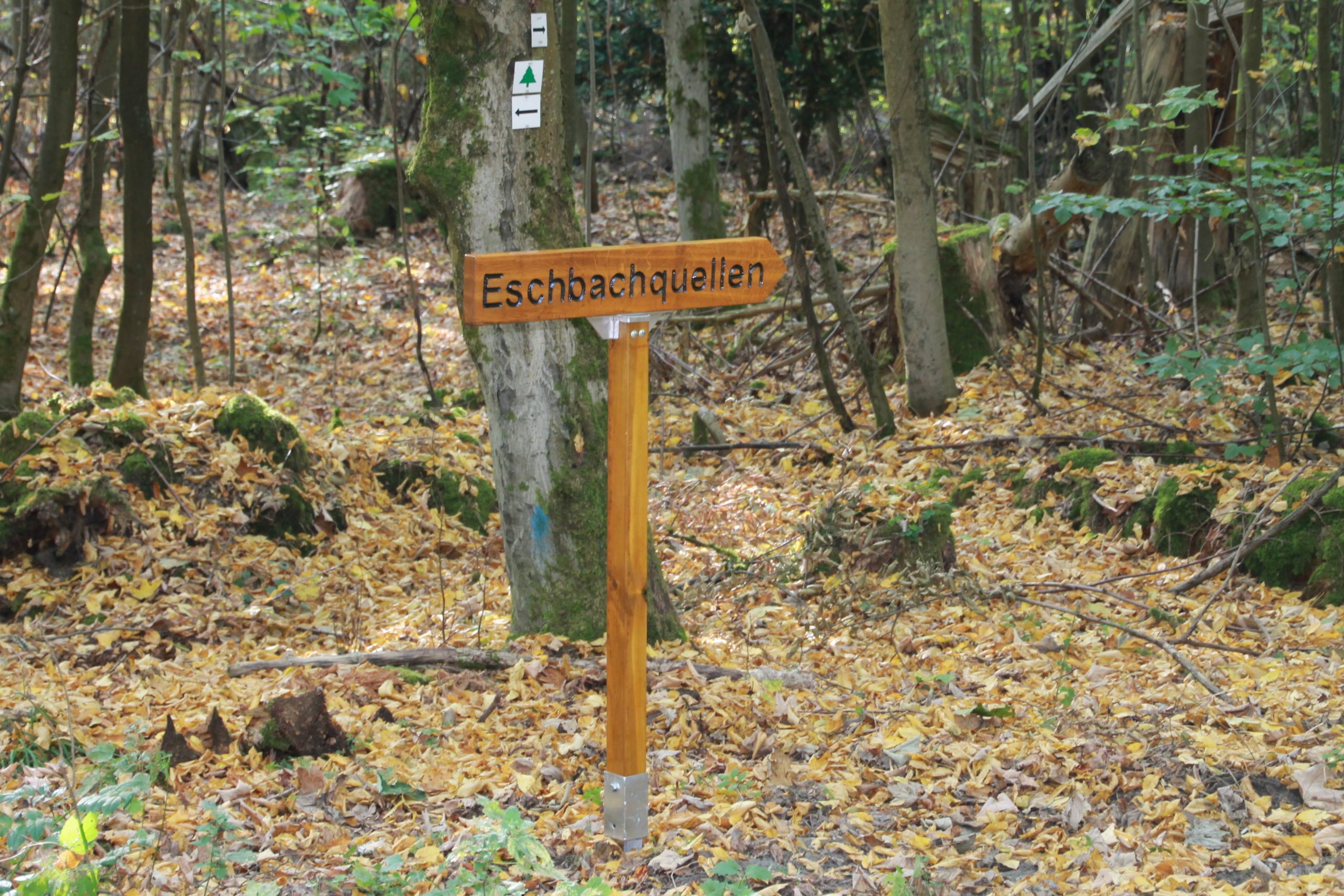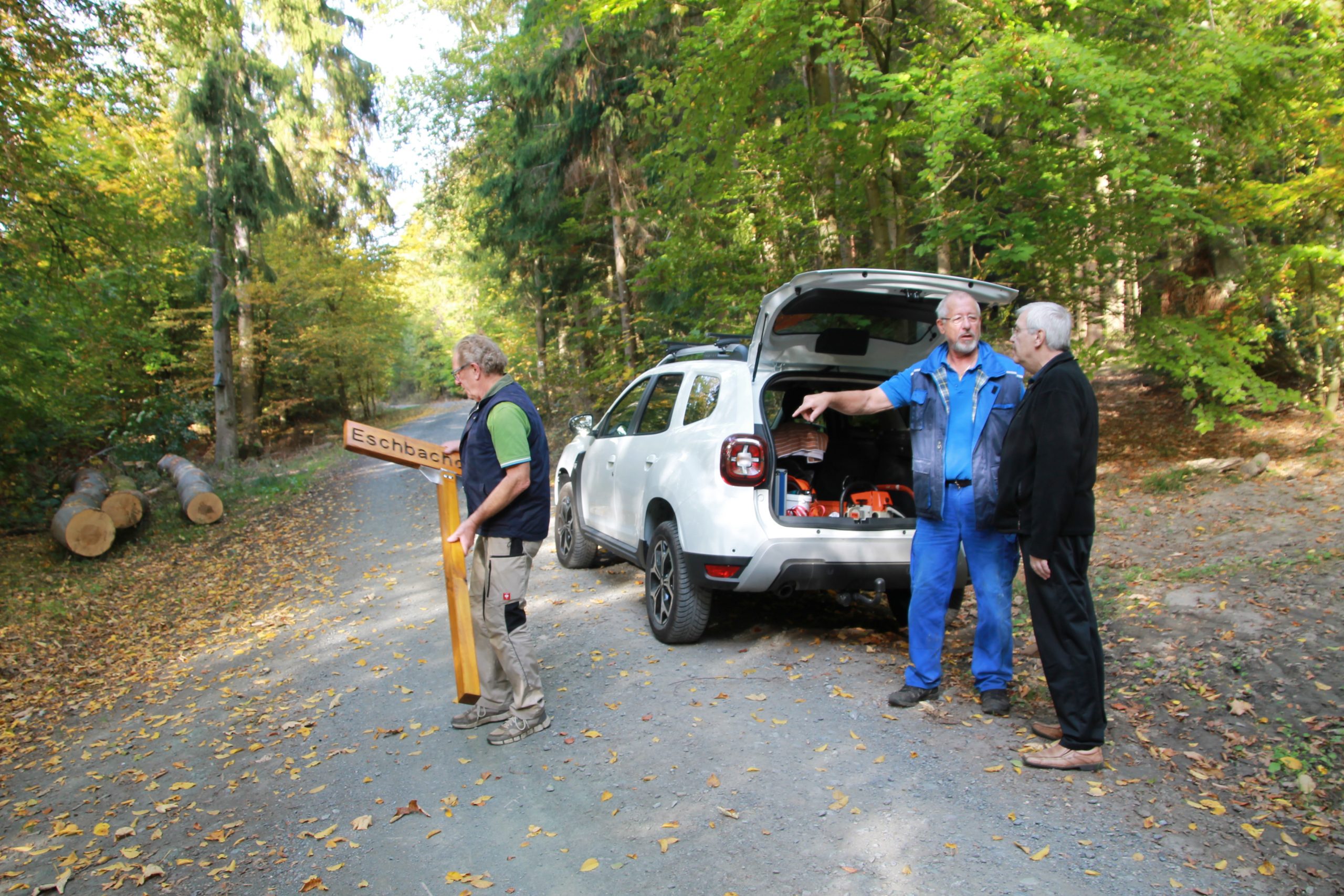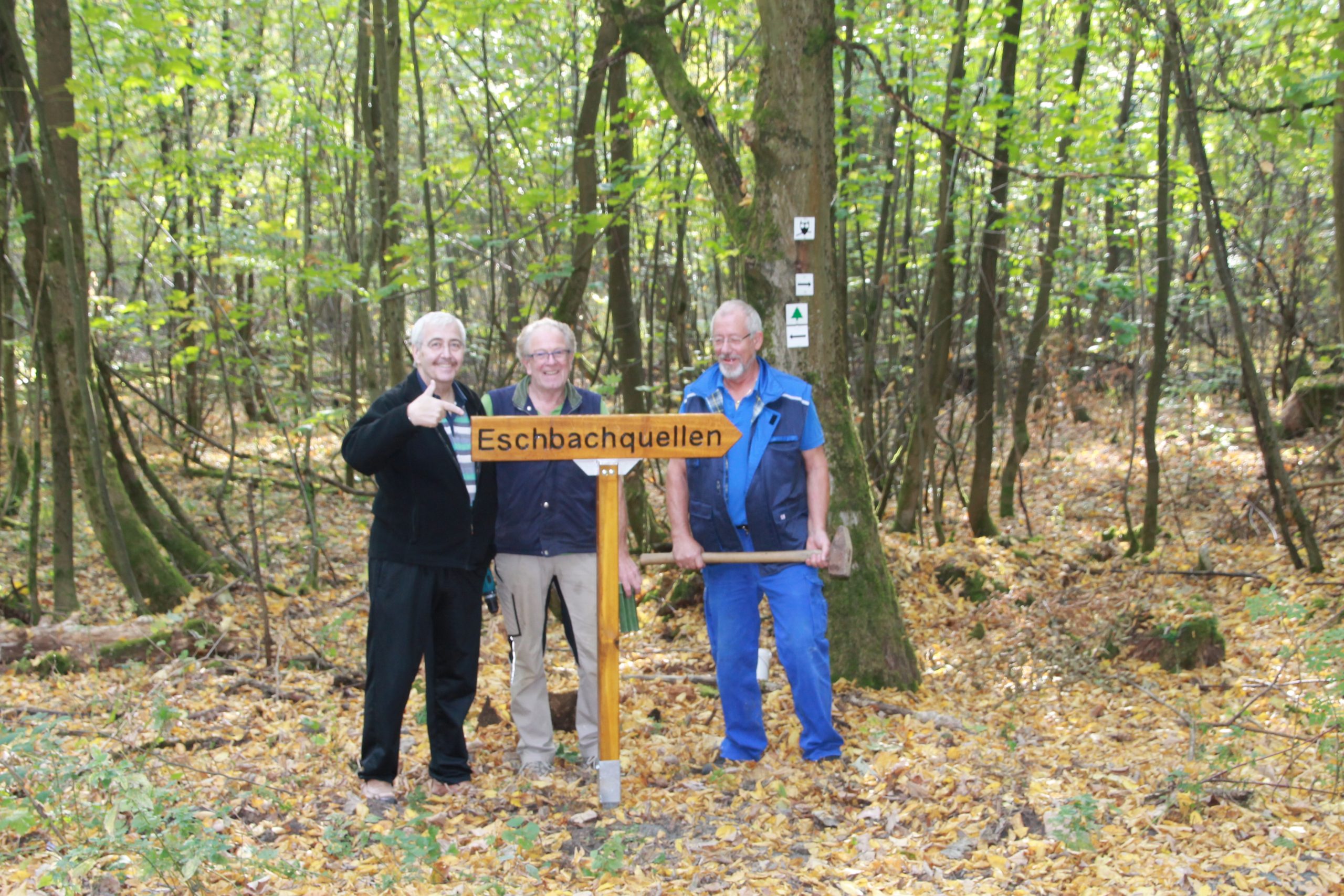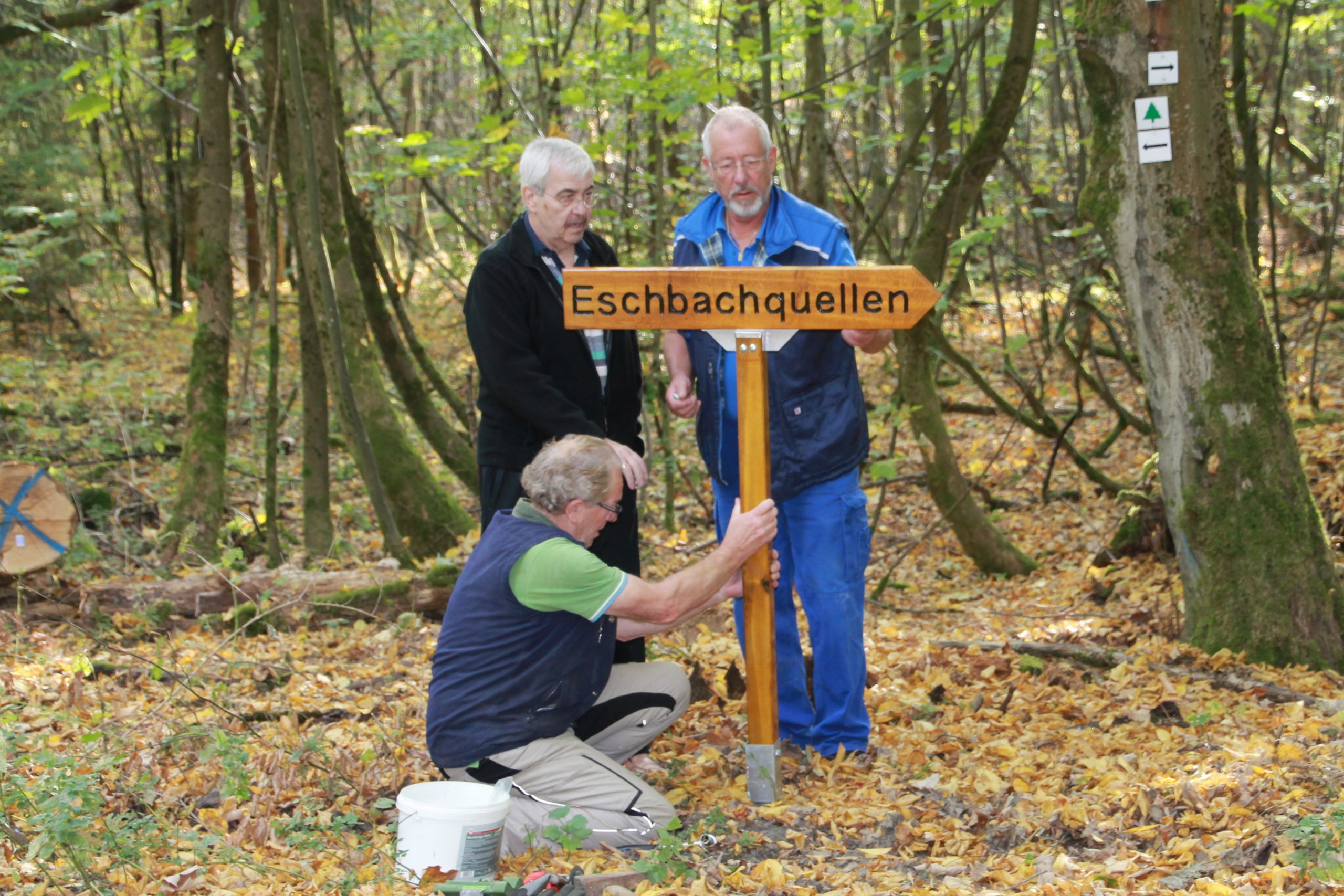 Nachdem Wanderer immer wieder nach der Eschbach-Quelle fragten, wurde überlegt, ein weiteres Hinweisschild am Grünen Weg zu platzieren. Auch dafür erhielten wir die Genehmigung von Förster Groß. Am 30.08.2017 bekam Ronny Löw wieder ein blanko Eichenbrett von Ortwin Ruß, das er wieder mit einem Schriftzug „Eschbachquellen“ versah. Auch Gerd Becker wurde wieder tätig und bearbeitete das Stück Eichenholz. Am 17.10.2017 wurde das Hinweisschild von Ortwin Ruß, Ronny Löw und Reiner Holl aufgestellt.