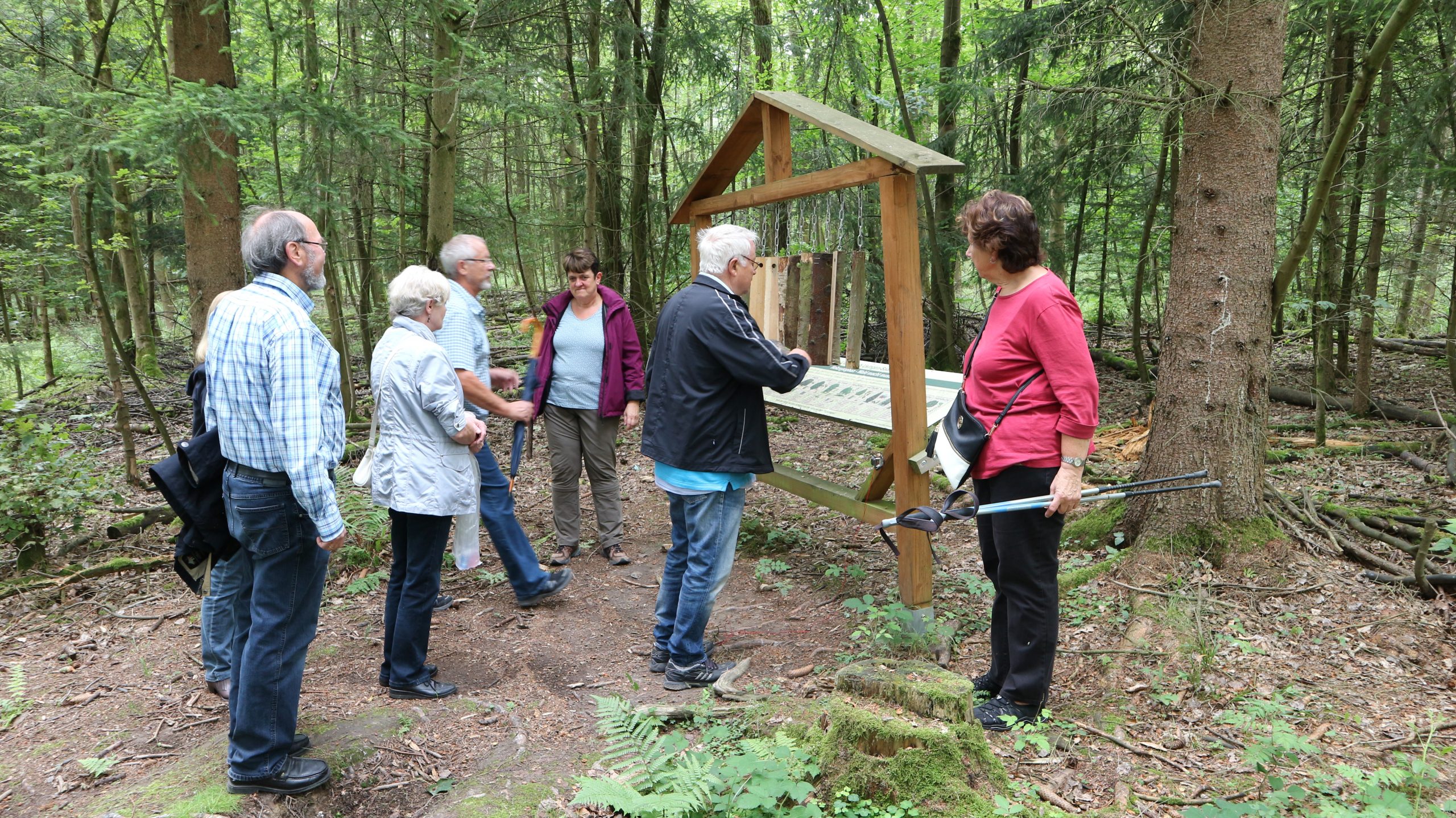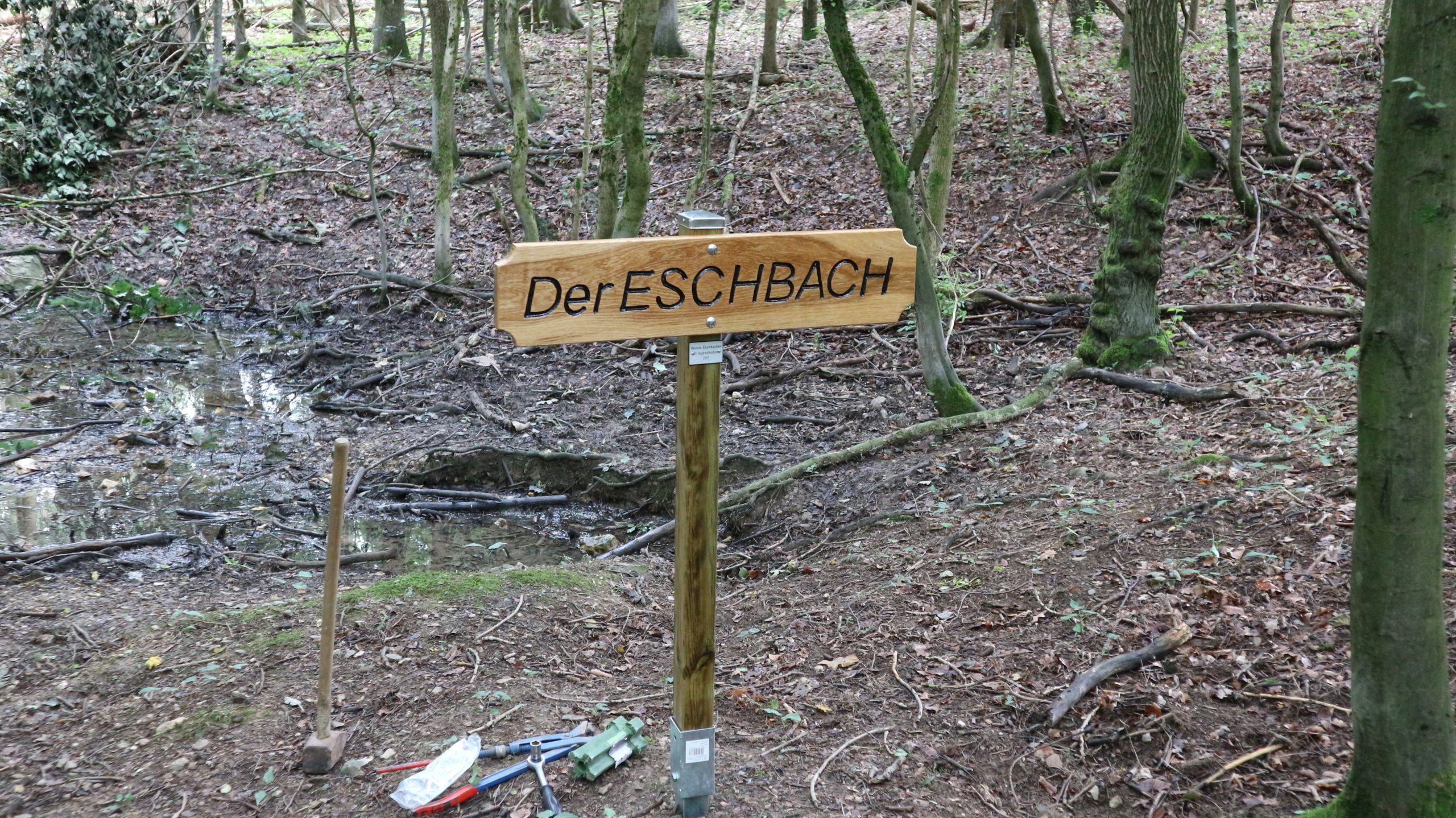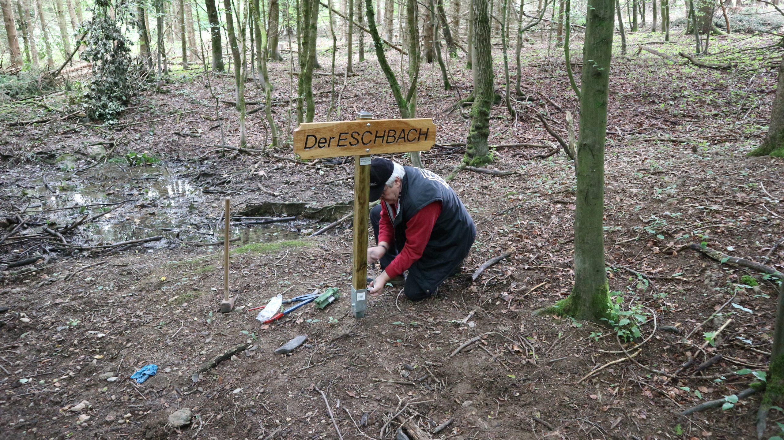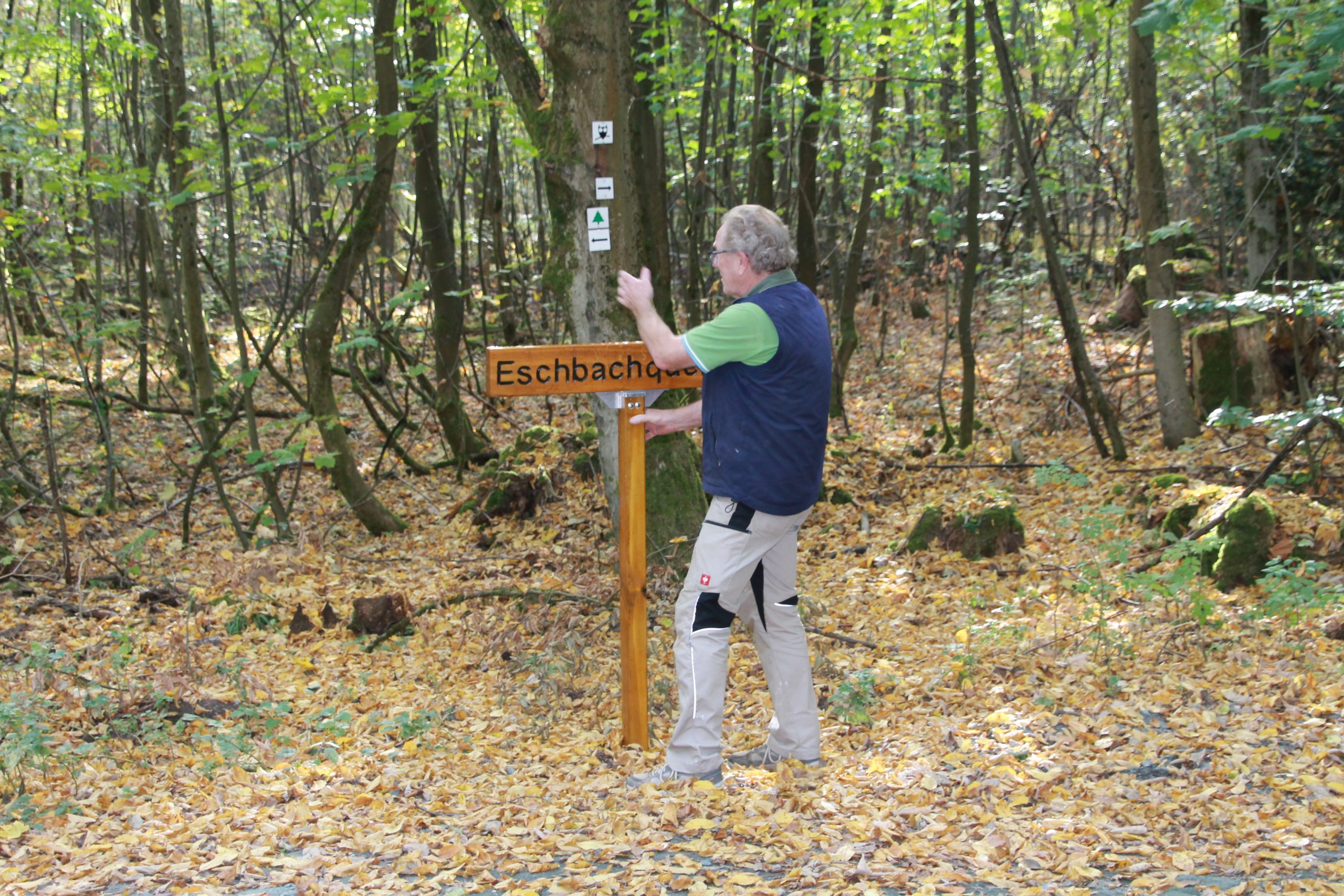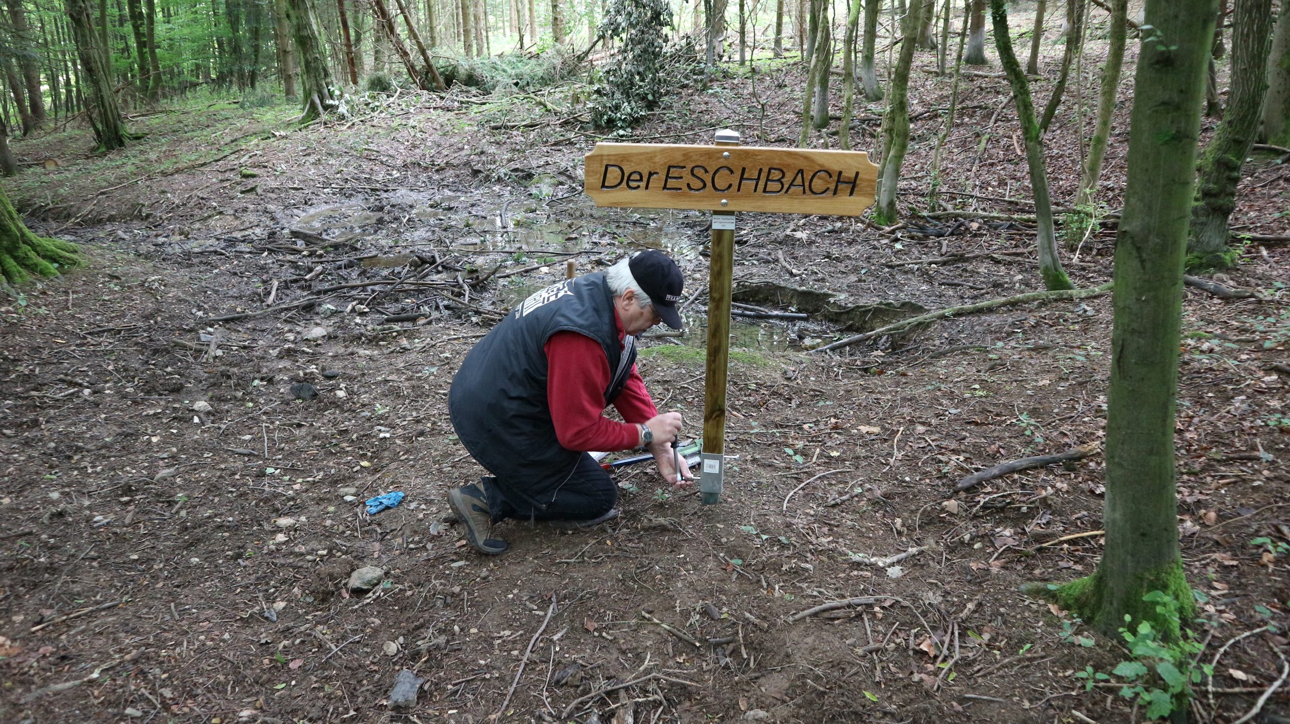Vom neuen Wasserwerk aus im Maibacher Weg wanderte die Gruppe über die Eschbacher Klippen zum Brandoberndorfer Weg, vorbei am Saienstein, dann links dem Grünen Weg etwa 400 m folgend, um dann wieder links auf den Wald Pfad zur Quelle abzubiegen. Nach 80-100 m erreichte die Vereinsgruppe die Quelle. Mitten im Wald gelegen, trafen sie auf eine etwa 12 qm große, nasse Vertiefung, in der sich nachts die Wildschweine suhlen. Am oberen Rand des Beckens tritt frisches, kristallklares Wasser aus einem kreisförmigen Loch aus (360 Höhenmeter). Die Mitglieder staunten nicht schlecht, als sie das neue Holzschild „Der Eschbach“ erblickten. Am gleichen Samstagmorgen hatten Ortwin Ruß und Ronny Löw das in Gemeinschaftsarbeit mit Gerd Becker gefertigte Holzschild aufgestellt. Dafür ein Dankeschön, sowie auch ein Dank an Förster Karl-Matthias Groß für die Aufstellgenehmigung.
