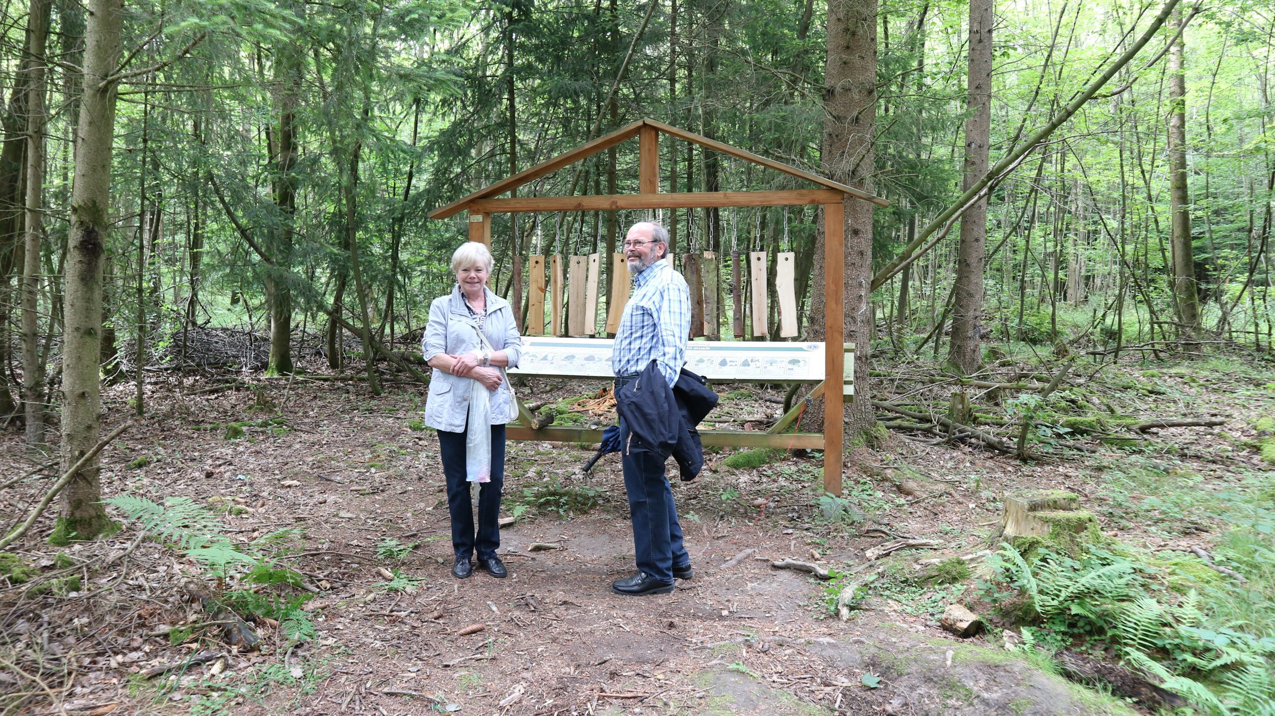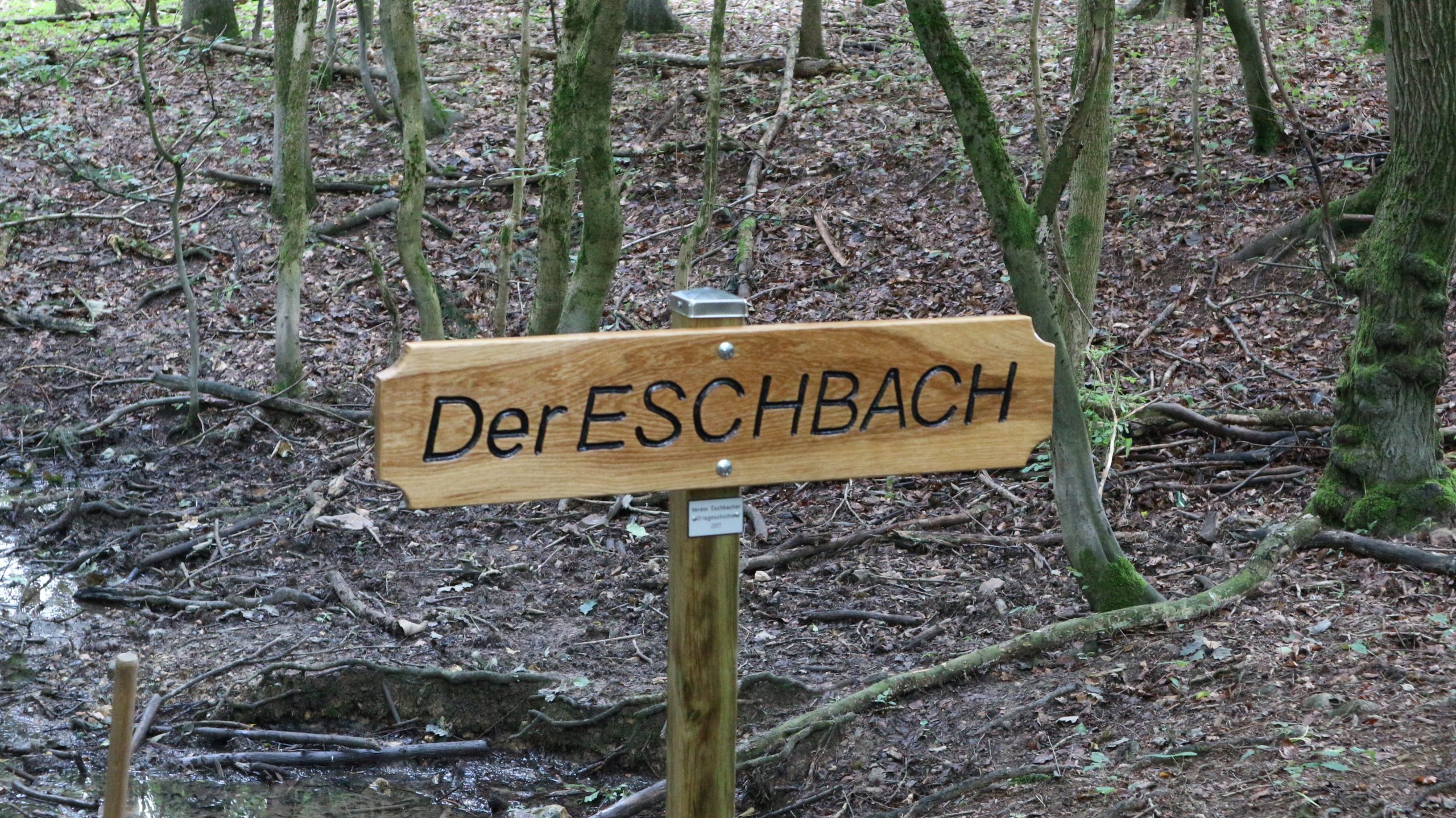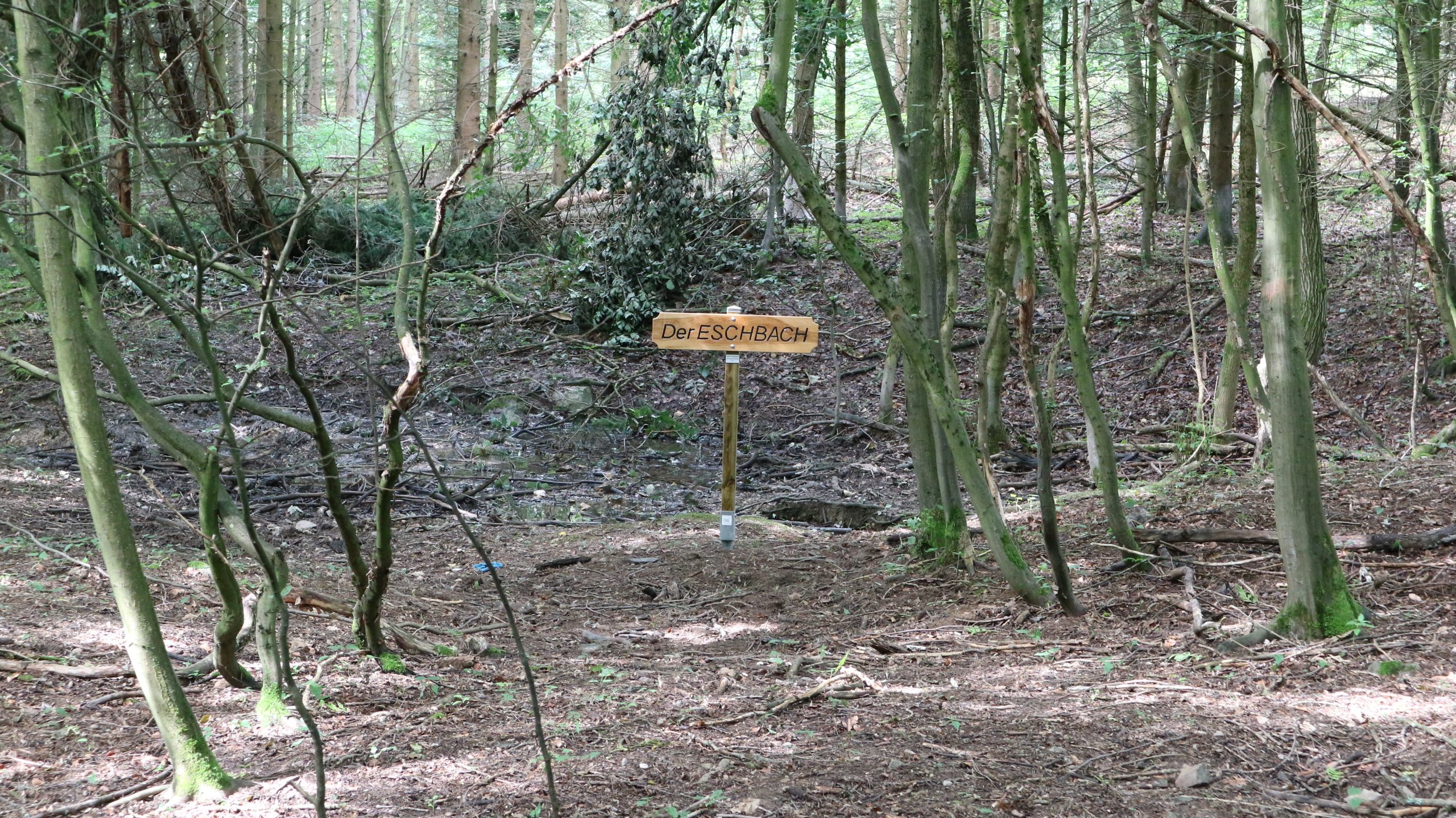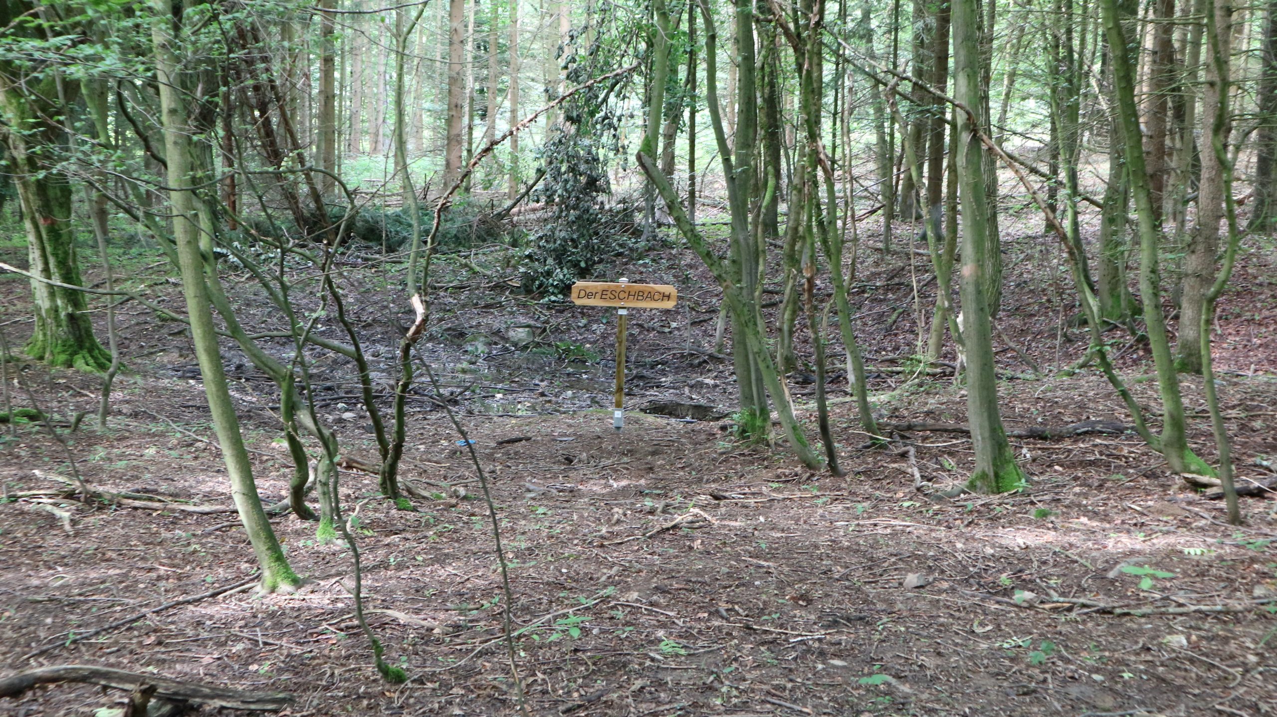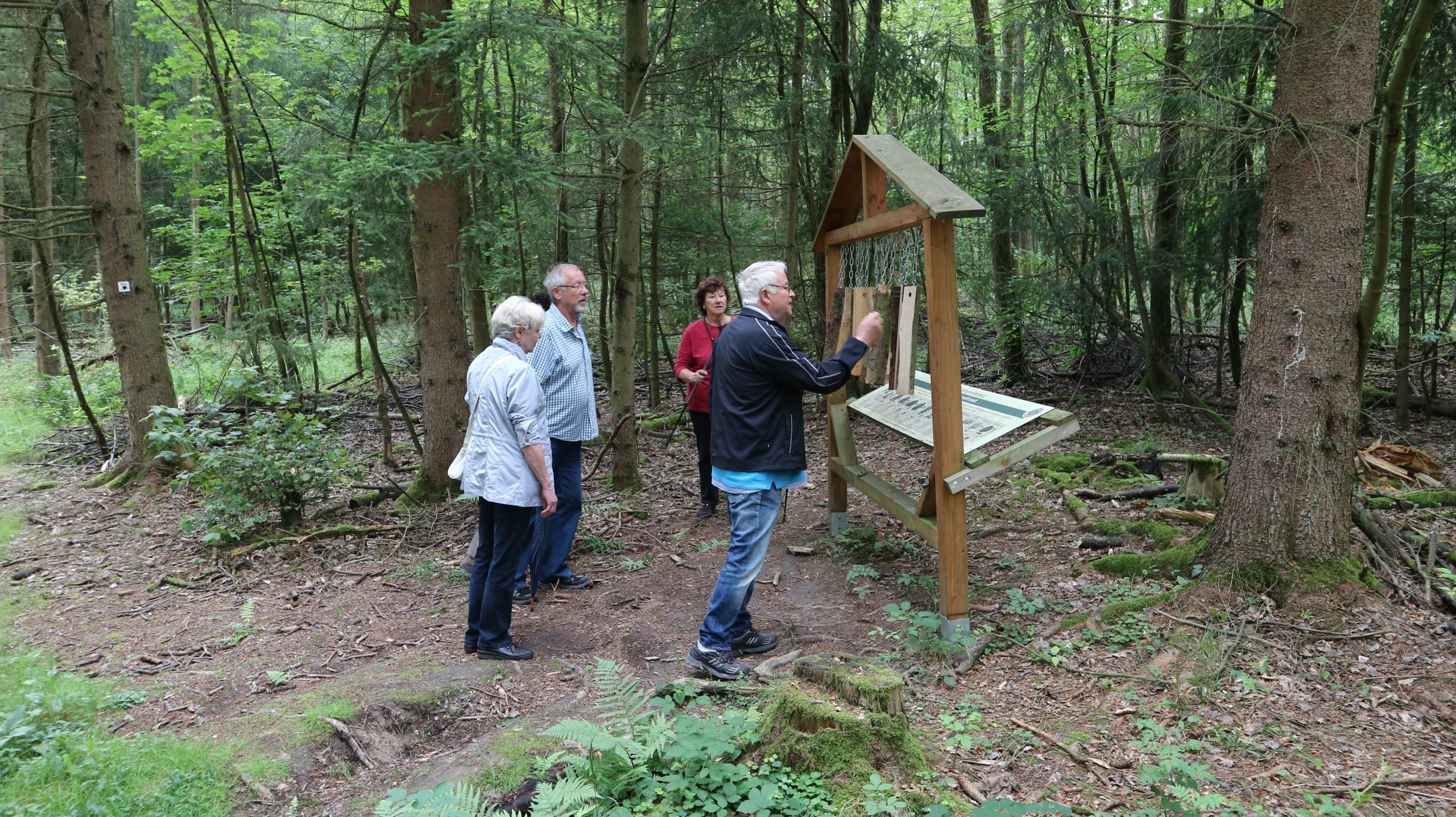 Vom neuen Wasserwerk aus im Maibacher Weg wanderte die Gruppe über die Eschbacher Klippen zum Brandoberndorfer Weg, vorbei am Saienstein, dann links dem Grünen Weg etwa 400 m folgend, um dann wieder links auf den Wald Pfad zur Quelle abzubiegen. Nach 80-100 m erreichte die Vereinsgruppe die Quelle. Mitten im Wald gelegen, trafen sie auf eine etwa 12 qm große, nasse Vertiefung, in der sich nachts die Wildschweine suhlen. Am oberen Rand des Beckens tritt frisches, kristallklares Wasser aus einem kreisförmigen Loch aus (360 Höhenmeter). Die Mitglieder staunten nicht schlecht, als sie das neue Holzschild „Der Eschbach“ erblickten. Am gleichen Samstagmorgen hatten Ortwin Ruß und Ronny Löw das in Gemeinschaftsarbeit mit Gerd Becker gefertigte Holzschild aufgestellt. Dafür ein Dankeschön, sowie auch ein Dank an Förster Karl-Matthias Groß für die Aufstellgenehmigung.
