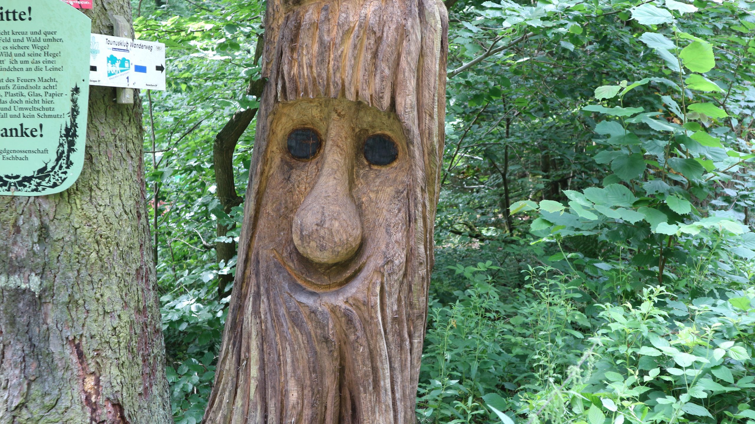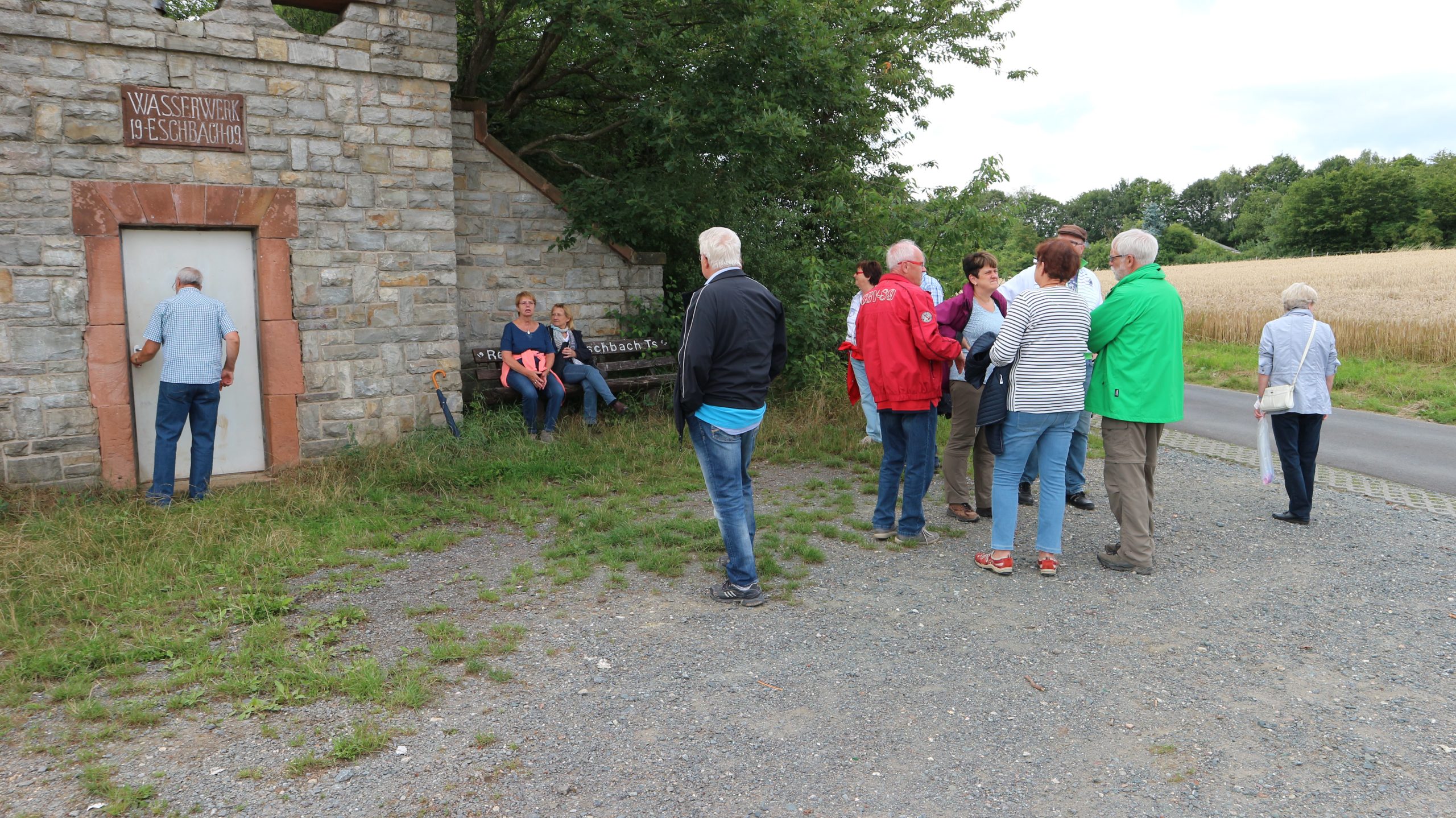 Zurück auf dem Grünen Weg wanderte die Gruppe vorbei am hölzernen Xylophon und der „Höreule“ (kleine Überraschungen für Wanderer mit Kindern, von Förster Karl-Matthias Groß aufgestellt) über den Campingplatz Richtung Eschbach. Mit dem Auge dem Bachlauf durch die Wiesen folgend ging der Weg zum „Alten Wasserwerk, was 1909 erbaut wurde. Hier hatten alle die Gelegenheit, einen Blick in das Innere des Werkes zu werfen und sich von Ortwin Ruß die frühere Eschbacher Wasserversorgung erklären zu lassen. Dem Eschbach folgend ging es weiter in die Eichelgasse, wo der Eschbach letztlich im Rohrsystem verschwindet. Ab hier läuft „Der Eschbach“ unterirdisch unter der Bachstraße entlang bis zur Grundgasse. Von dort aus fließt er weiter durch Usinger Gemarkung (Essigbrücke), um dann bei der Schlappmühle in die Usa zu münden. Von der Quelle bis zur Usa sind es ca. 5 km. „Der Eschbach“ aber hat noch eine lange Reise vor sich! Vereint mit der Usa fließt er weiter zur Wetter – zur Nidda – zum Main – und schließlich zum Rhein, der dann als großer Strom nordwestlich von Leiden, 18 km vor Den Haag in den Niederlanden in die Nordsee mündet.