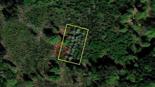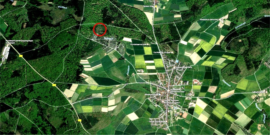 Nun erklärte Ronny Löw den Mitgliedern noch, welche Bedeutung der gegenüberliegende Waldabschnitt hat. Nach Recherchen und Gesprächen mit Altförster Adolf Günther und aus den Erinnerungen von Gerd Becker an die Erzählungen seines Vaters, hatte Ronny herausgefunden, dass dieser Ort an der Quelle um die Jahrhundertwende der „Alte Eschbacher Festplatz“ war. Auf einer Luftaufnahme kann man heute noch die Anordnung der damals gepflanzten Eschen und Buchen deutlich erkennen. Nur noch ganz wenig Eschbacher wissen um diesen Festplatz.