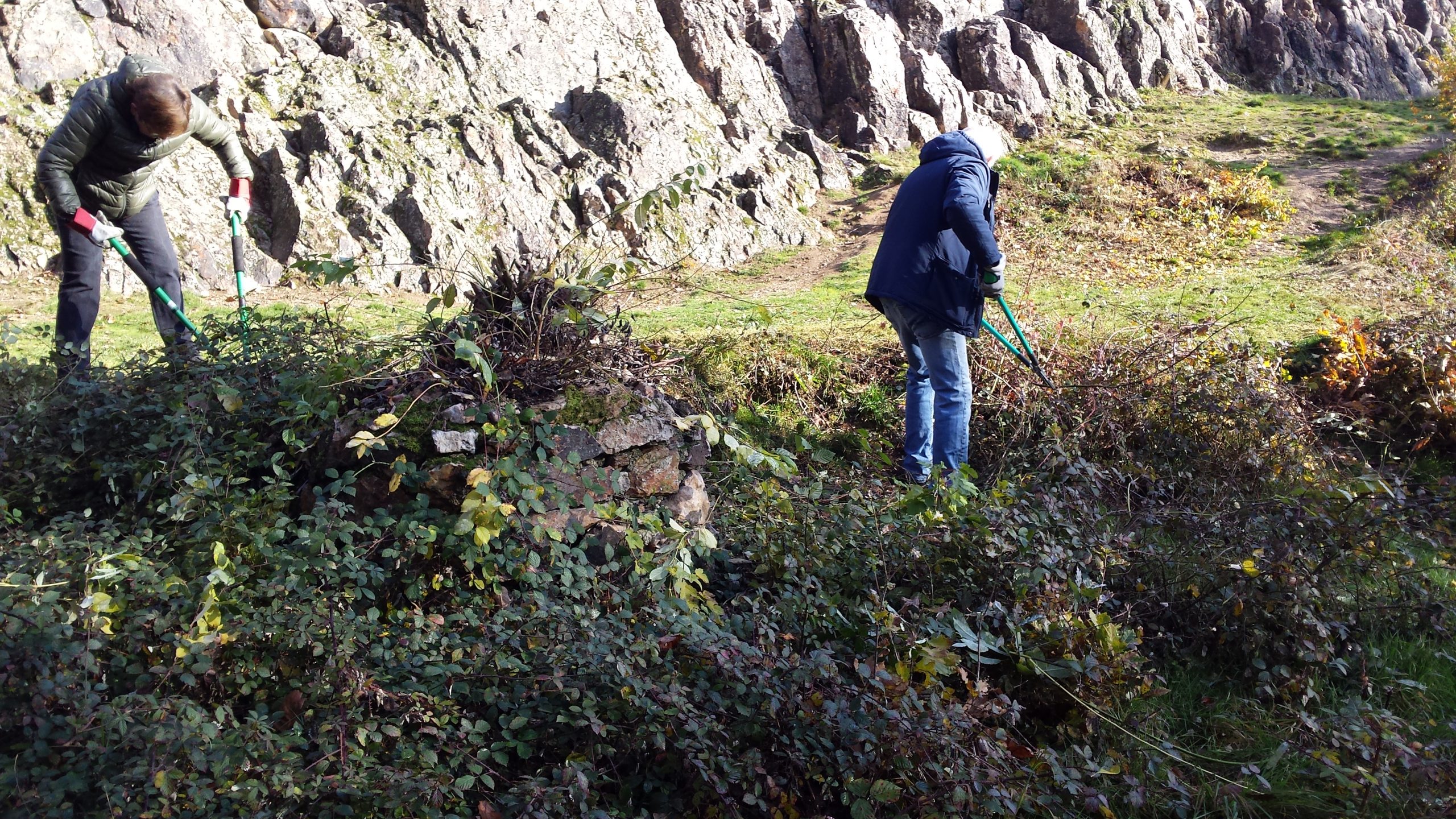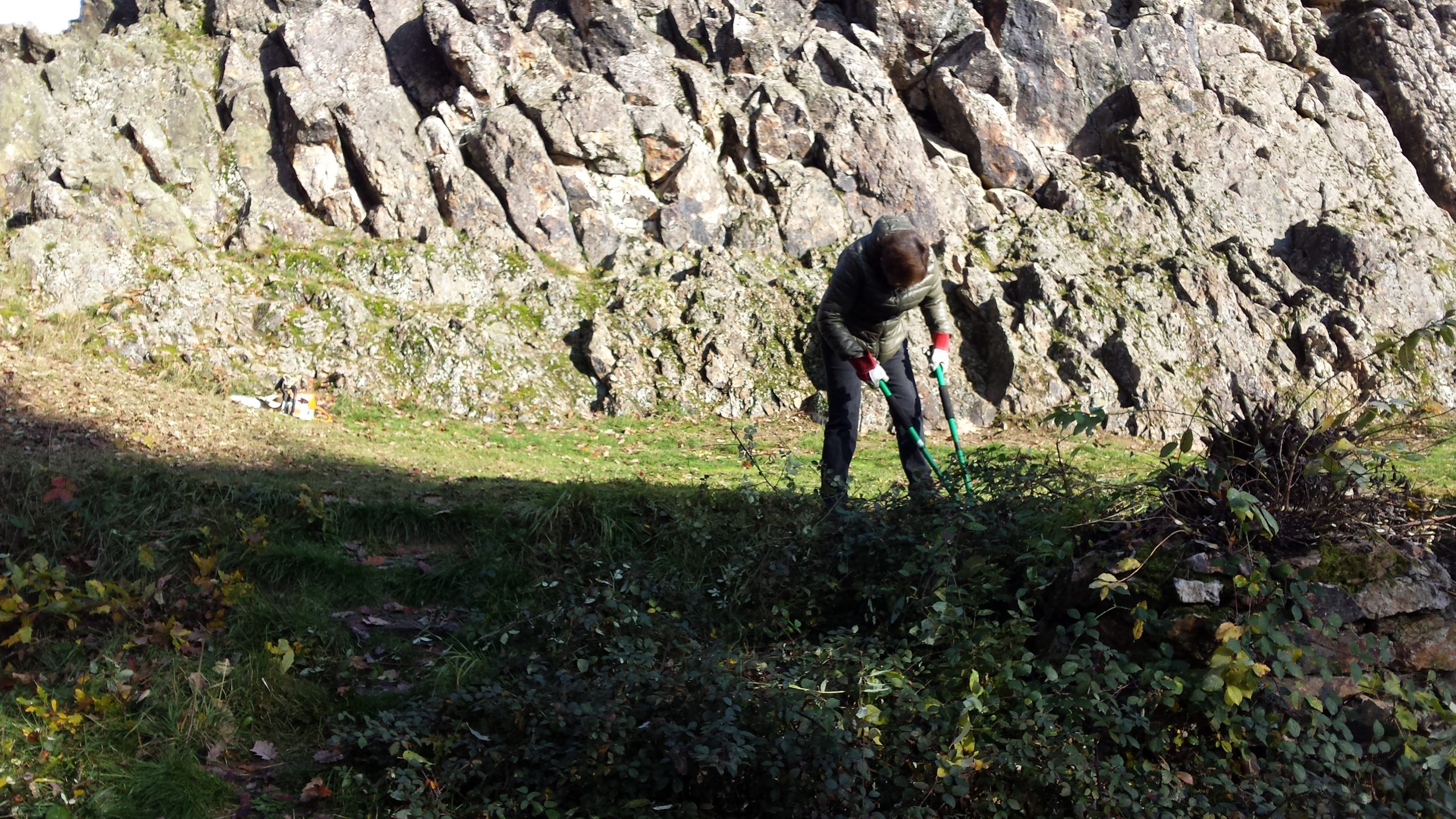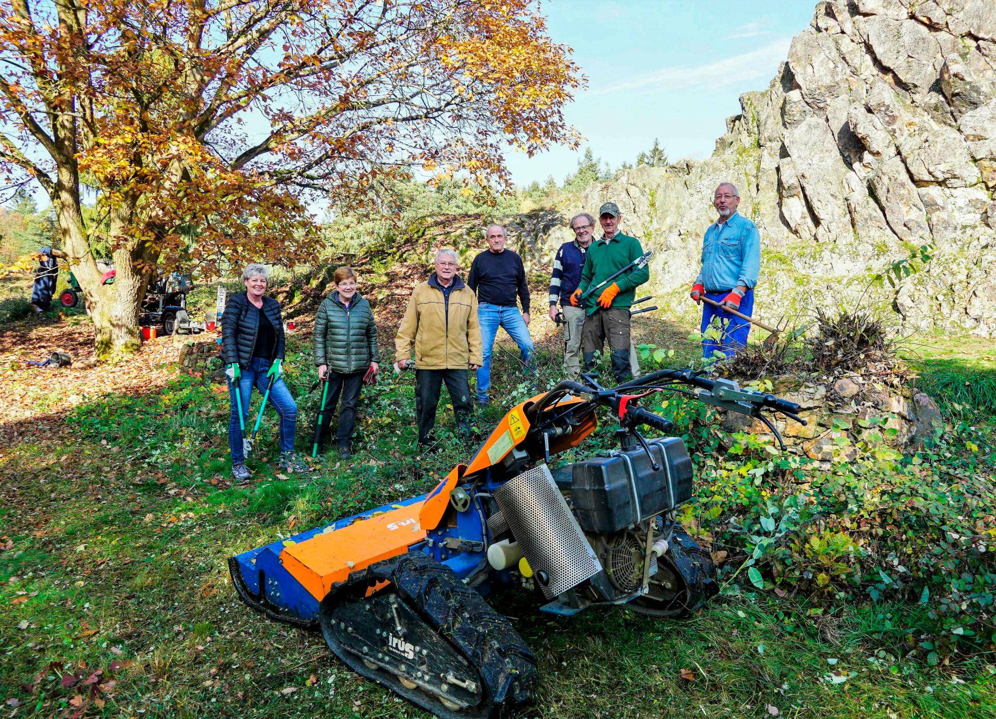 Heckenrosen und Brombeerhecken wurden gekürzt, junge Birken und viele weitere aufstrebende Gehölze auf den Stamm gesetzt, und diverses kleinere Gestrüpp entfernt. Dies alles geschah in Absprache mit dem Forst, dem Naturpark Taunus und dem Alpenverein, die ihrerseits verschiedene Bereiche rund um die Klippen pflegen. Meist geschieht das in einer gemeinsamen Aktion am ersten Novemberwochenende, dieses Jahr jedoch ging der VEO 14 Tage später ans Werk, weil die benötigten Gerätschaften vorher nicht zu bekommen waren. Belohnt wurde der Arbeitseinsatz mit bestem Wetter, sodass man gut gelaunt war und die Arbeit gut voranging. „Es ist ein toller Tag, und es ist ja auch toll, was wir hier machen“, lachte VEO-Vorsitzender Reiner Holl. Mit von der Partie waren außerdem Ortwin Ruß, Arno Wick, Karin Angele, Karlheinz Schmidt sowie Renate und Egbert Ruß. Christa Klieber, Marion Schork und Susi Löw sorgten indessen für das leibliche Wohl der Arbeitskräfte.