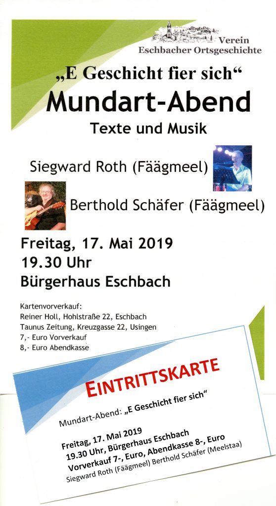 Am 17. Mai 2019 veranstaltete der Verein Eschbacher Ortsgeschichte wieder einen bunten Abend. Dazu traten Siegward Roth und Berthold Schäfer (beide bekannt durch “Fäägmeel”) im Bürgerhaus Eschbach auf. Siegward Roth reiste dazu eigens aus München an, um hier eine Lesung aus seinen zwei Büchern zu halten. Berthold Schäfer, Gründer von “Meelstaa” begeisterte das Publikum mit seinen mittelhessischen Liedern. So durfte auch die “Rure Roiwe Ropp Maschin” bei seiner musikalischen Darbietung nicht fehlen.