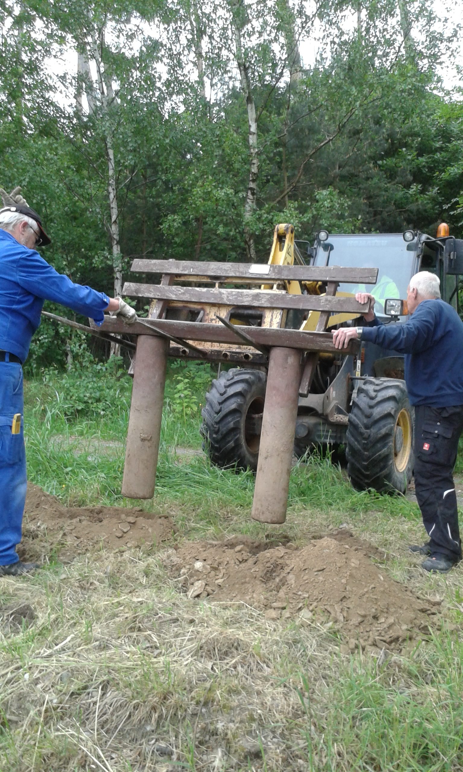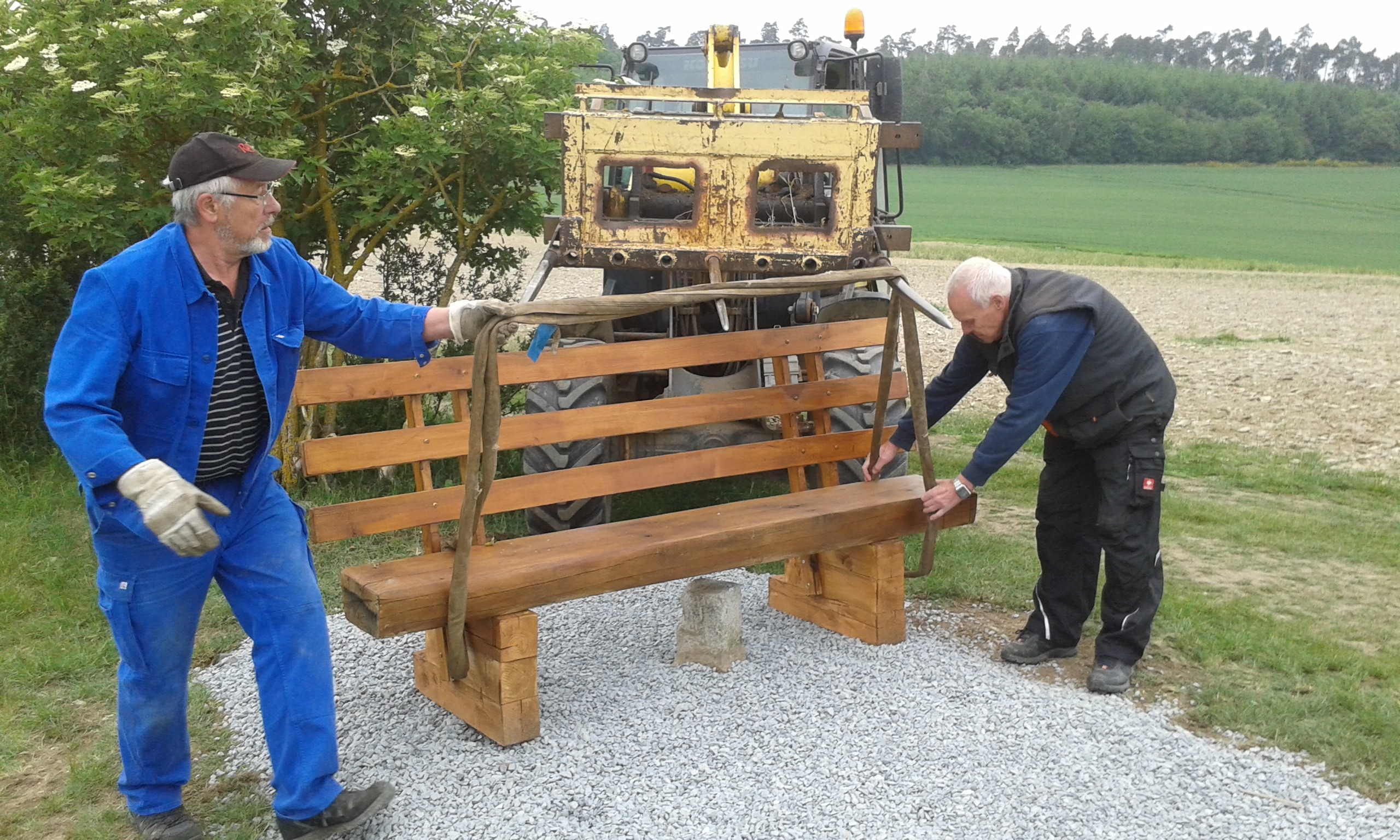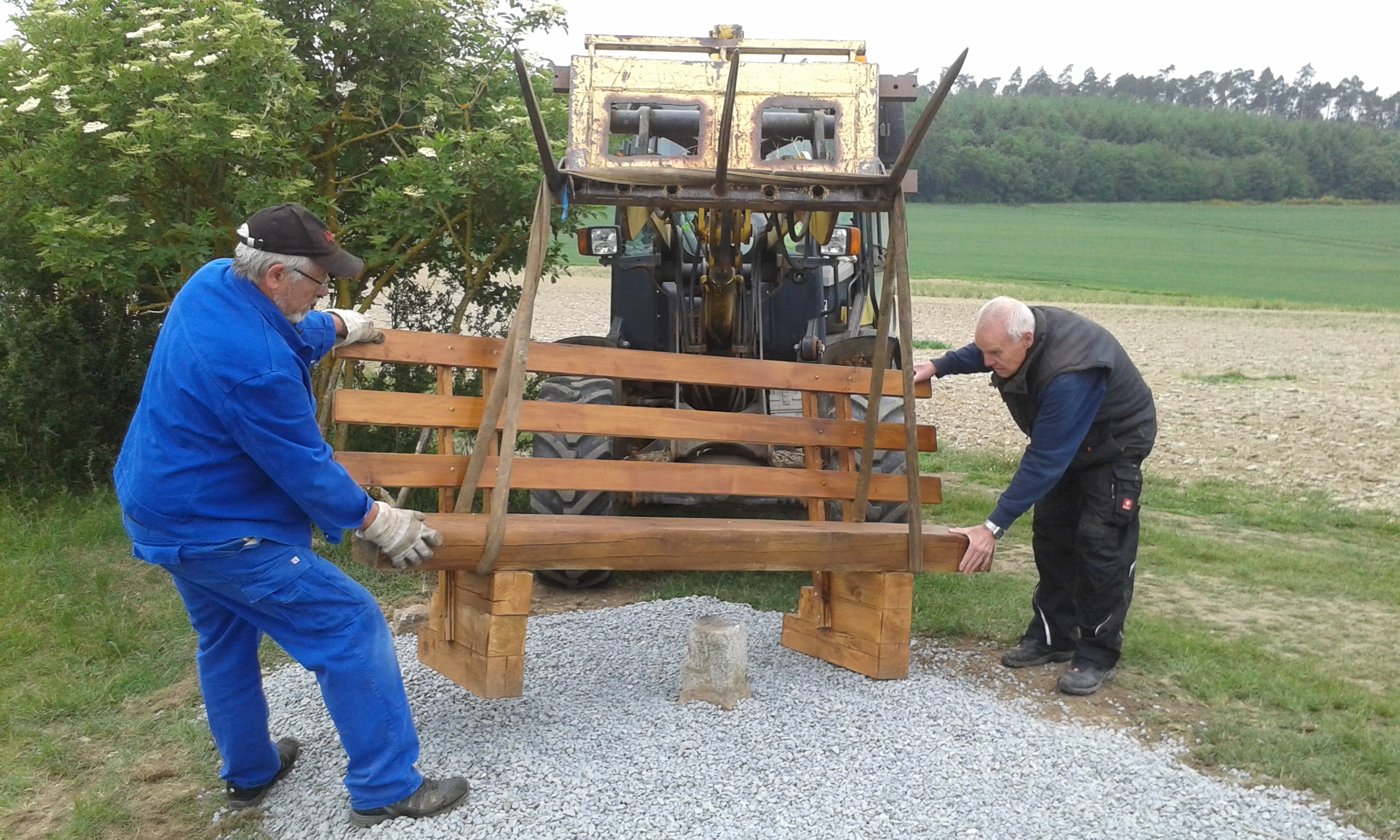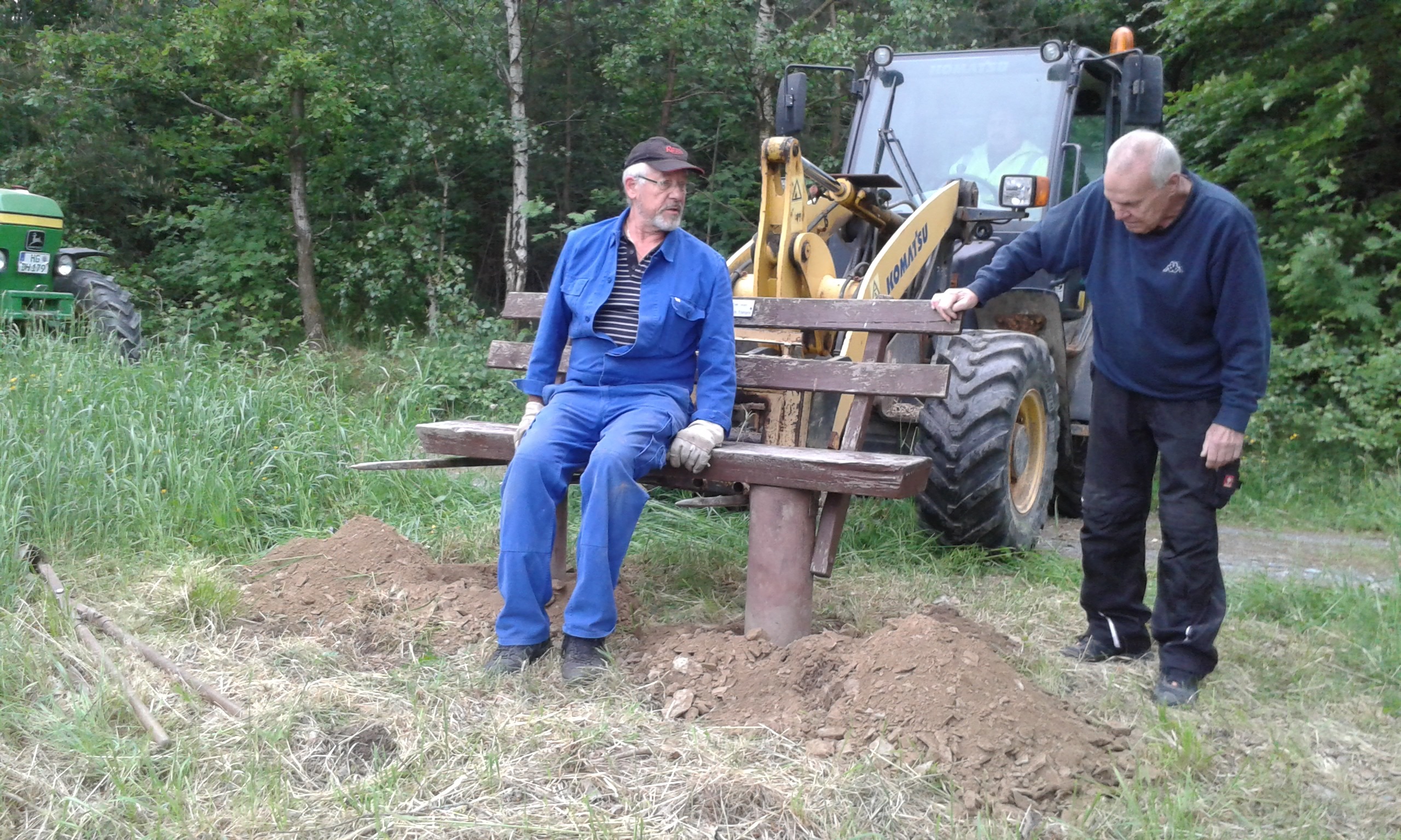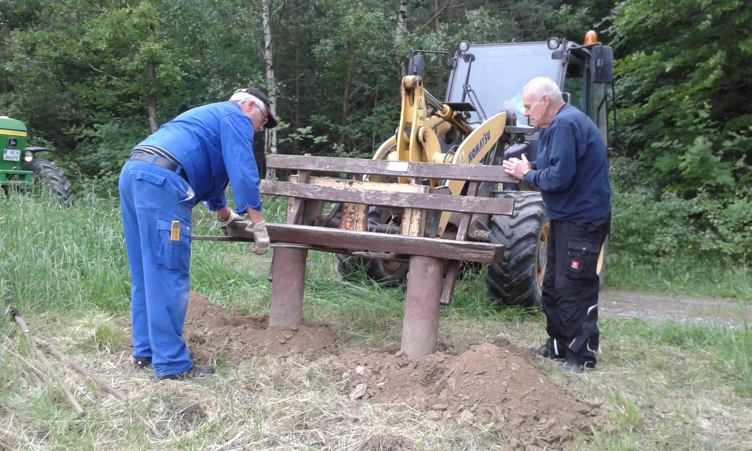 Freitag morgens um 09:00 Uhr holte Ortwin Ruß seinen Vereinskollegen Ronny Löw mit seinem Vehikel ab um auf dem Pfaffenkopf die Stelle für die neue Sitzgruppe vorzubereiten. Hierzu wurde die noch alte Ruhebank mit Hilfe von Hans-Jörg Scheidler und seinem Radlader ausgegraben und auf die Michelbacher Waldseite transportiert. Hier wurden zwei 60 cm tiefe Löcher mittels eines hydraulischen Bohrers, den Dietmar Herr mit seinem Traktor bediente, gegraben und die Ruhebank eingelassen. Nach etwa einer Stunde stand die Ruhebank fest am Michelbacher Waldrand und wir konnten nun den Platz der neuen Sitzgruppe aufbereiten.