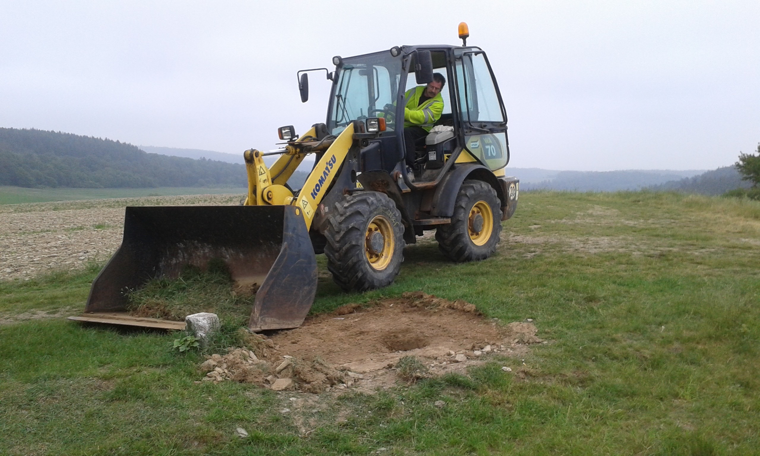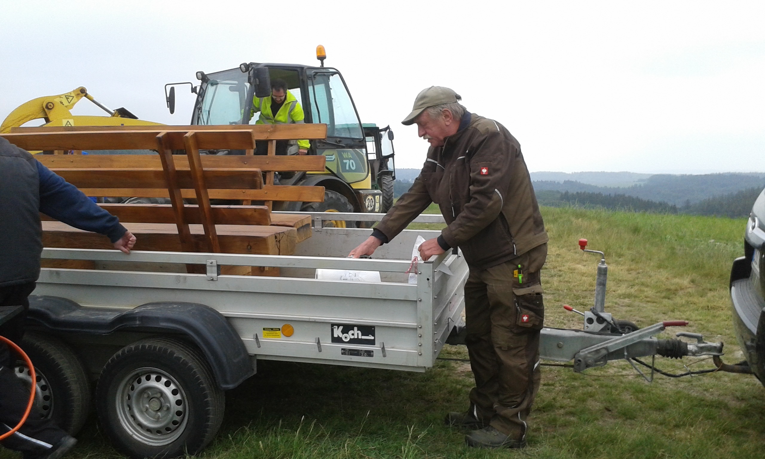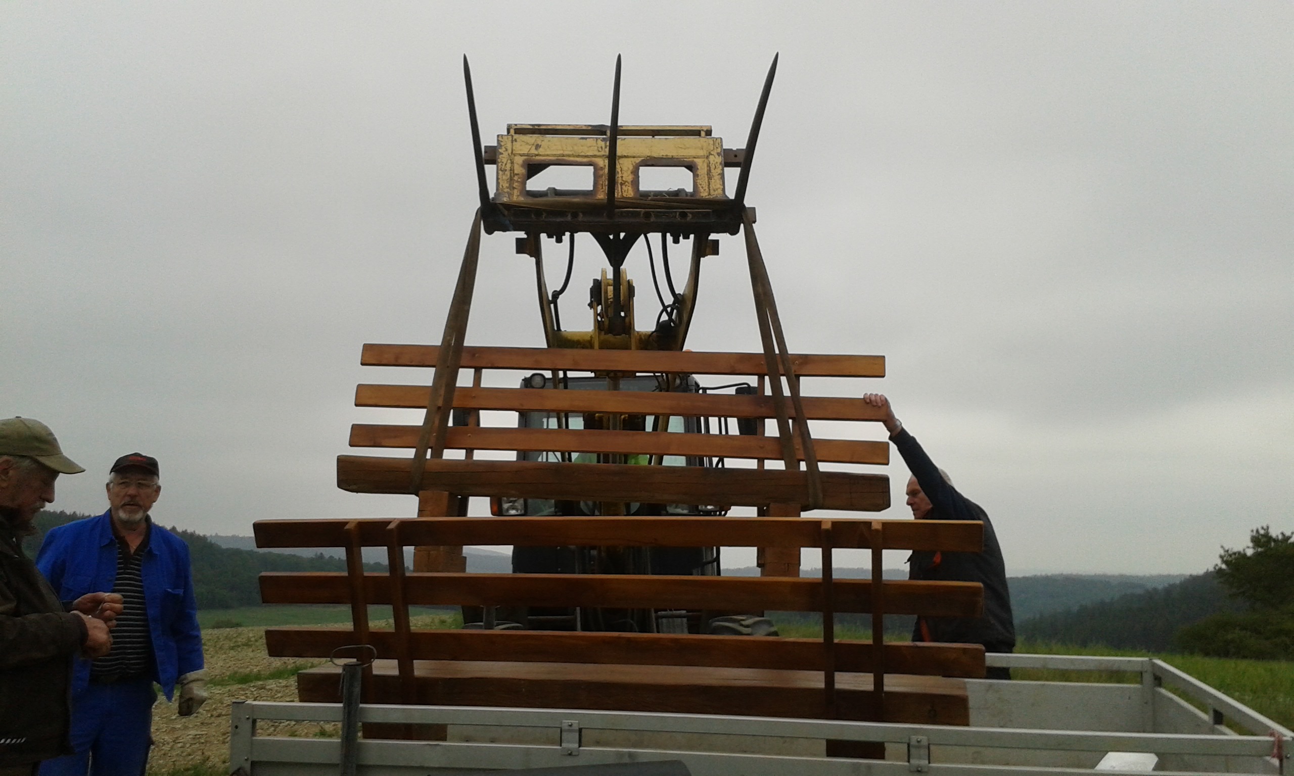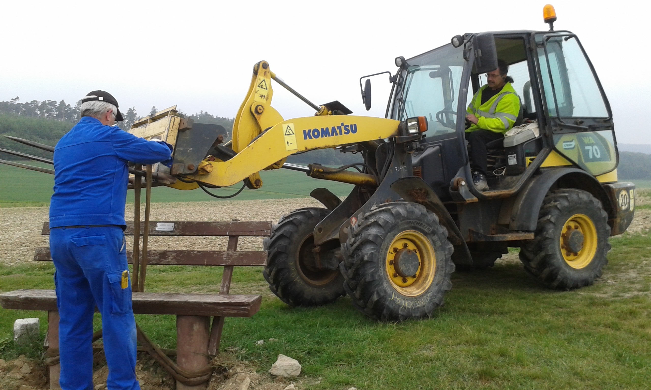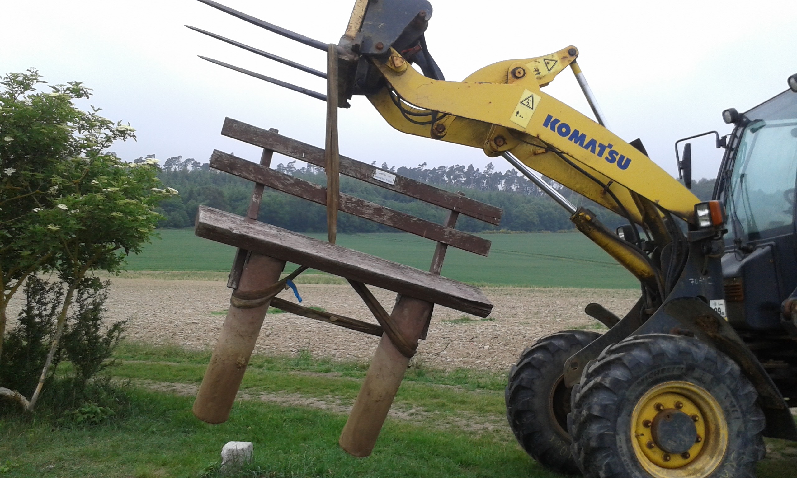 Freitag morgens um 09:00 Uhr holte Ortwin Ruß seinen Vereinskollegen Ronny Löw mit seinem Vehikel ab um auf dem Pfaffenkopf die Stelle für die neue Sitzgruppe vorzubereiten. Hierzu wurde die noch alte Ruhebank mit Hilfe von Hans-Jörg Scheidler und seinem Radlader ausgegraben und auf die Michelbacher Waldseite transportiert. Hier wurden zwei 60 cm tiefe Löcher mittels eines hydraulischen Bohrers, den Dietmar Herr mit seinem Traktor bediente, gegraben und die Ruhebank eingelassen. Nach etwa einer Stunde stand die Ruhebank fest am Michelbacher Waldrand und wir konnten nun den Platz der neuen Sitzgruppe aufbereiten.