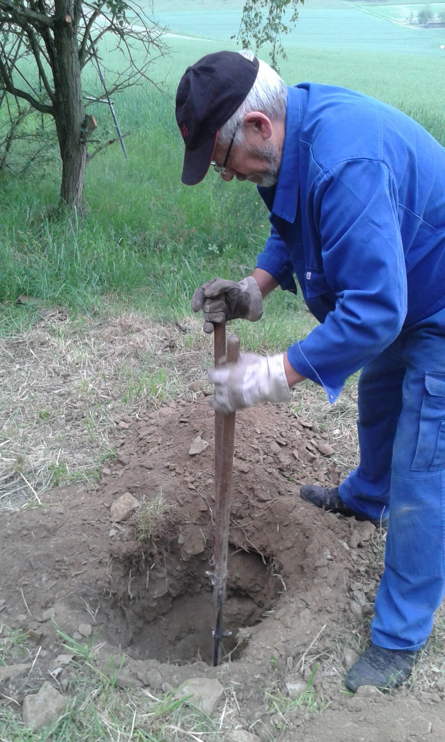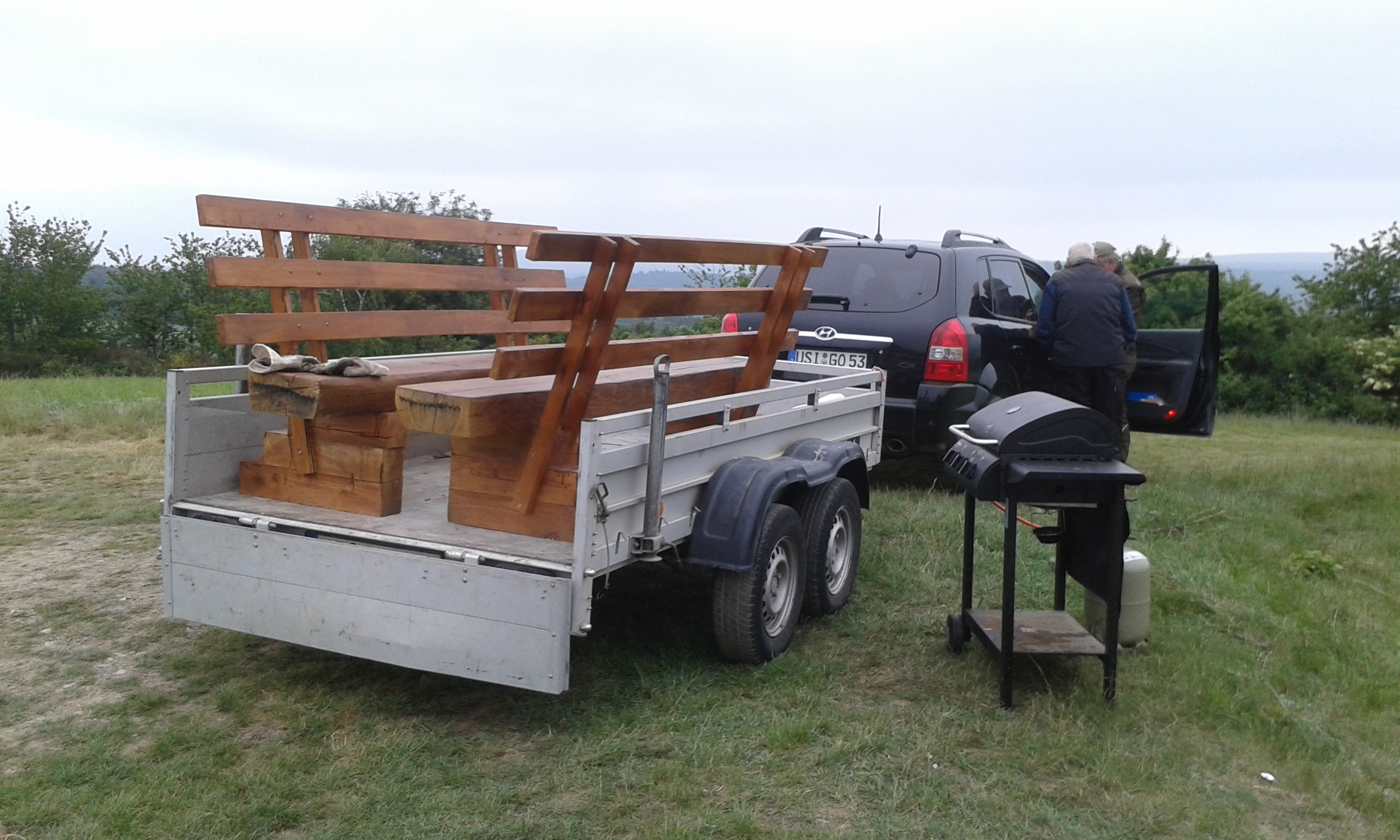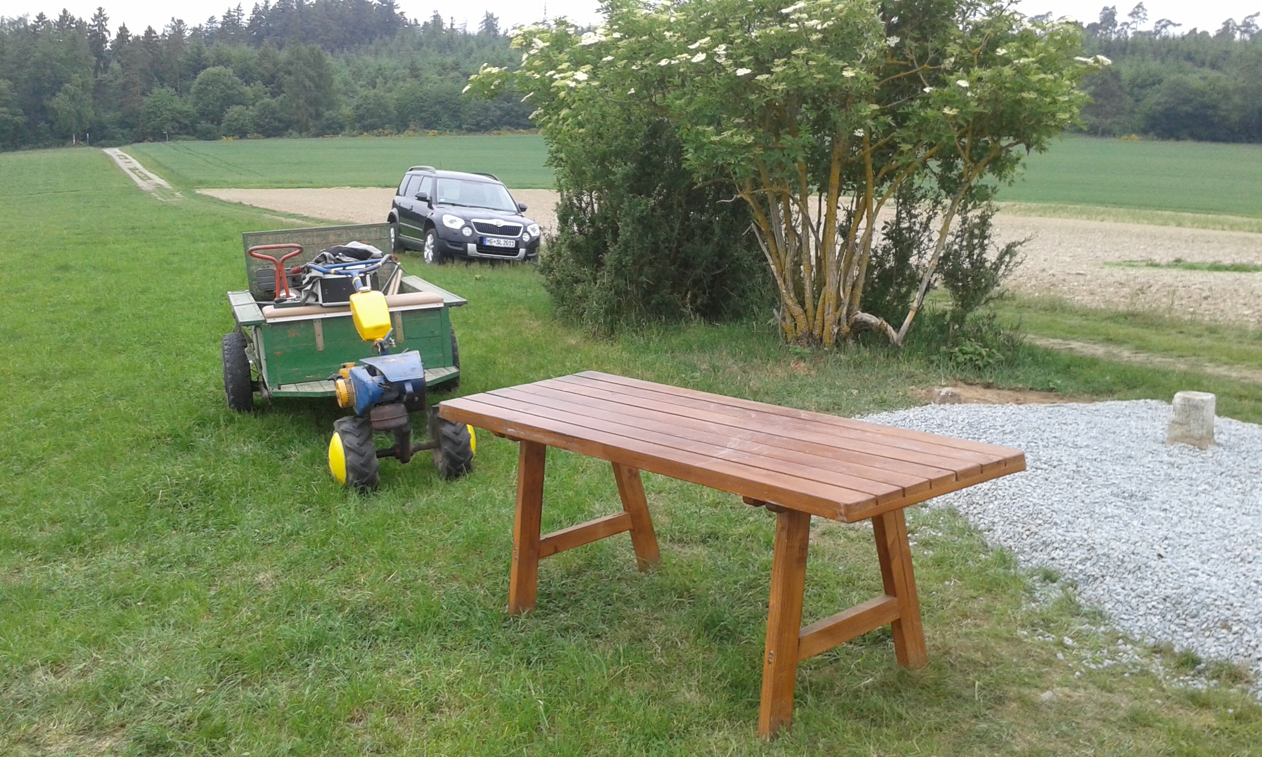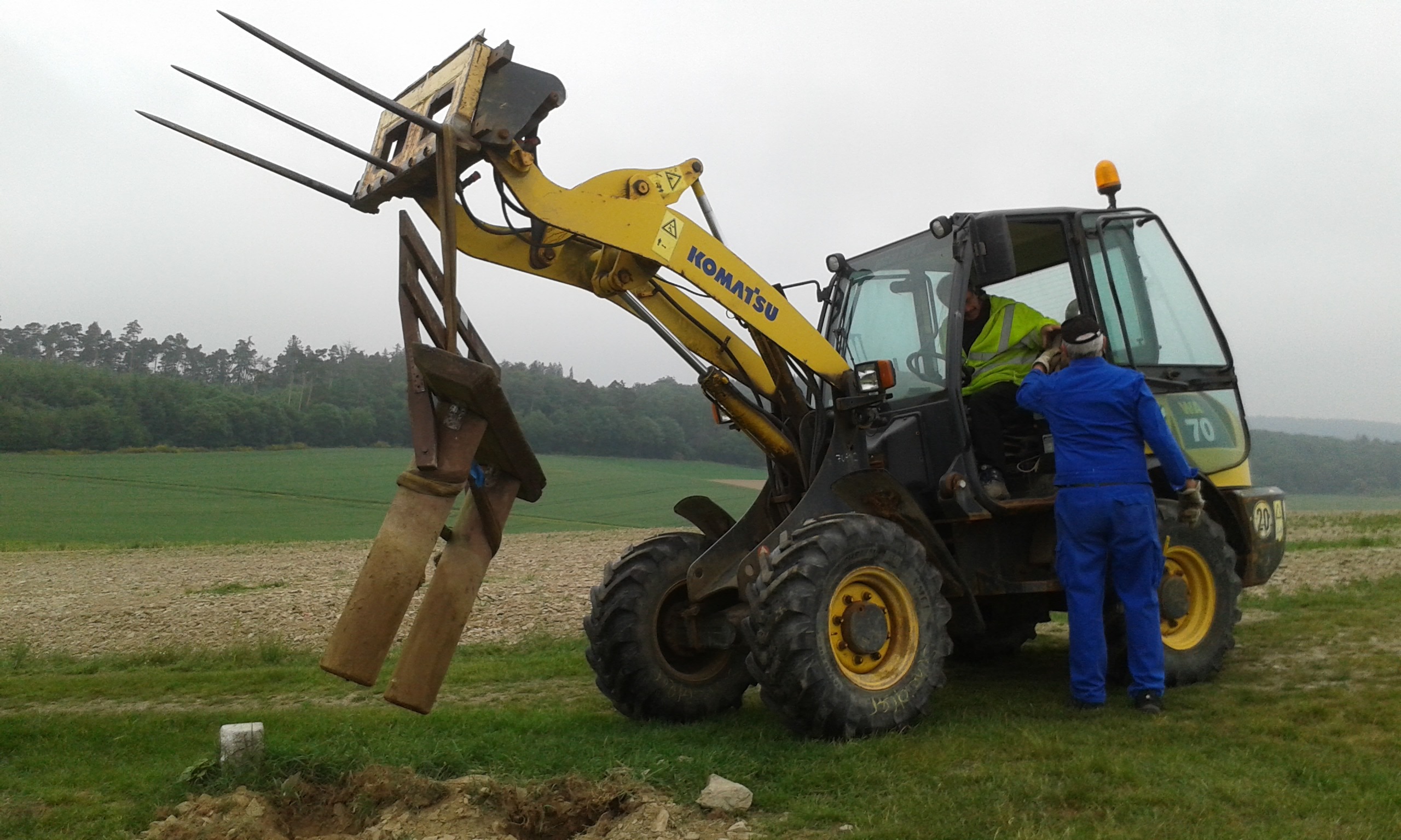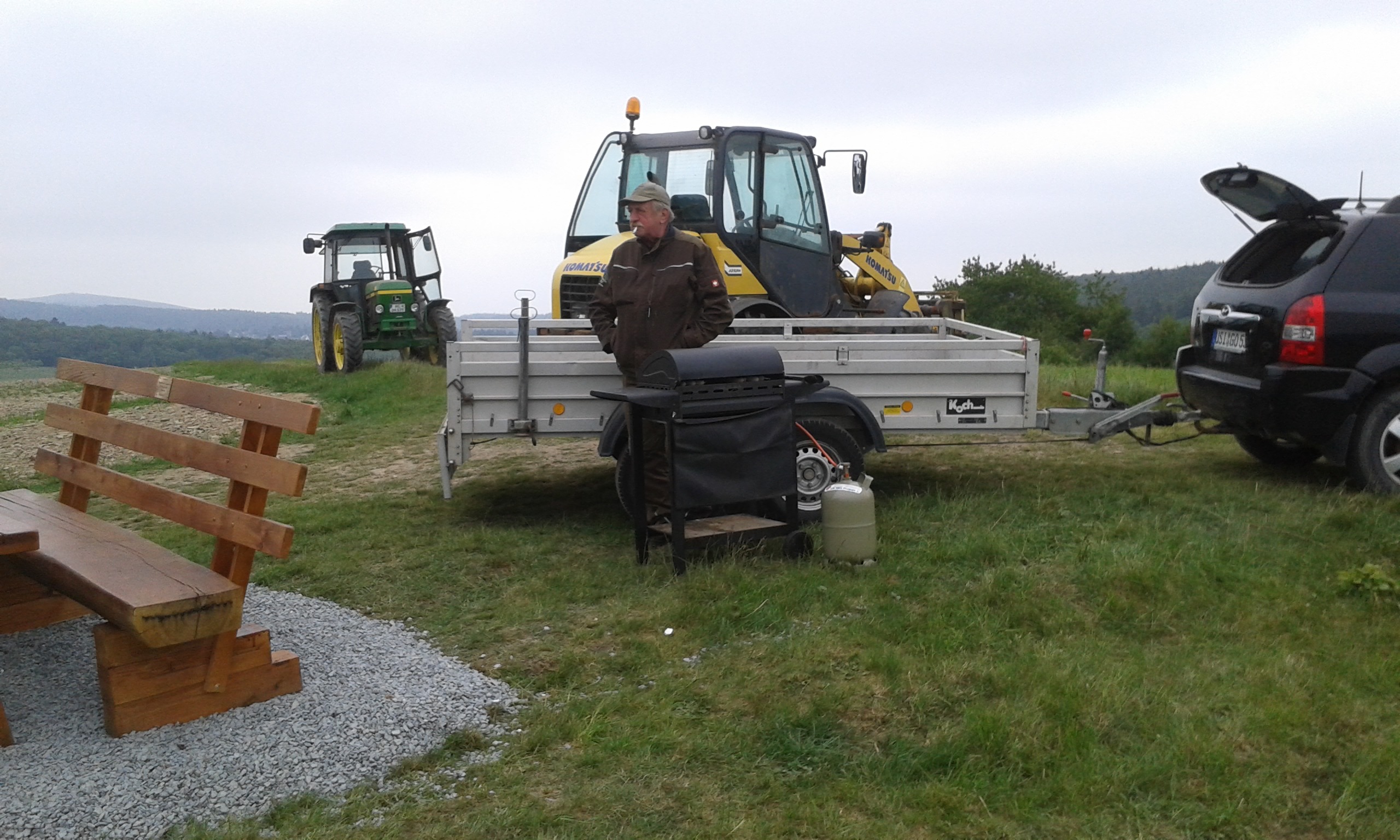 Freitag morgens um 09:00 Uhr holte Ortwin Ruß seinen Vereinskollegen Ronny Löw mit seinem Vehikel ab um auf dem Pfaffenkopf die Stelle für die neue Sitzgruppe vorzubereiten. Hierzu wurde die noch alte Ruhebank mit Hilfe von Hans-Jörg Scheidler und seinem Radlader ausgegraben und auf die Michelbacher Waldseite transportiert. Hier wurden zwei 60 cm tiefe Löcher mittels eines hydraulischen Bohrers, den Dietmar Herr mit seinem Traktor bediente, gegraben und die Ruhebank eingelassen. Nach etwa einer Stunde stand die Ruhebank fest am Michelbacher Waldrand und wir konnten nun den Platz der neuen Sitzgruppe aufbereiten.