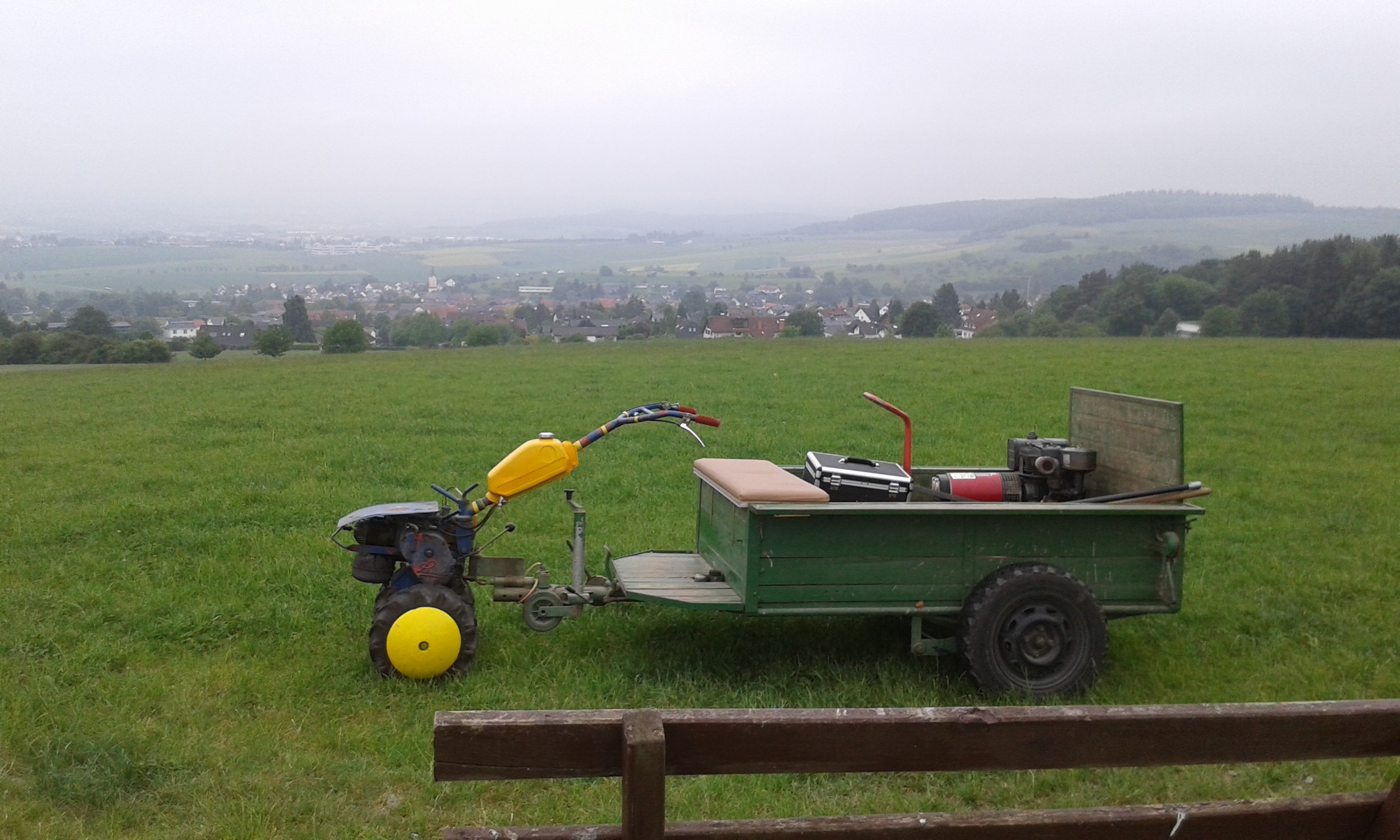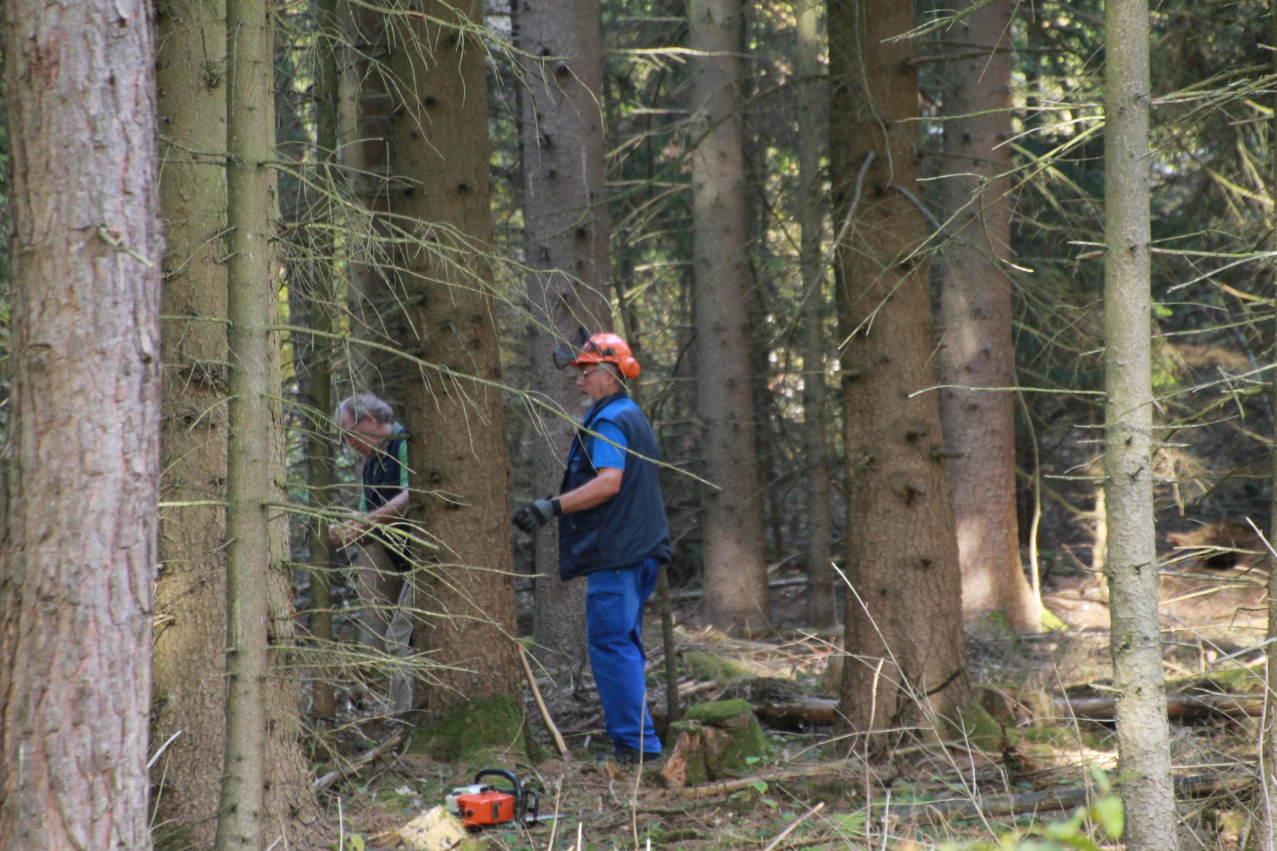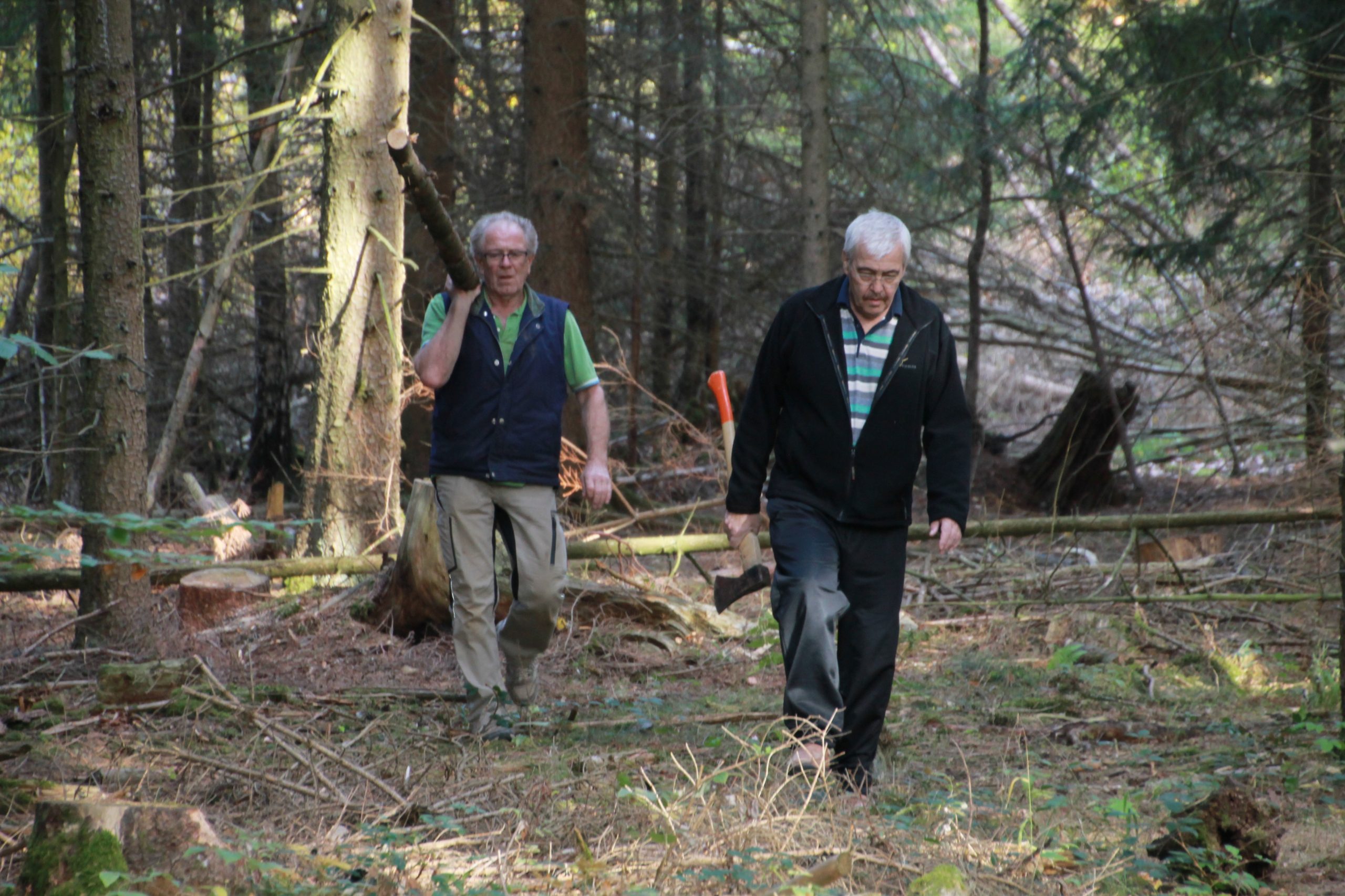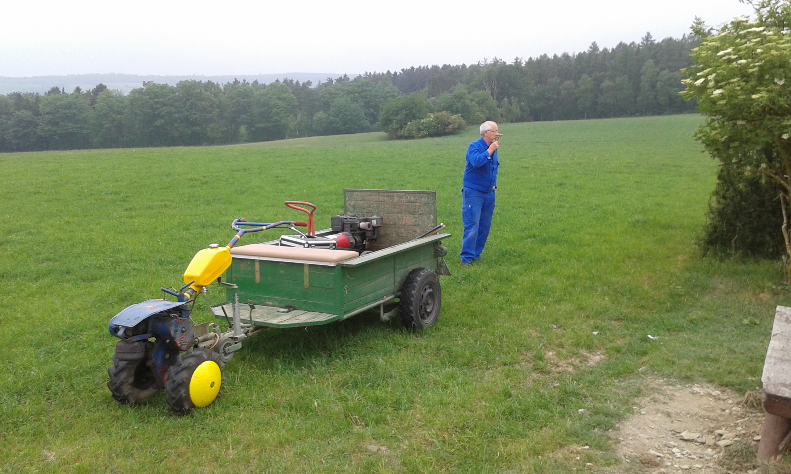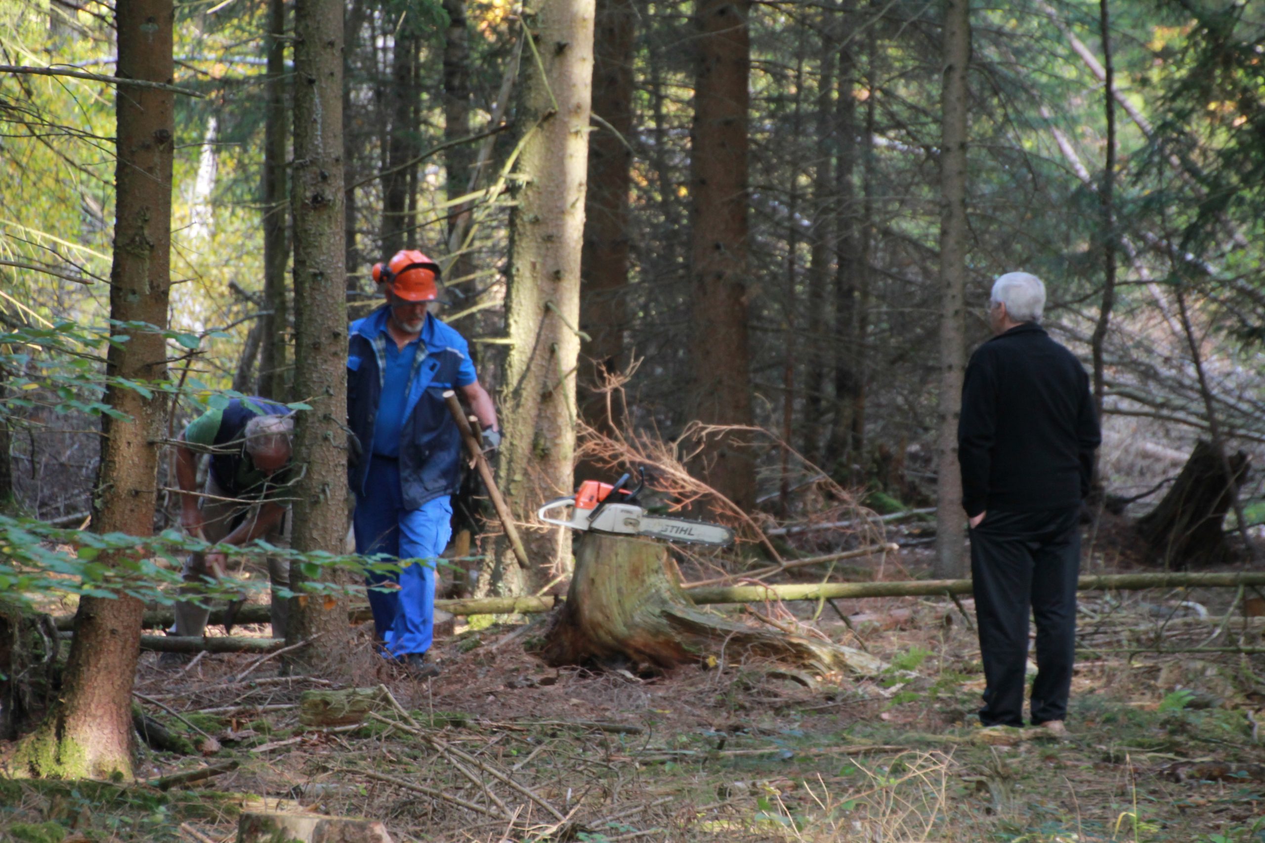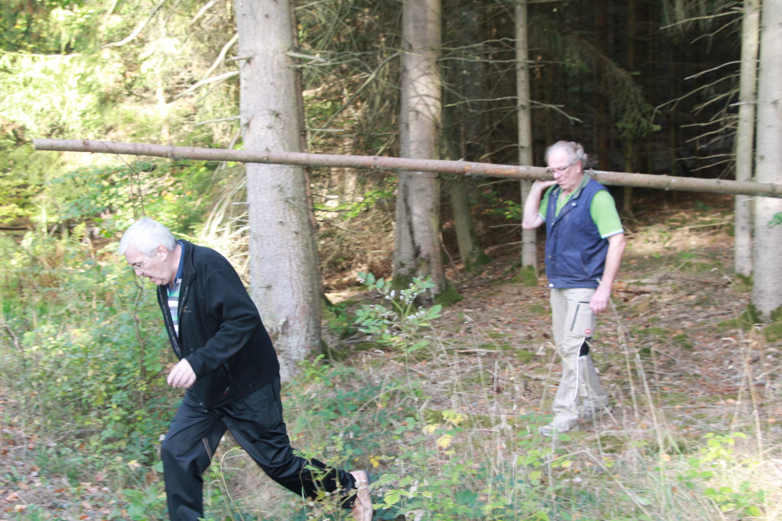 Freitag morgens um 09:00 Uhr holte Ortwin Ruß seinen Vereinskollegen Ronny Löw mit seinem Vehikel ab um auf dem Pfaffenkopf die Stelle für die neue Sitzgruppe vorzubereiten. Hierzu wurde die noch alte Ruhebank mit Hilfe von Hans-Jörg Scheidler und seinem Radlader ausgegraben und auf die Michelbacher Waldseite transportiert. Hier wurden zwei 60 cm tiefe Löcher mittels eines hydraulischen Bohrers, den Dietmar Herr mit seinem Traktor bediente, gegraben und die Ruhebank eingelassen. Nach etwa einer Stunde stand die Ruhebank fest am Michelbacher Waldrand und wir konnten nun den Platz der neuen Sitzgruppe aufbereiten.