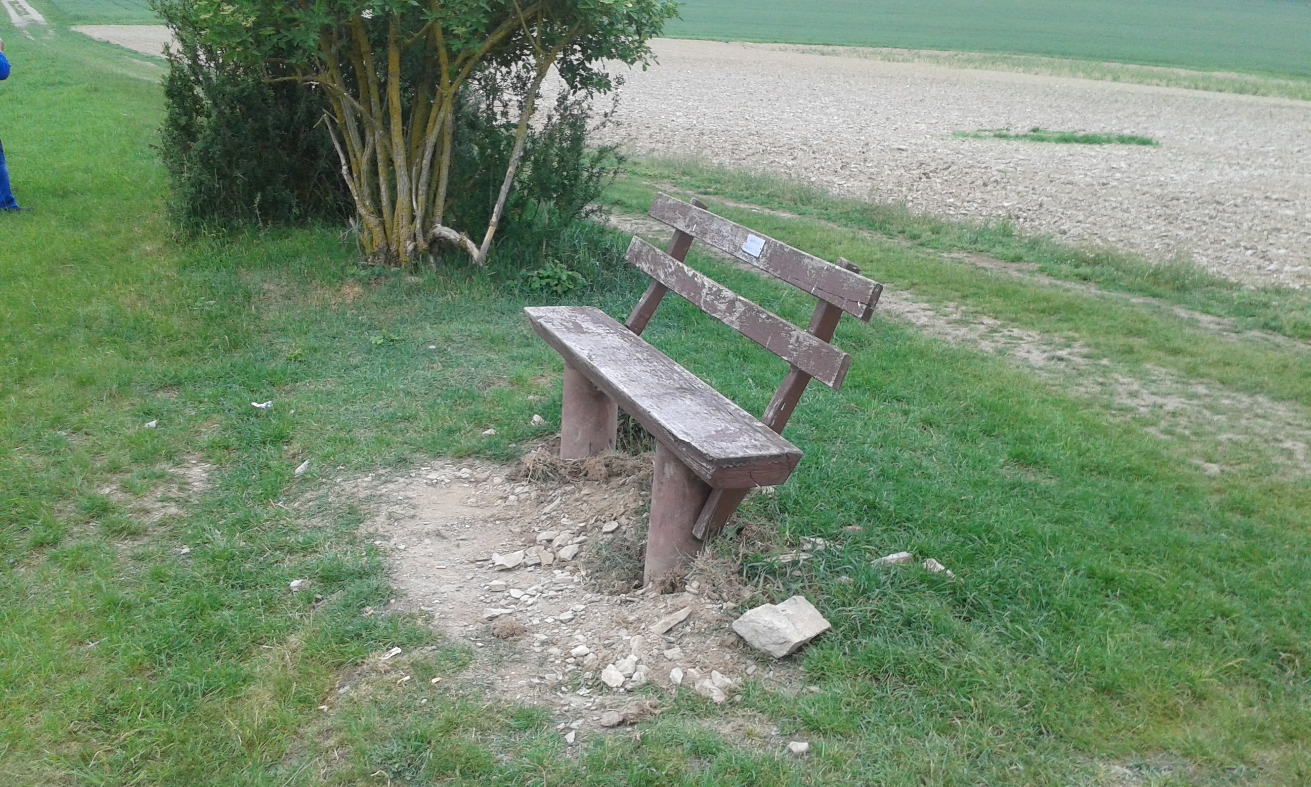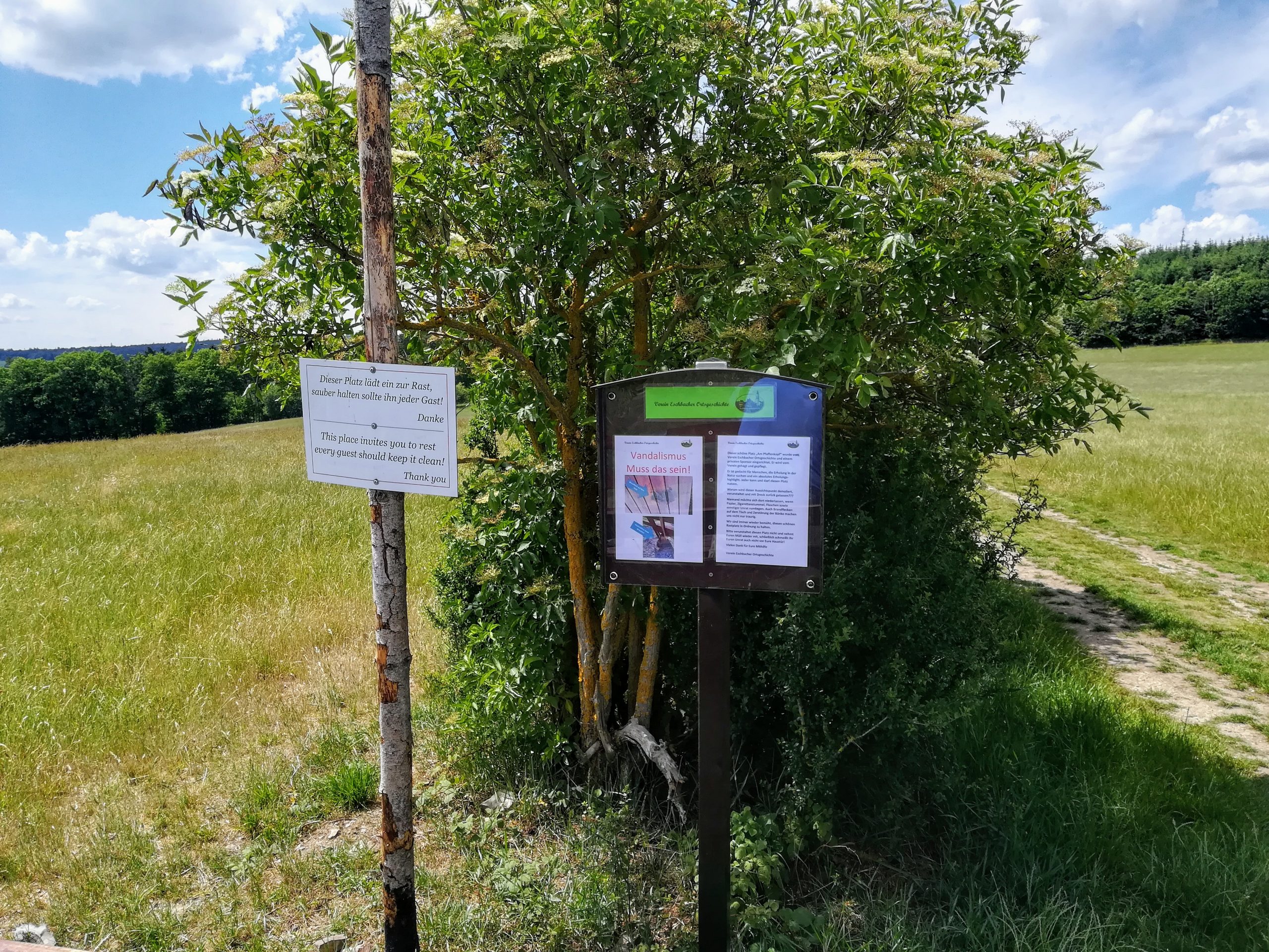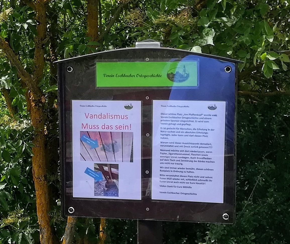 Als Gerd Becker und Reiner Holl auf dem Pfaffenkopf eintrafen, glaubten sie nicht was sie sahen. Einen großen Brandfleck auf dem Tisch! Mit viel Mühe, Arbeit und Geld wurde dieser schöne Rastplatz hergerichtet, umso weniger kann man es verstehen, dass doch recht dumme Menschen mit Mutwillen fremdes Eigentum zerstören. Sollen diese Leute doch ihr eigenes Hab und Gut an zündeln. Dieser Brandfleck ist nicht zu reparieren und so bleibt er für alle, die hier Rasten ein ärgerlicher Schandfleck.