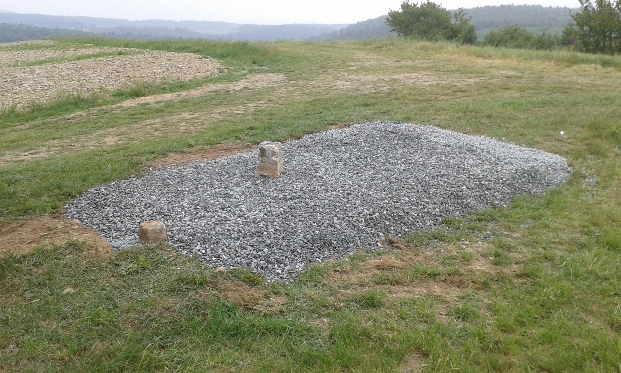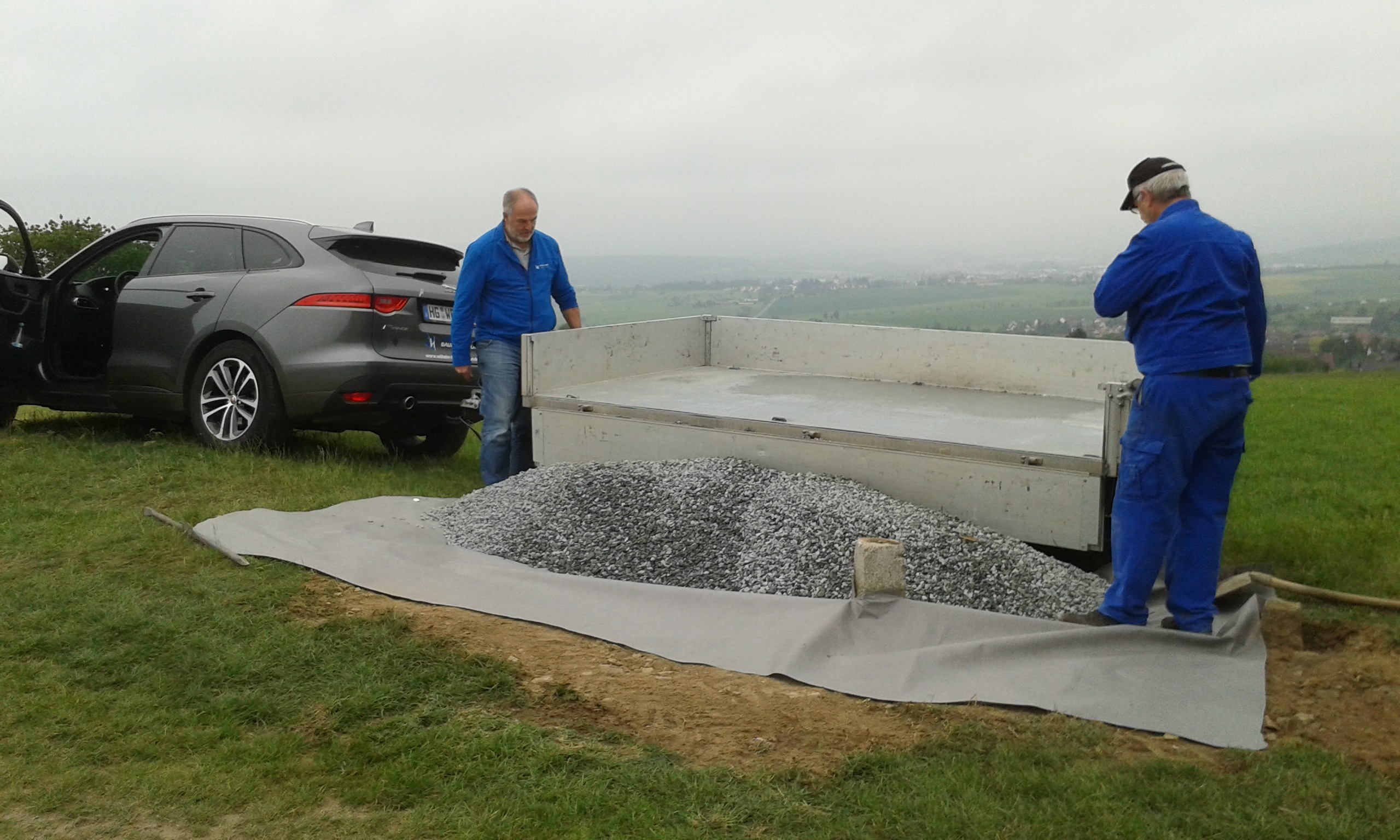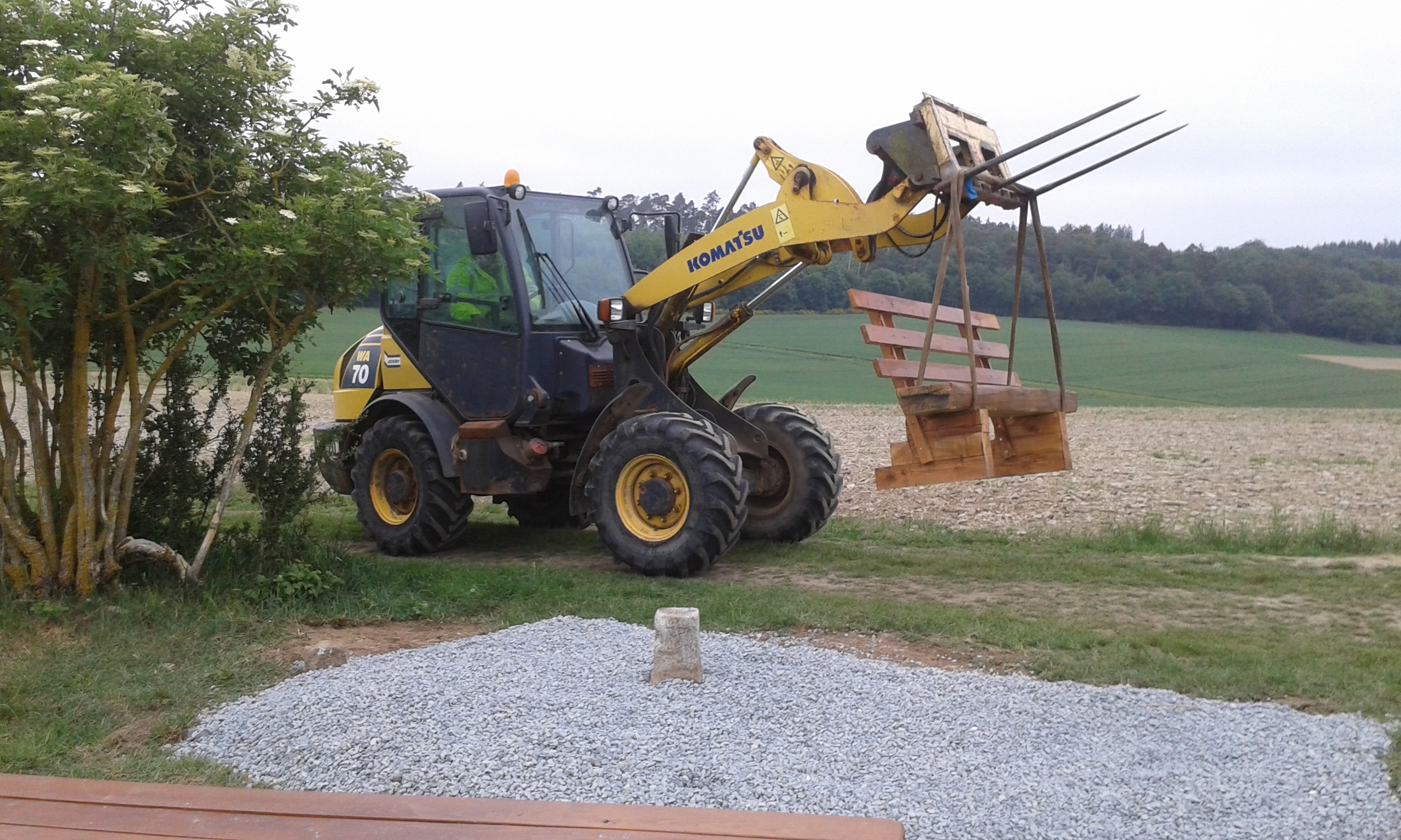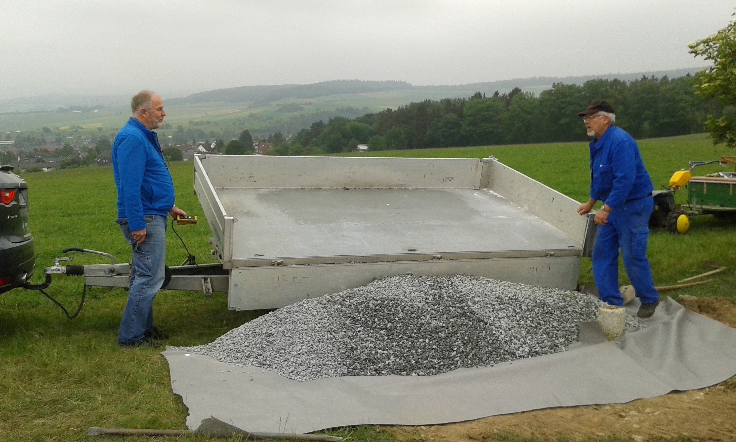 Um etwa 11:00 Uhr lieferte uns Ralf Oldenburg einen Anhänger Schotter den wir mit Hilfe von Hans-Jörgs Radlader planten. Einige Feinarbeiten wurden von Ortwin und Ronny per Hand noch erledigt. Dann hatten wir Pause.