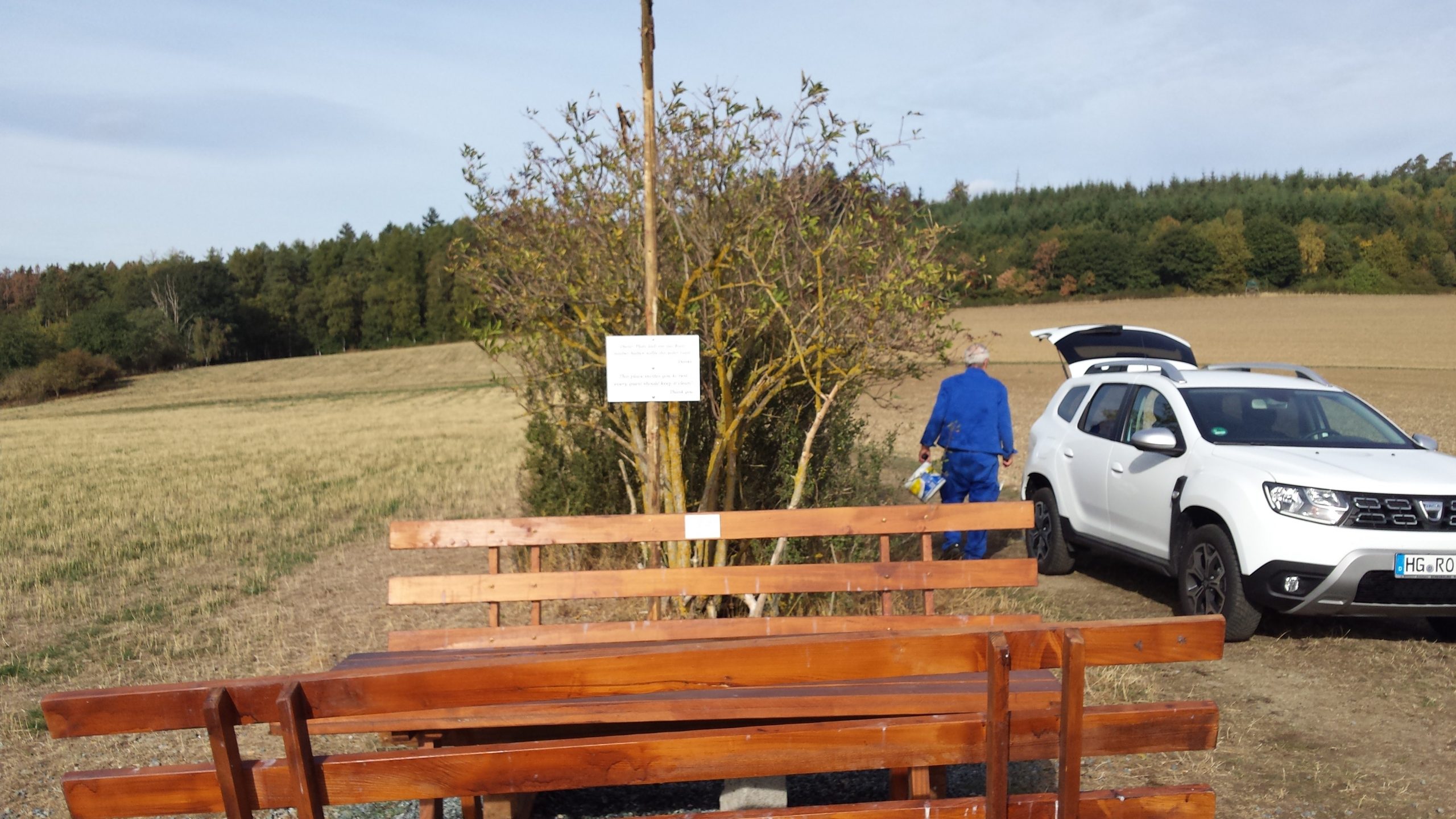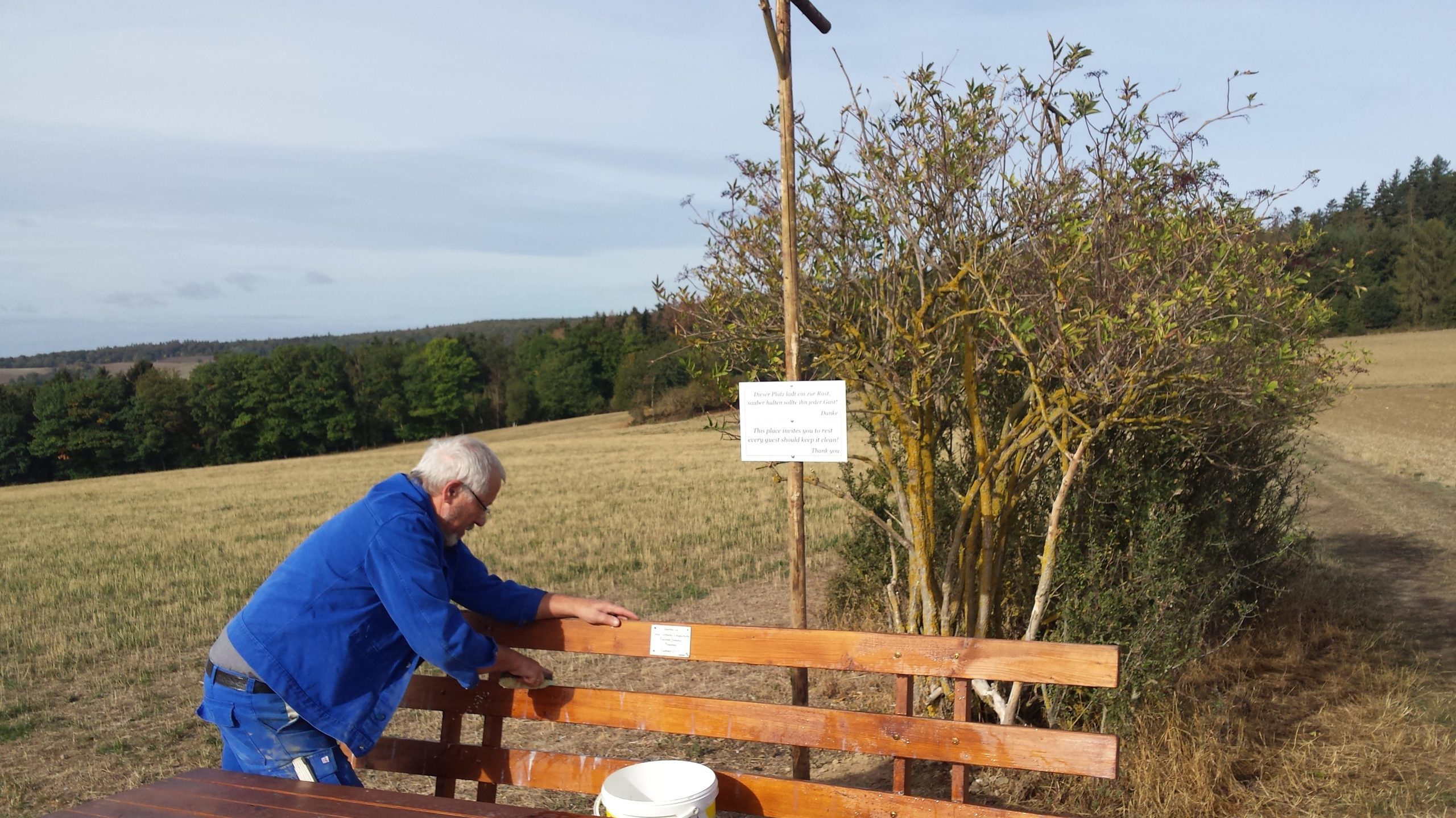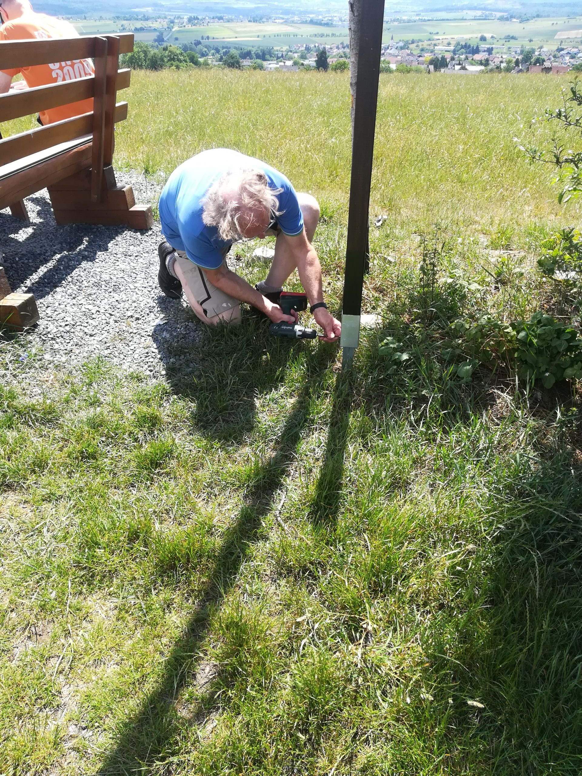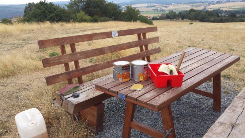 Fünfzehn Monate ist es nun her, dass der Verein Eschbacher Ortsgeschichte zusammen mit Hans-Jörg Scheidler die neue Sitzgruppe am Pfaffenkopf aufgestellt haben. Es ist ein wunderbarer Platz zum Rasten mit Sicht über Eschbach bis hin zum Großen Feldberg. Bei Spaziergängen trifft man hier Jung und Alt, die die Sitzgruppe mit Begeisterung benutzen. Immer wieder wird sie von Vereinsmitgliedern gereinigt, dass jeder eine saubere Bank vorfindet. Nach über einem Jahr in der Natur war nun ein neuer Anstrich fällig. Am 05. August 2019 trafen sich Gerd Becker und Reiner Holl zu Malerarbeiten an der Bank. Ralf Oldenburg spendete das Material von Schleifpapier bis hin zur neuen Anstrichfarbe.