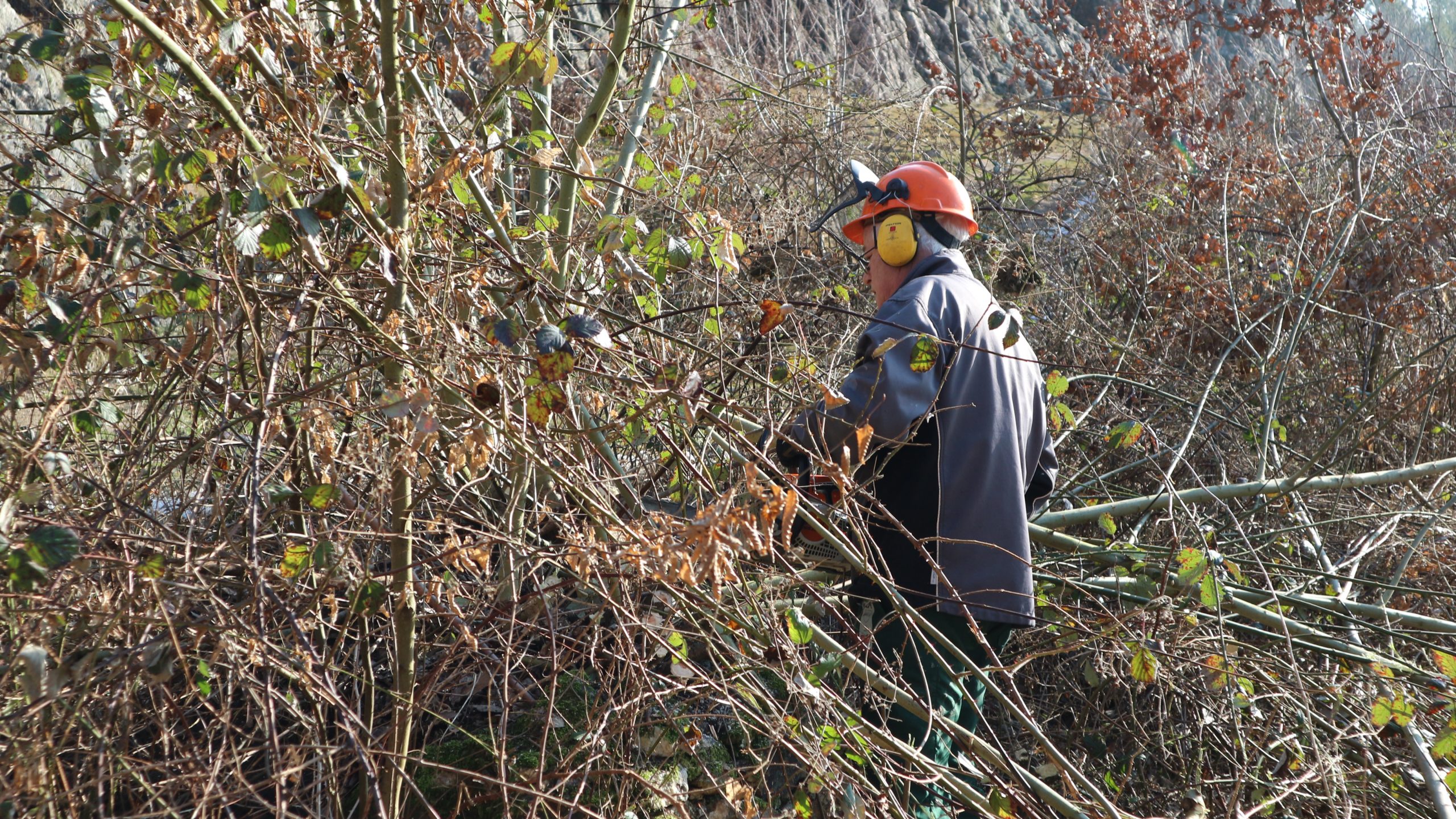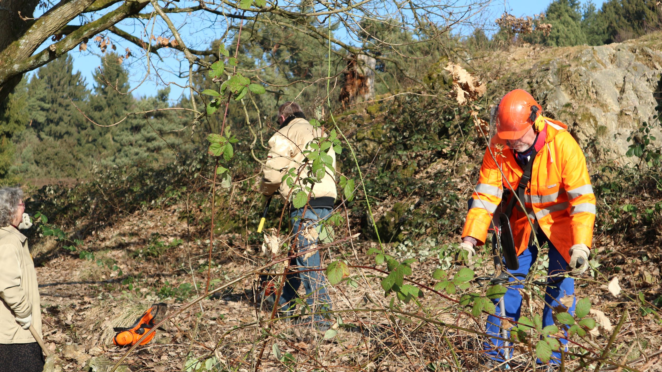 Thema: Mäharbeiten und Säuberung der Heidefläche, Entfernen der Buschwüchse an den Felsen, Abtragen der Dornenbüsche und Wildwüchse am Südhang der Klippen