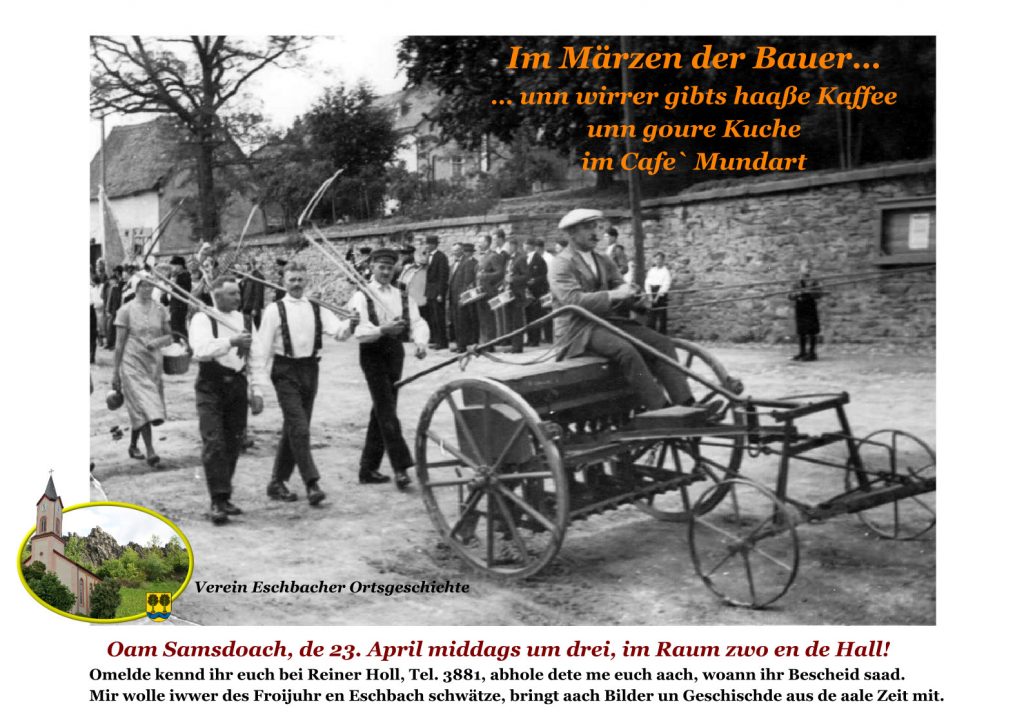 Am Samstag, den 23. April 2022 kamen 35 Besucher in das Bürgerhaus, um den Geschichten bei Kaffee und Kuchen zu lauschen. Viele Gäste konnten noch aus ihren Kindertagen über den Frühling in Eschbach berichten. Es fand ein reger Erfahrungsaustausch unter den Anwesenden statt. Reiner Holl begrüßte im Namen des Vorstandes die Gäste und eröffnete das 2. Café-Mundart.