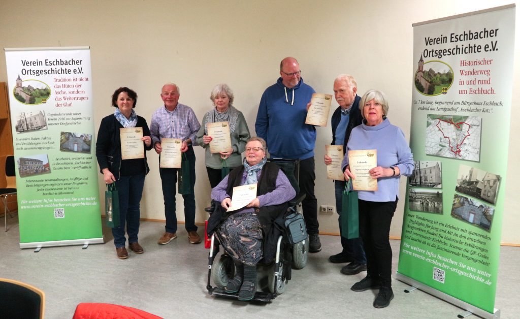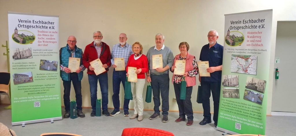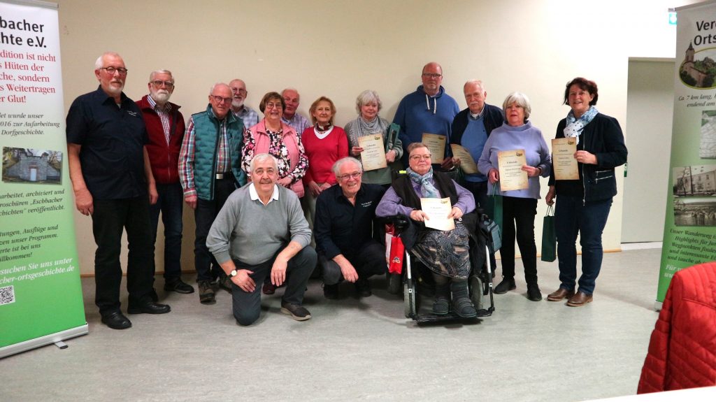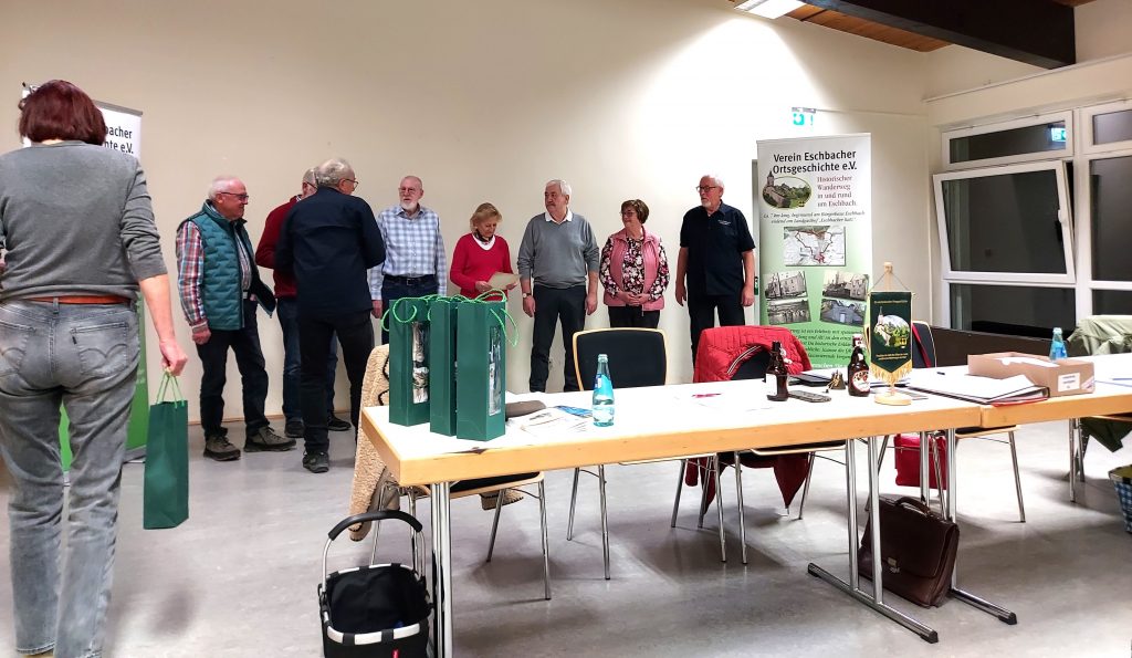 Hierzu rief er zuerst die Vereinsgründer vom 20. Januar 2016 auf und übergab jedem eine Ehrenurkunde und eine Flasche Wein. Mit Handschlag bedankte er sich im Namen des Vorstandes für die 10 jährige Mitgliedschaft und Treue zum Verein Eschbacher Ortsgeschichte.