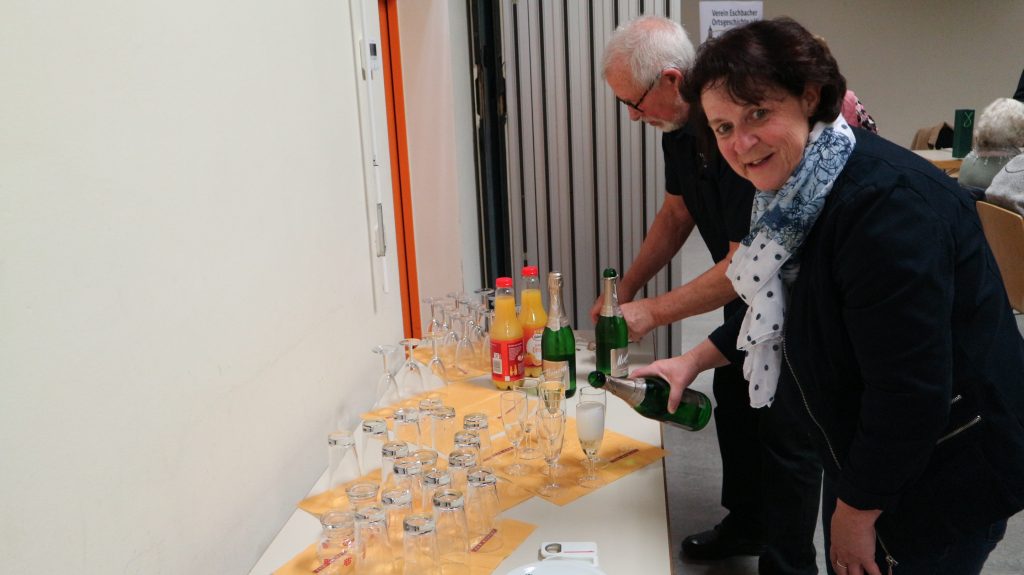 Zum Abschluss der Ehrungen bekam jedes Mitglied eine  Broschüre „Sonderausgabe 10 Jahre VEO“. Ein Rückblick über alle Aktivitäten des Vereins. Dann wurde mit Sekt und einem „Hoch“ auf das 10 jährige Jubiläum angestoßen und das liebevoll hergerichtete kalte Buffet eröffnet. In schöner Atmosphäre und anregender Unterhaltung wurde sich ausgetauscht und man ließ die 10 Jahre Verein Eschbacher Ortsgeschichte Revue passieren.